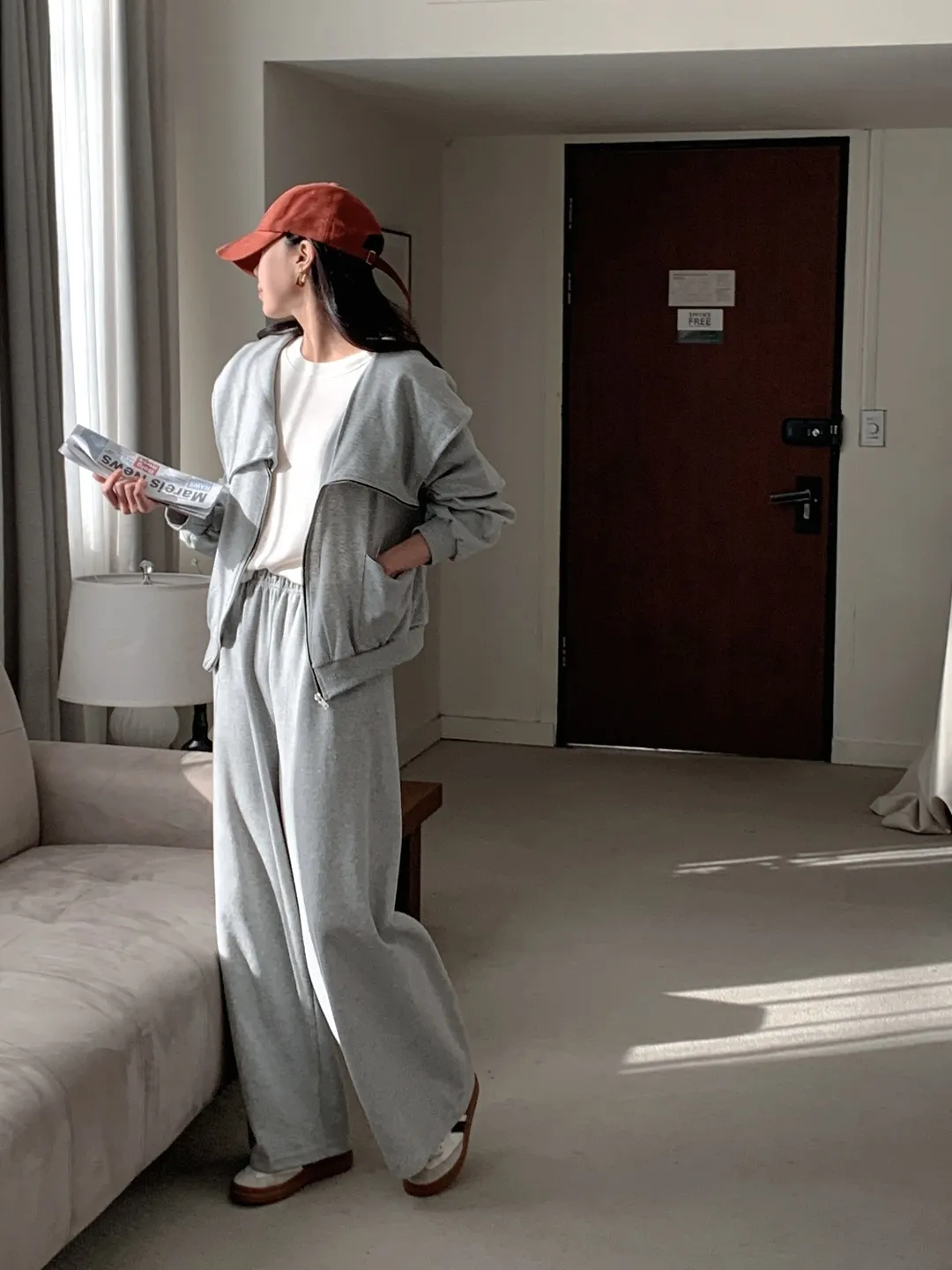 ルーズフードラグランワイドウエストゴムドローストリングカンガルーポケットセットアップ