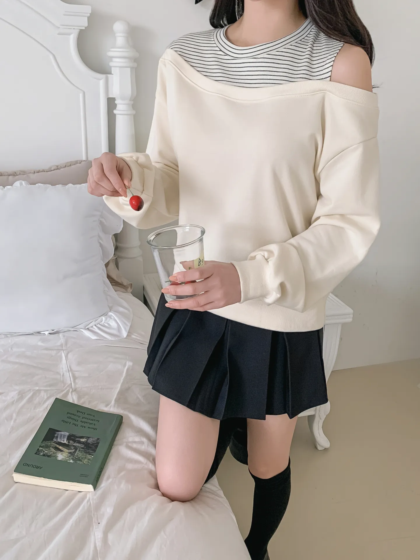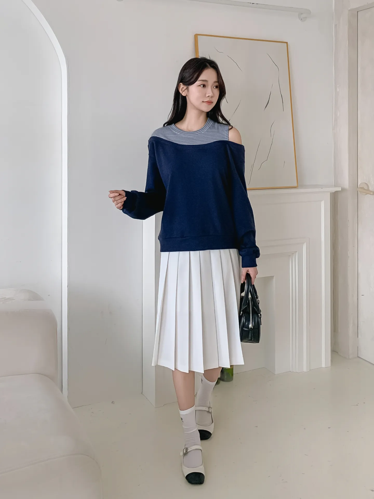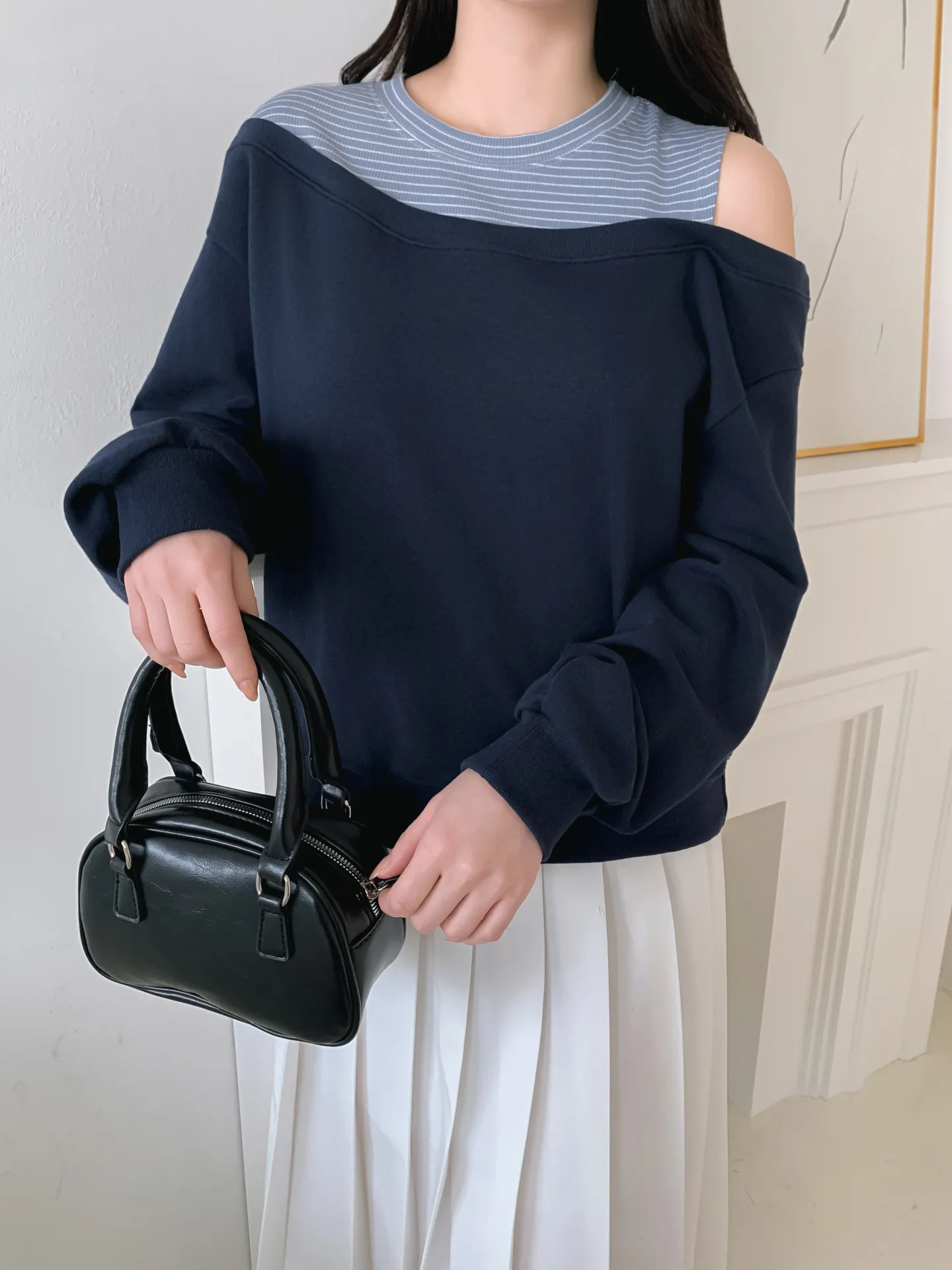 ワンショルダーレイヤード風ルーズ長袖ボーダースウェット・B1954174