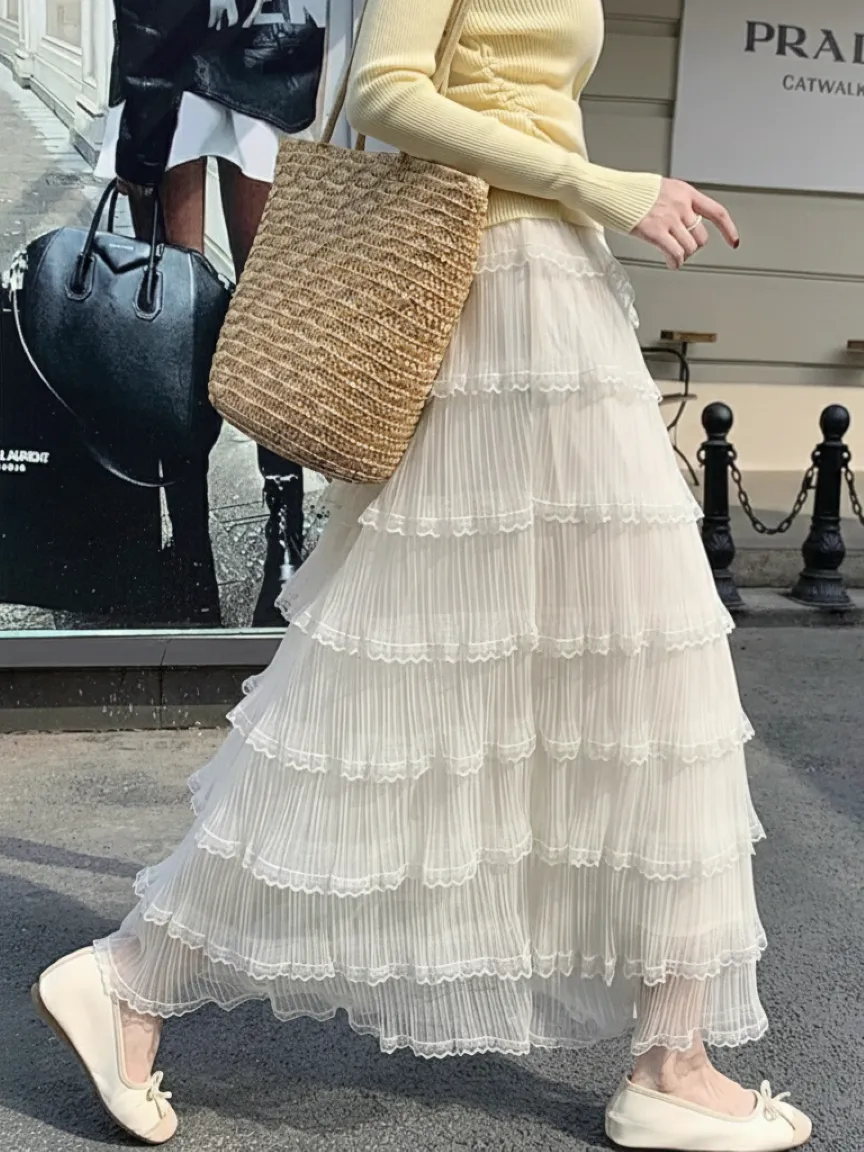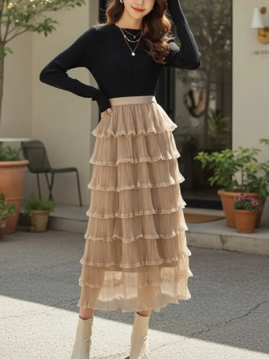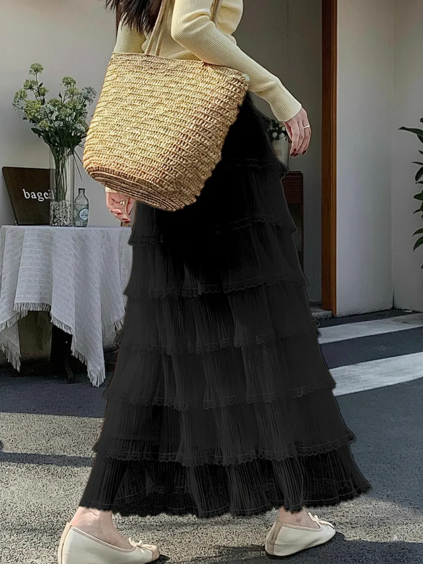レースメッシュプリーツティアードウエストゴムロングスカート・B1954238