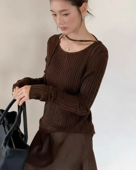 リブ長袖スリムオフショルダーニット
