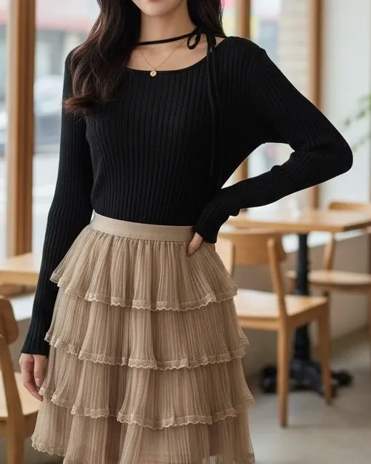 レースリボンVネックフリルレイヤード風ニット
