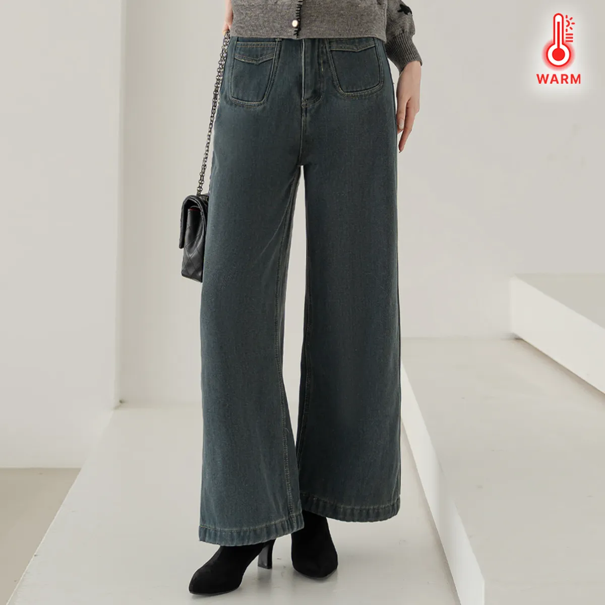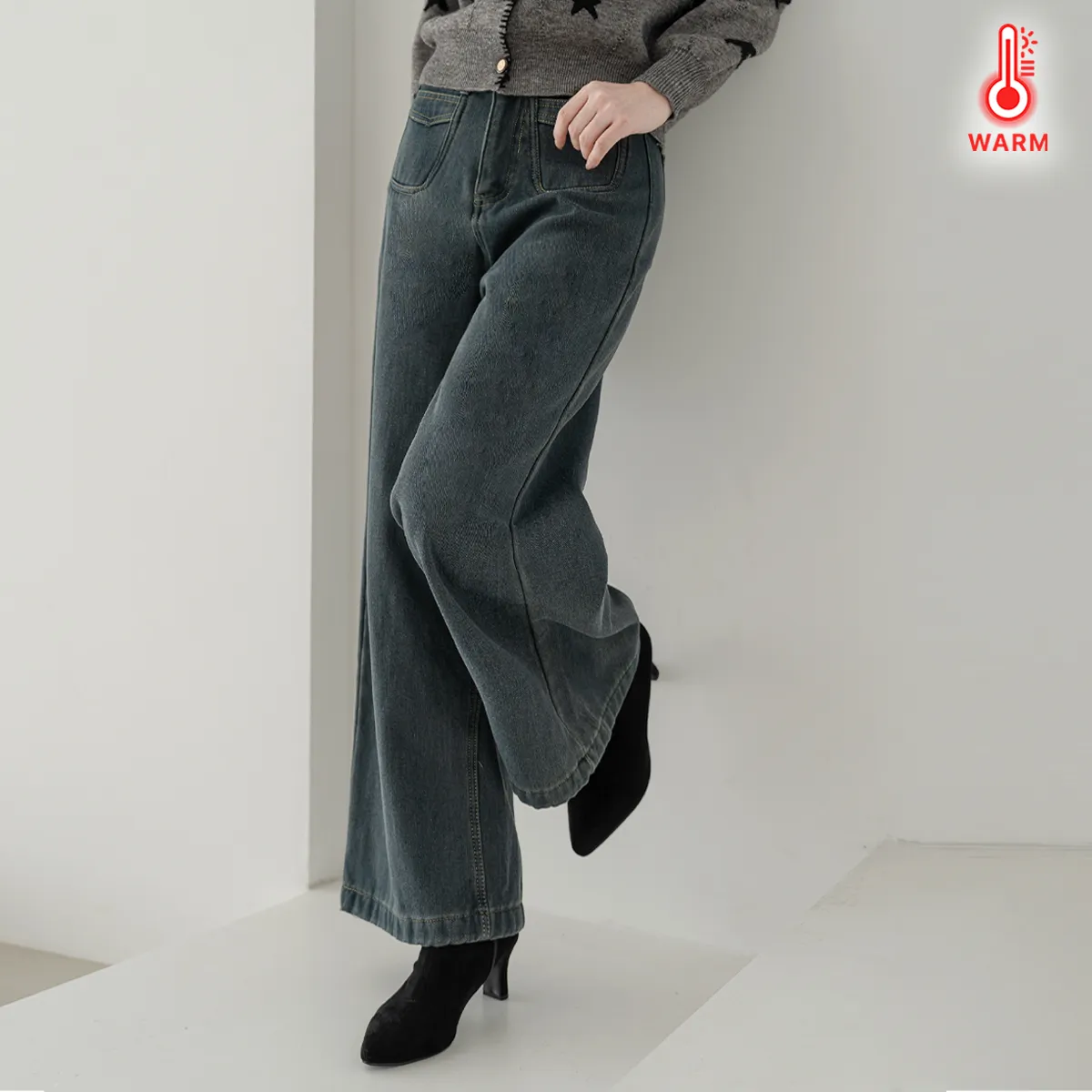 裏起毛コットンウォッシングポケットハイウエストワイドビッグループスナップボタンバックポケットヒドゥンバンディングデニムパンツ[選べる丈]