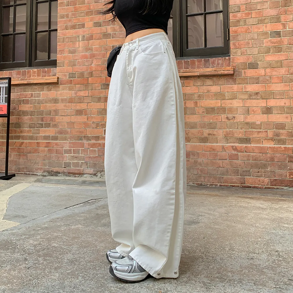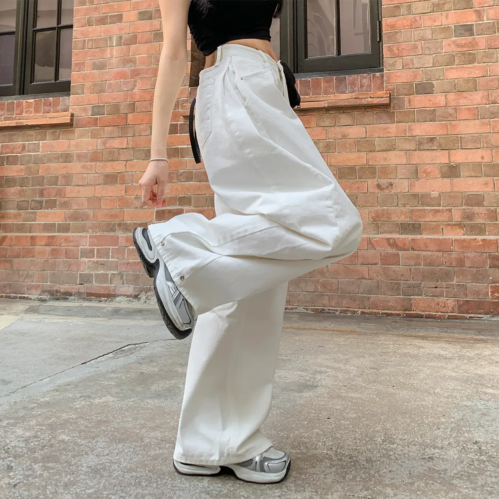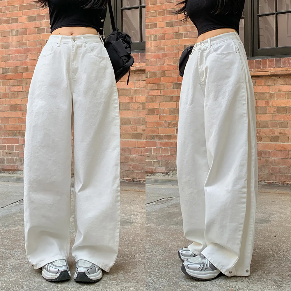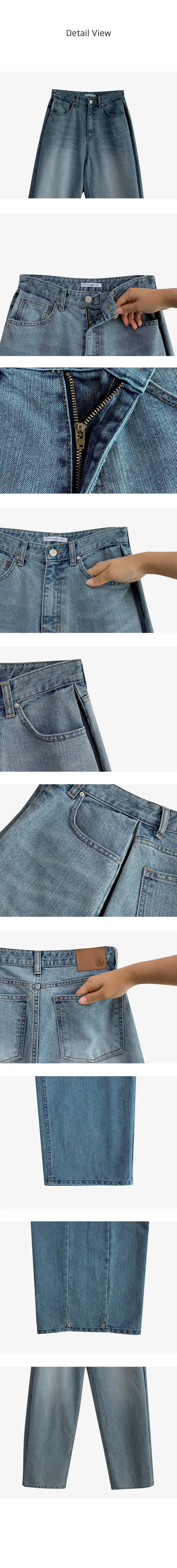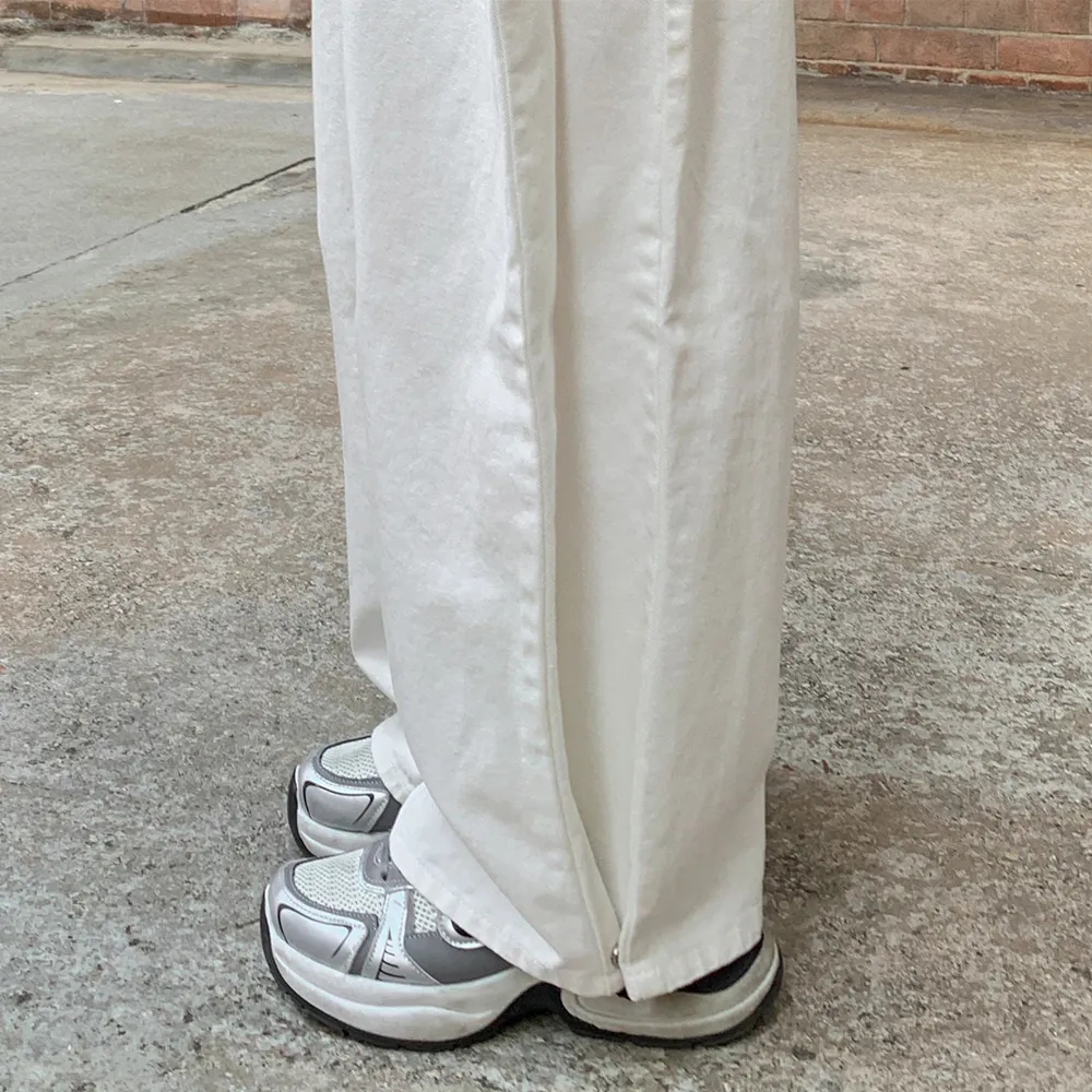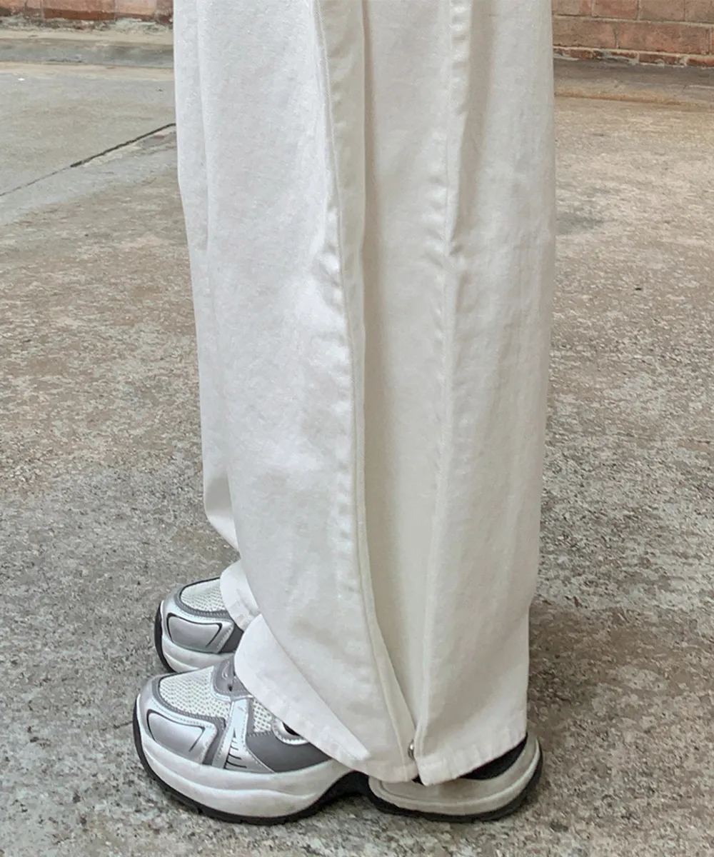 裏起毛コットンウォッシングポケットハイウエストワイドビッグループスナップボタンバックポケットヒドゥンバンディングデニムパンツ[選べる丈]
