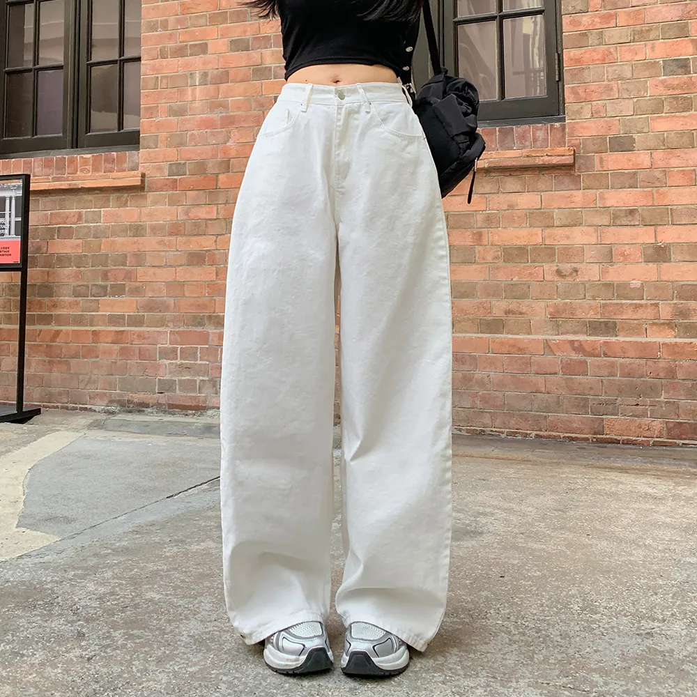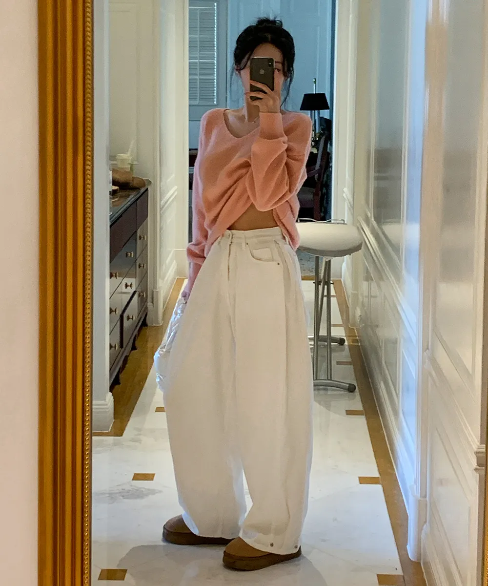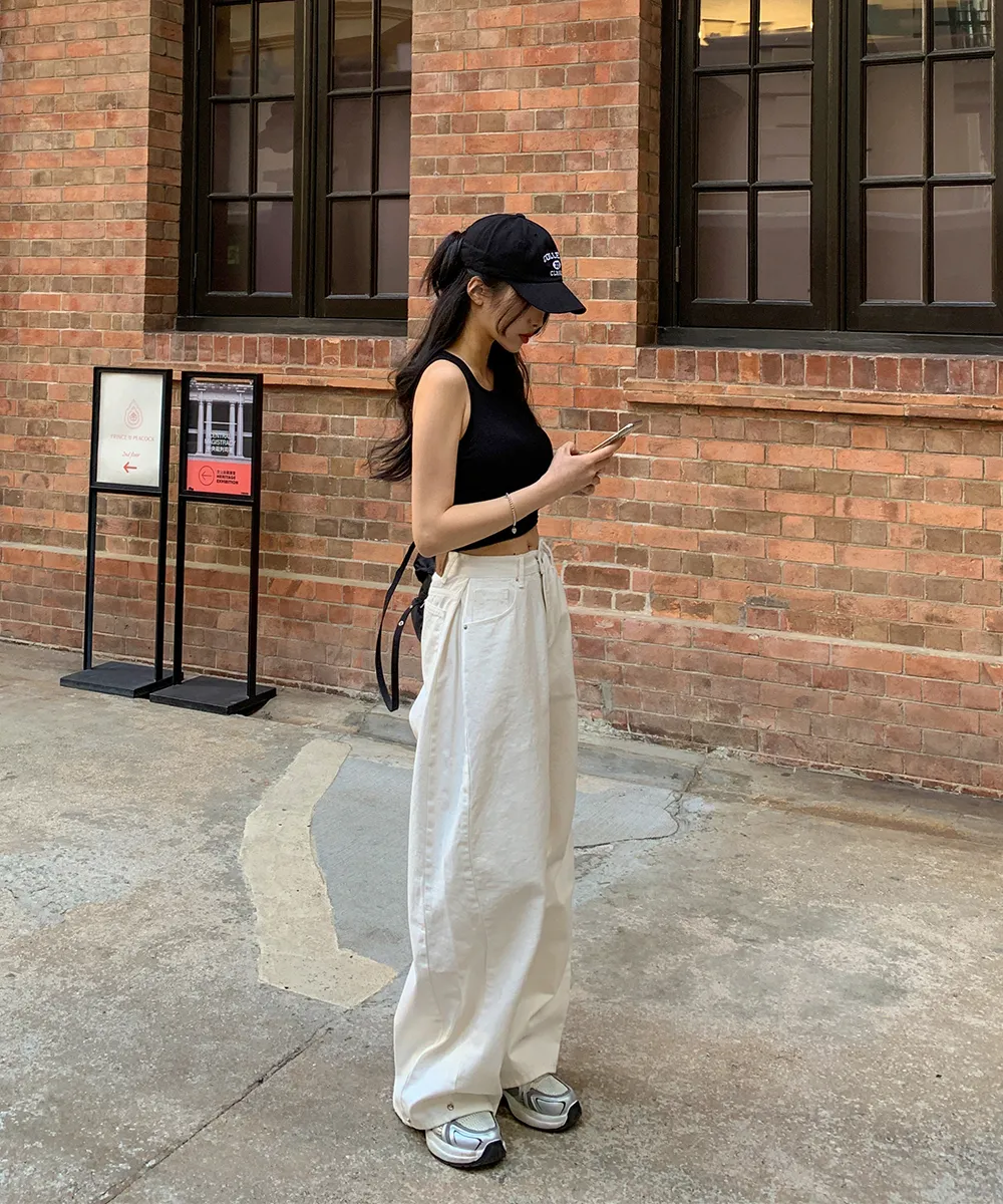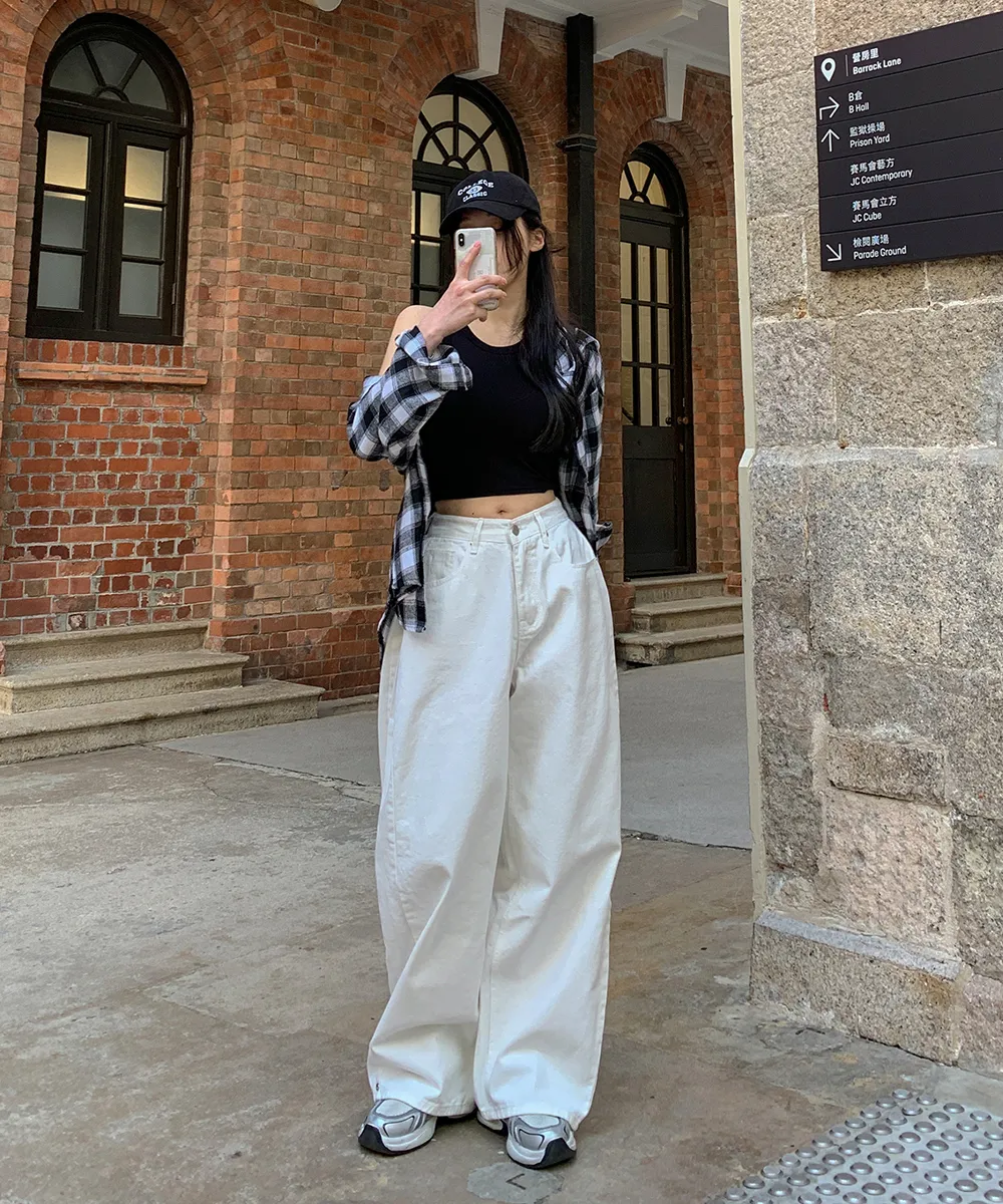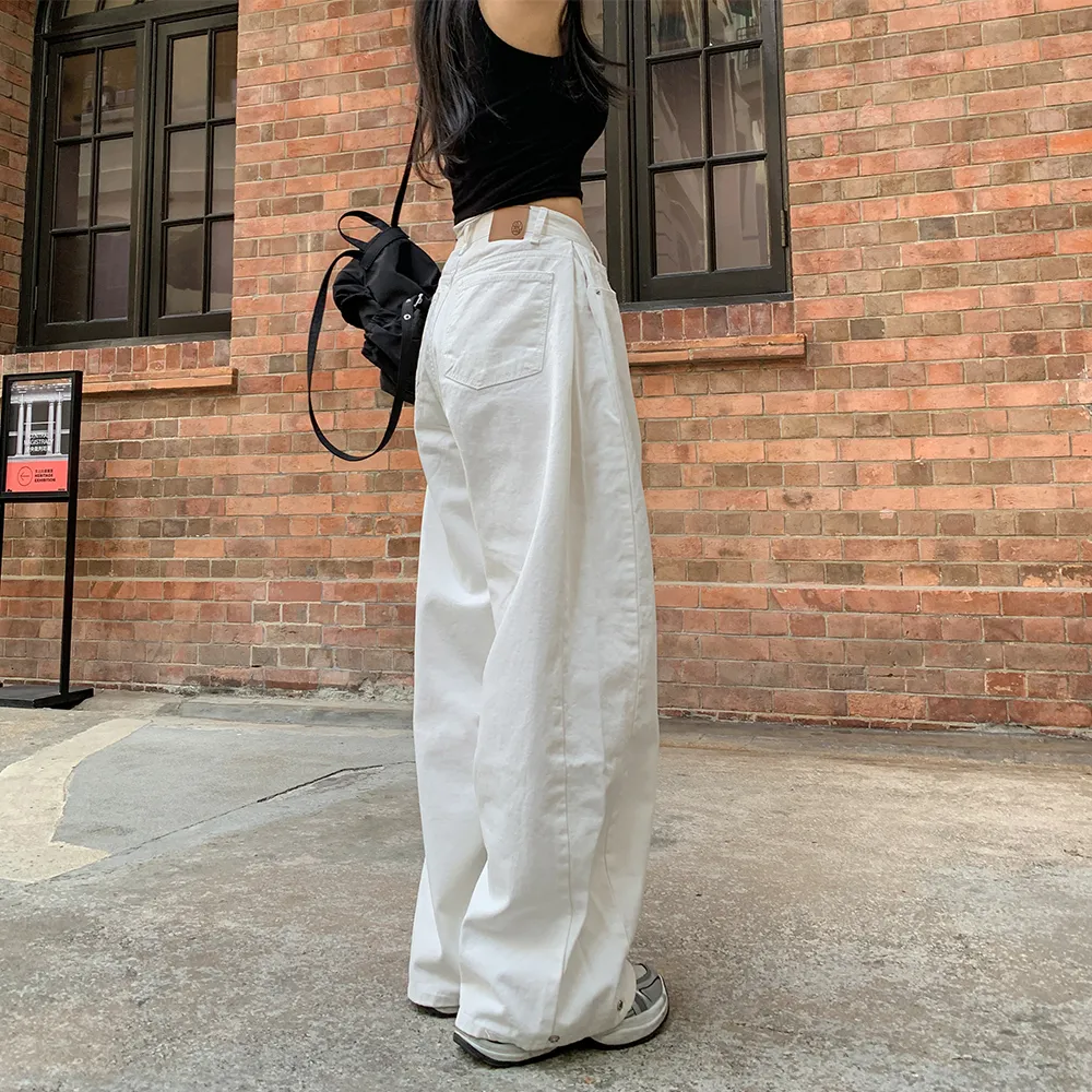 裏起毛コットンウォッシングポケットハイウエストワイドビッグループスナップボタンバックポケットヒドゥンバンディングデニムパンツ[選べる丈]