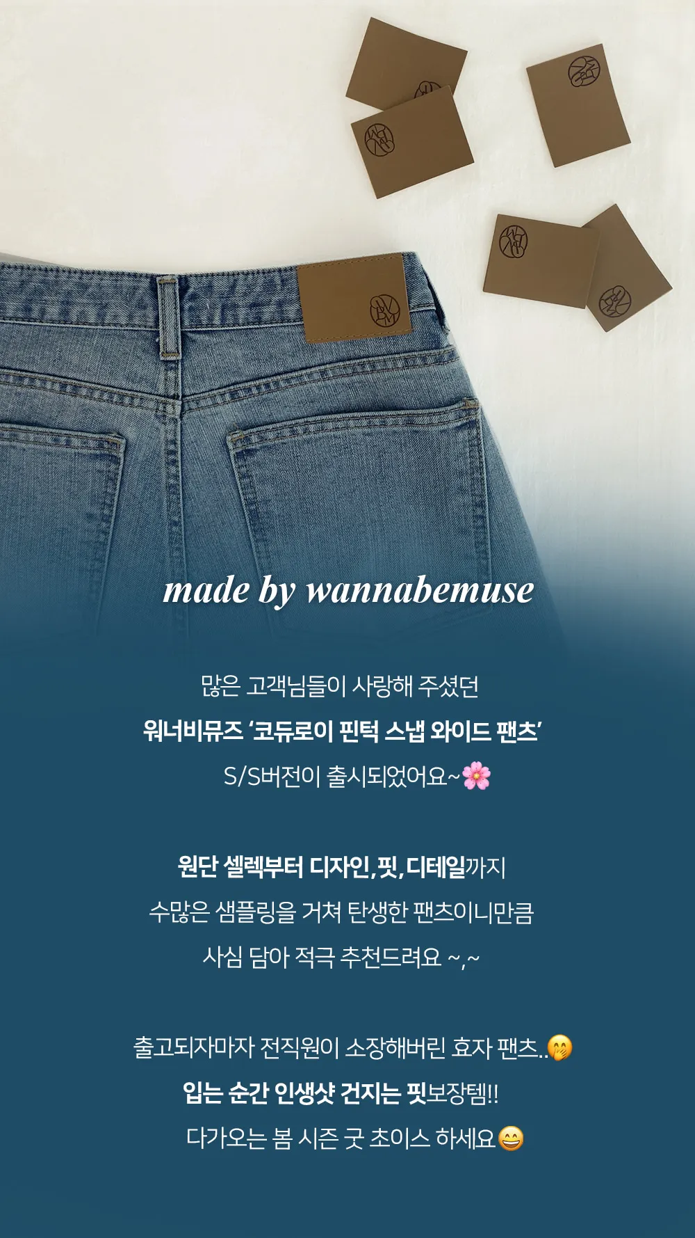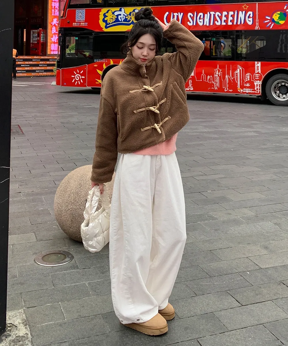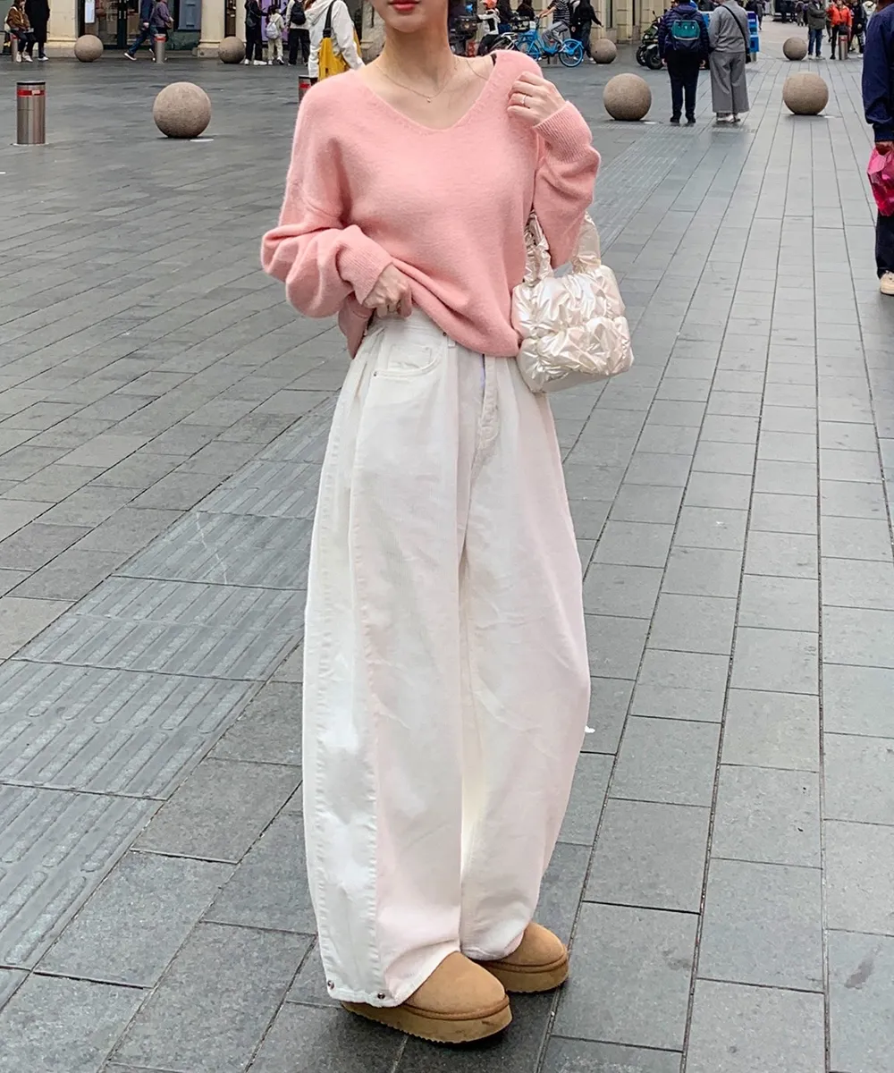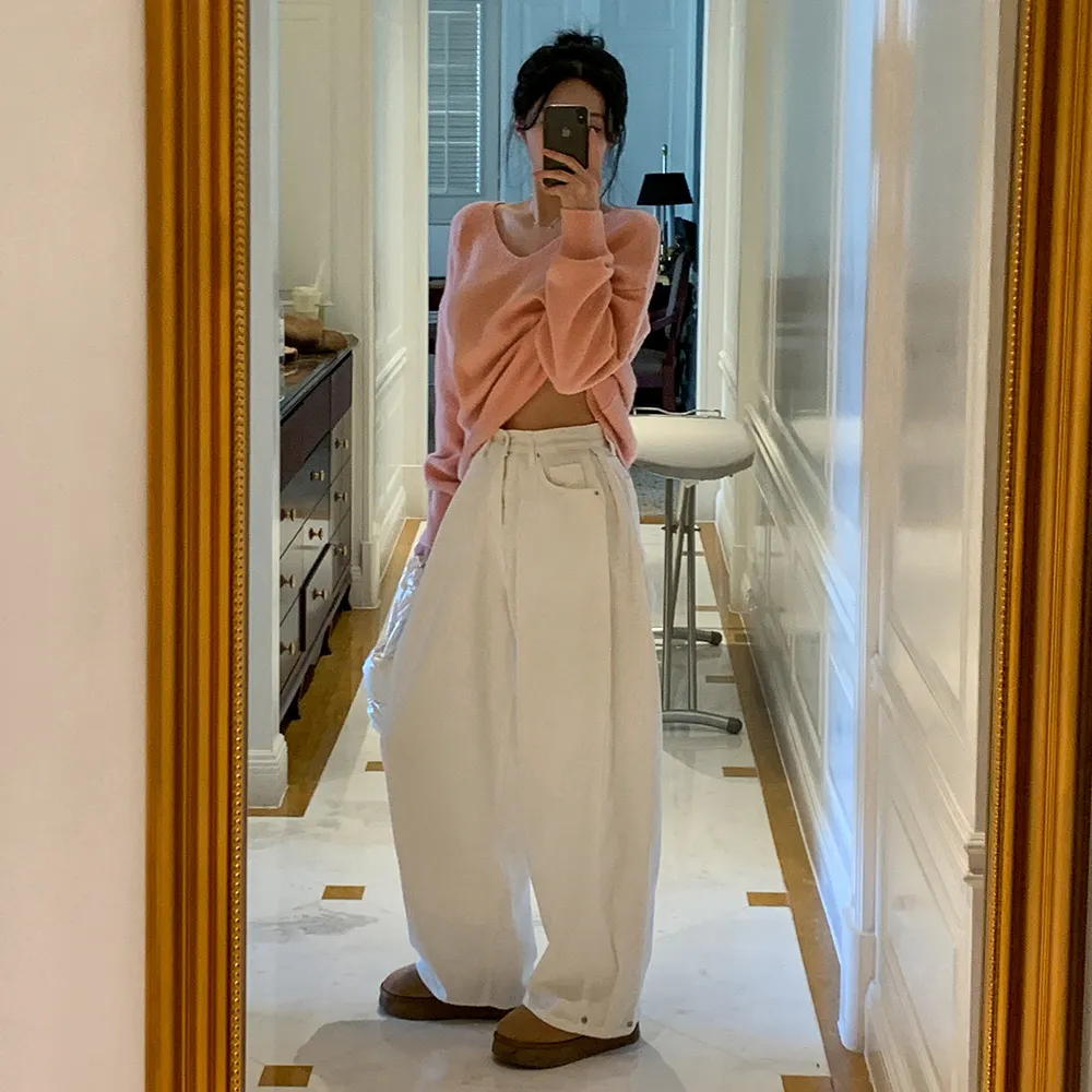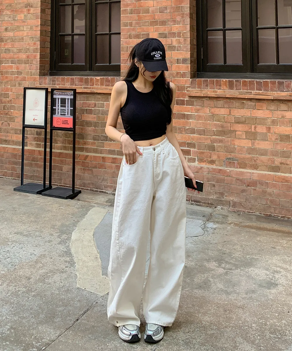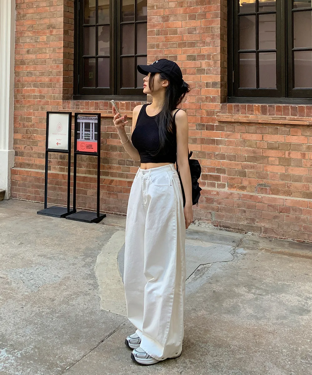 裏起毛コットンウォッシングポケットハイウエストワイドビッグループスナップボタンバックポケットヒドゥンバンディングデニムパンツ[選べる丈]