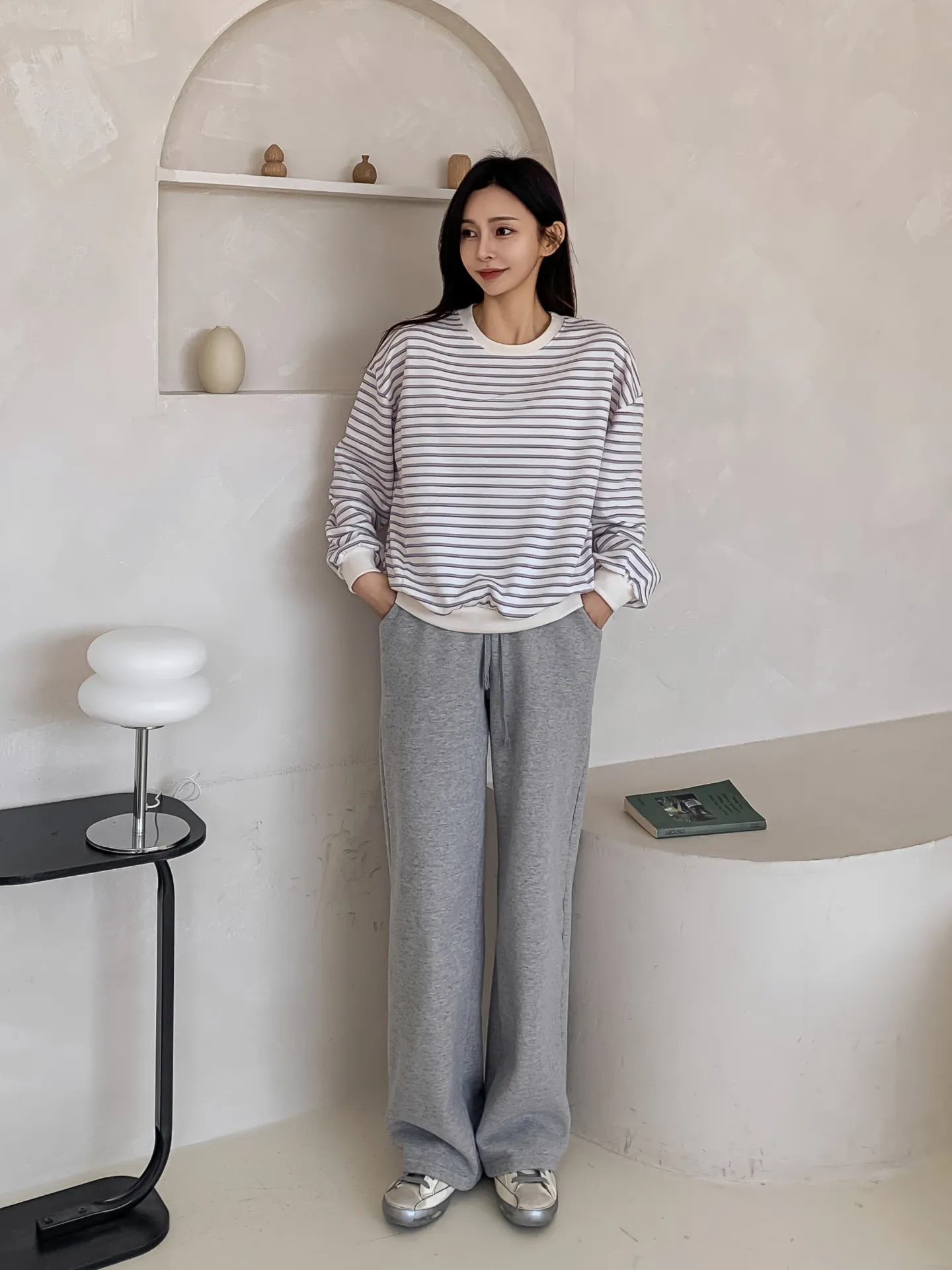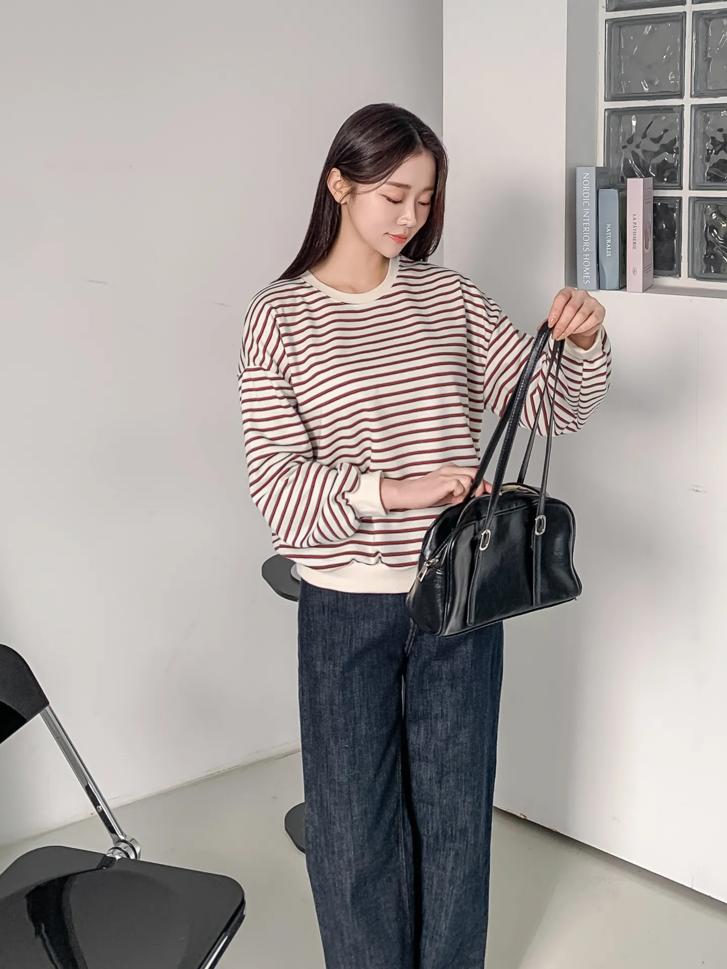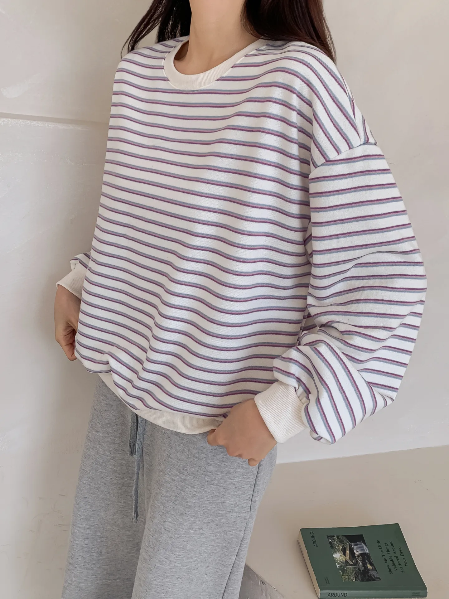 ラウンドネックルーズ長袖ボーダー配色スウェット・B1955016