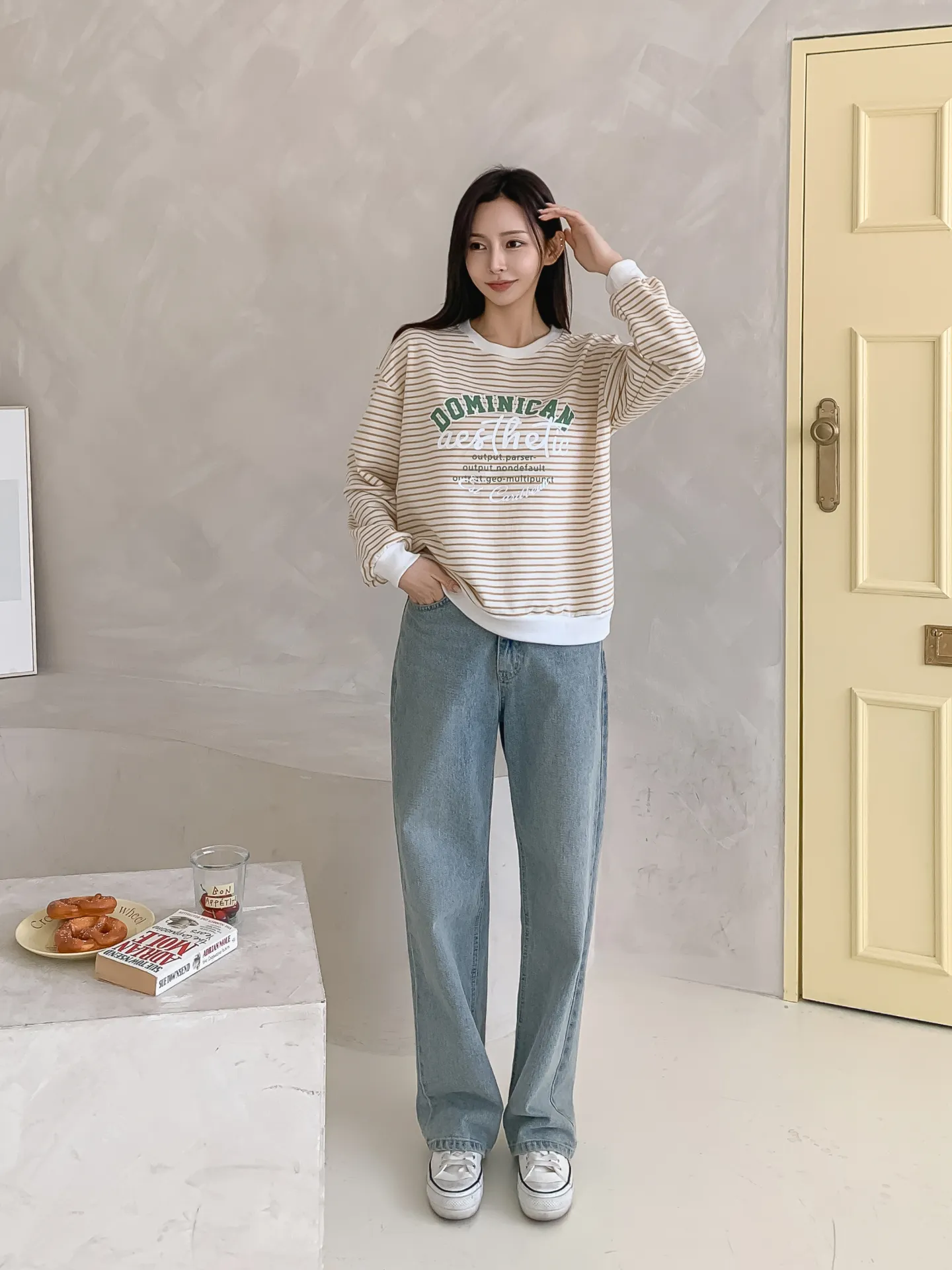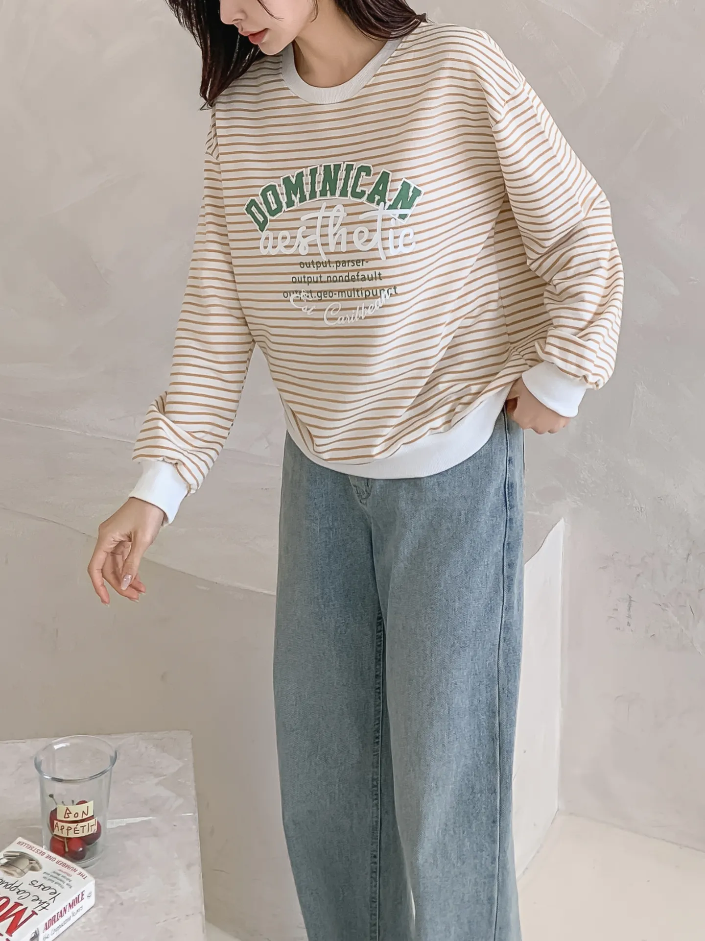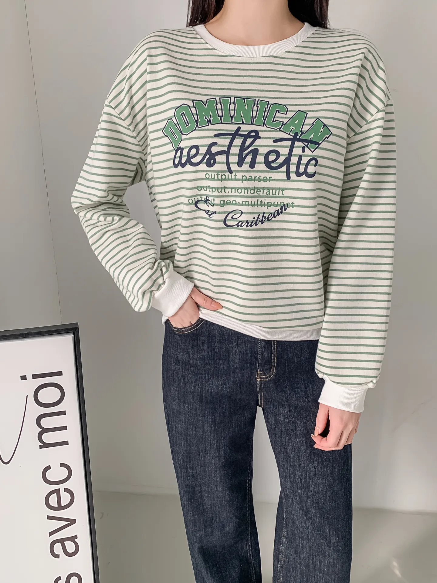 ラウンドネックルーズ長袖レタリングボーダースウェット・B1955020