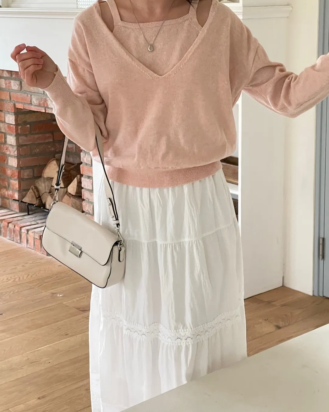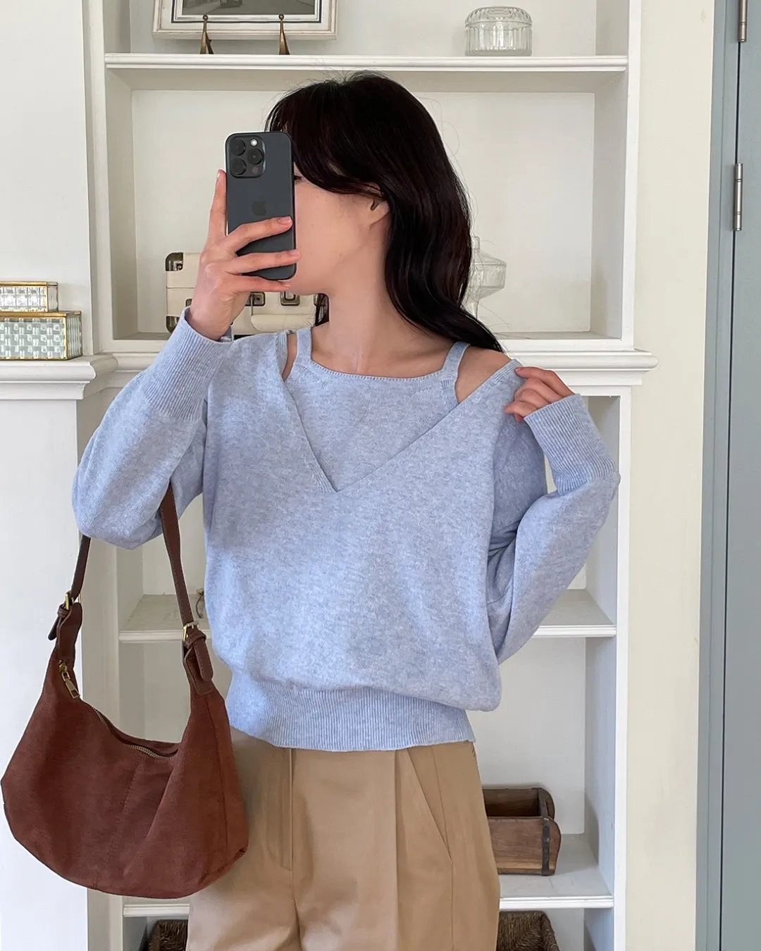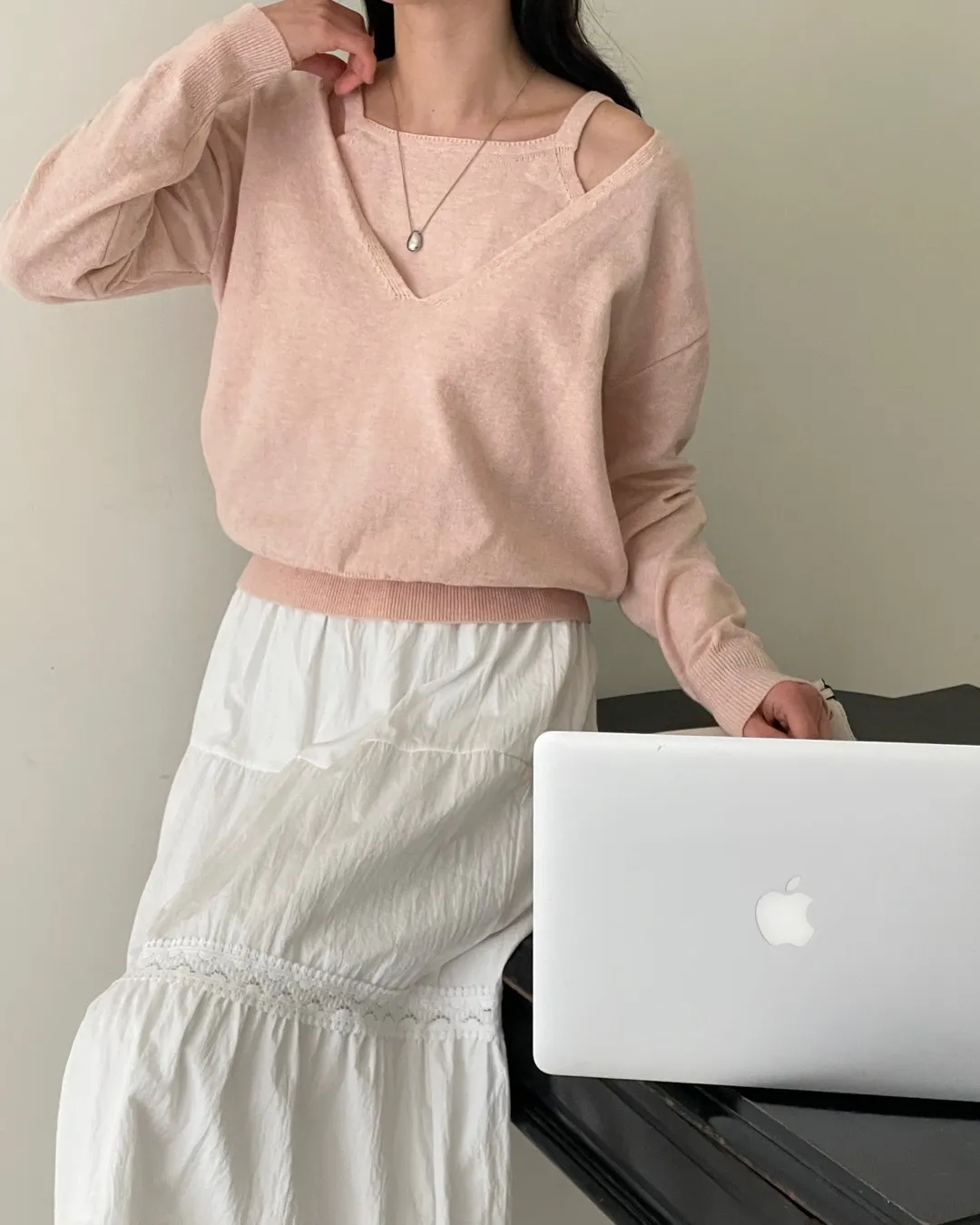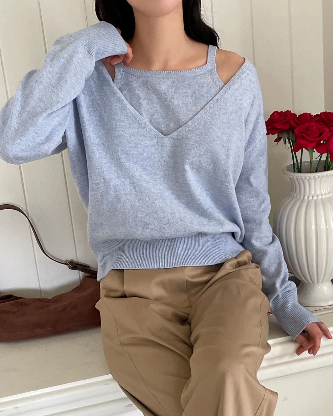 Vネックレイヤード風ルーズ長袖セミクロップド無地ニット・B1955137