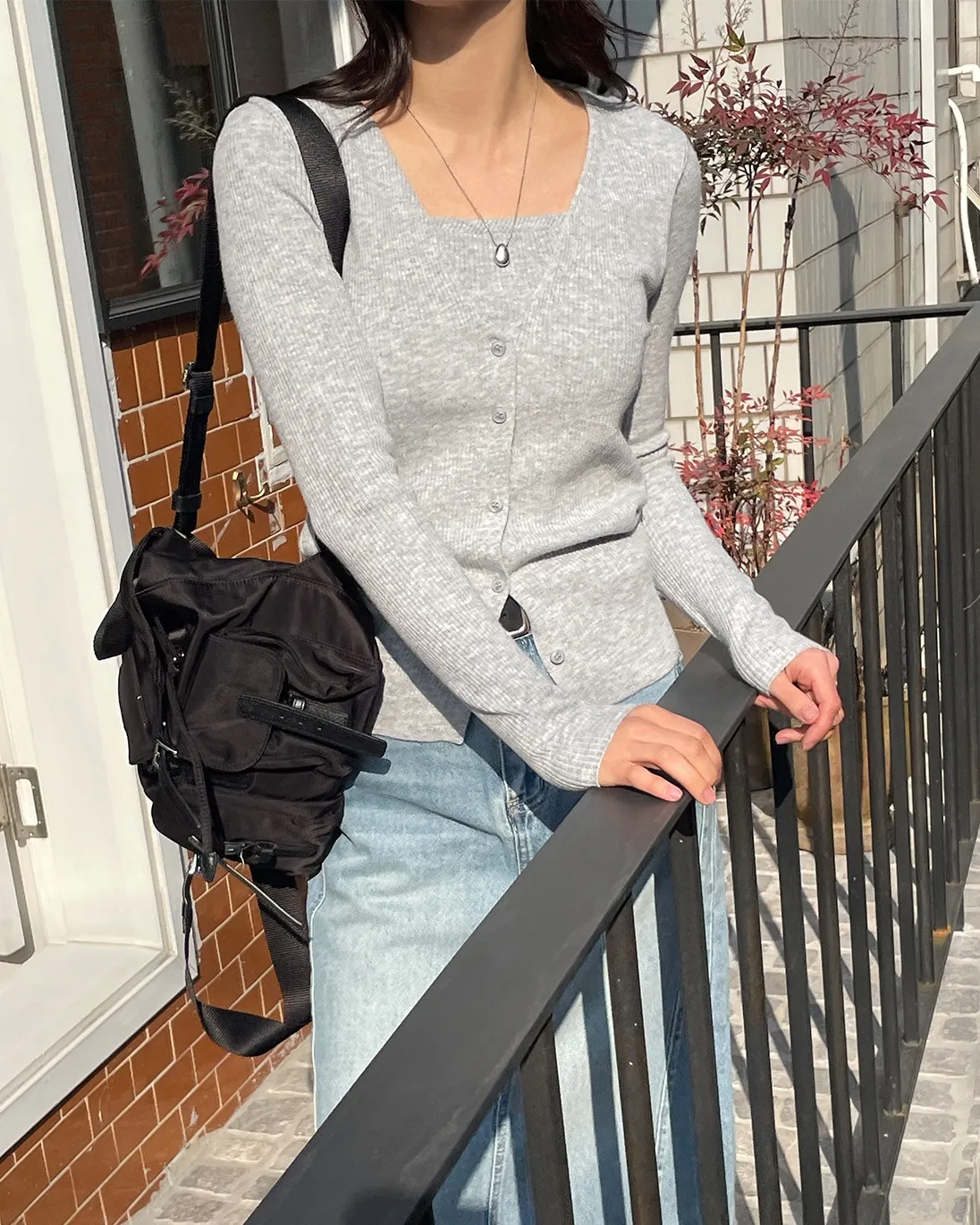 ストラップアンバランスネックスリットルーズアンバランス長袖フェイクボタンセミクロップド無地ニットストラップ付