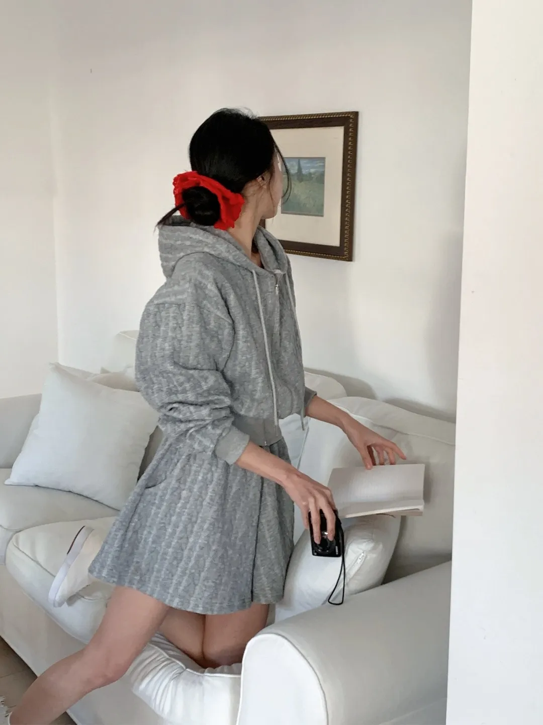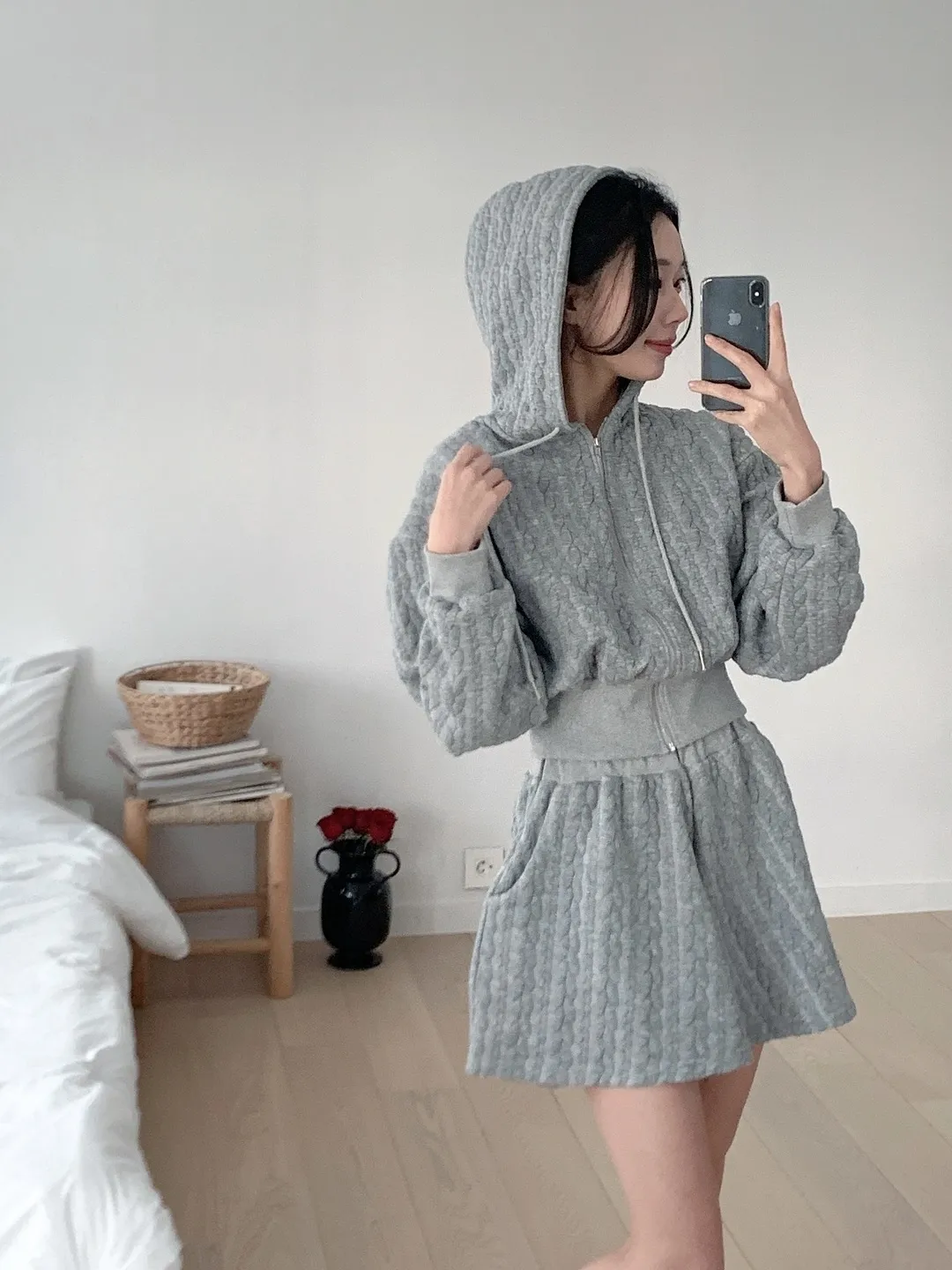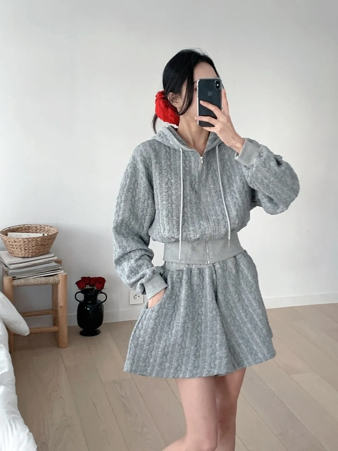 ウール混ボタンスクエアネックハイウエスト肩パッドバックゴムクロップド長袖Aラインミニループフェイクポケットチェックツーピース(トップス、ボトムス)ジャケットスカートパンツ2pc セット