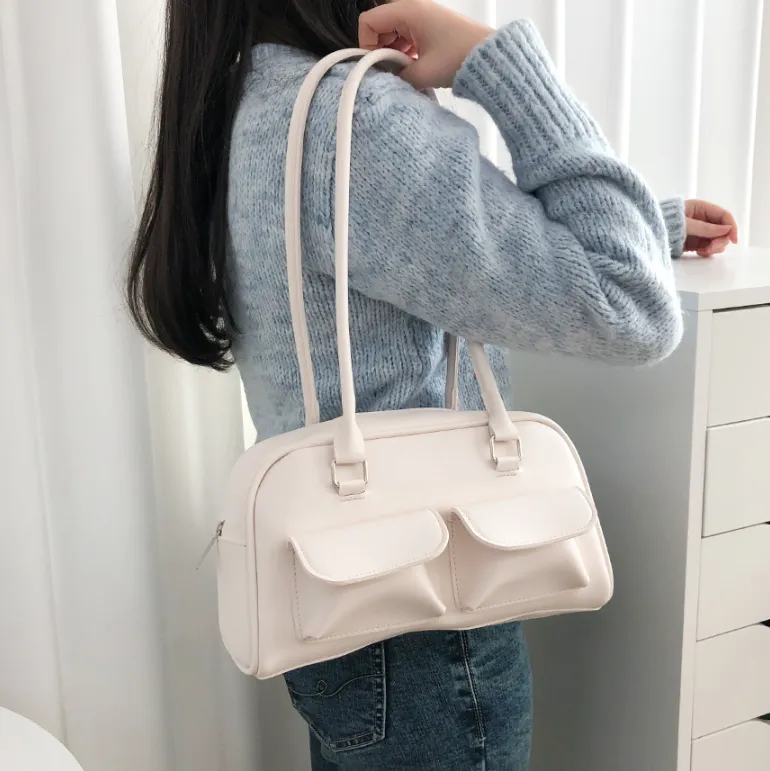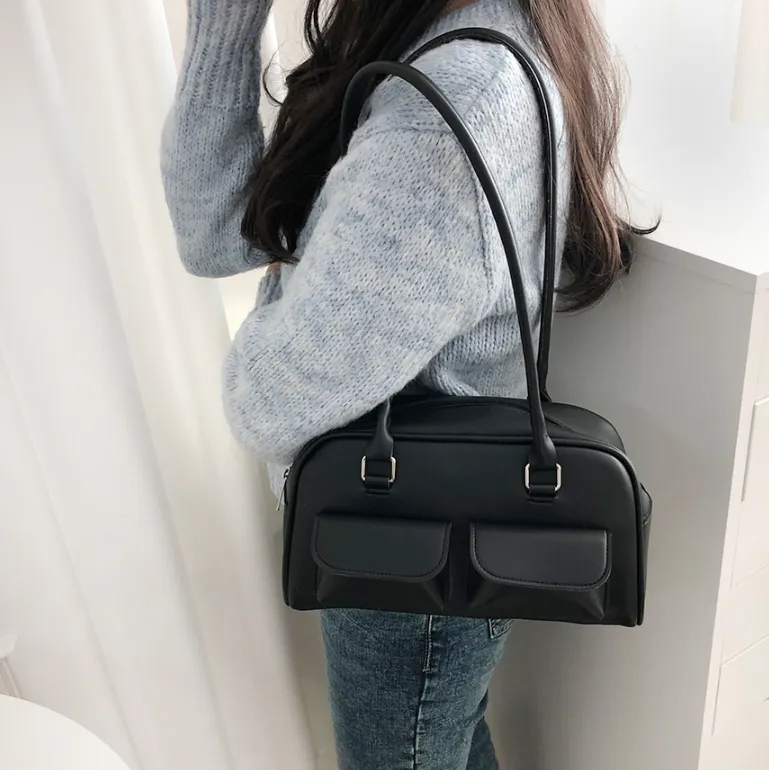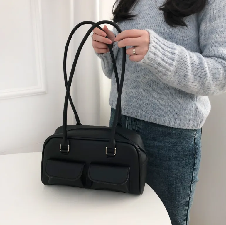 レザー調ポケットダブルジップ無地トートバッグ