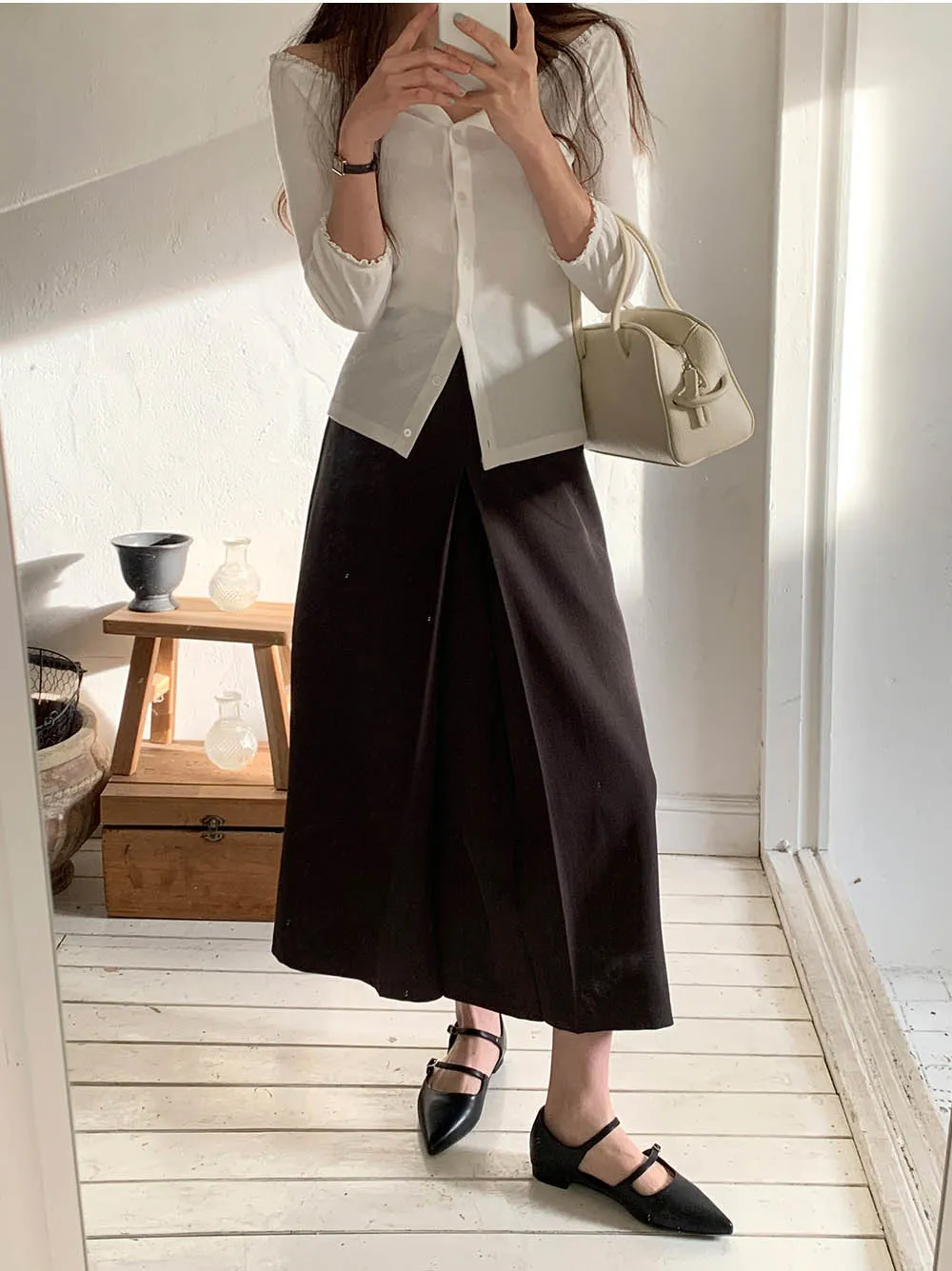 ウール混パールスリットボートネックスリムクロップドニット