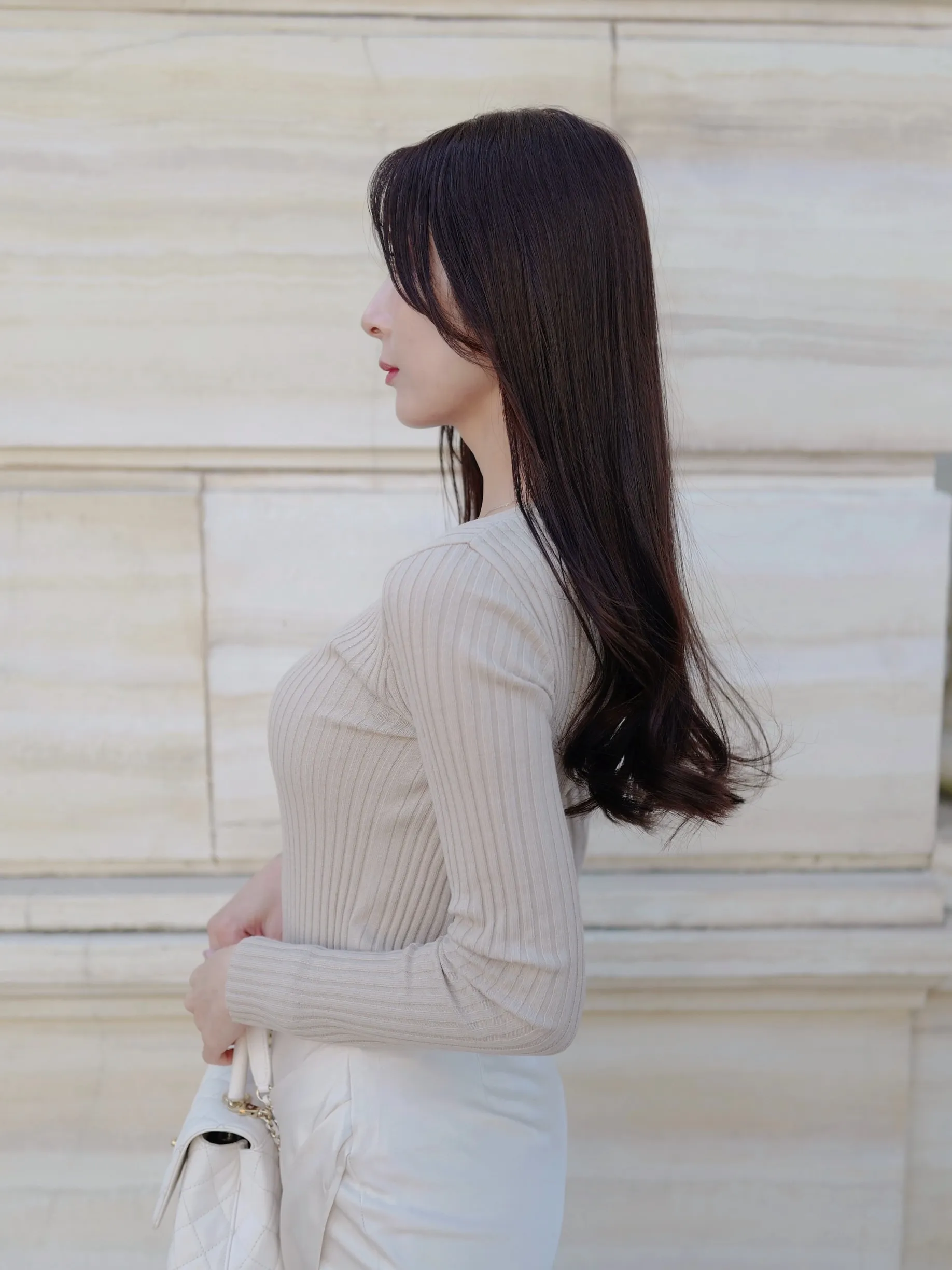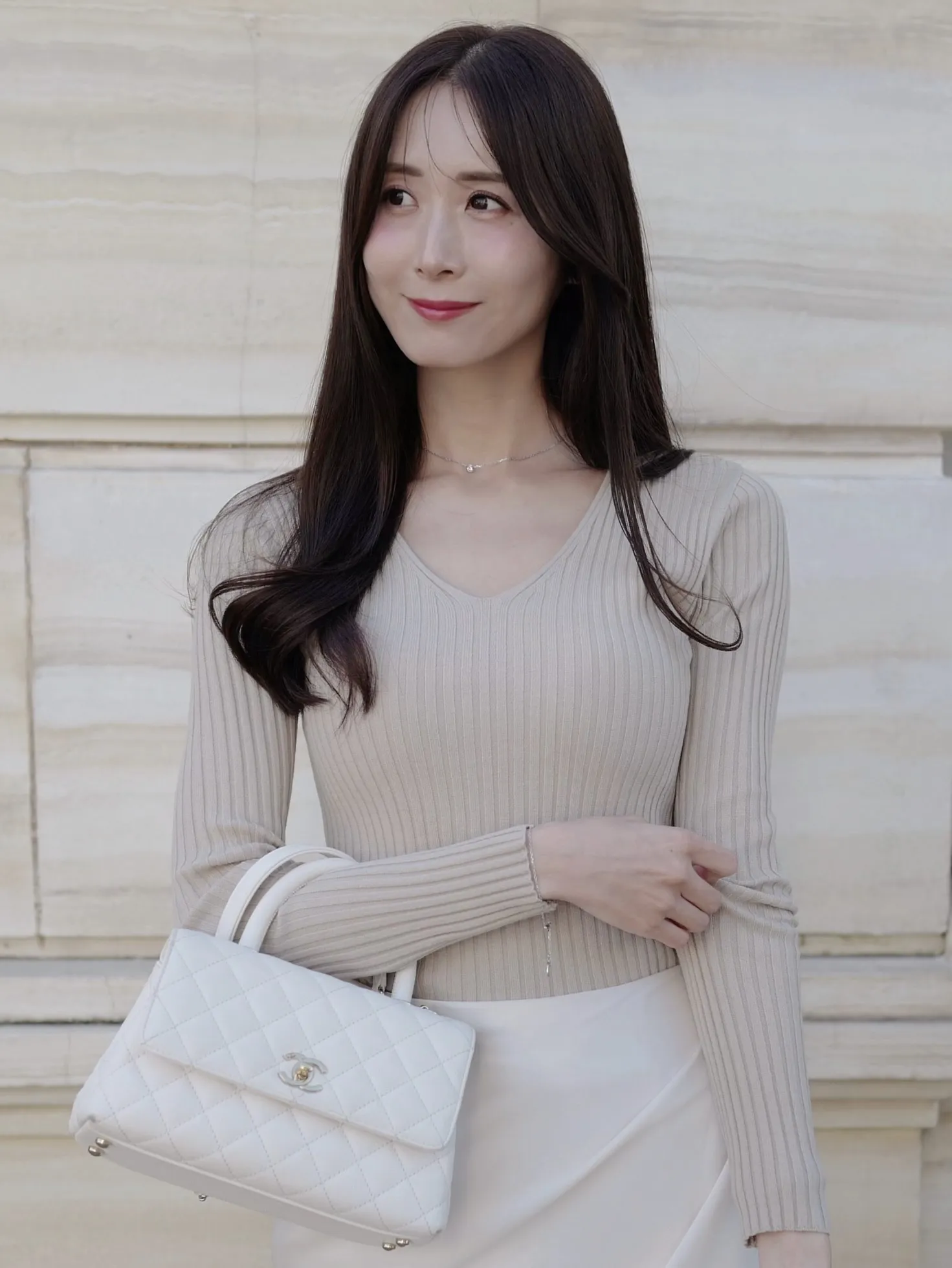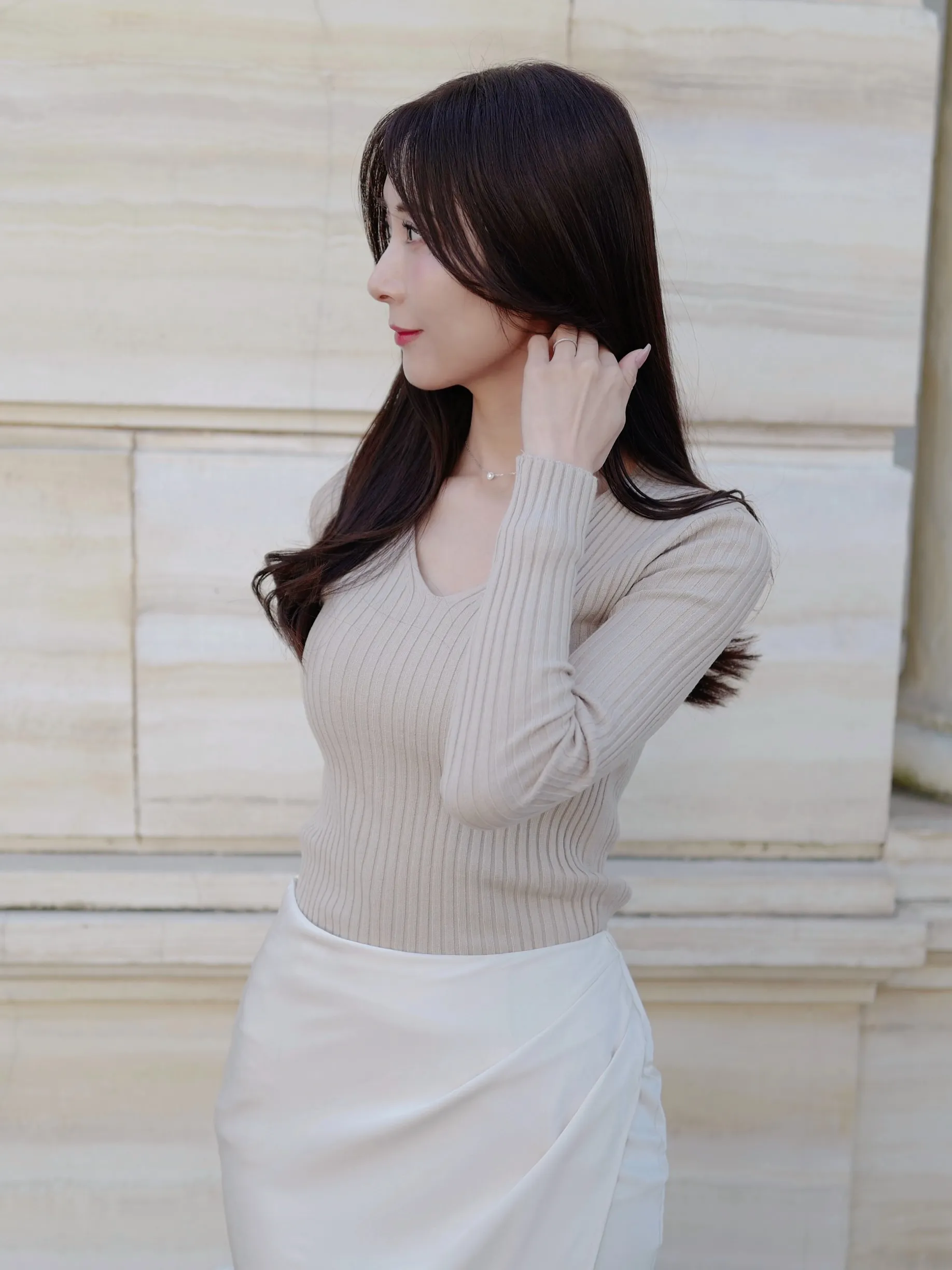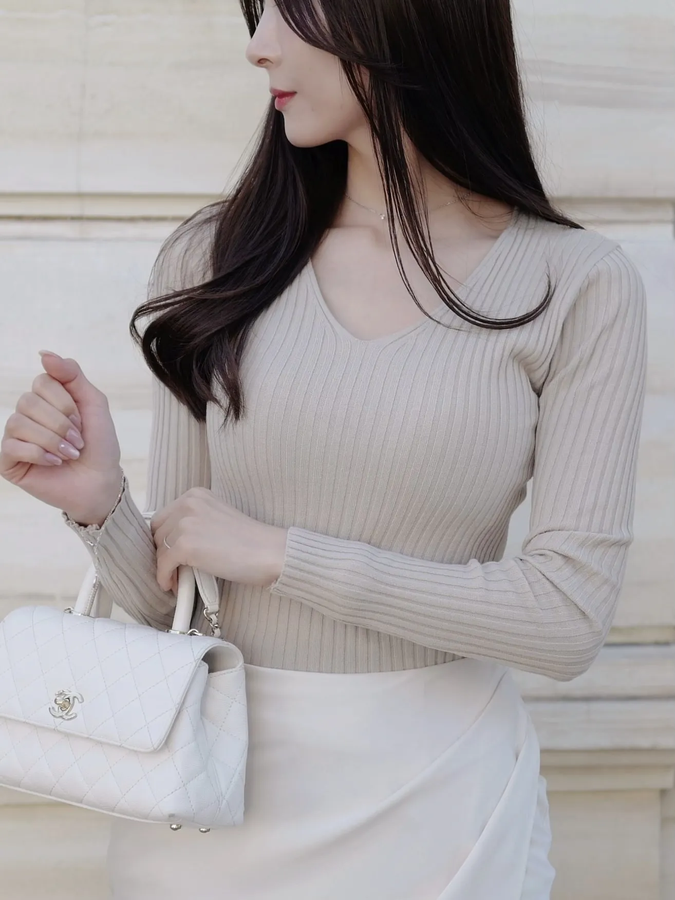 デコルテをきれいに見せるVネックのシンプルなリブニット。程よい厚みと伸縮性で着心地も良く、デイリーからきれいめコーデまで幅広く着ていただけます◎
