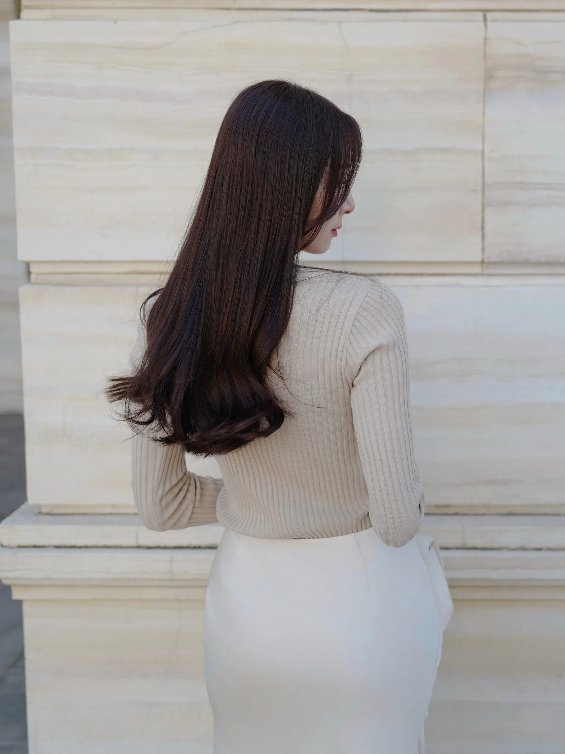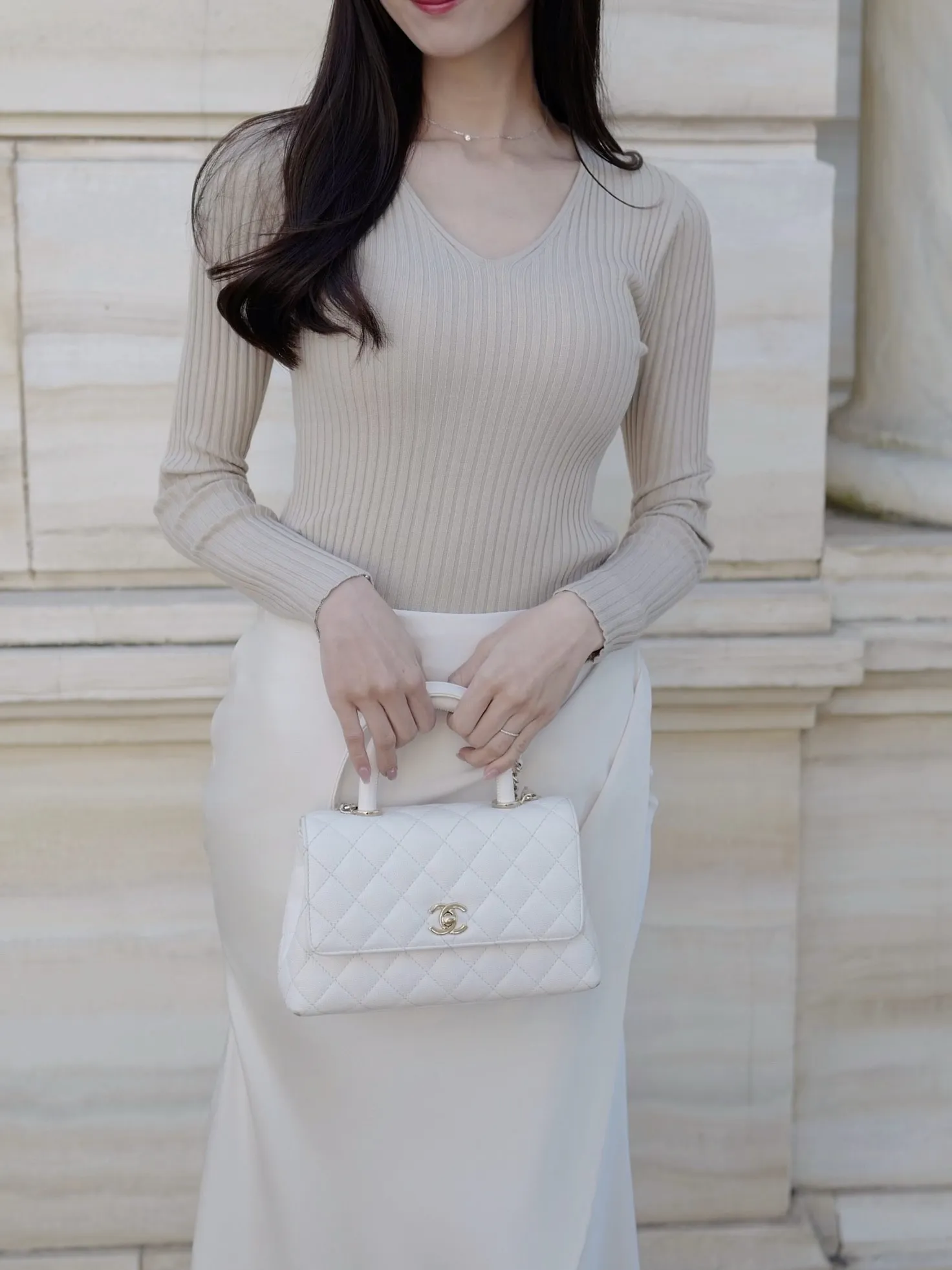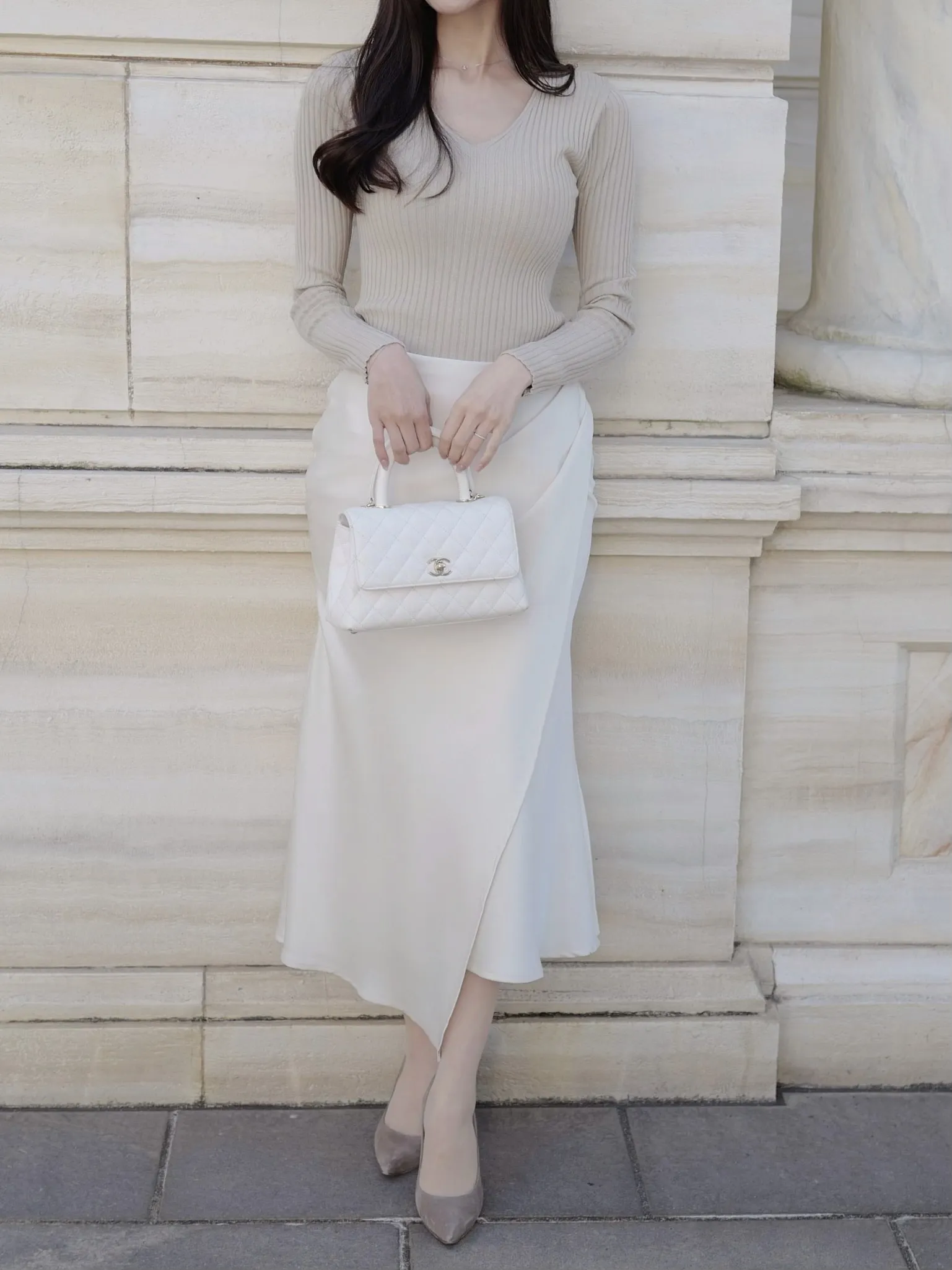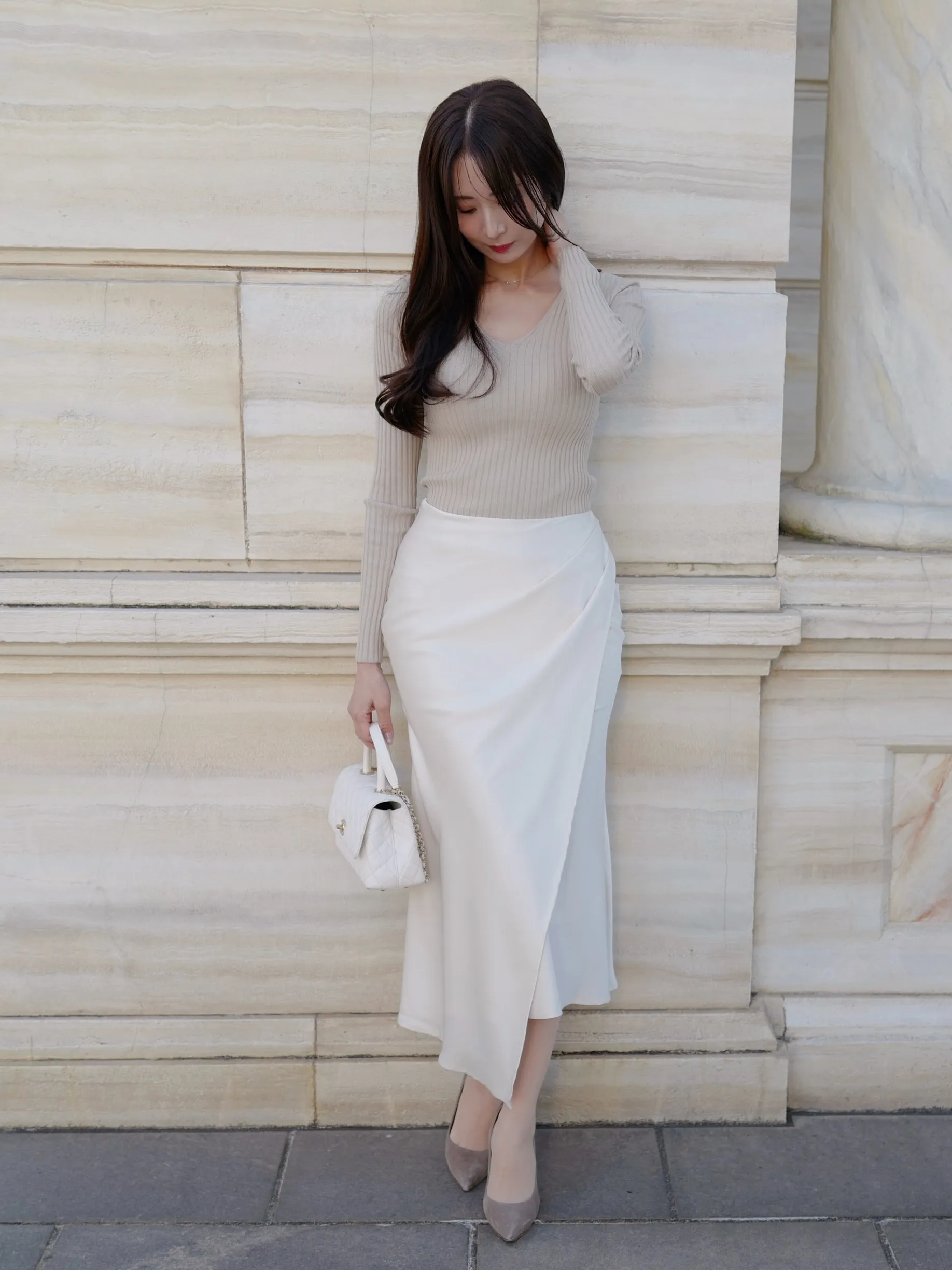 デコルテをきれいに見せるVネックのシンプルなリブニット。程よい厚みと伸縮性で着心地も良く、デイリーからきれいめコーデまで幅広く着ていただけます◎