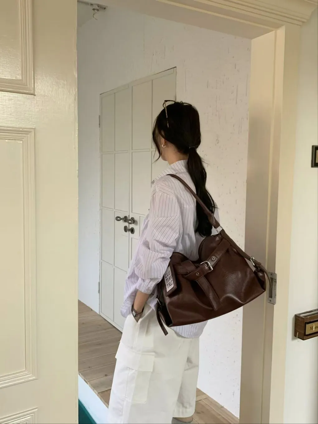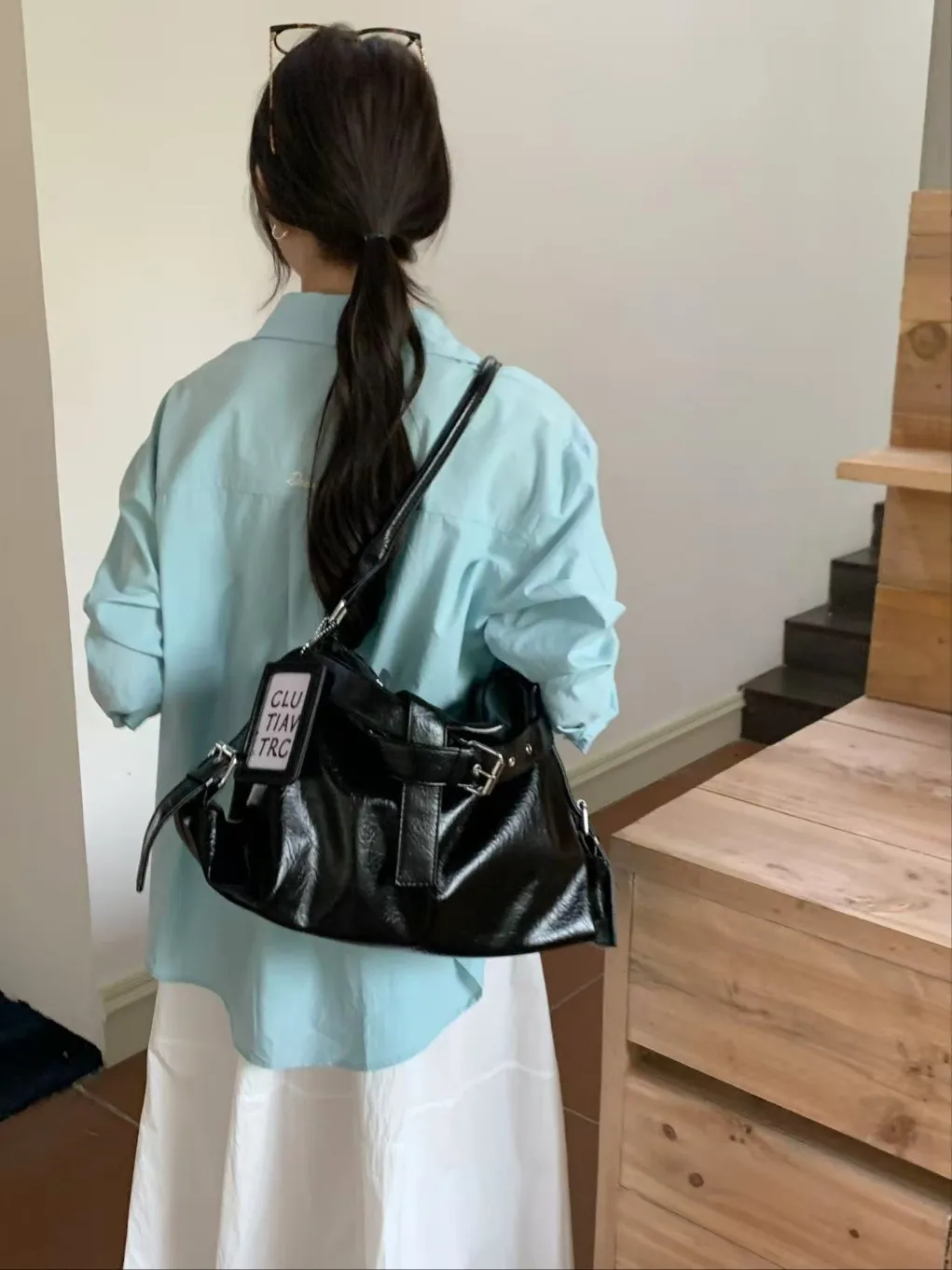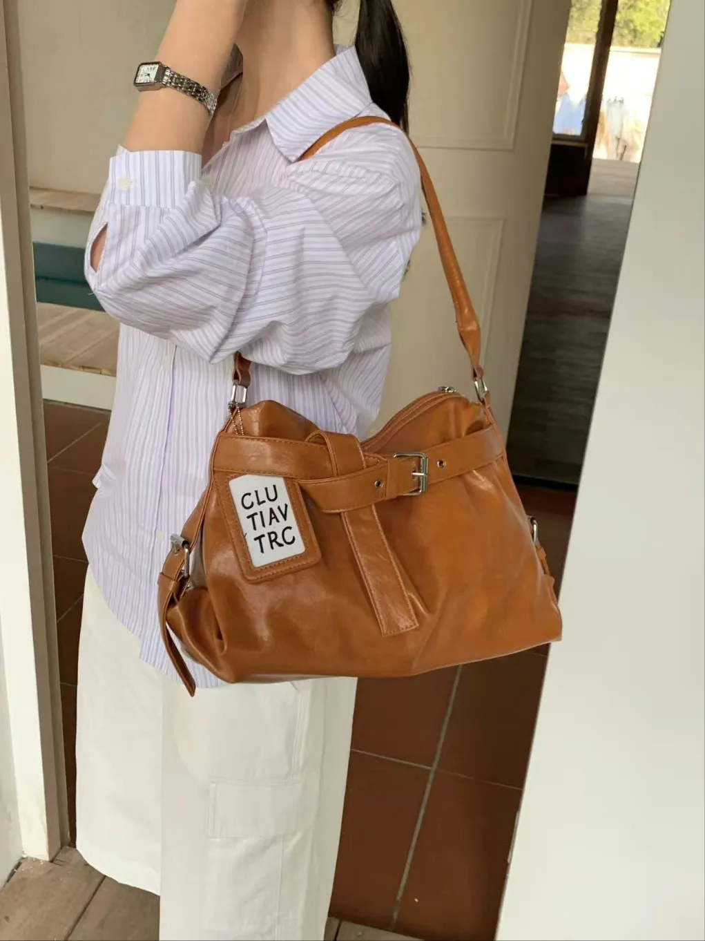 レザー調バックル無地ショルダーバッグ