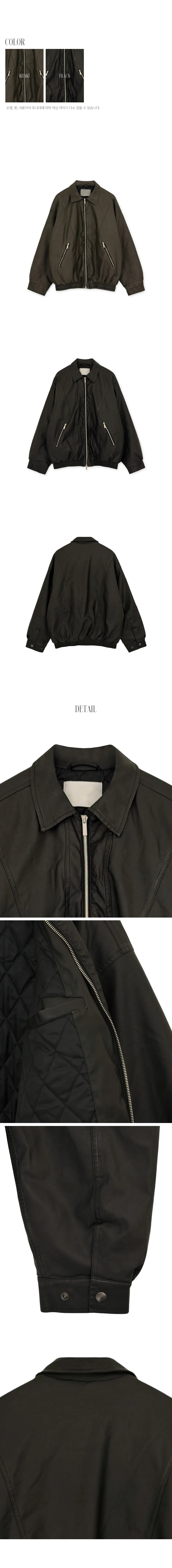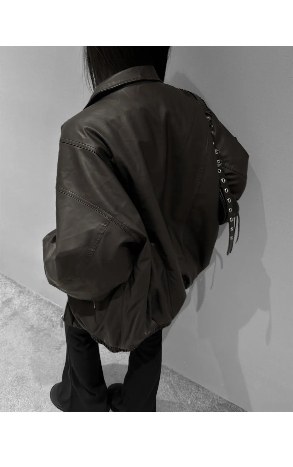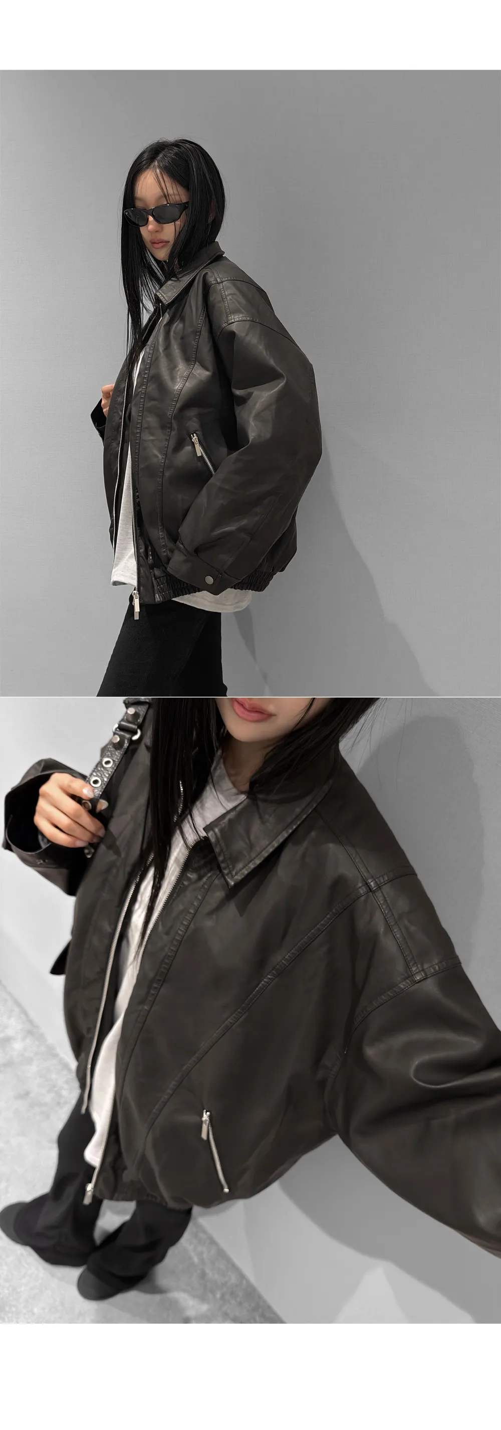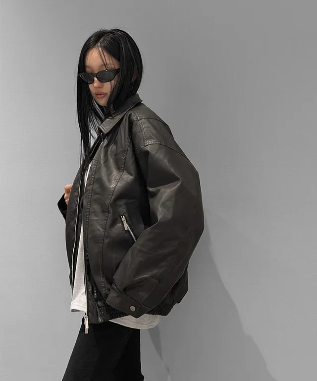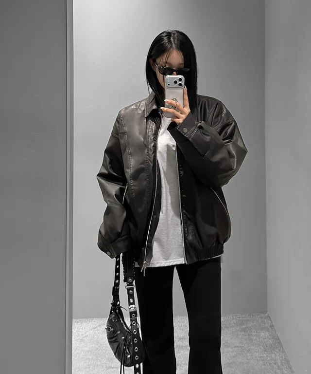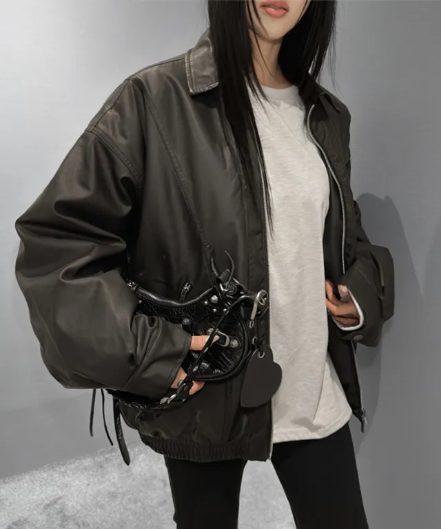 レザー調ツーポケットフラップポケットヒドゥンジッパードローコードオーバーサイズハーフ長袖ピンタックラインハーフネックスナップボタンジャンパー