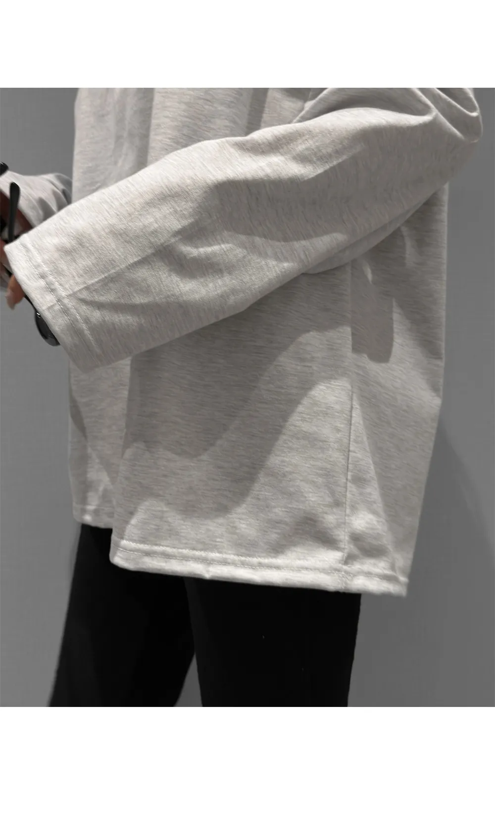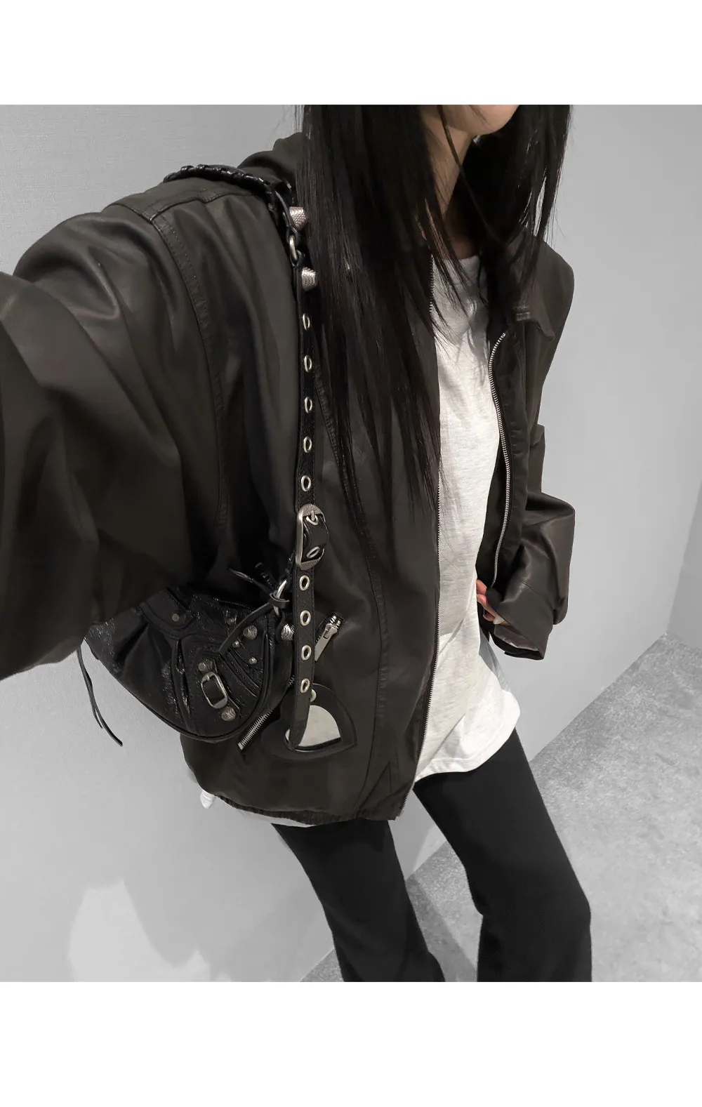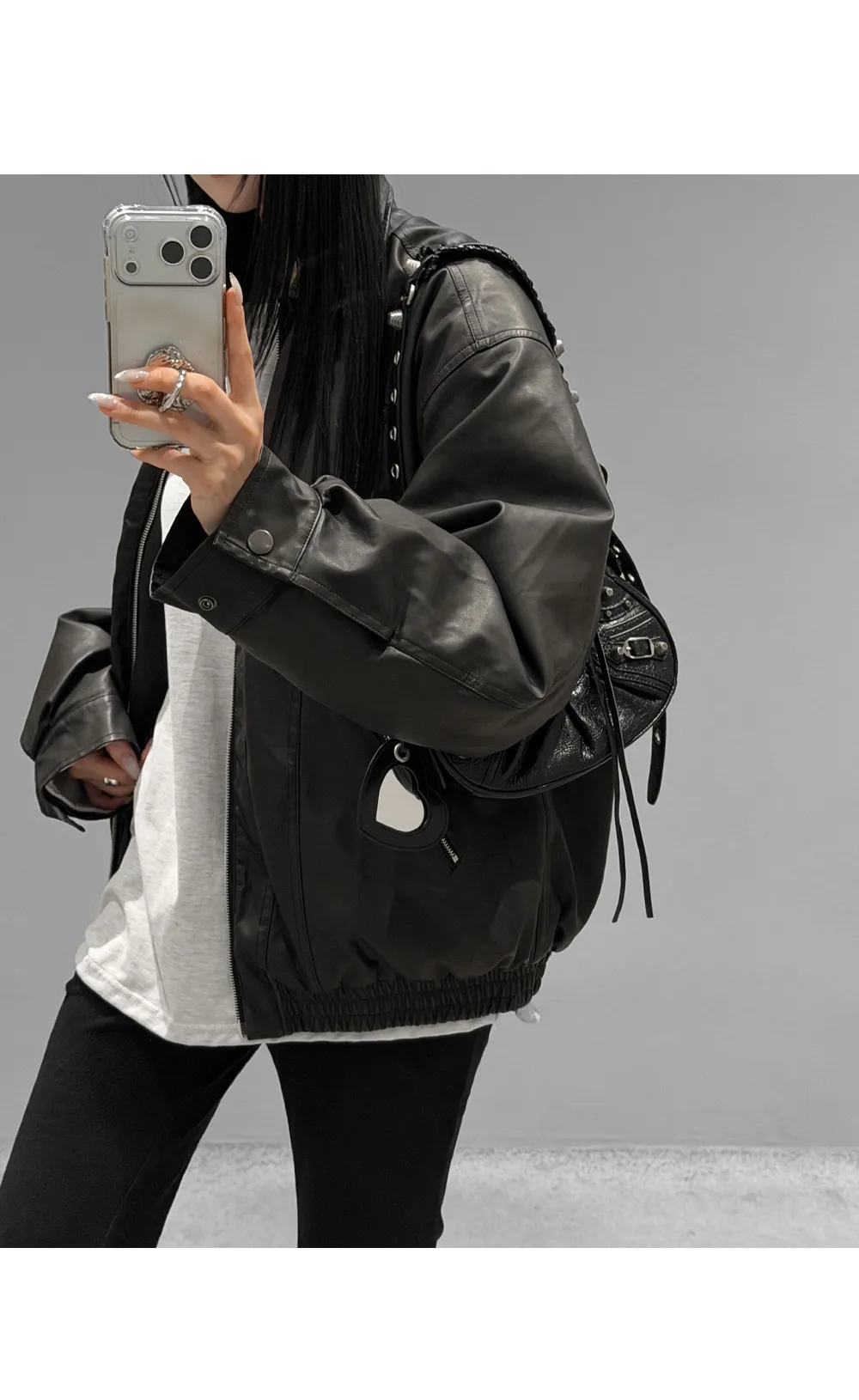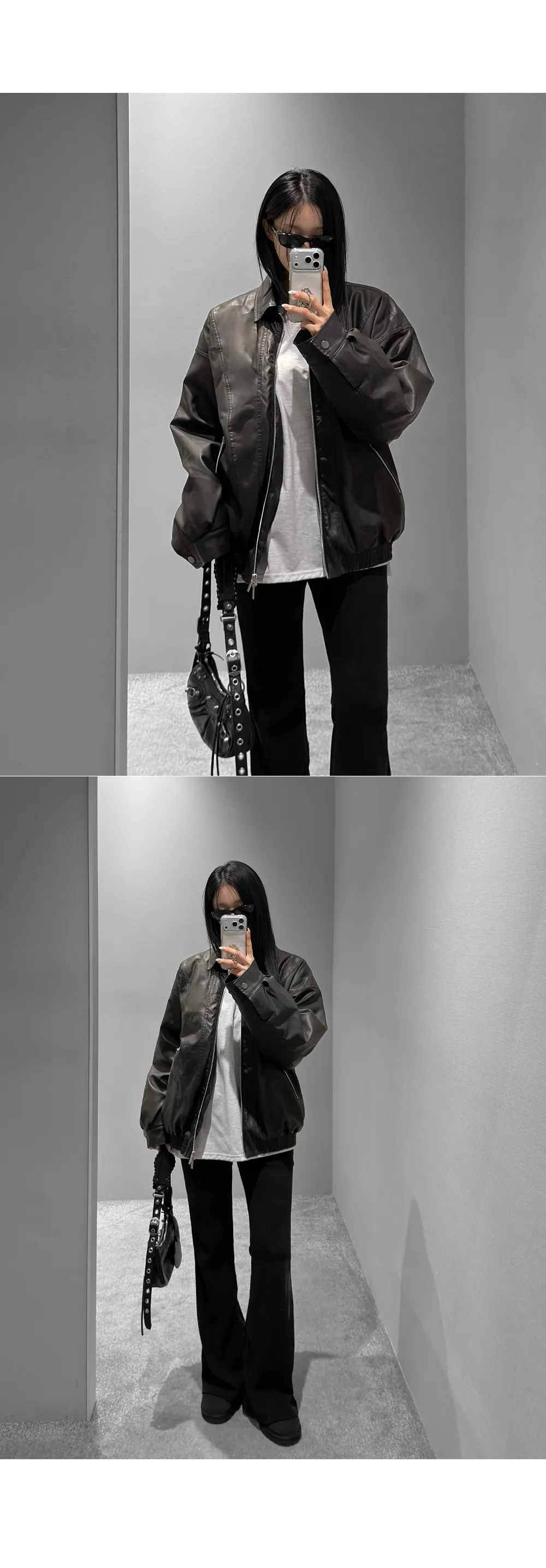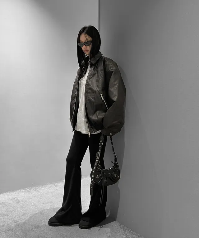 レザー調ツーポケットフラップポケットヒドゥンジッパードローコードオーバーサイズハーフ長袖ピンタックラインハーフネックスナップボタンジャンパー