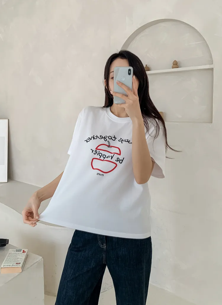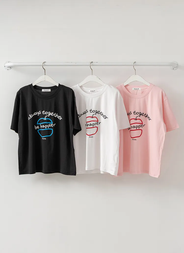 コットンラウンドネックルーズ半袖プリントカラーTシャツ