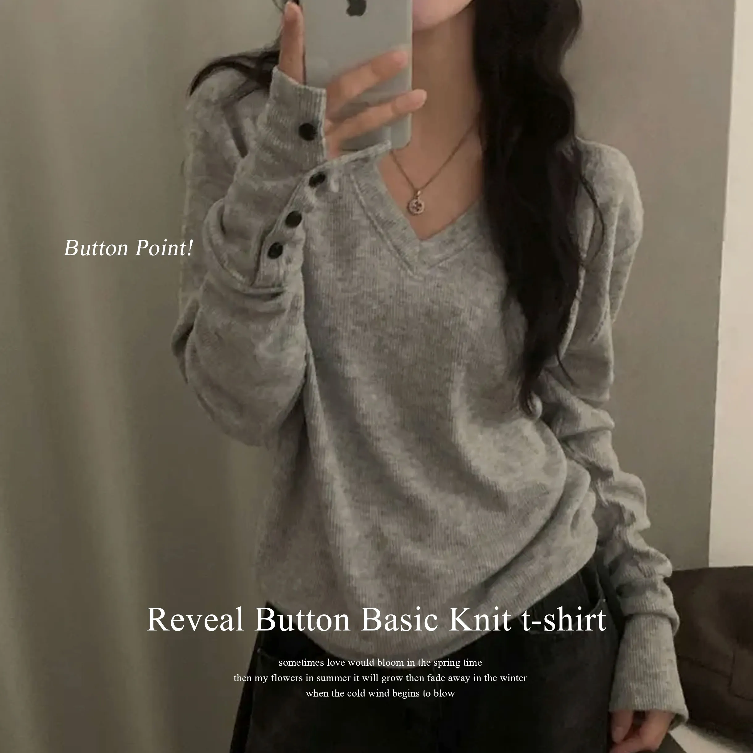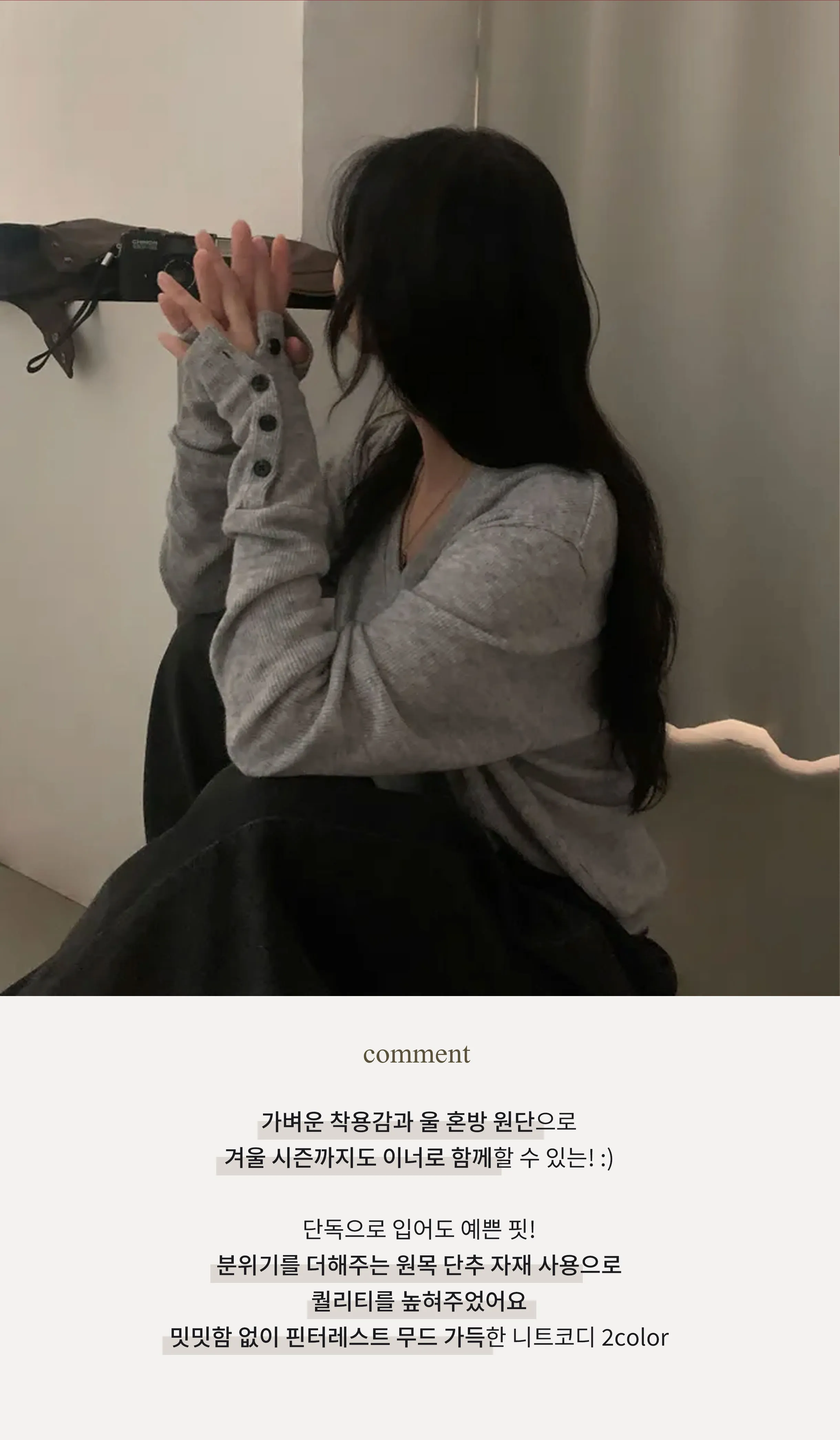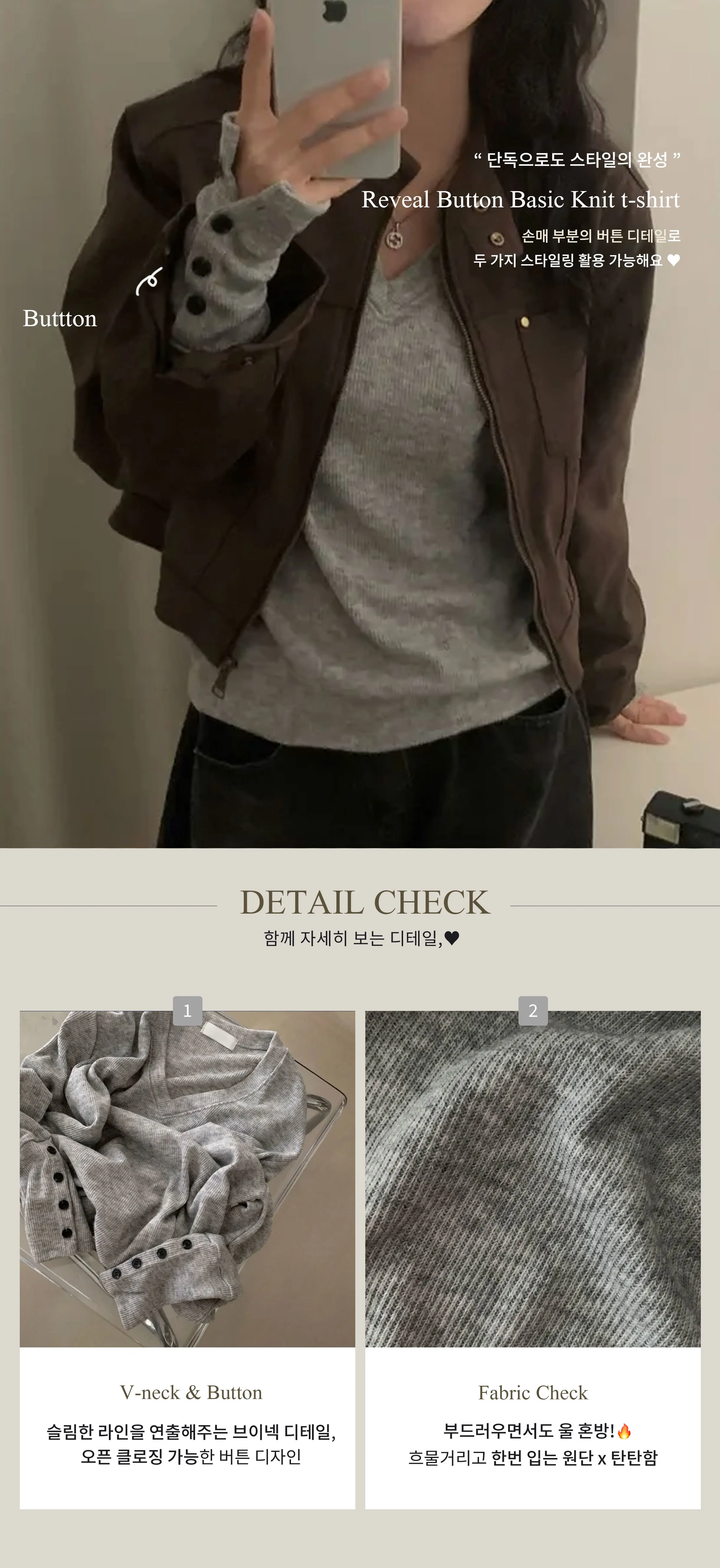 브이넥 디자인으로 목선은 길고 슬림하게 보이면서도 얼굴은 작아 보인답니다