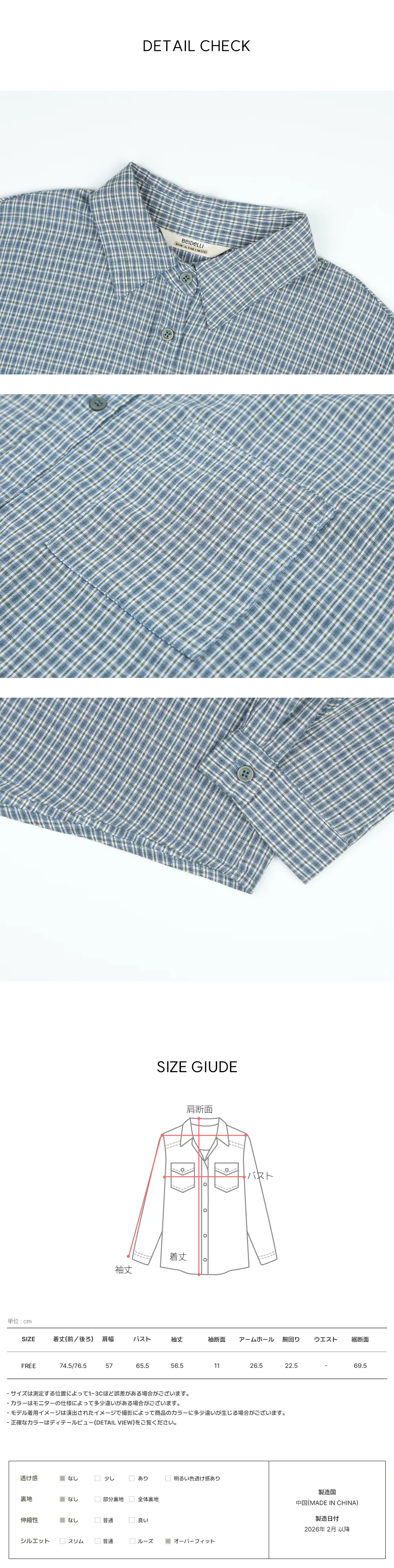 | Size | 肩幅 | 身幅 | 袖丈 | 着丈 | 袖幅 | アームホール |