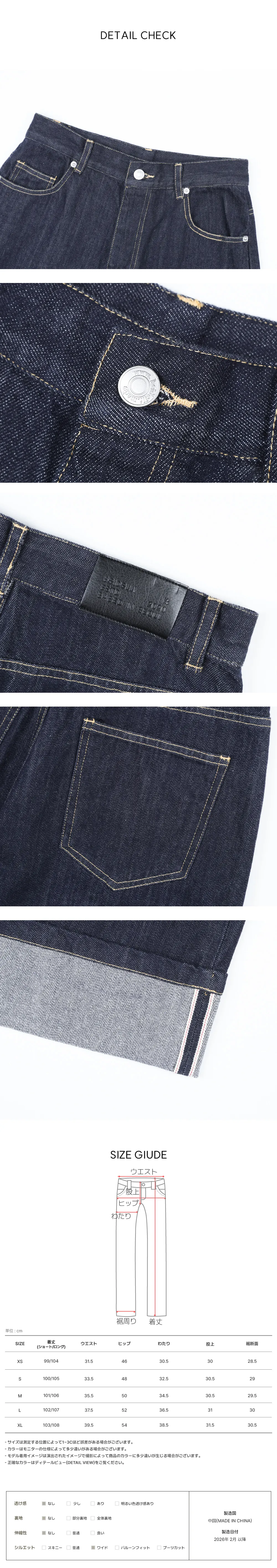 | Size | ウエスト | ヒップ | 裾幅 | わたり | 股上 | 着丈 |