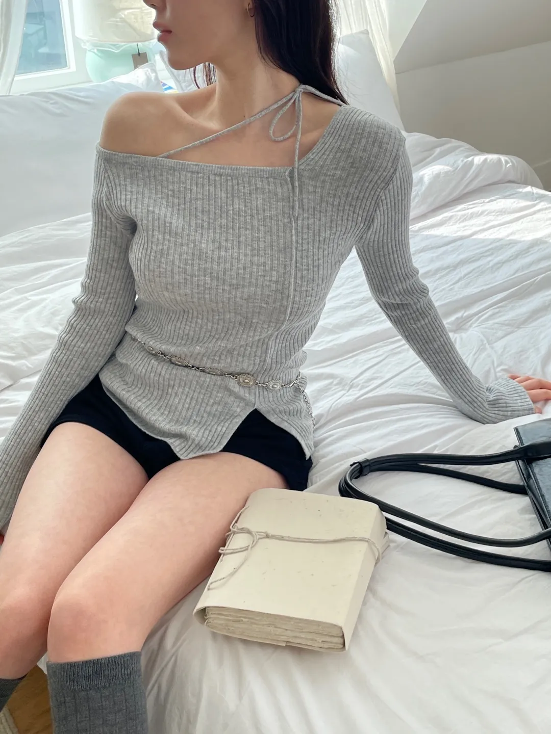 リブ長袖スリムオフショルダーニット