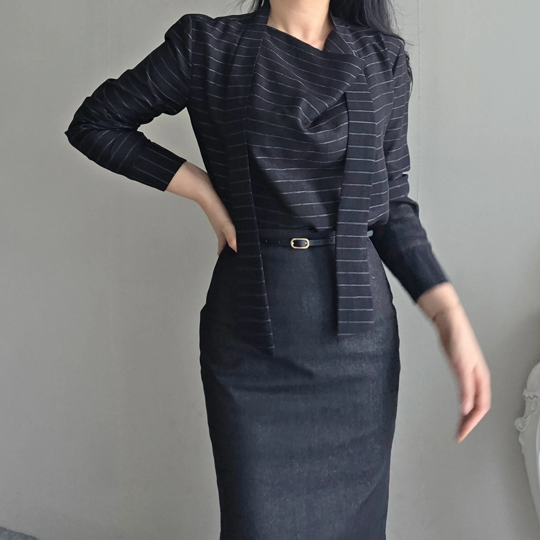 リブボートネックペプラムウエストゴムスリムHライン(ロング丈)セットアップ