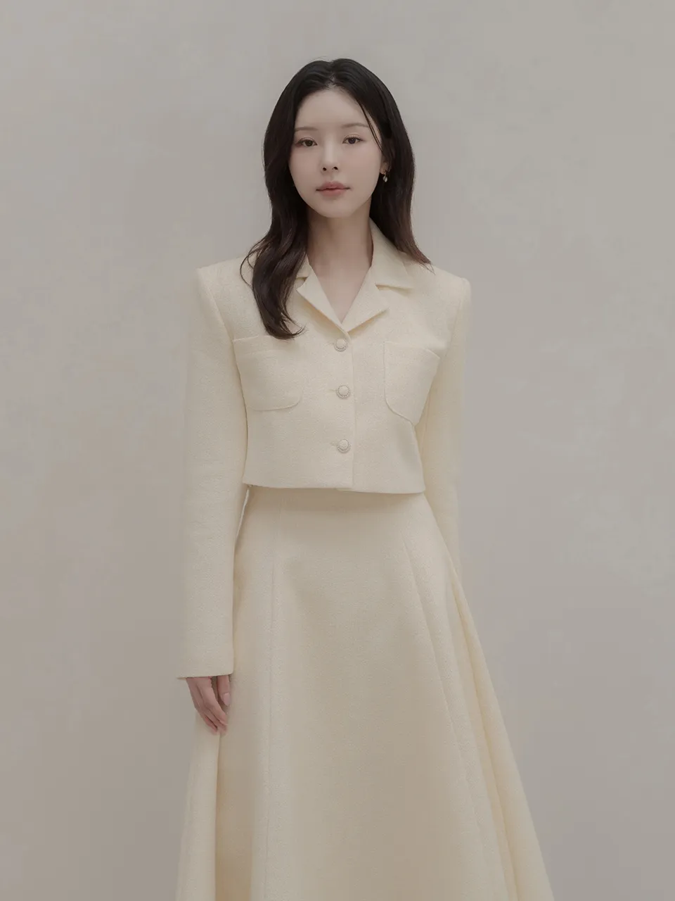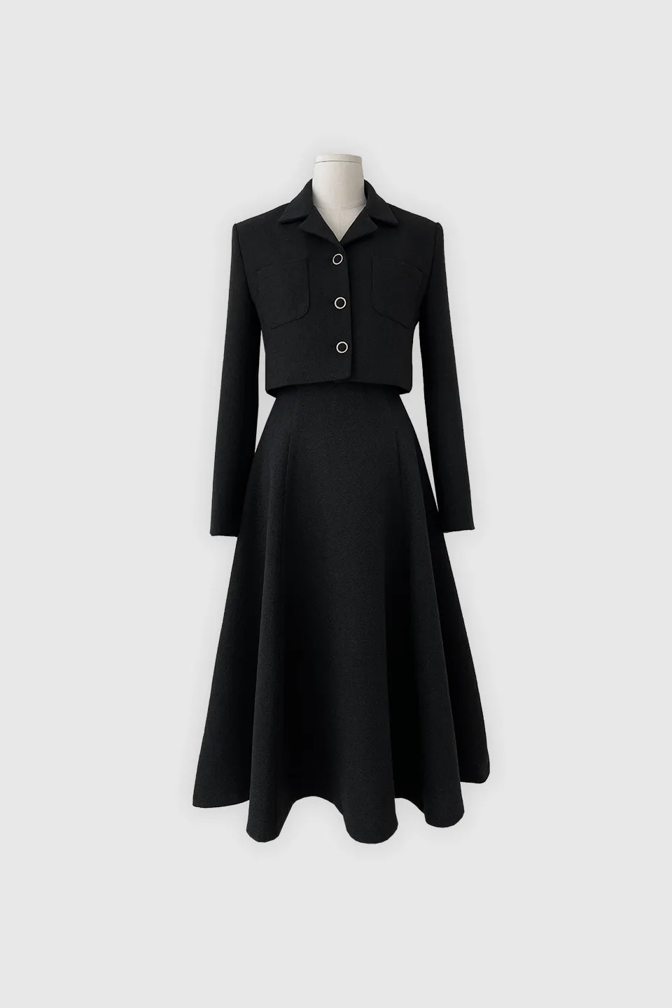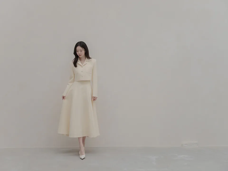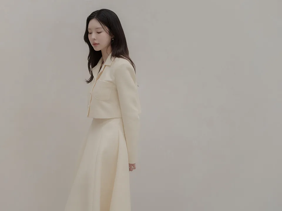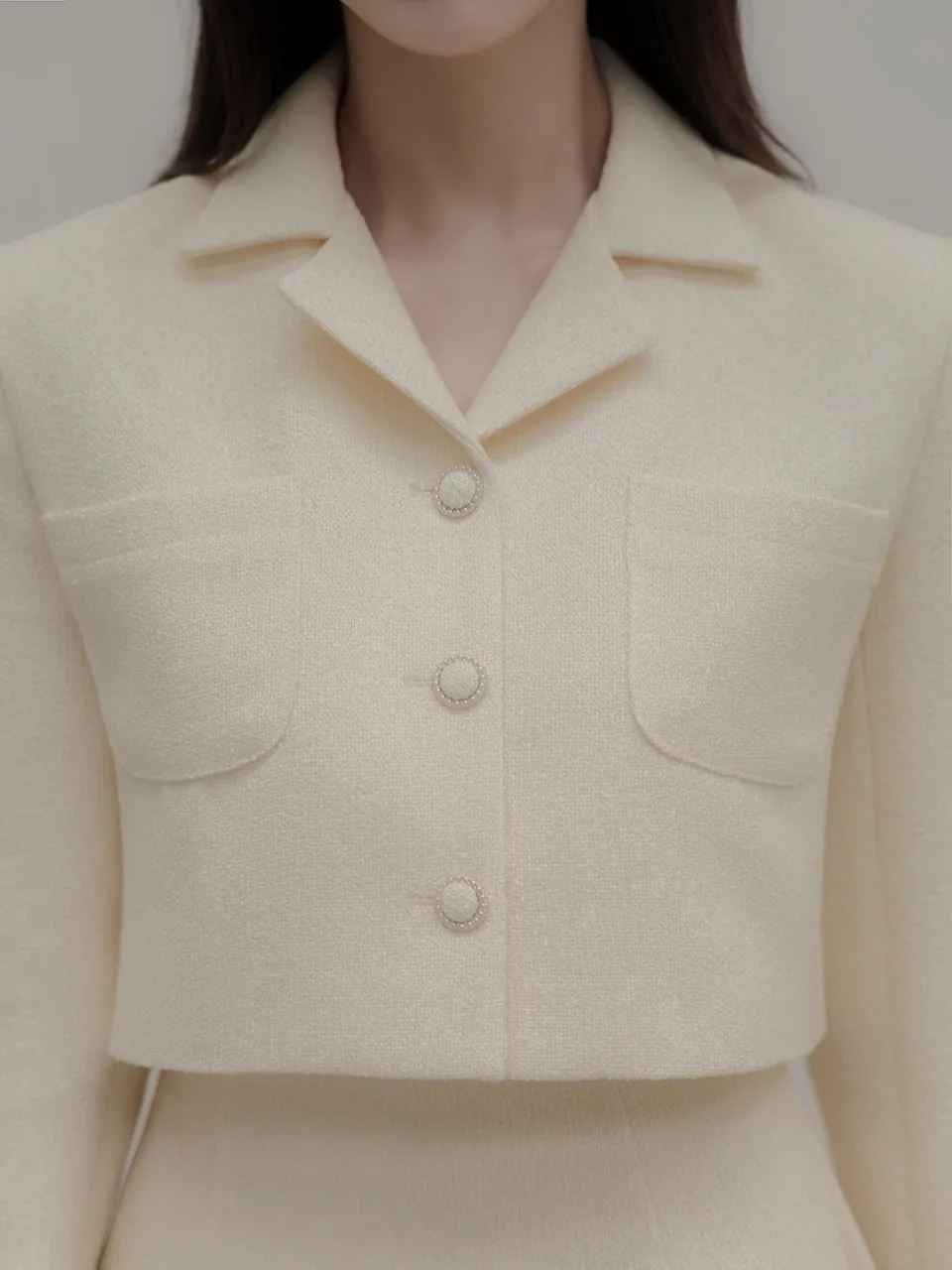 ツイードウール混ラウンドネックプリーツ肩パッドライン長袖ビジューボタンシークレットボタンダブルボタンツーピース(トップス、ボトムス)スカートダブルジャケット