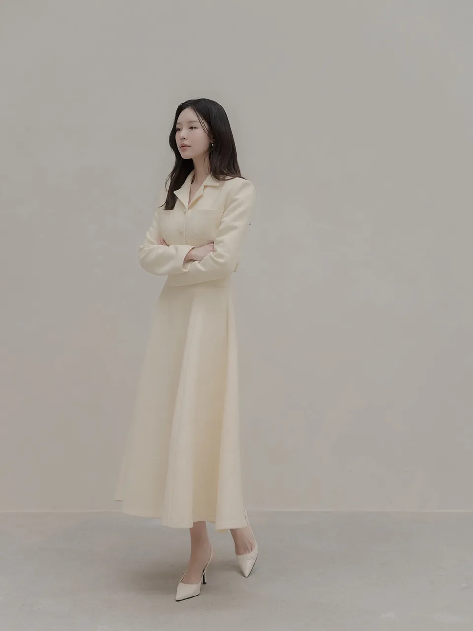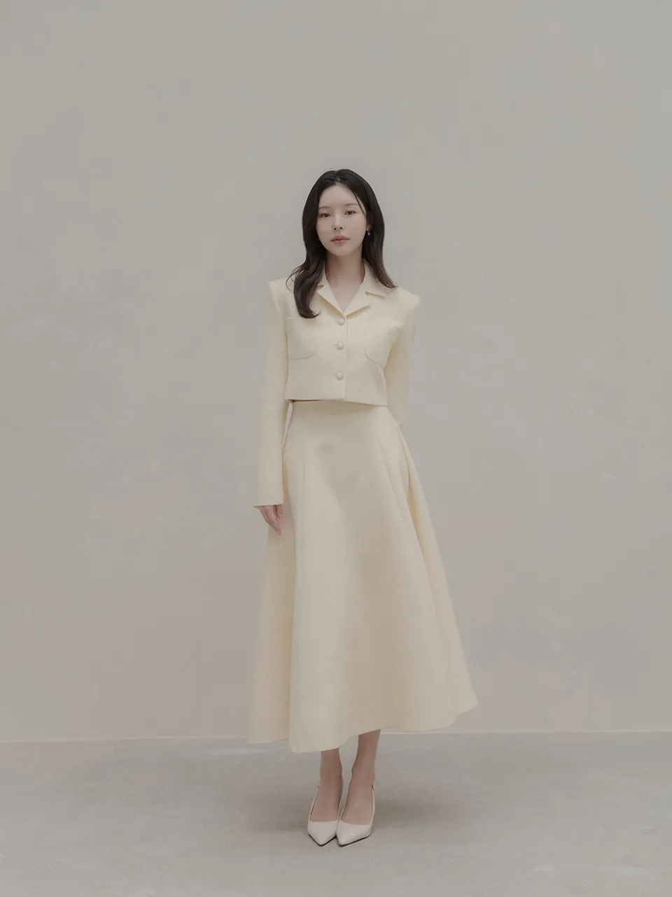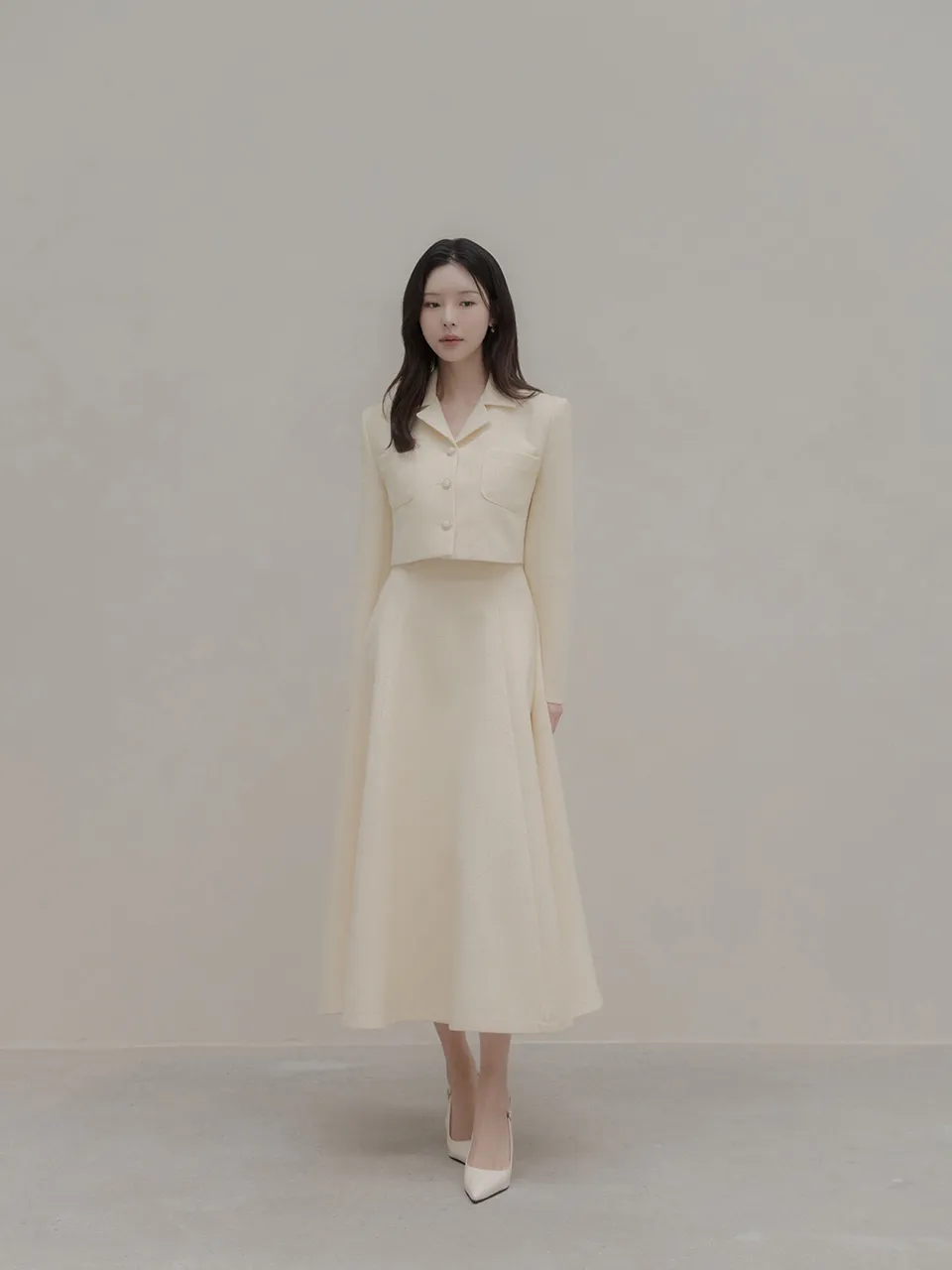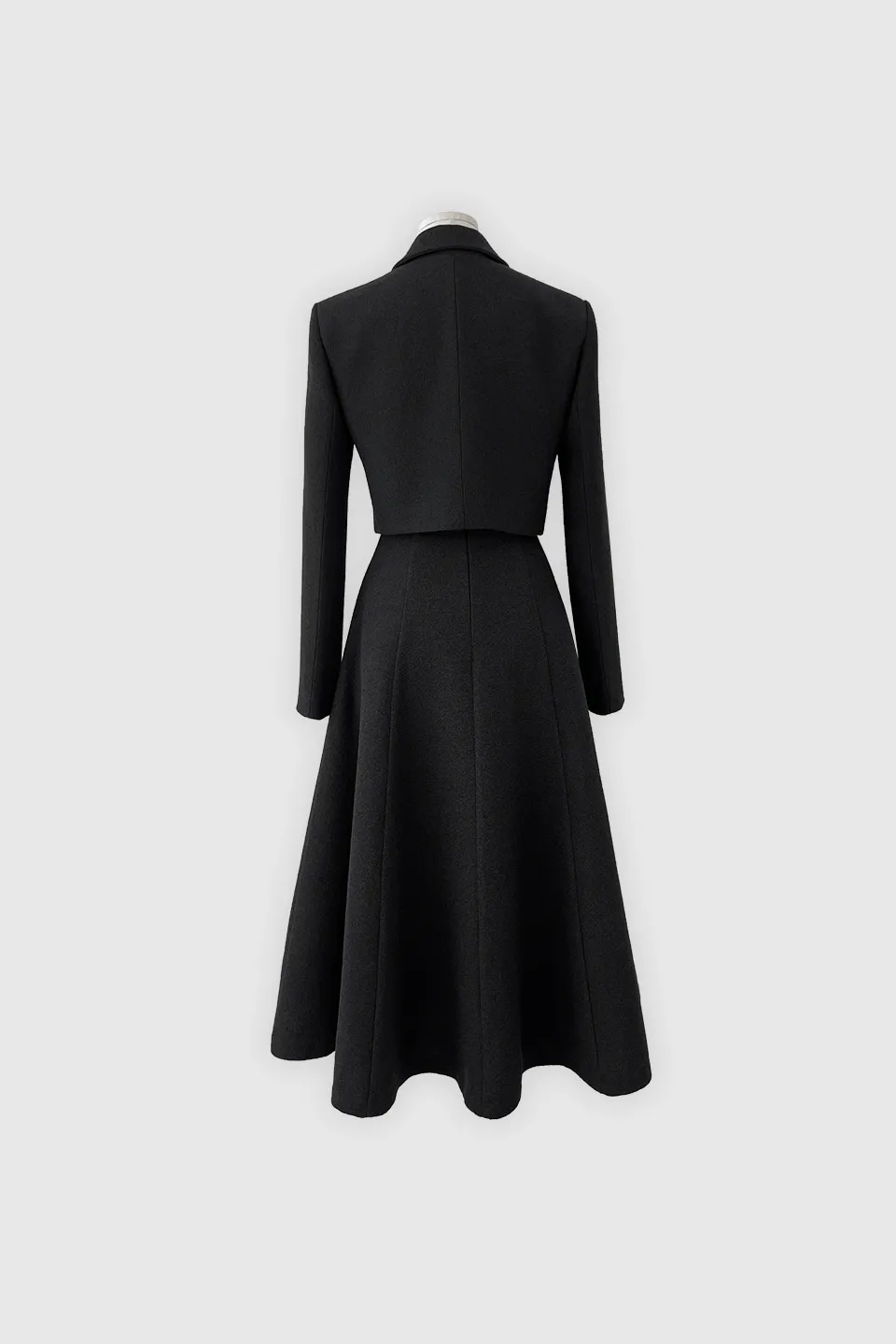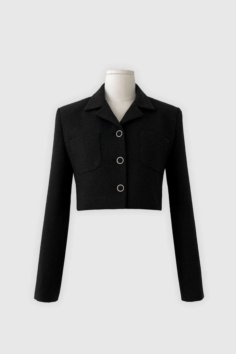 ツイードウール混ラウンドネックプリーツ肩パッドライン長袖ビジューボタンシークレットボタンダブルボタンツーピース(トップス、ボトムス)スカートダブルジャケット