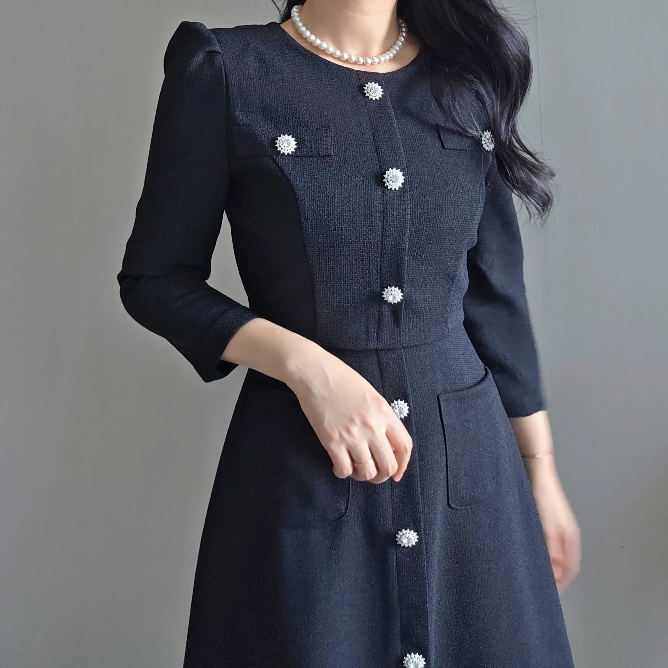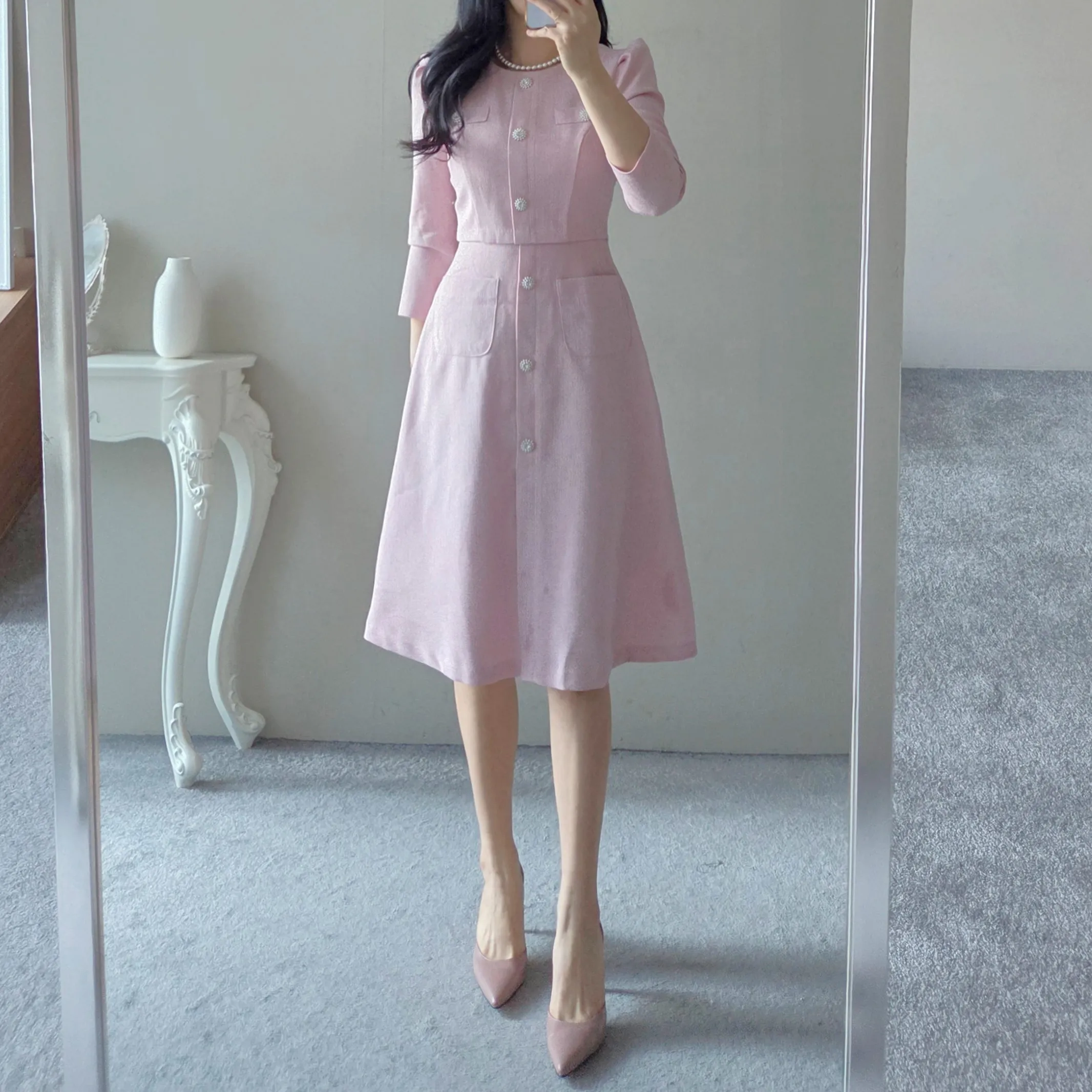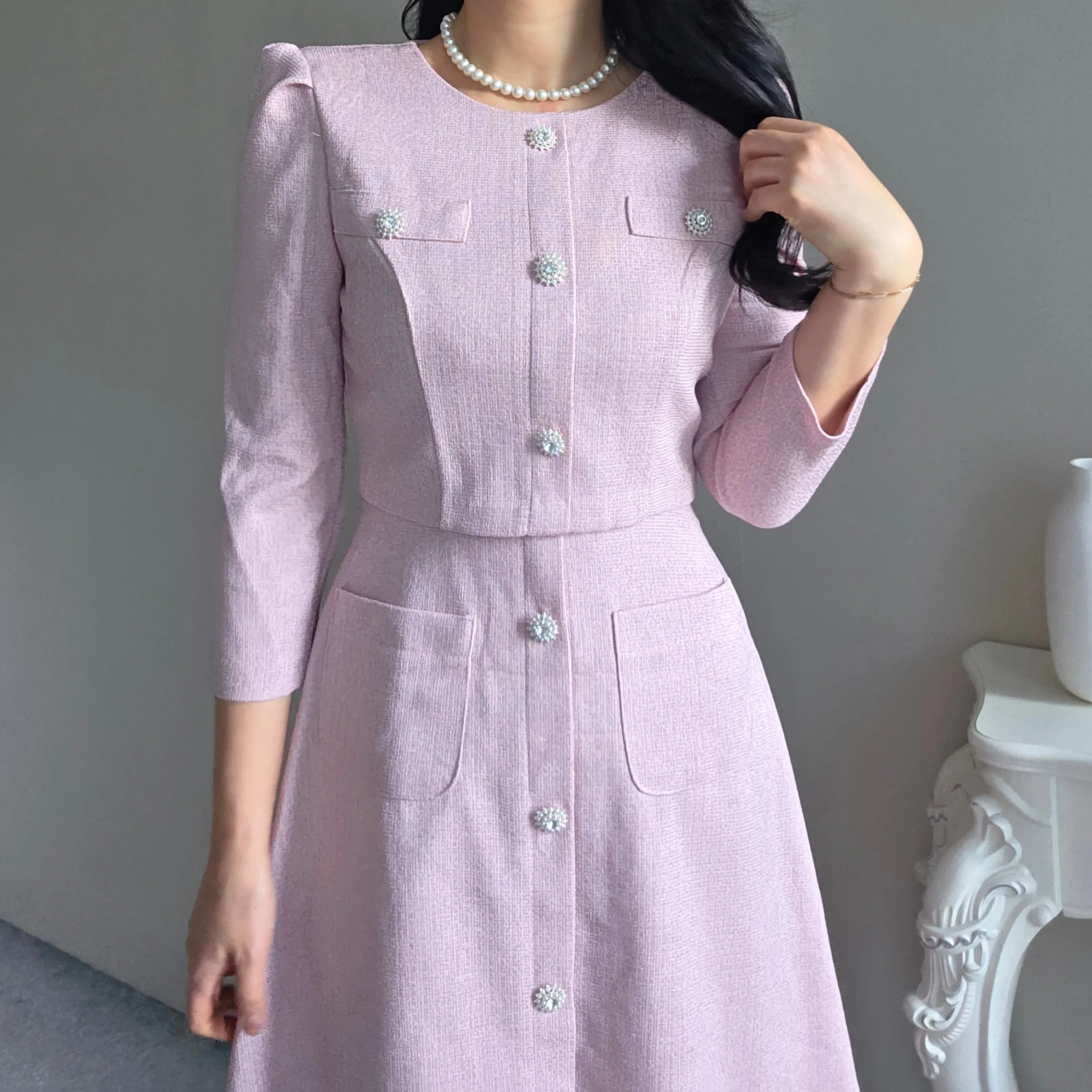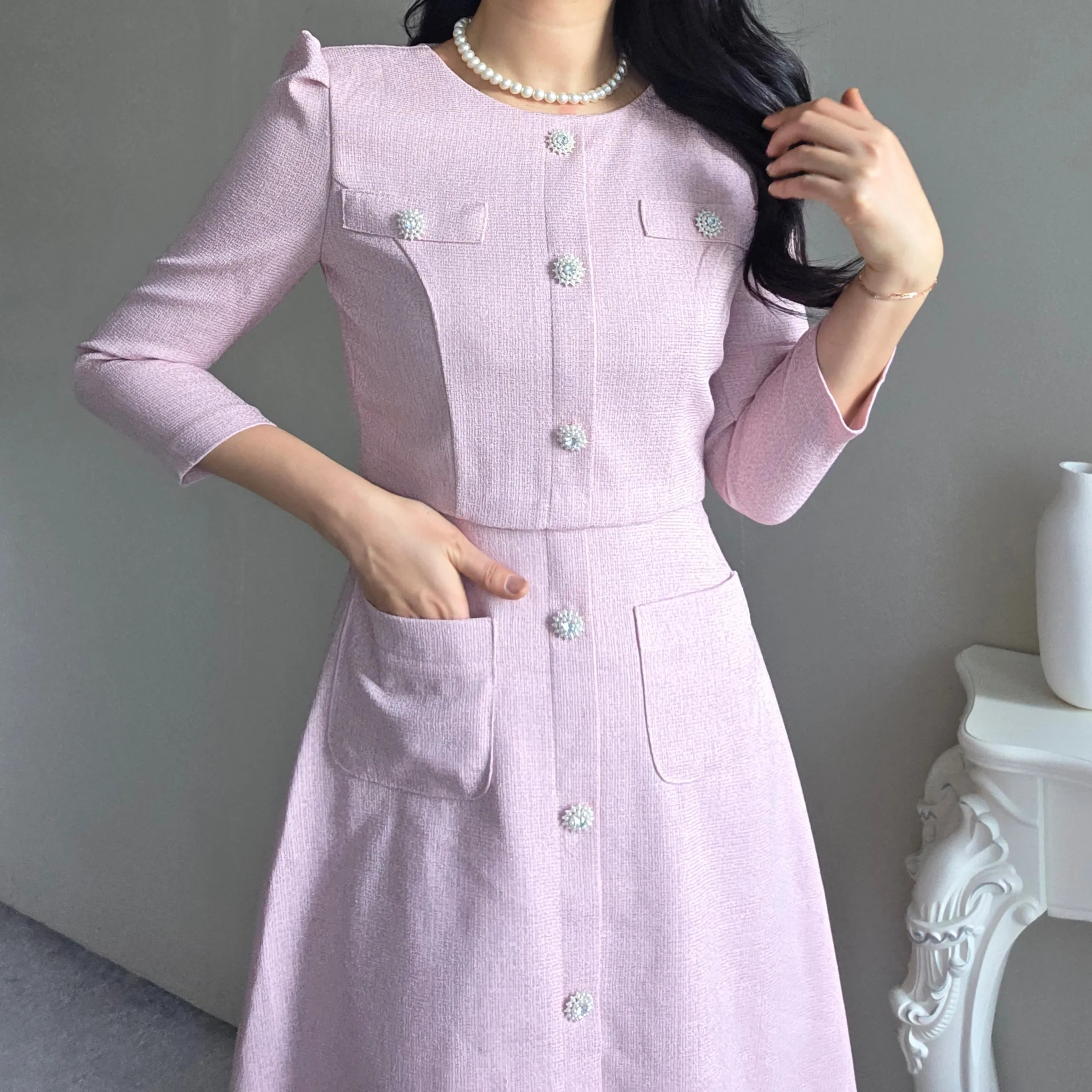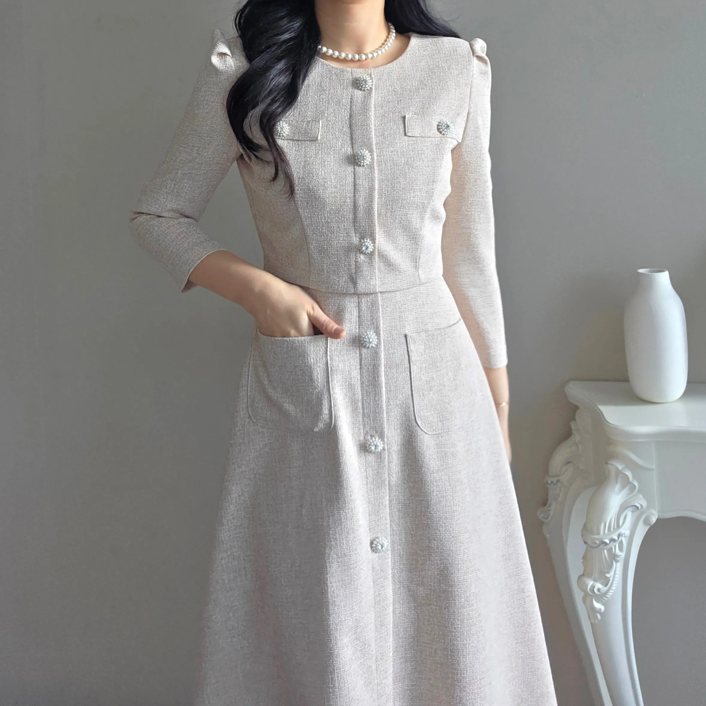 ツイード7分袖レイヤード風ピンタックギャザーパフスリーブミディAラインハイウエストラウンドネックポケットフェイクボタン無地ワンピース・S1958467