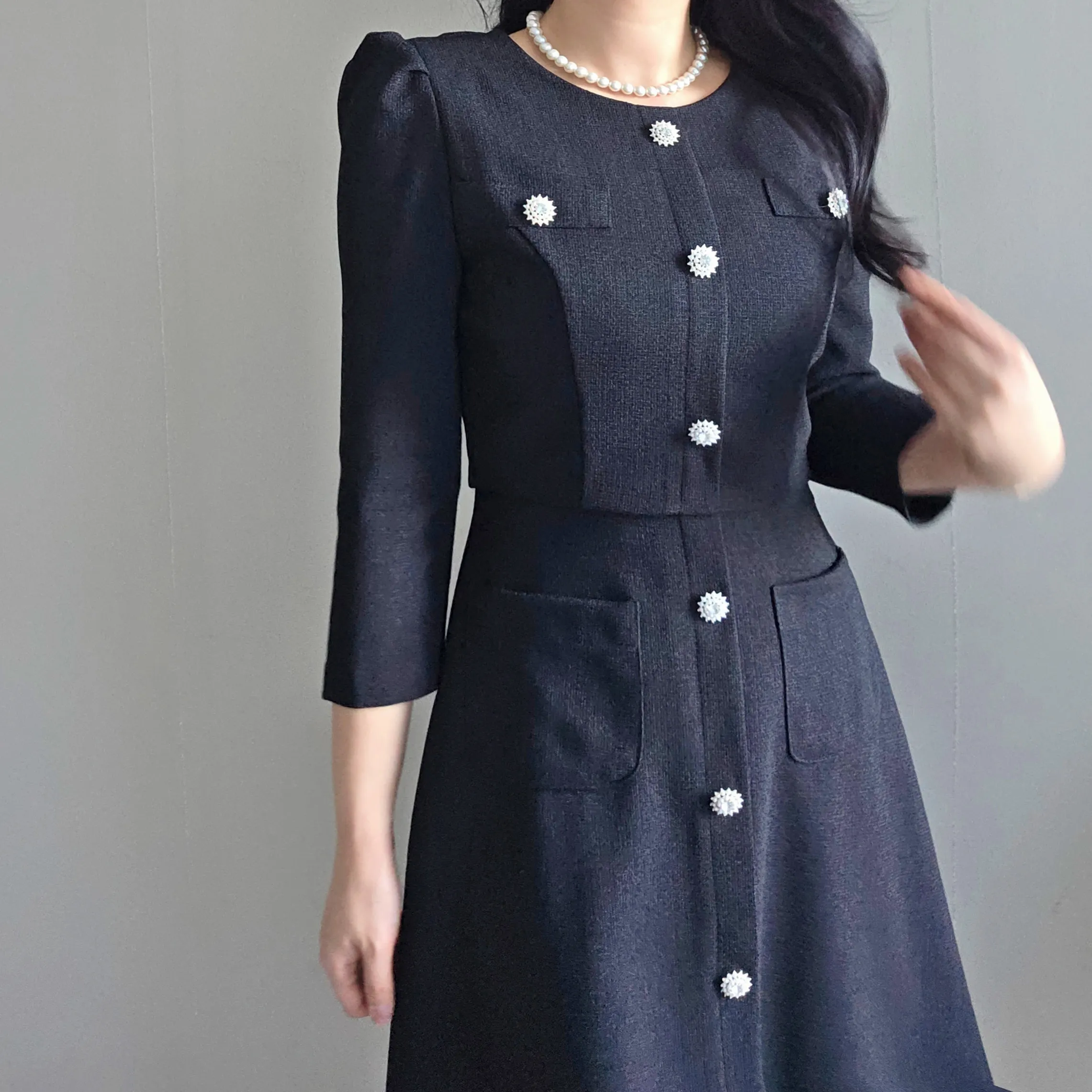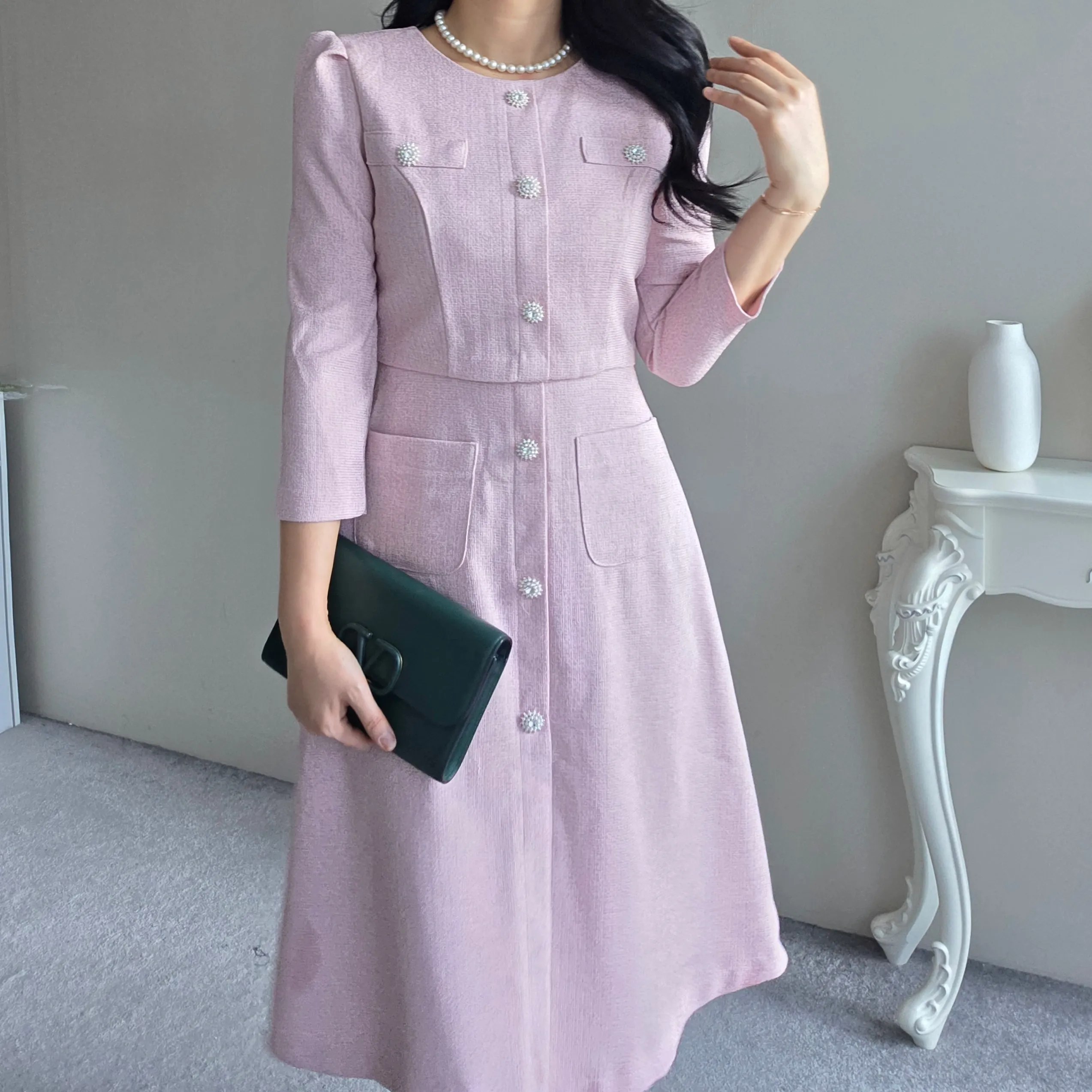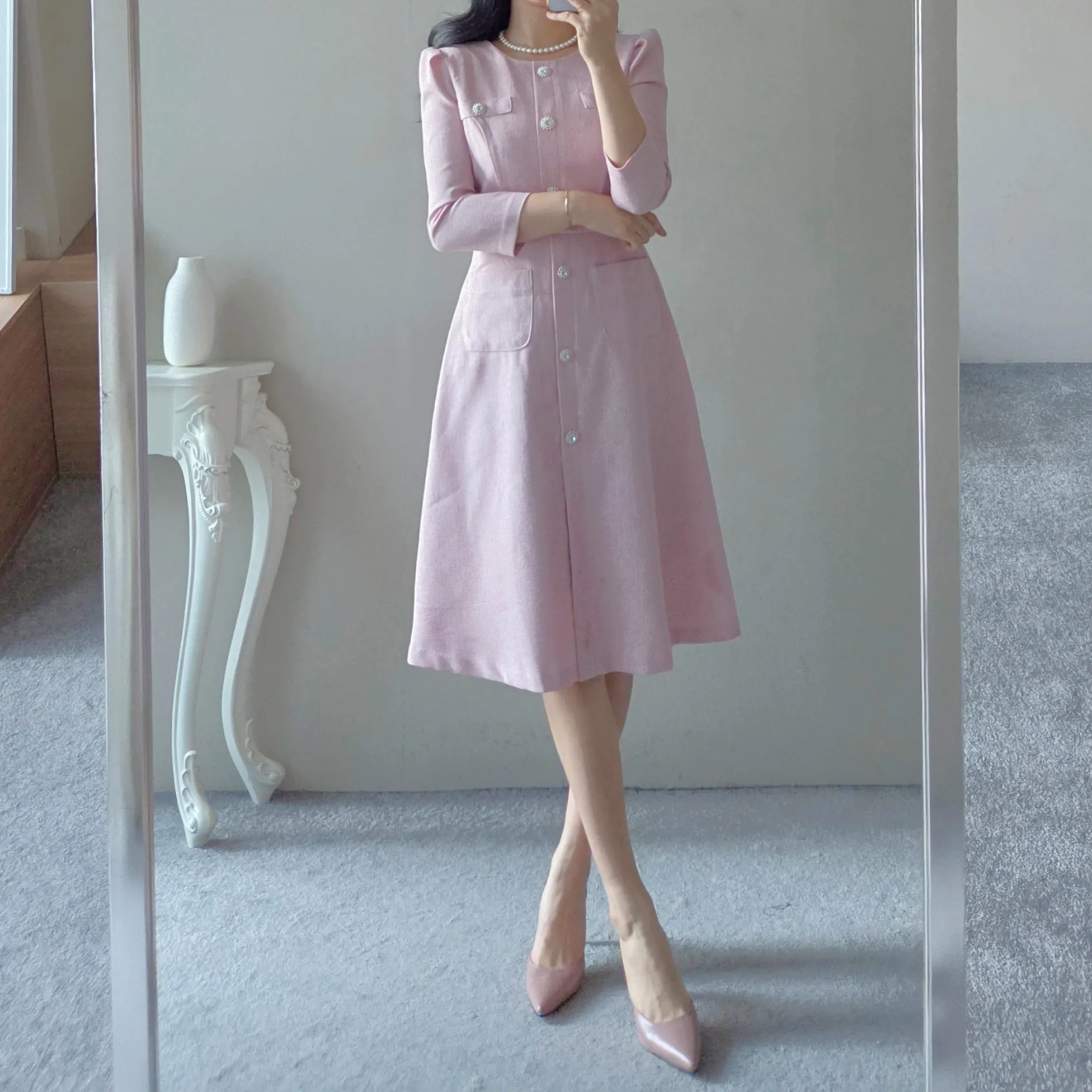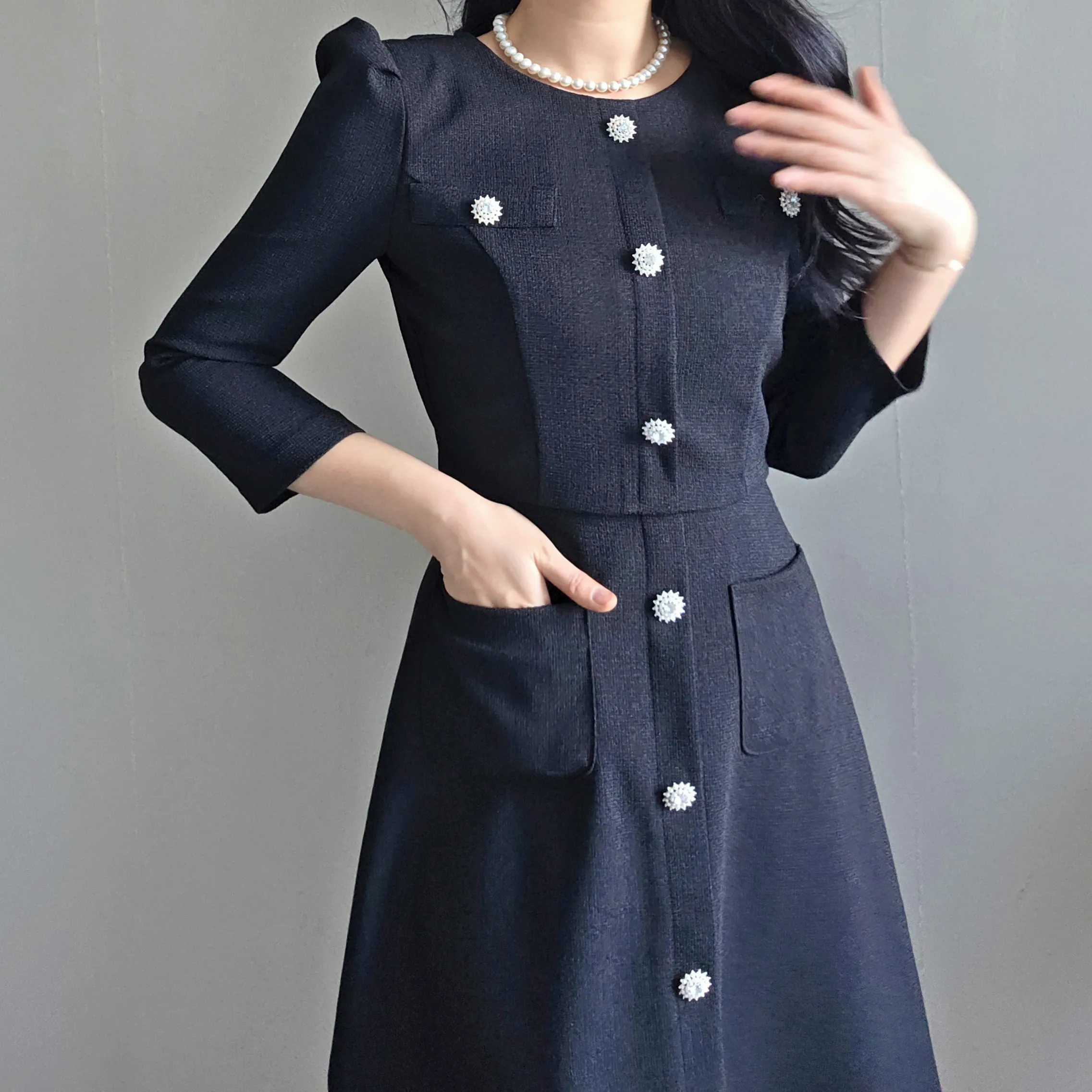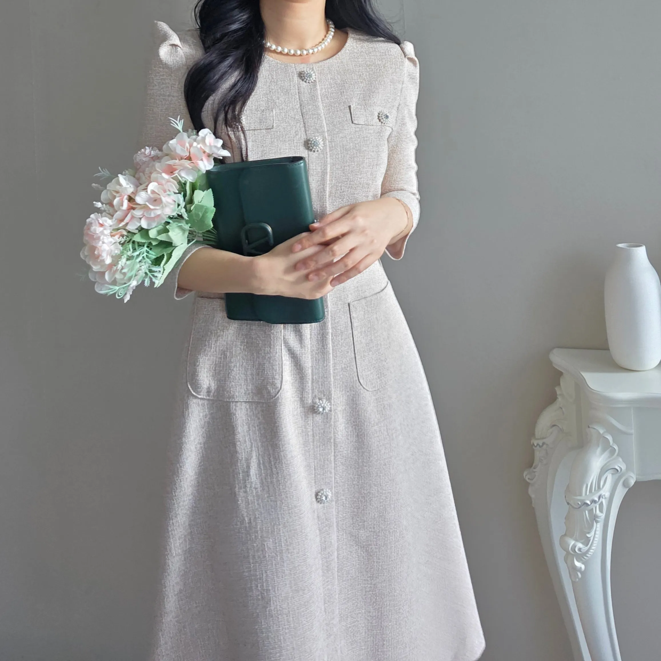 ツイード7分袖レイヤード風ピンタックギャザーパフスリーブミディAラインハイウエストラウンドネックポケットフェイクボタン無地ワンピース・S1958467