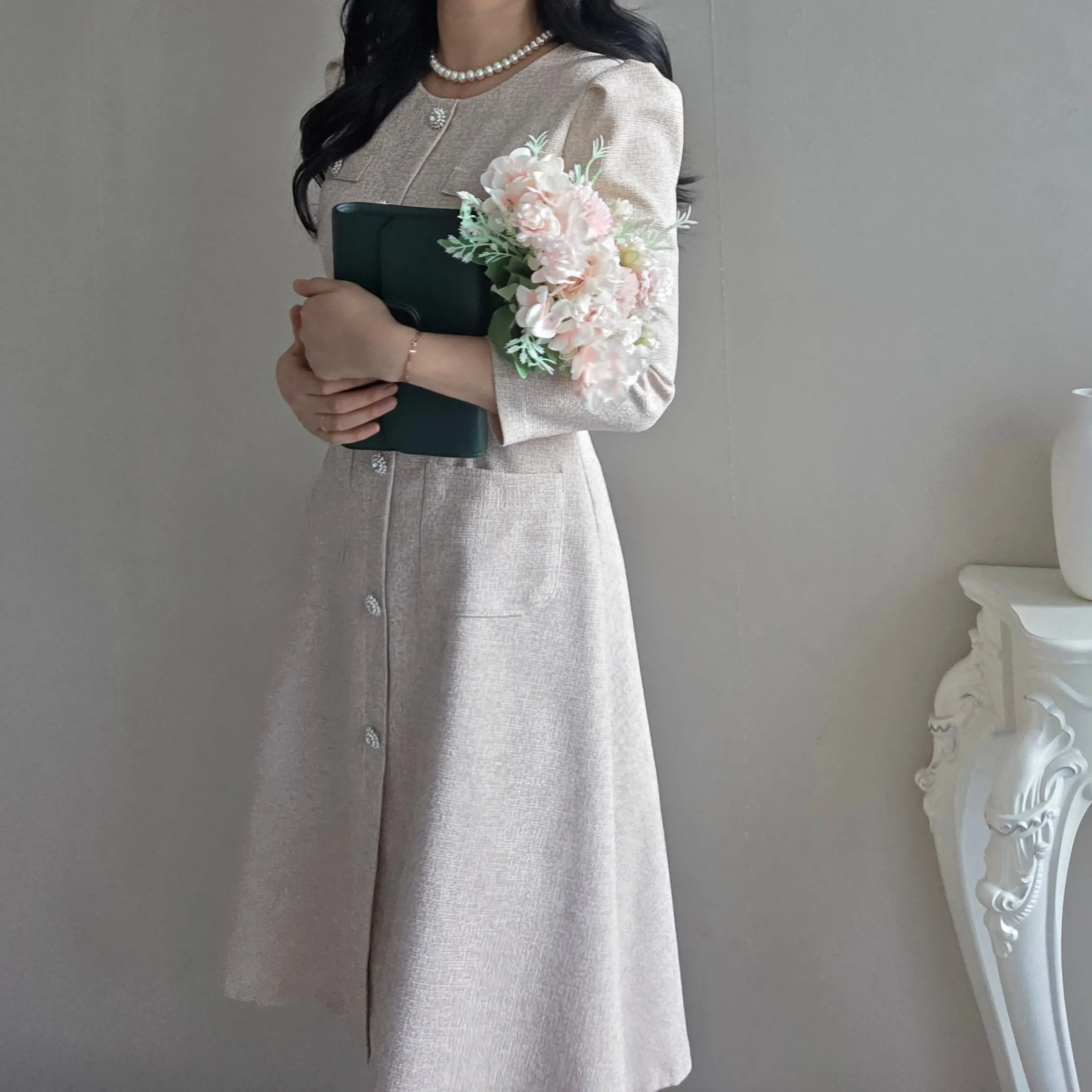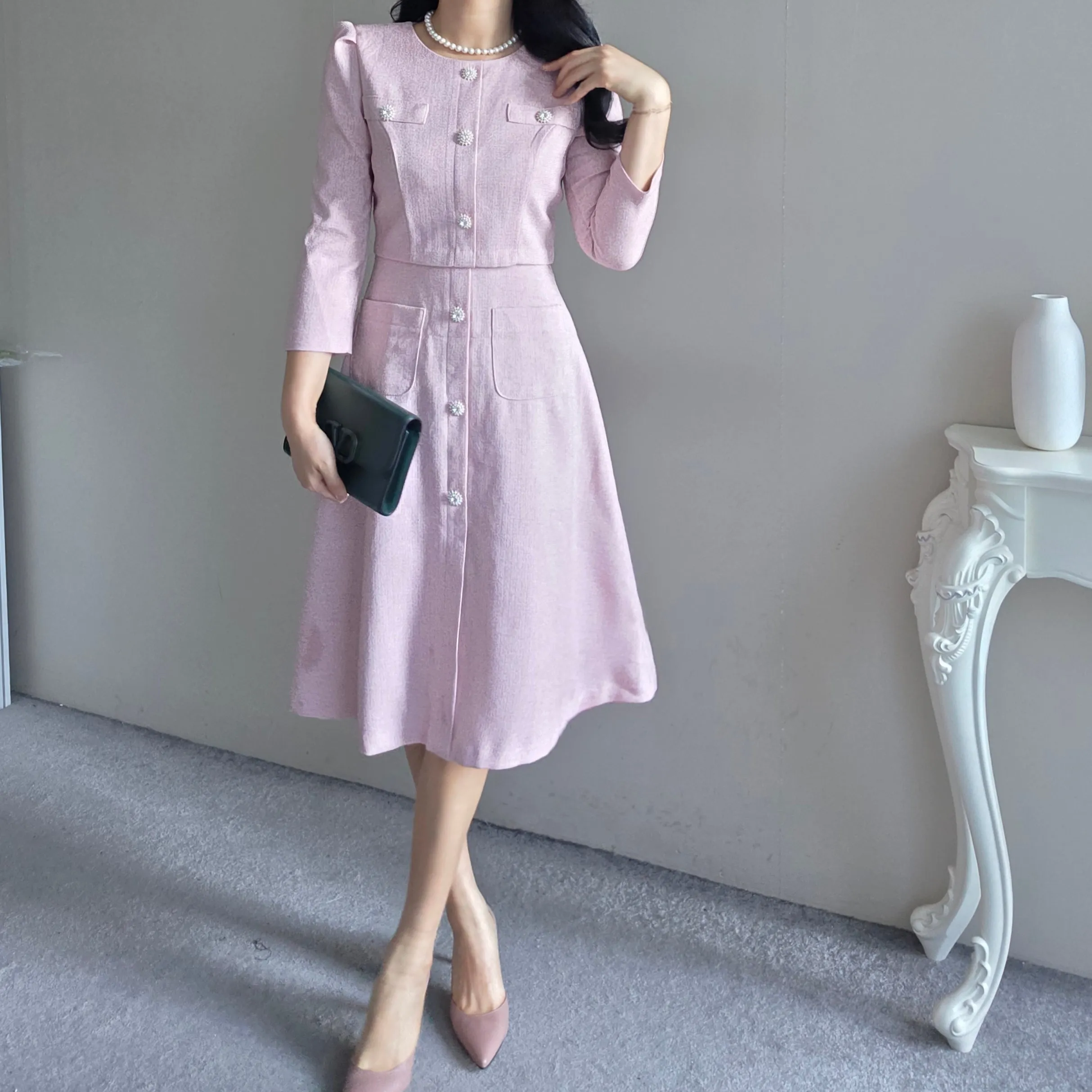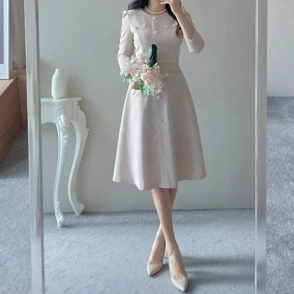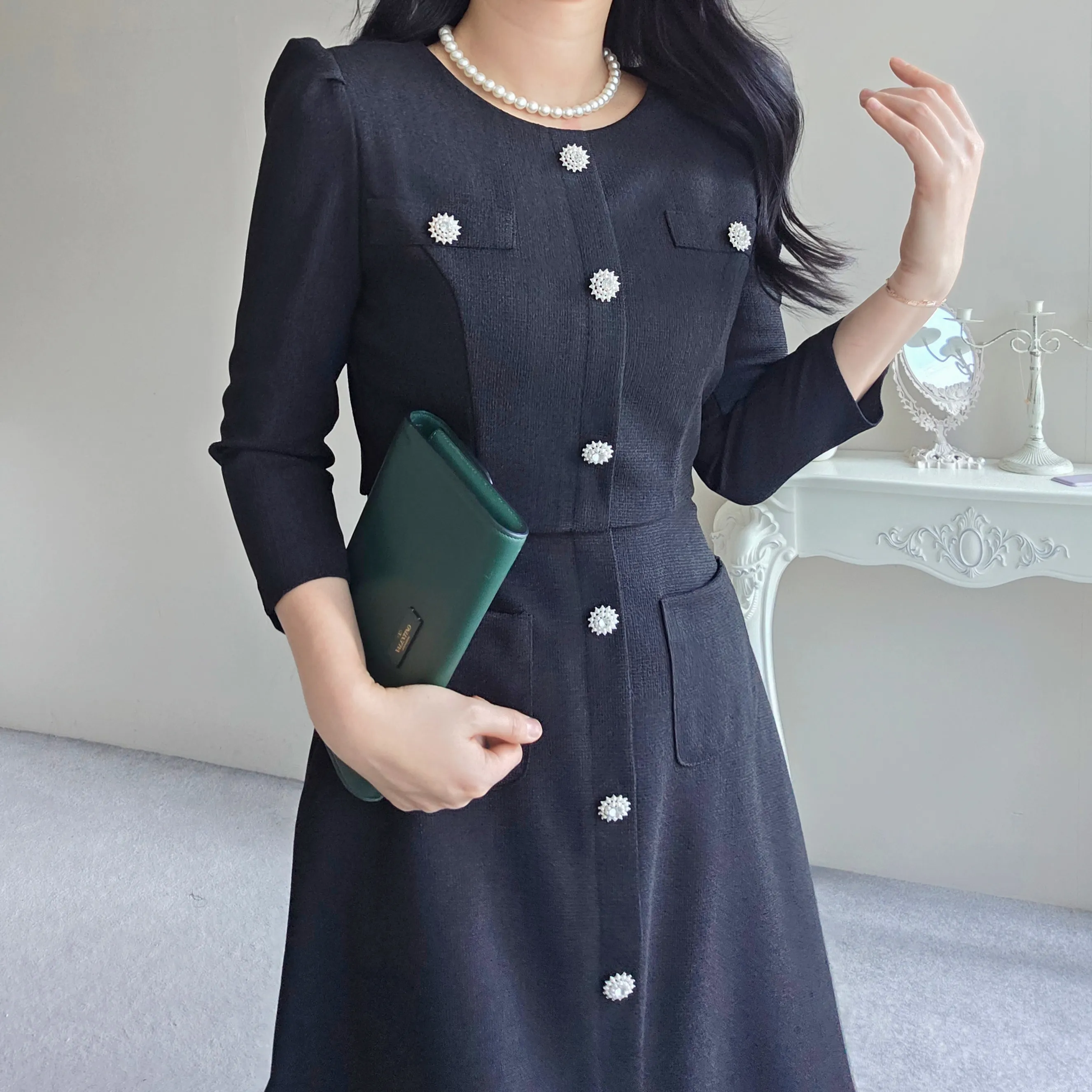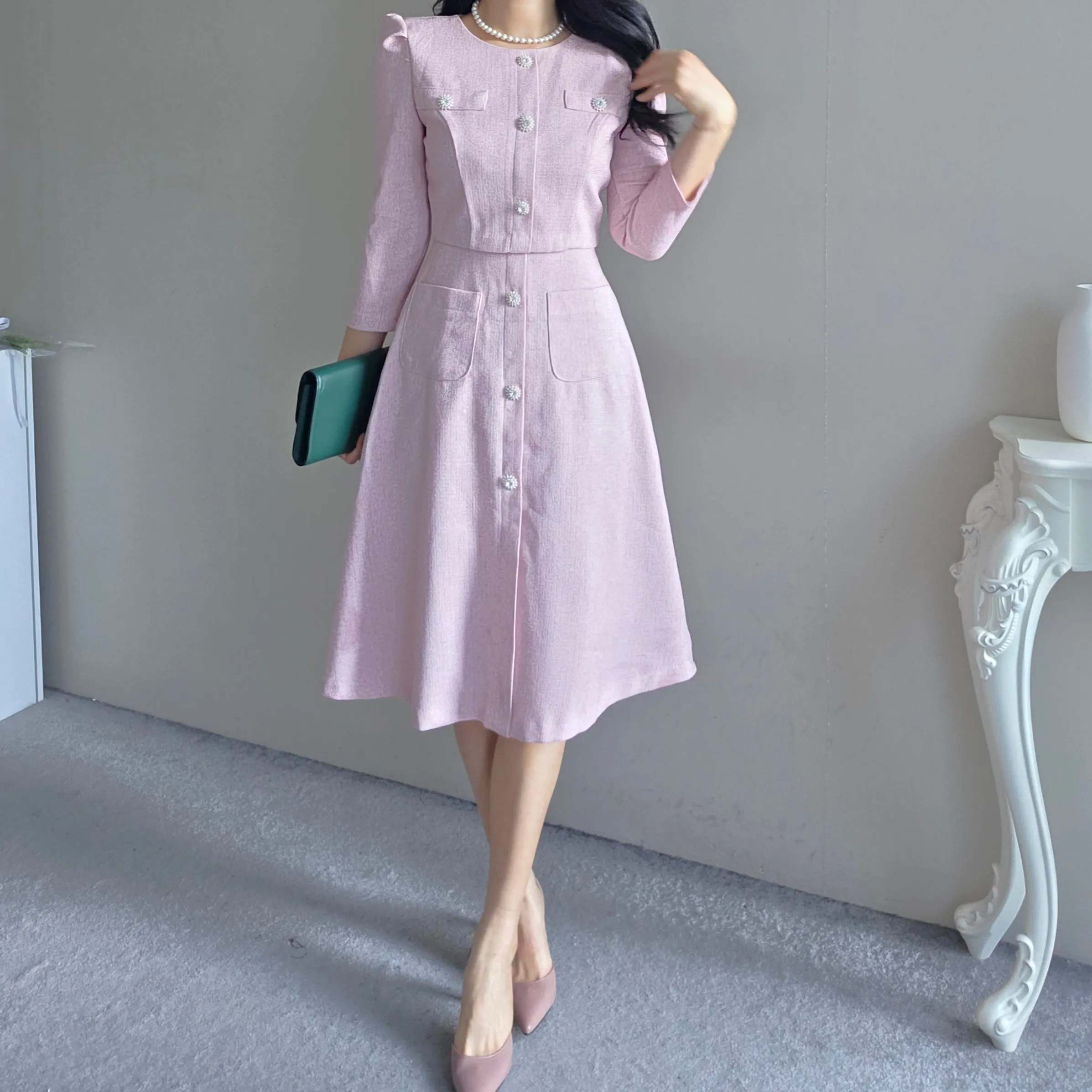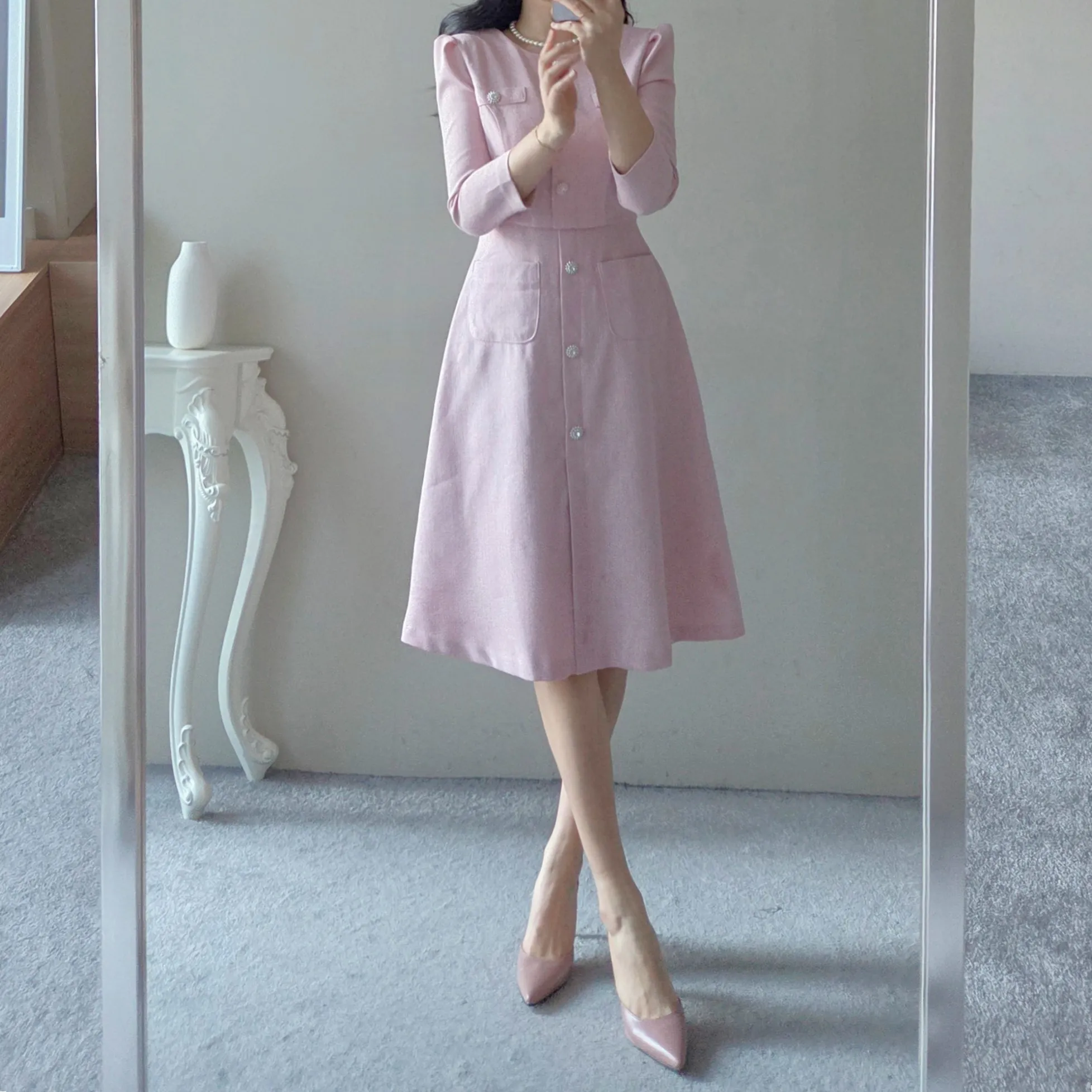 ツイード7分袖レイヤード風ピンタックギャザーパフスリーブミディAラインハイウエストラウンドネックポケットフェイクボタン無地ワンピース・S1958467