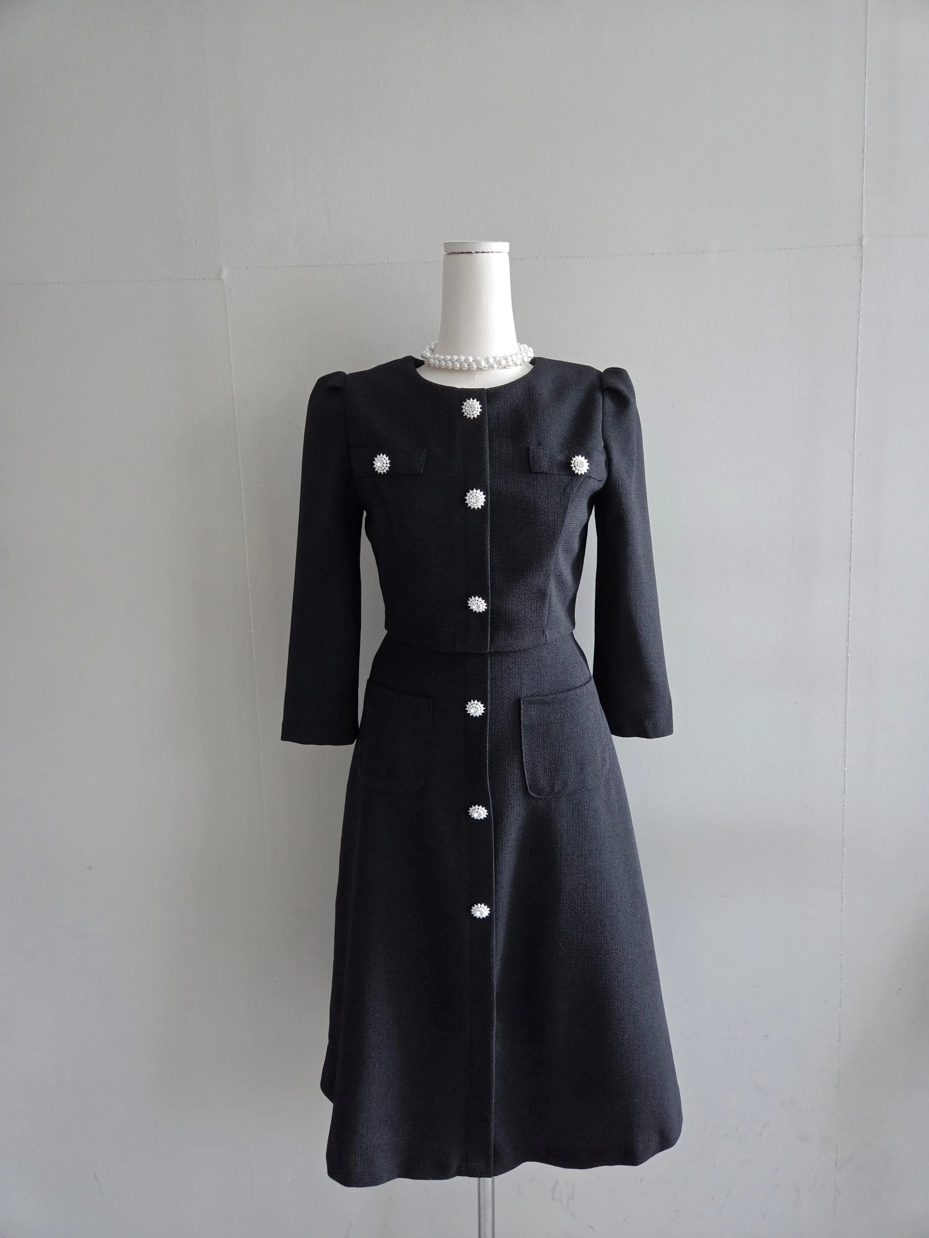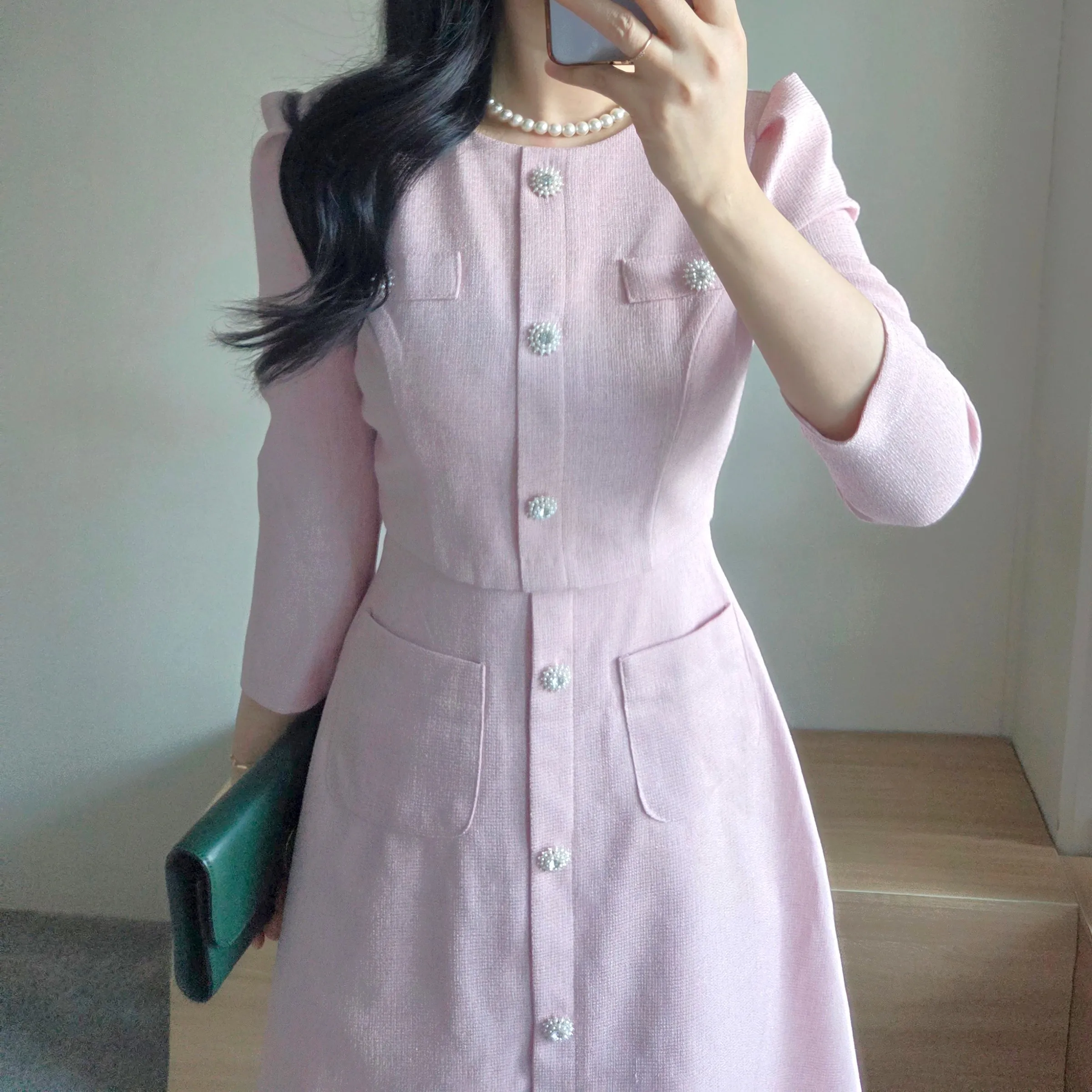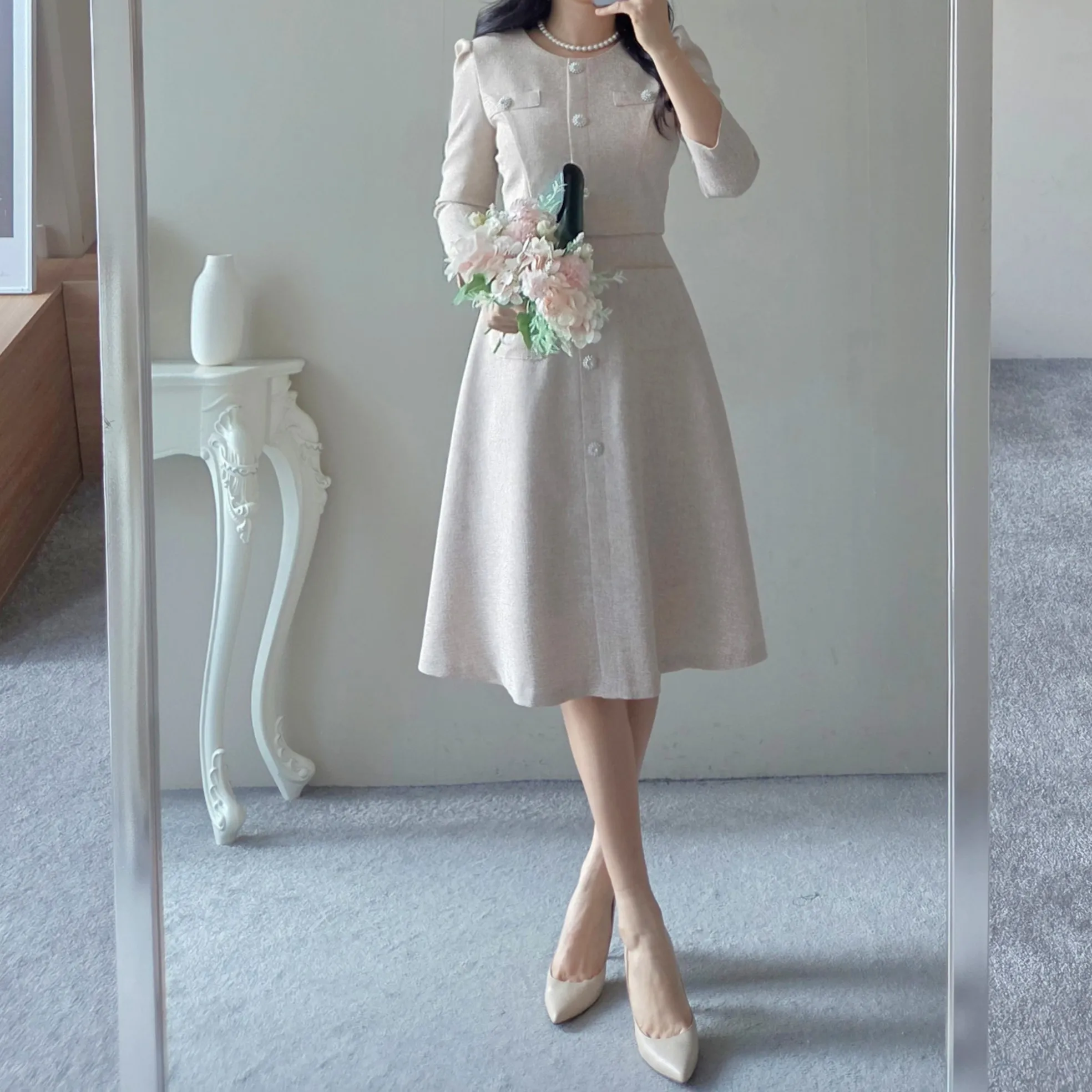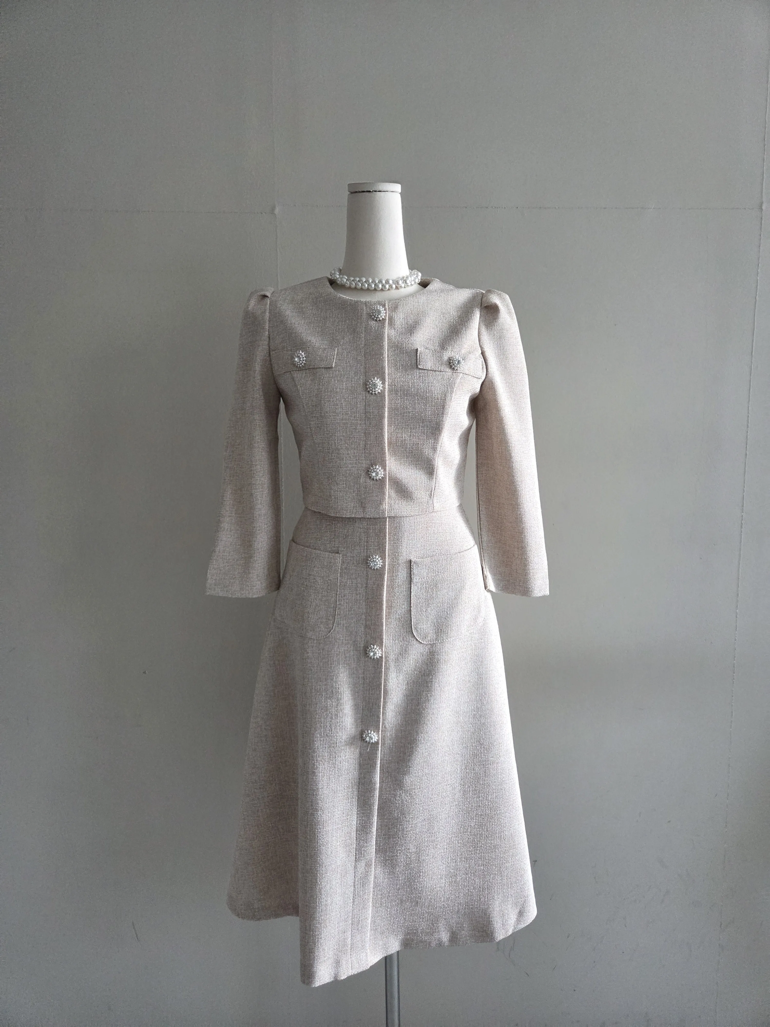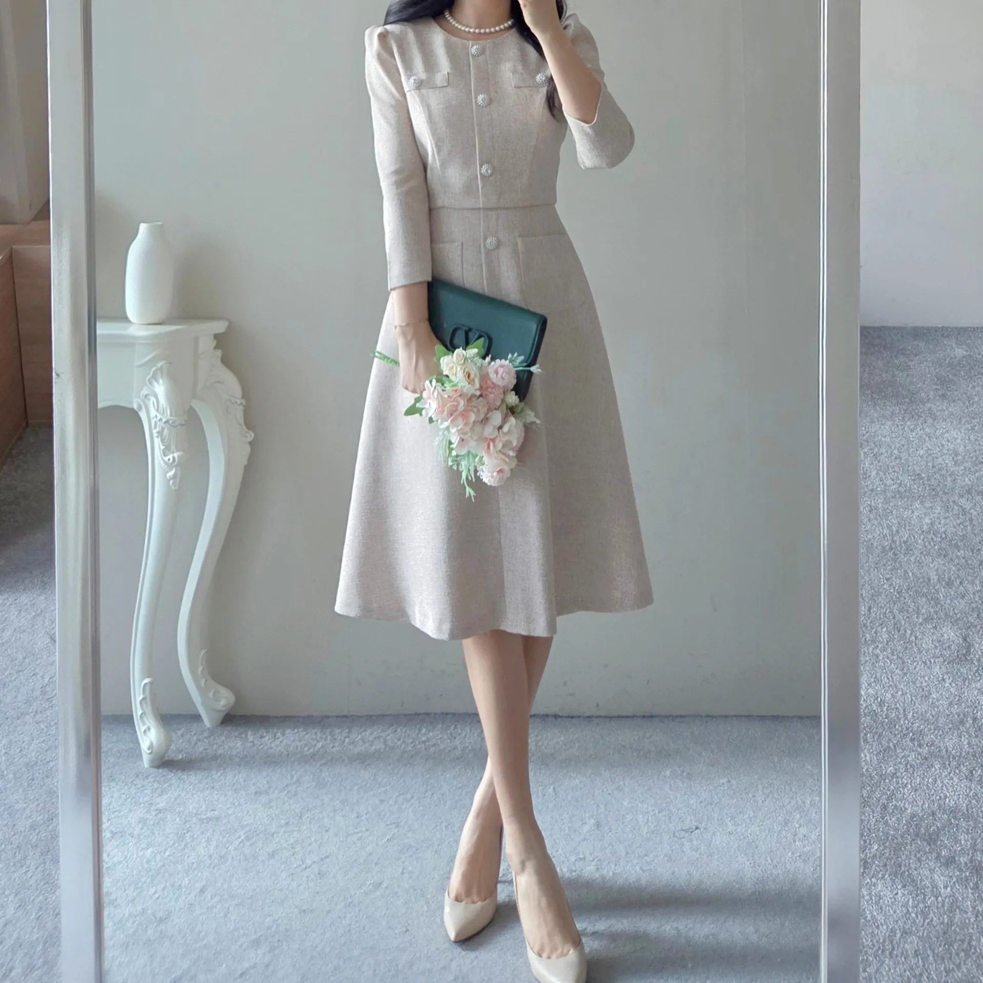 ツイード7分袖レイヤード風ピンタックギャザーパフスリーブミディAラインハイウエストラウンドネックポケットフェイクボタン無地ワンピース・S1958467