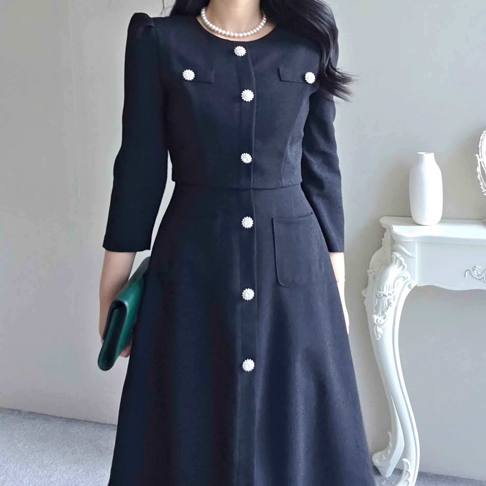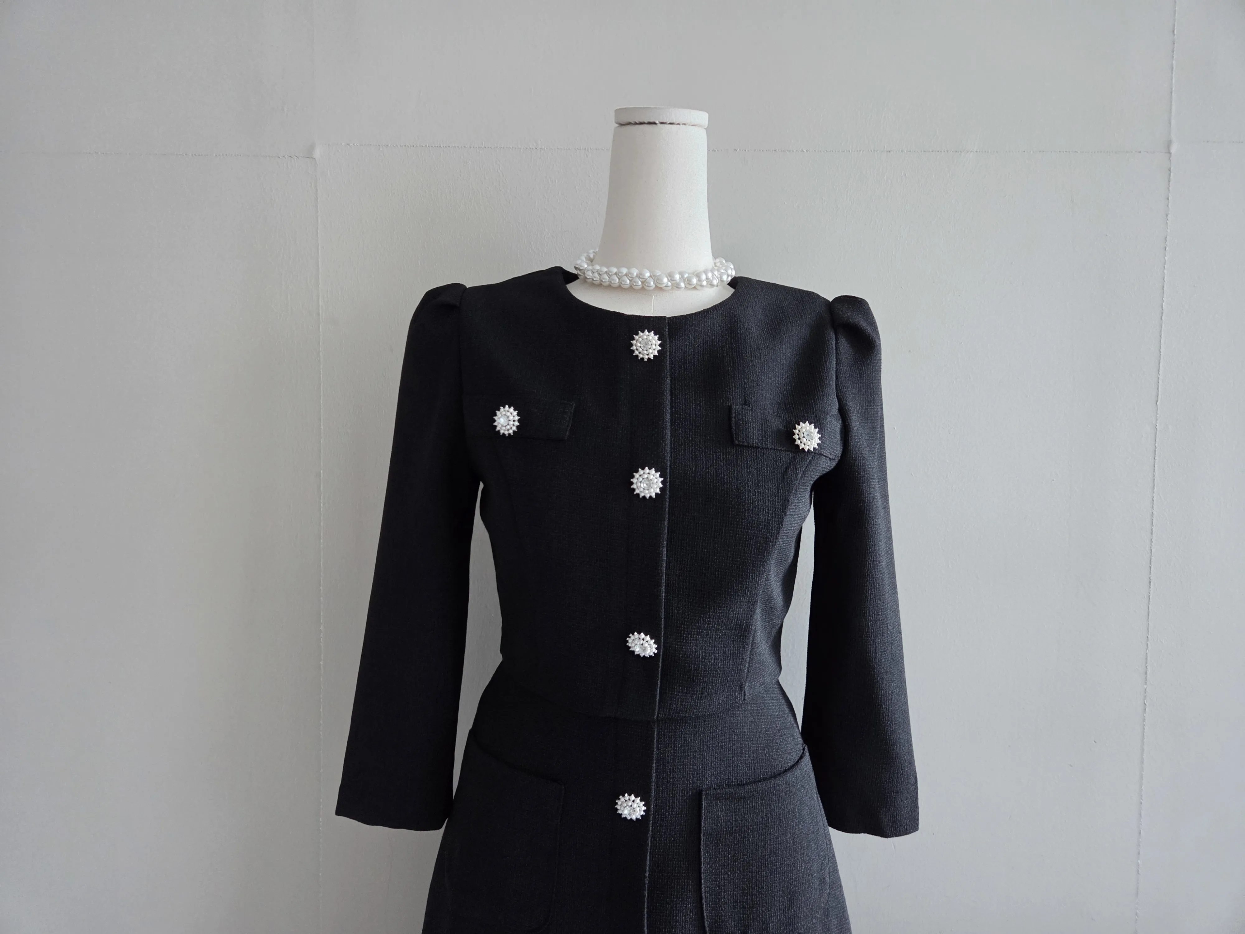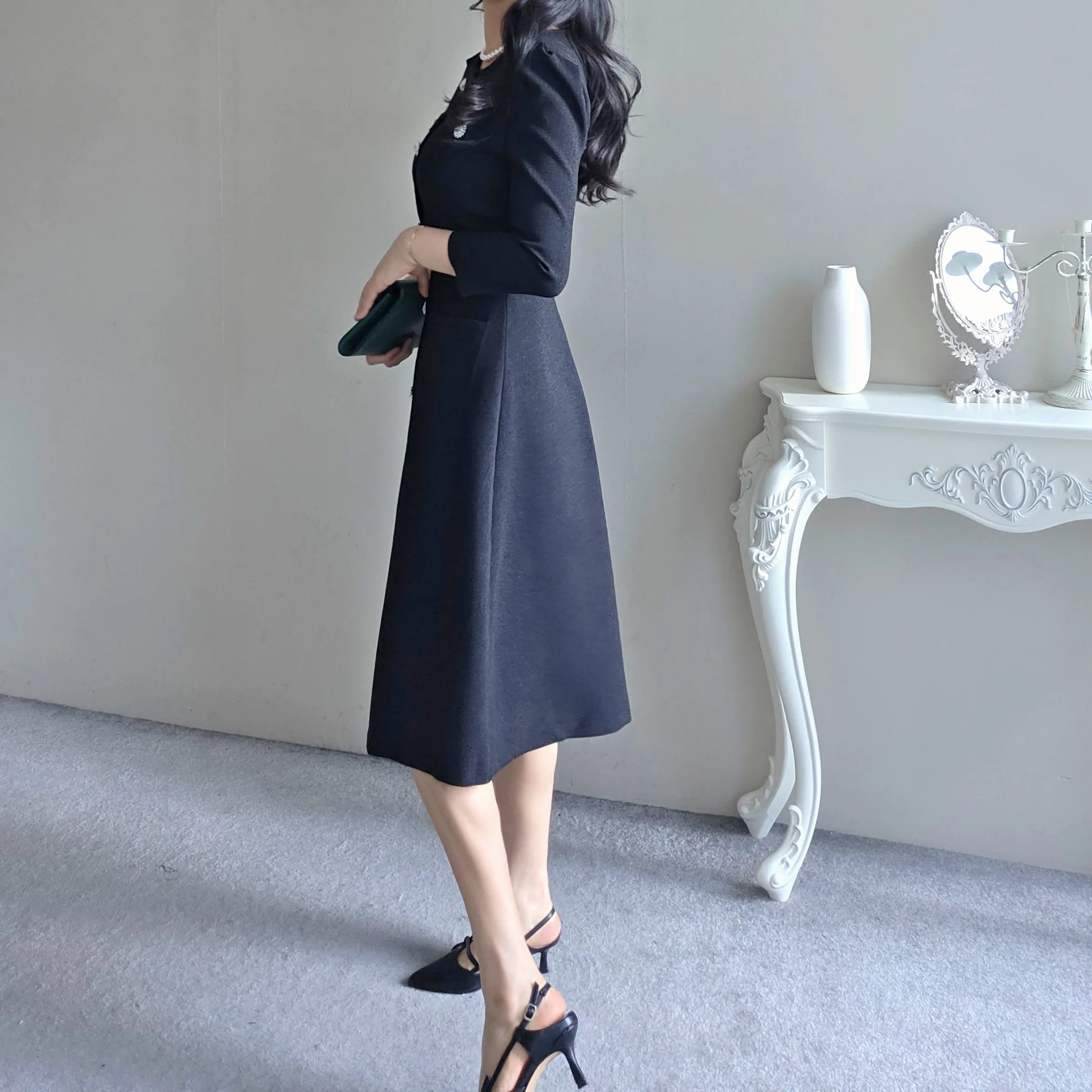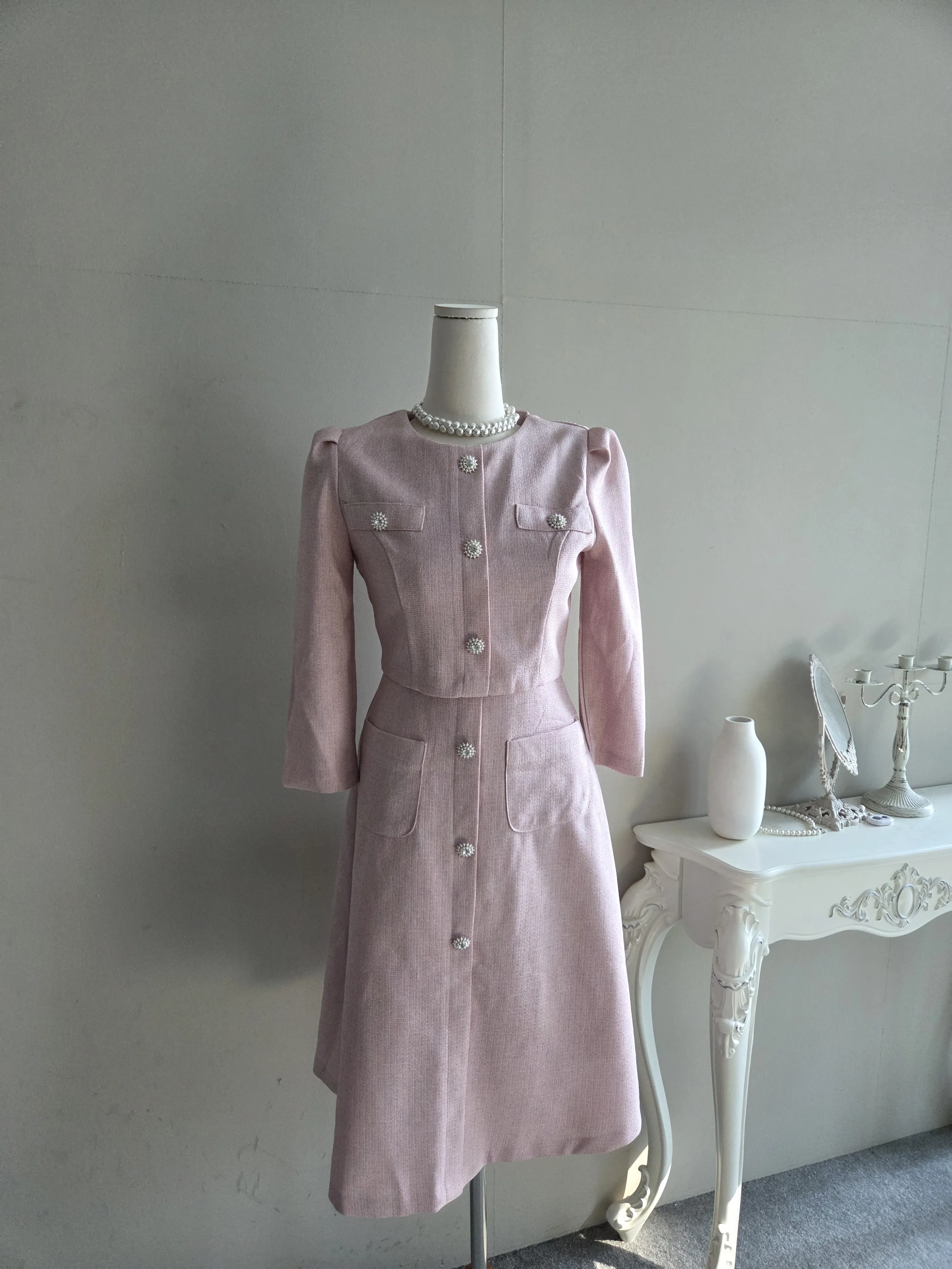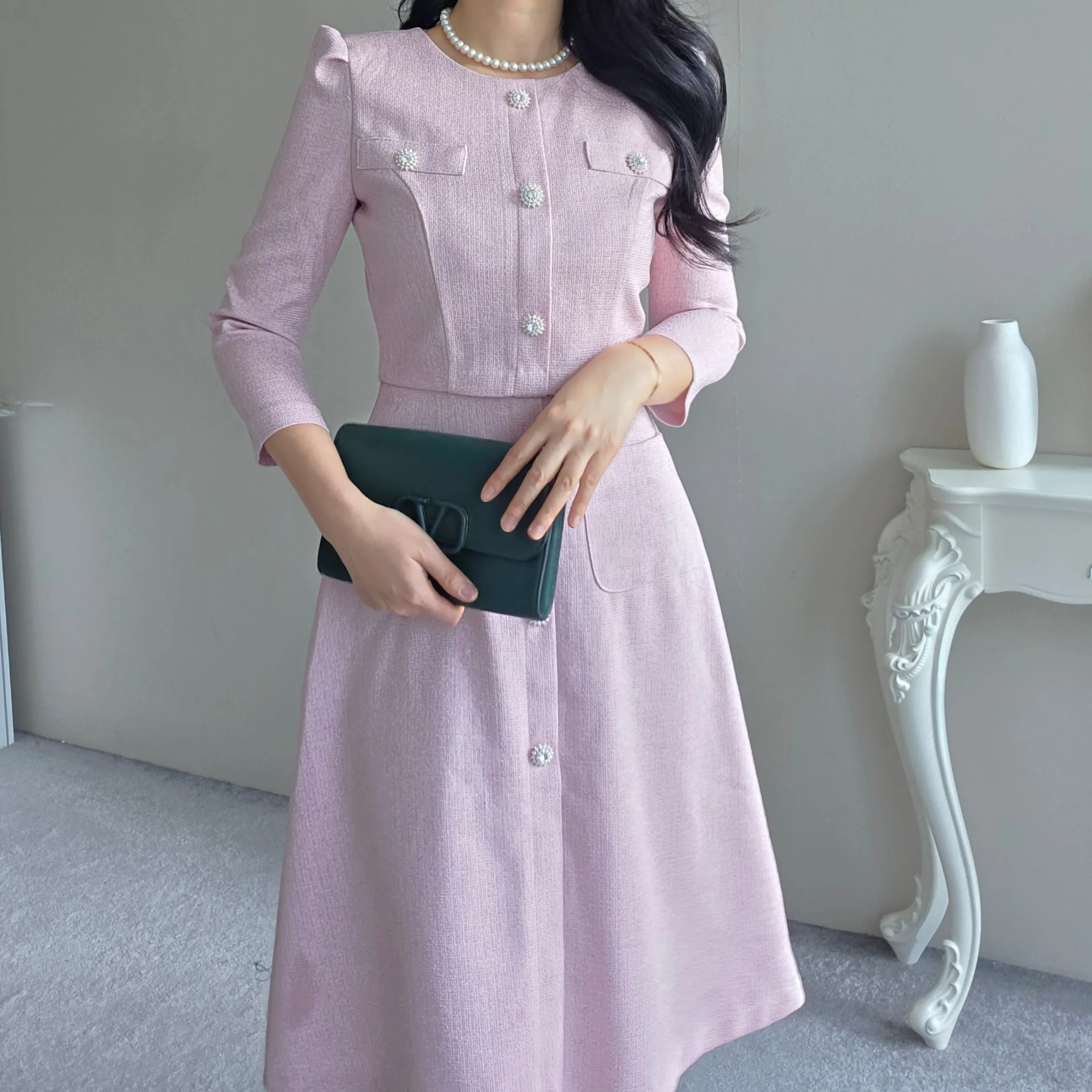 ツイード7分袖レイヤード風ピンタックギャザーパフスリーブミディAラインハイウエストラウンドネックポケットフェイクボタン無地ワンピース・S1958467