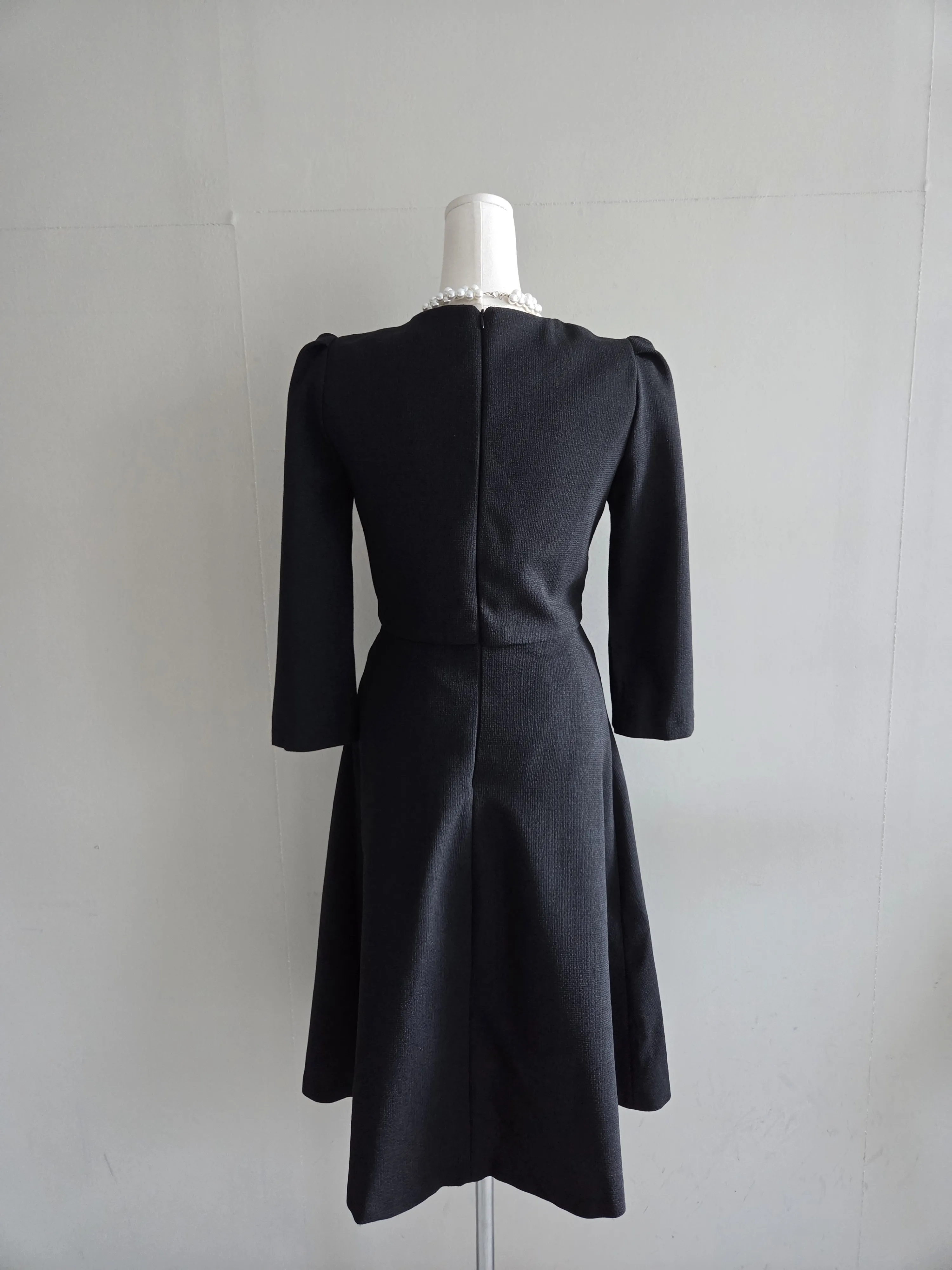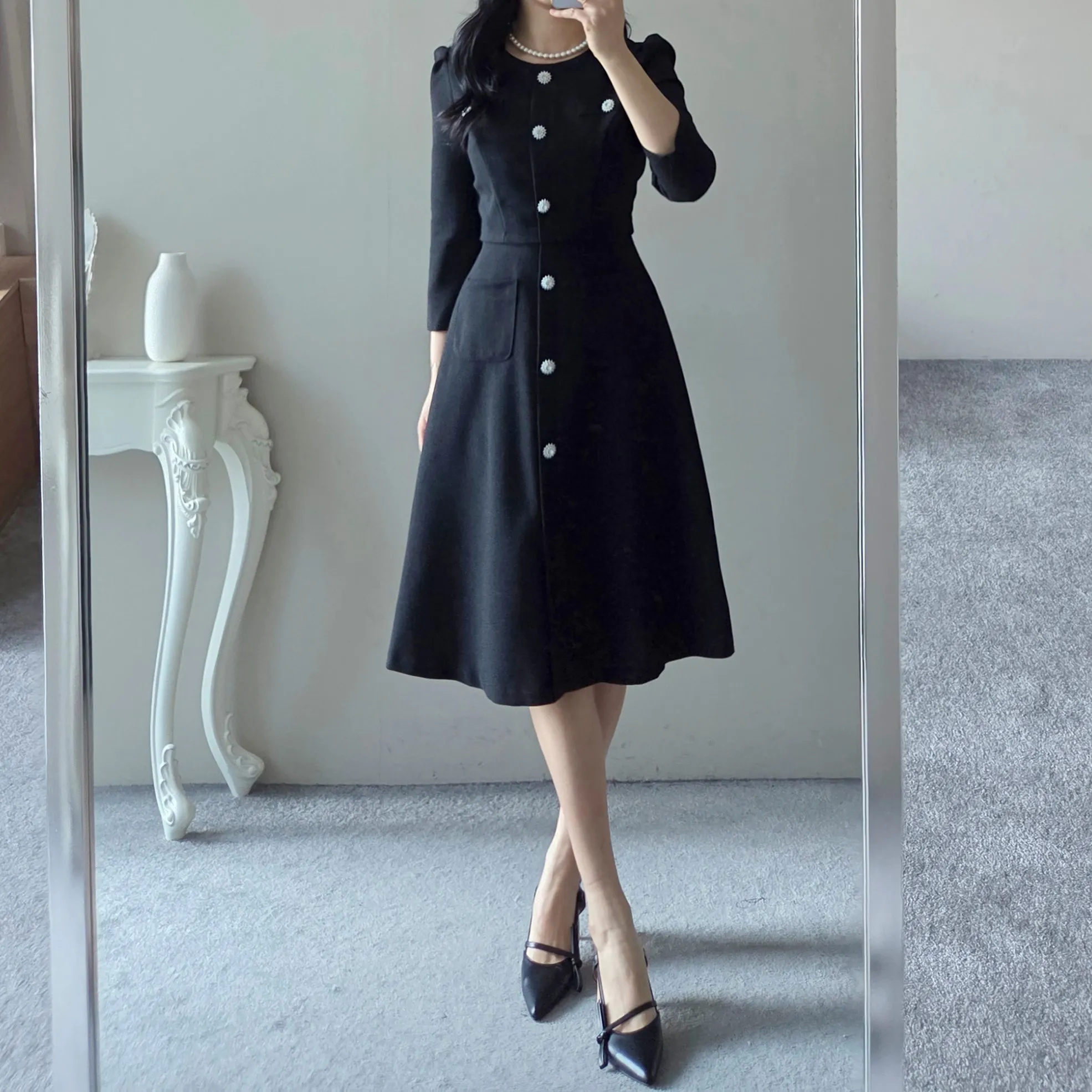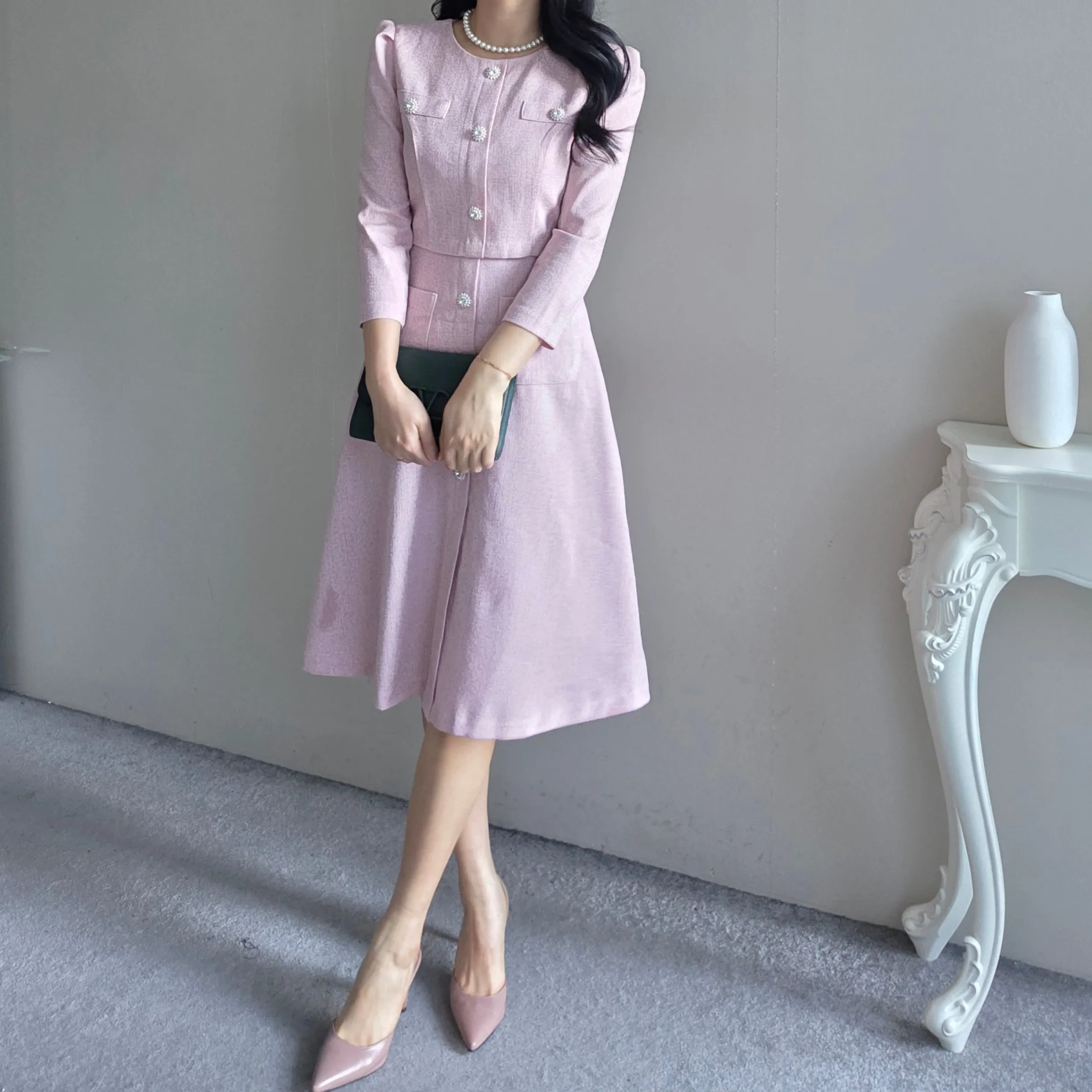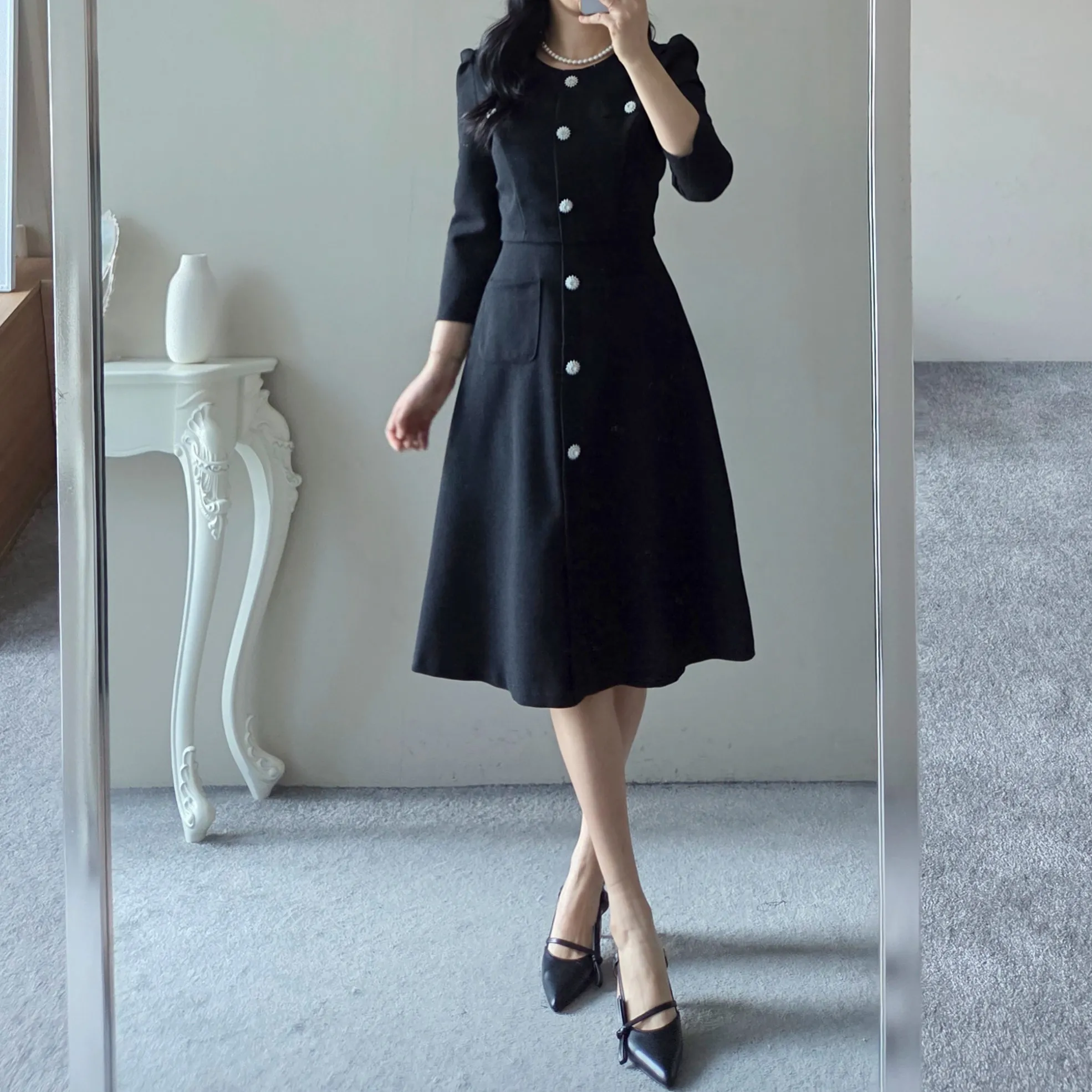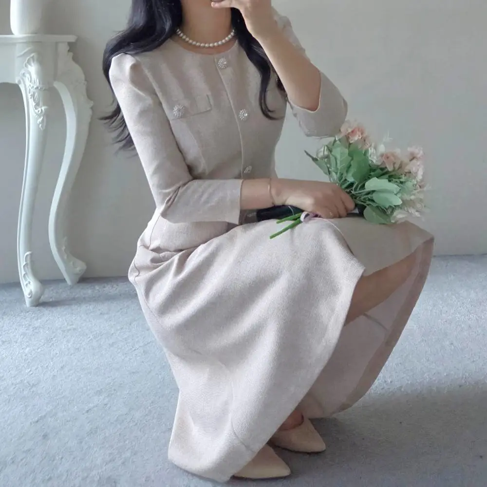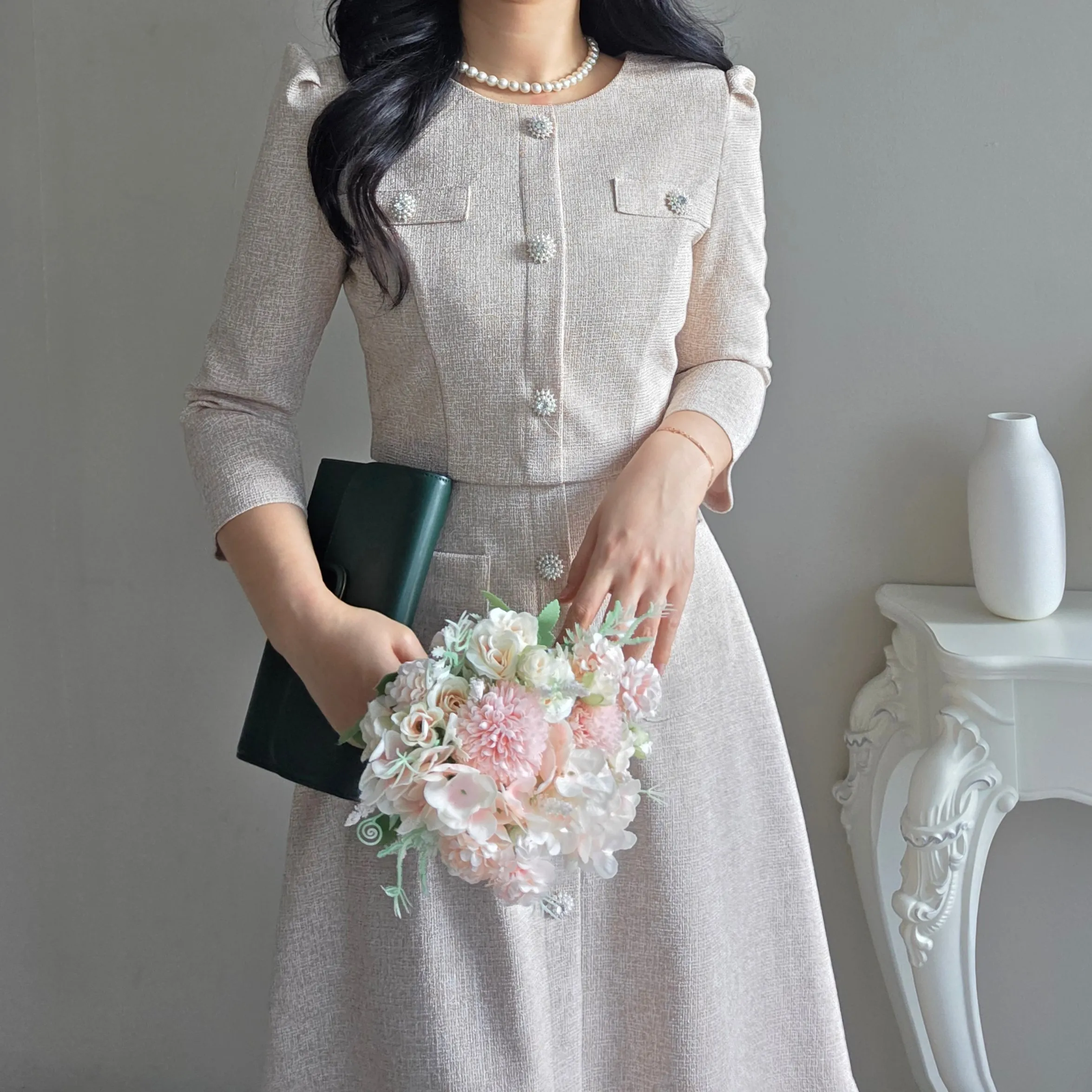 ツイード7分袖レイヤード風ピンタックギャザーパフスリーブミディAラインハイウエストラウンドネックポケットフェイクボタン無地ワンピース・S1958467