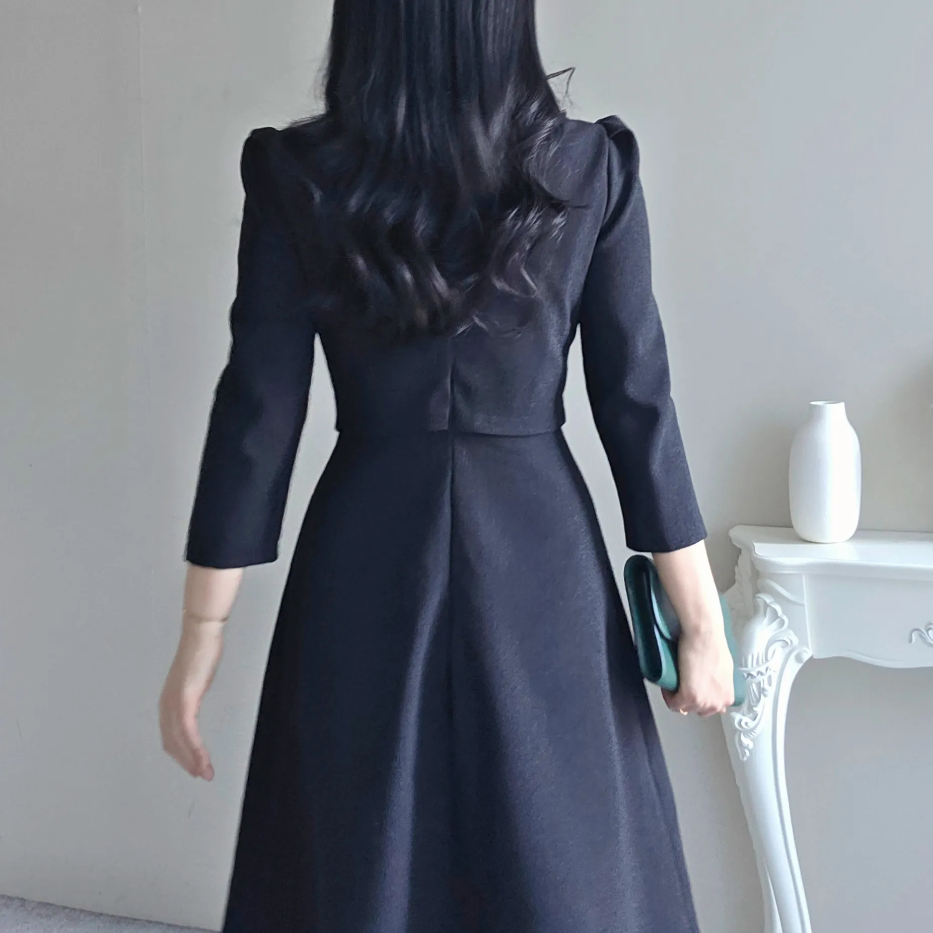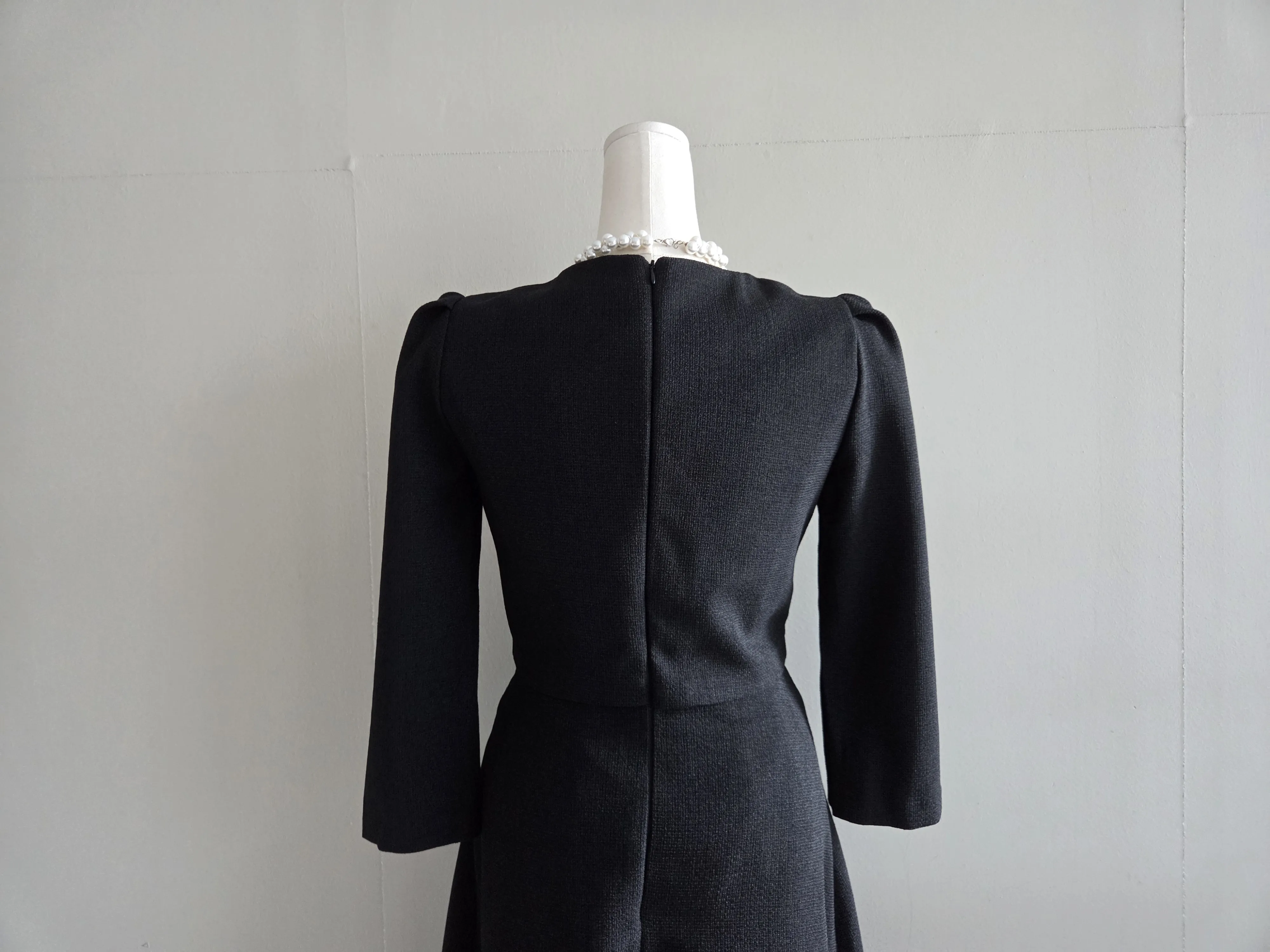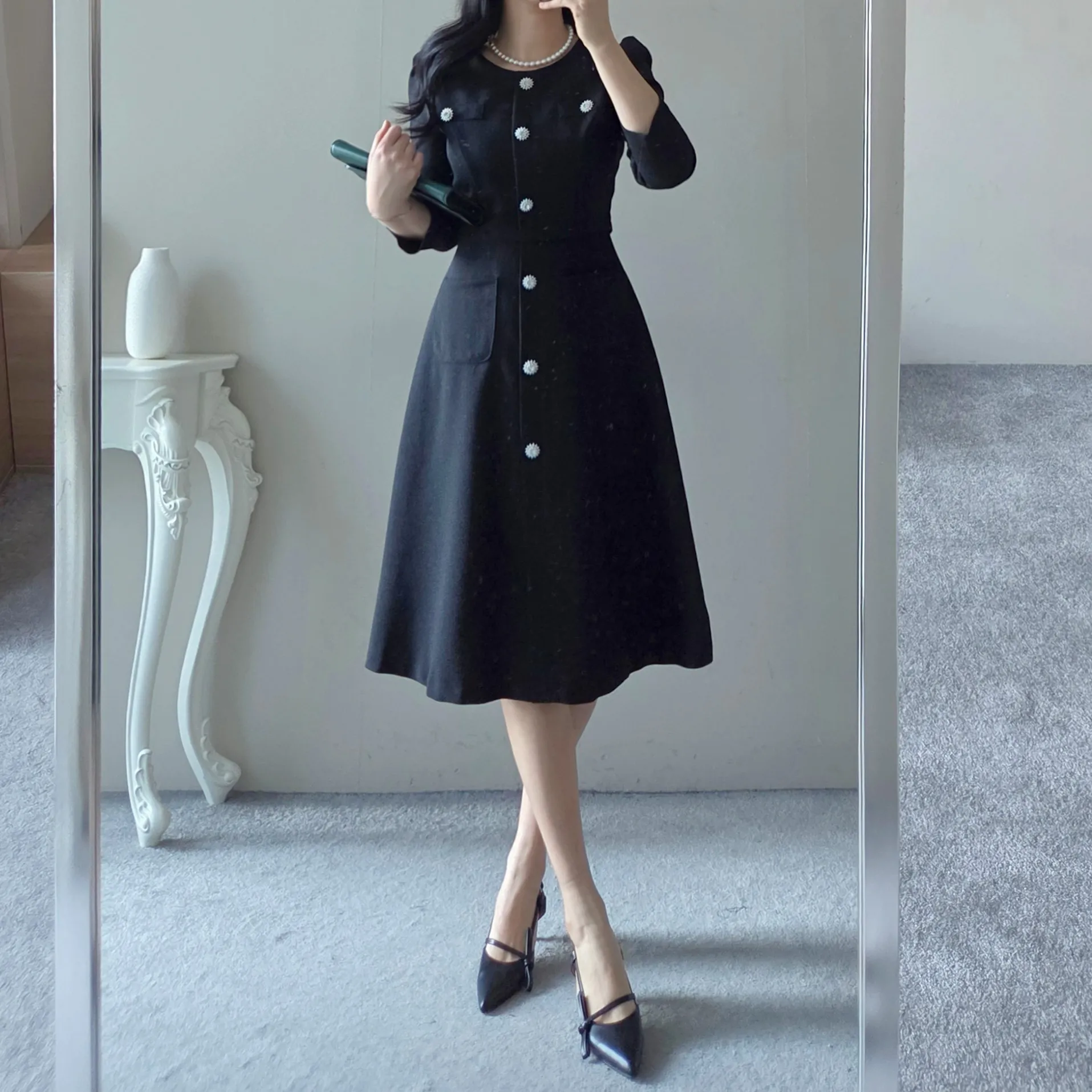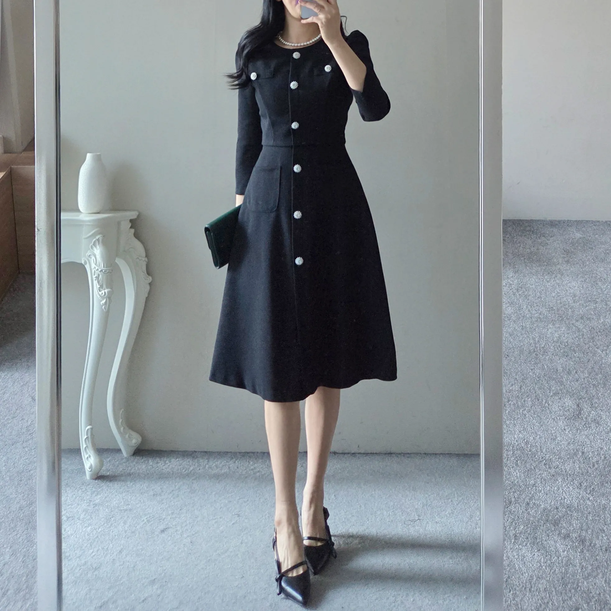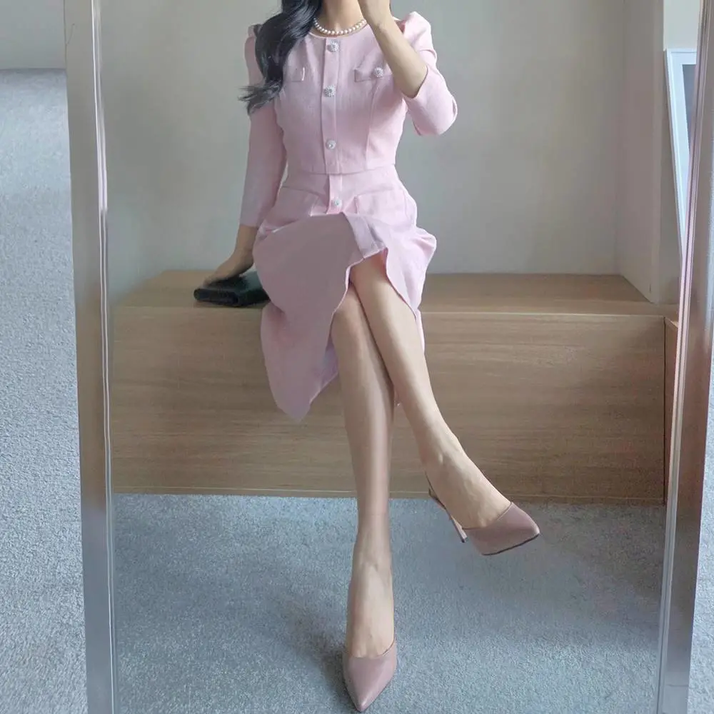 ツイード7分袖レイヤード風ピンタックギャザーパフスリーブミディAラインハイウエストラウンドネックポケットフェイクボタン無地ワンピース・S1958467