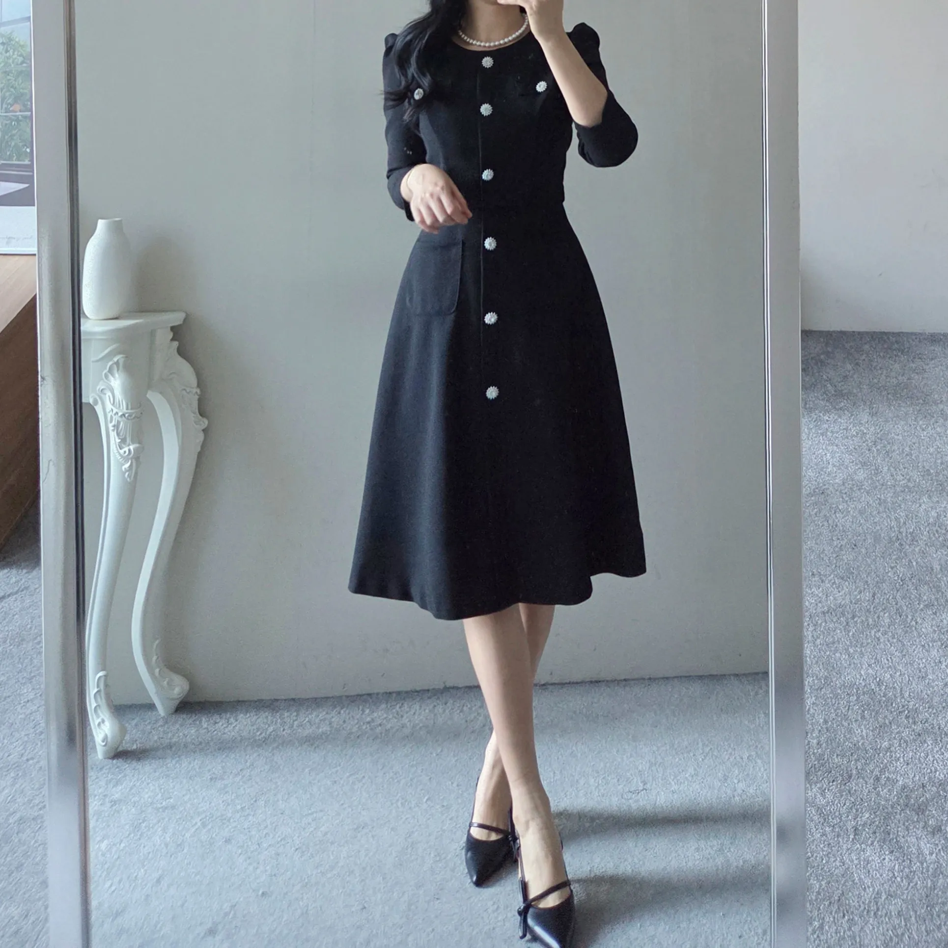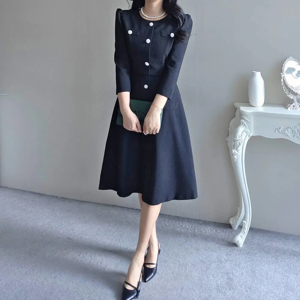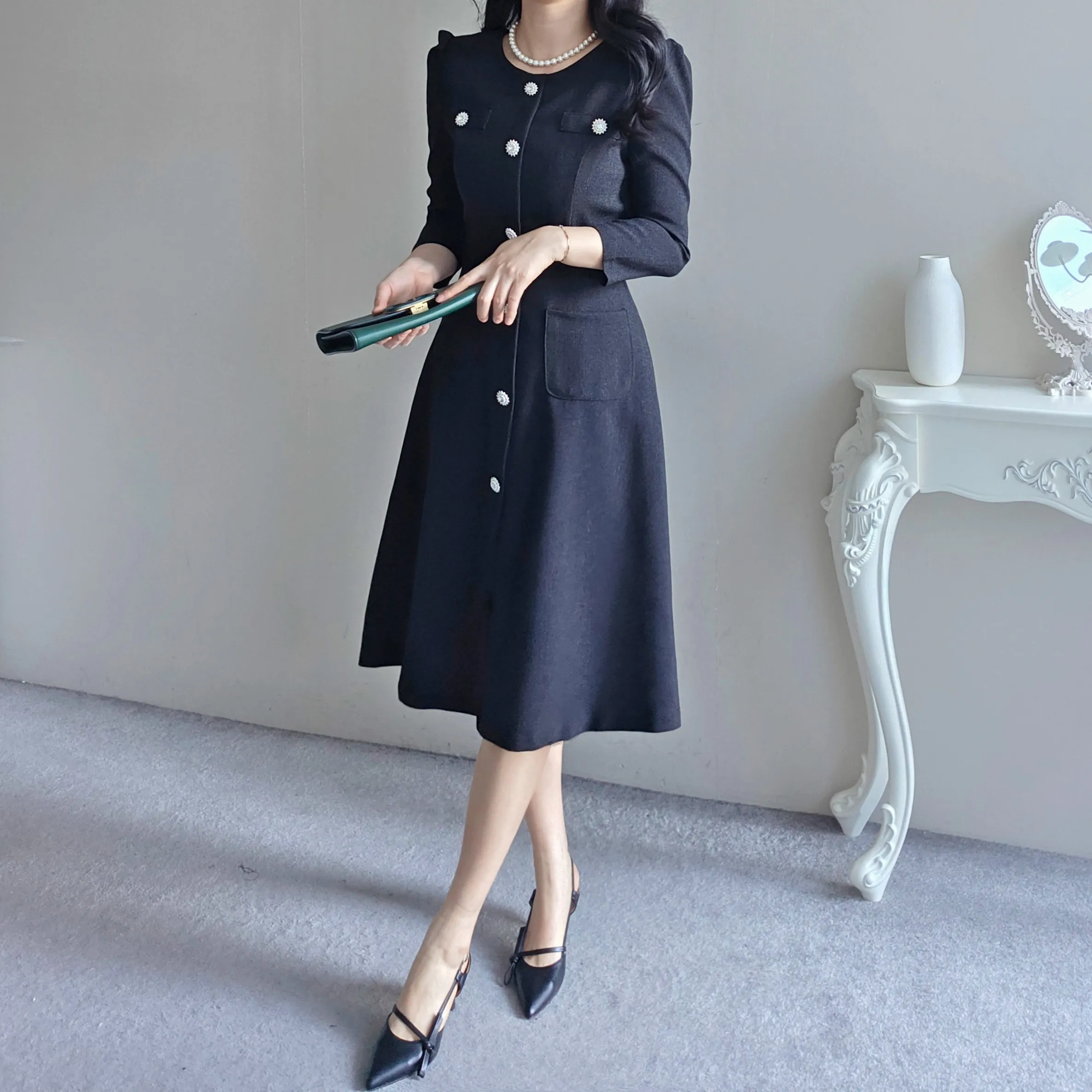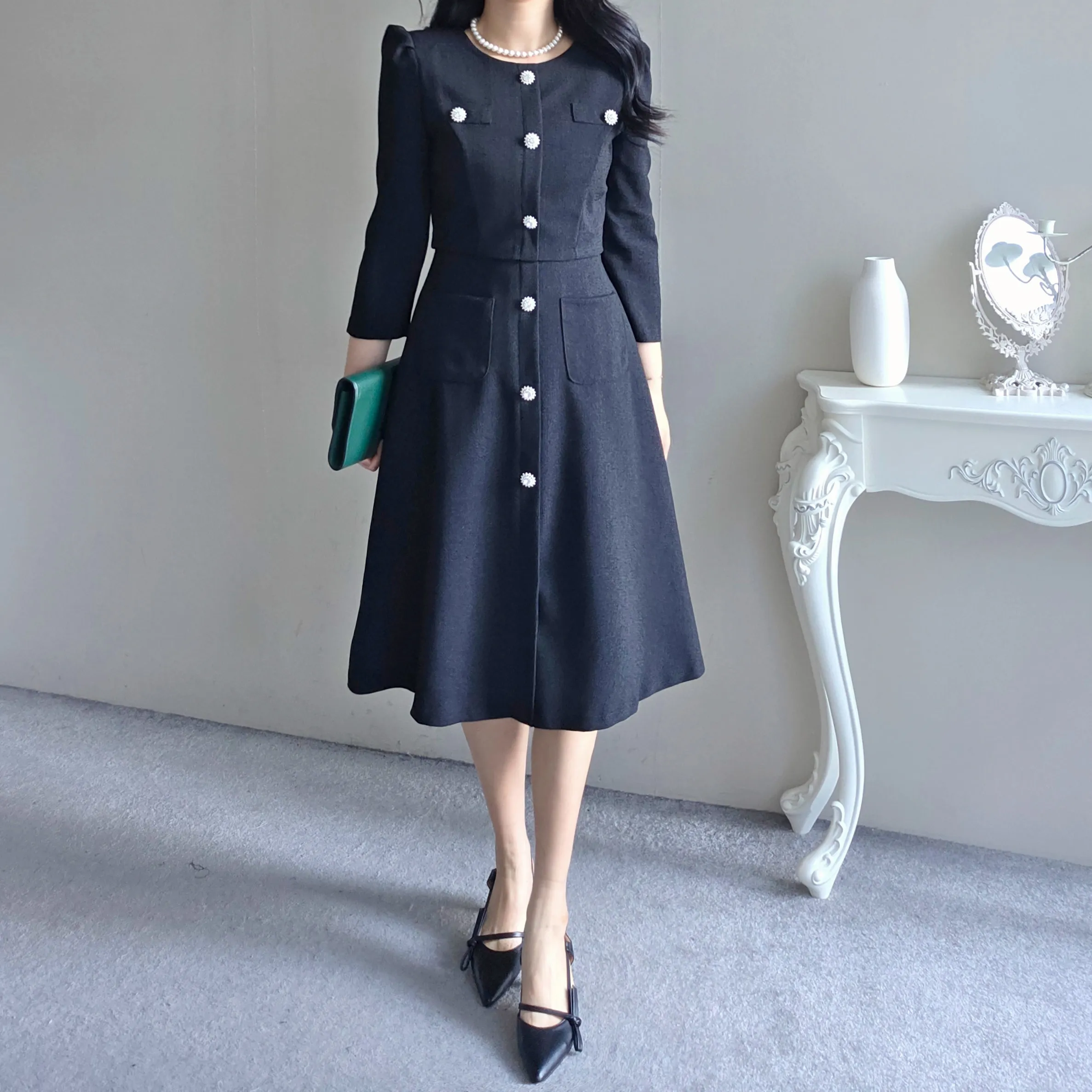 ラウンドネックシャーリングフレアミディボタンワンピース