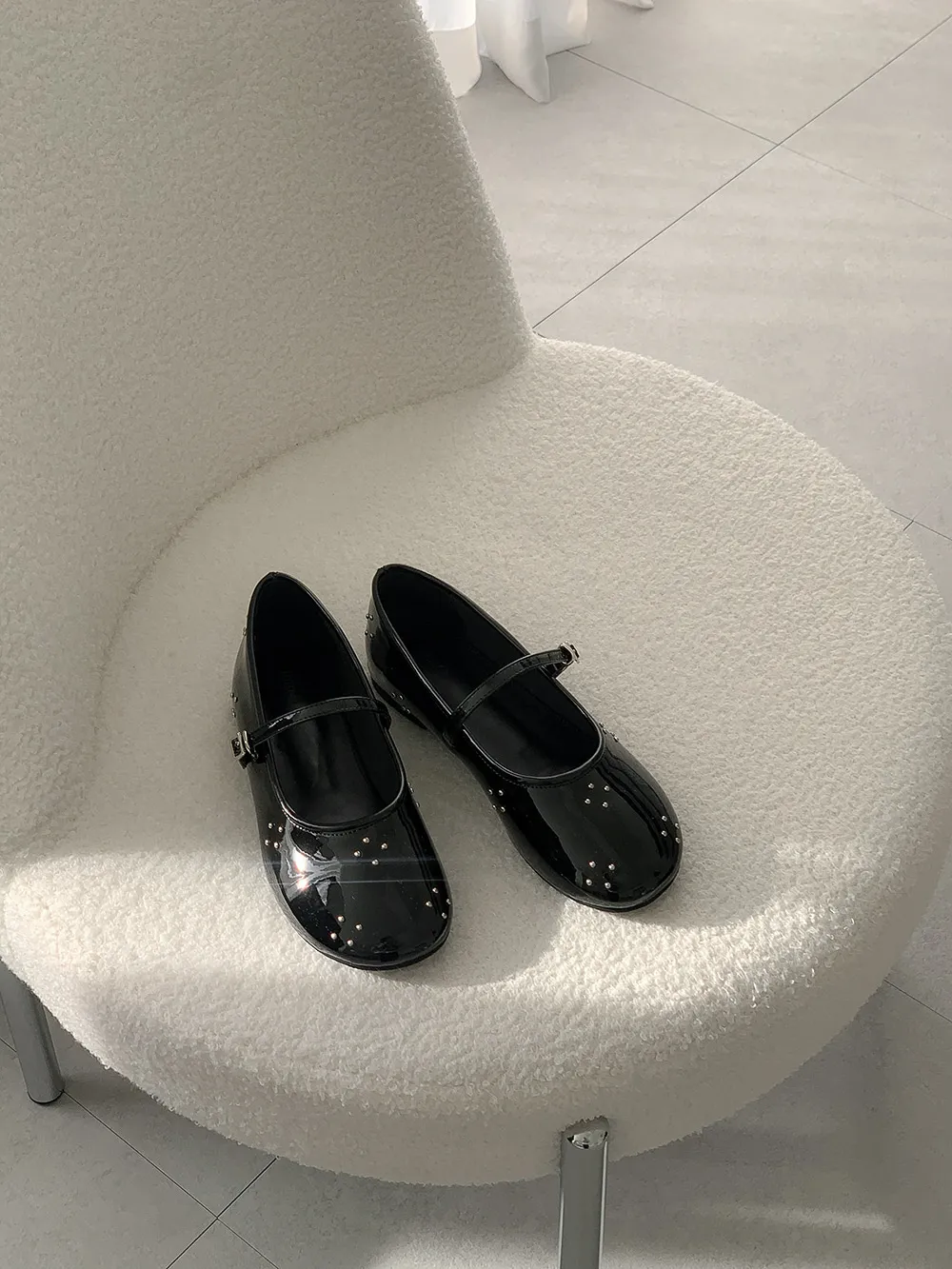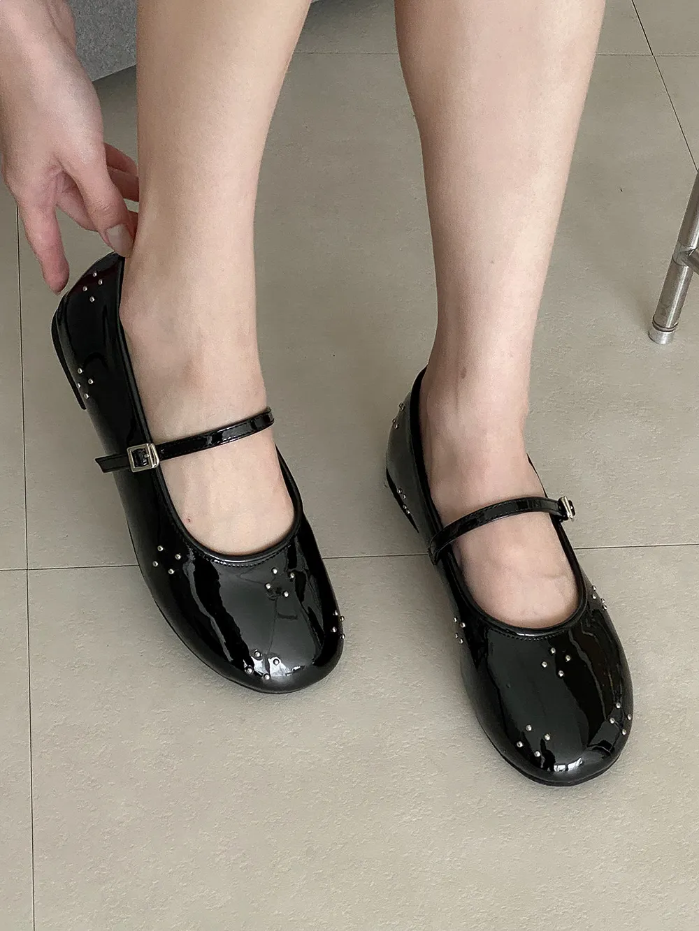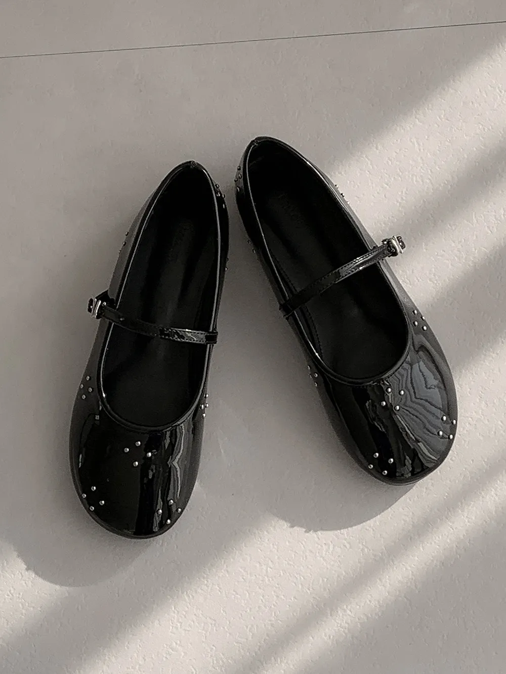 レザー調バックルスタッズウンドトゥフラットシューズ・S1958698