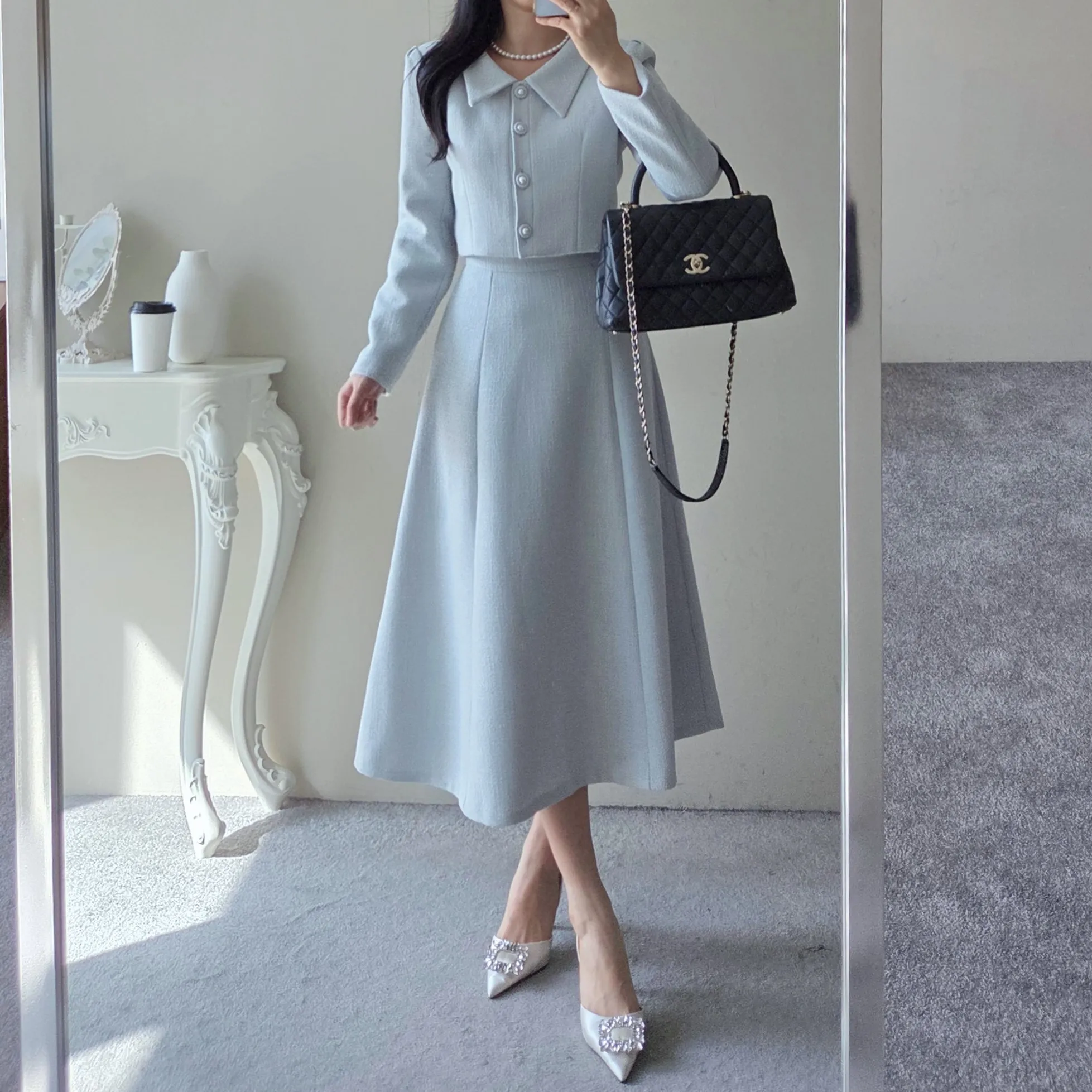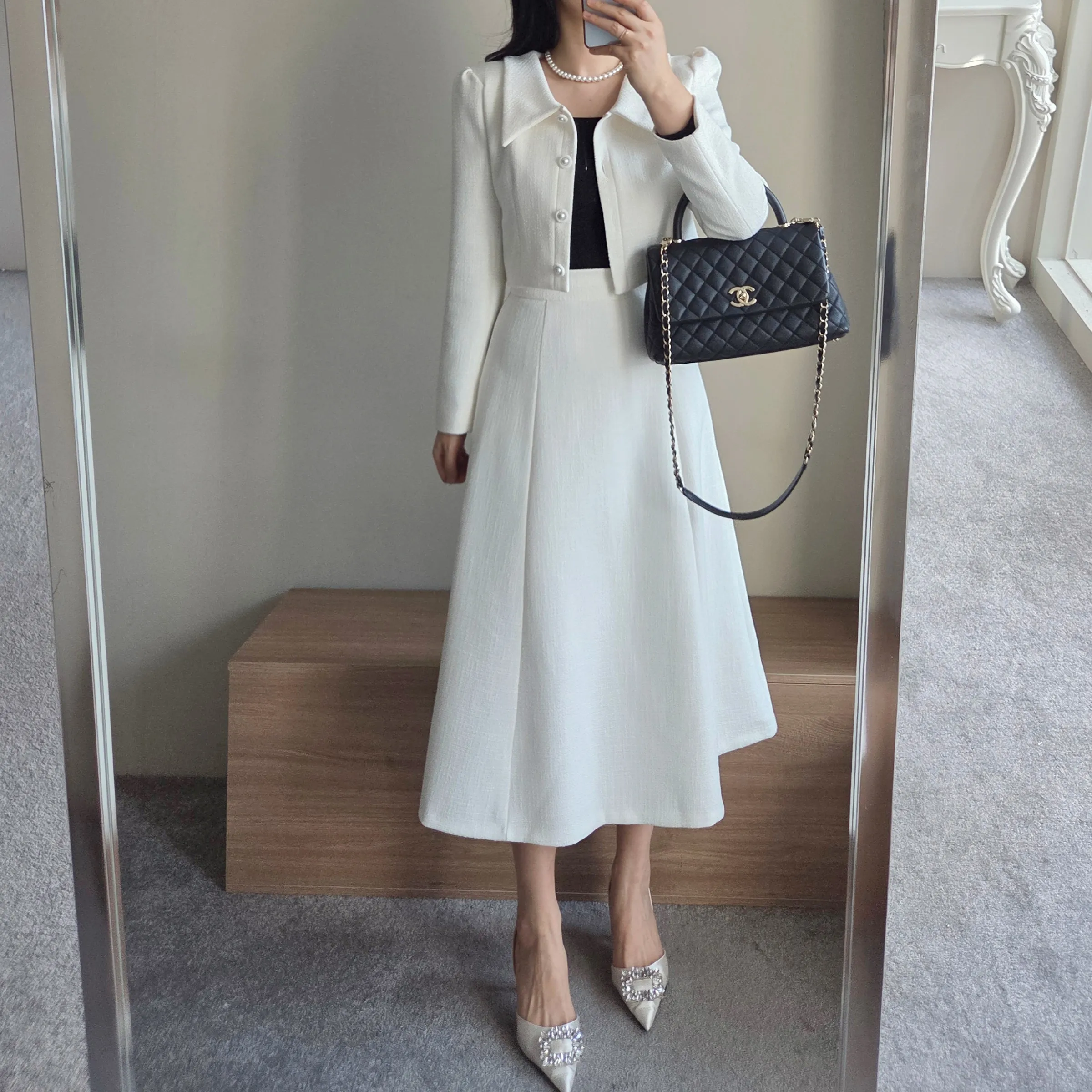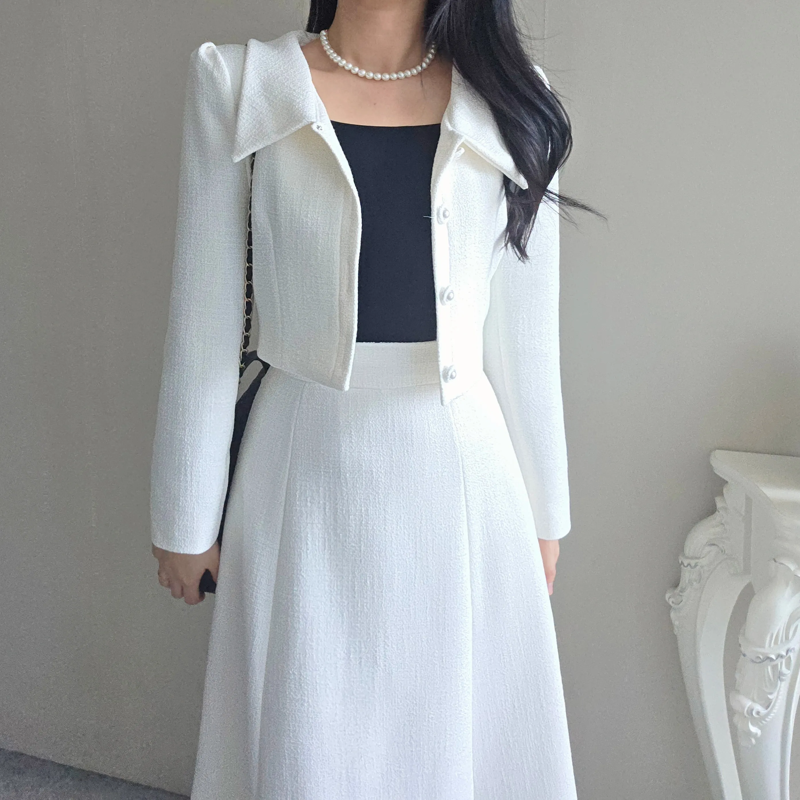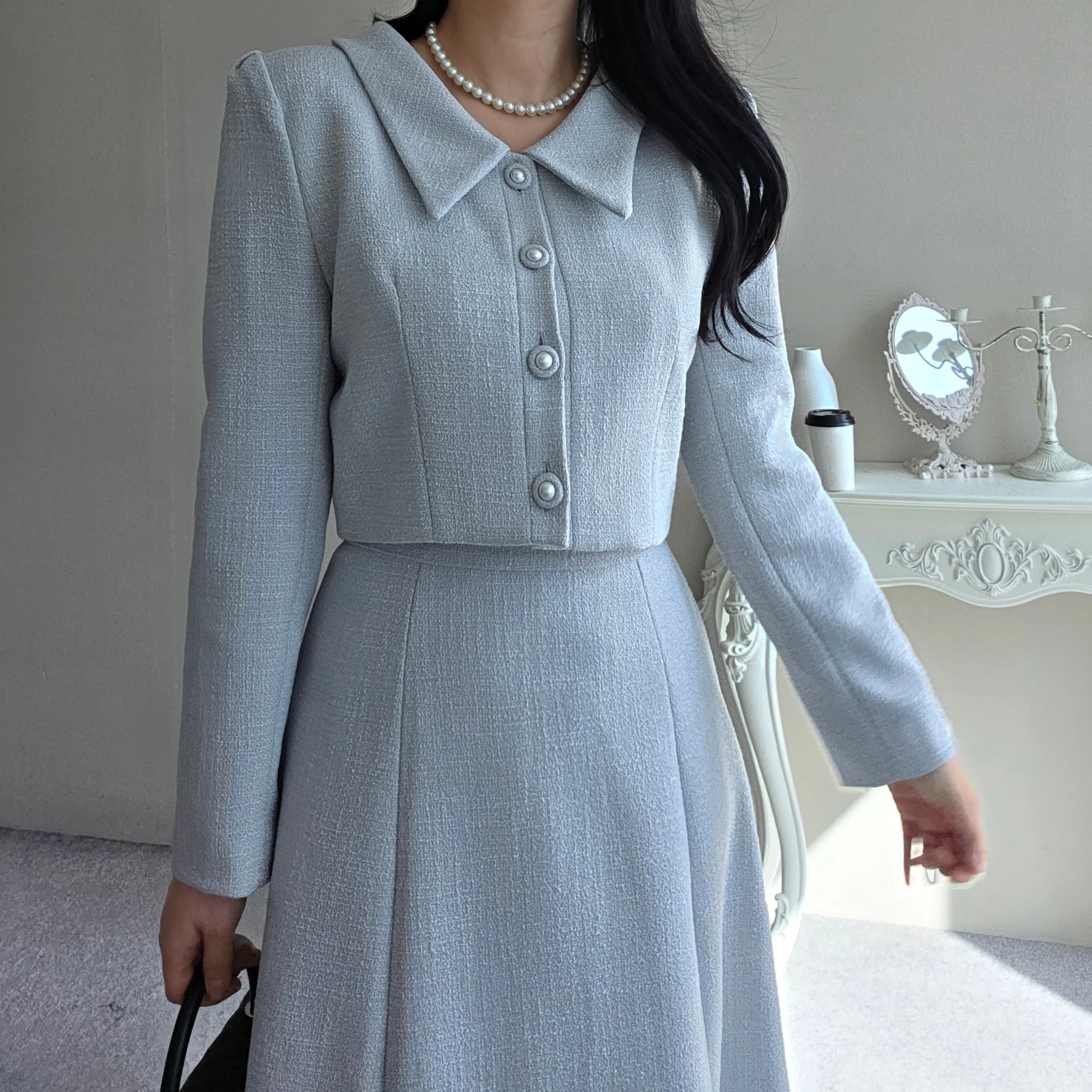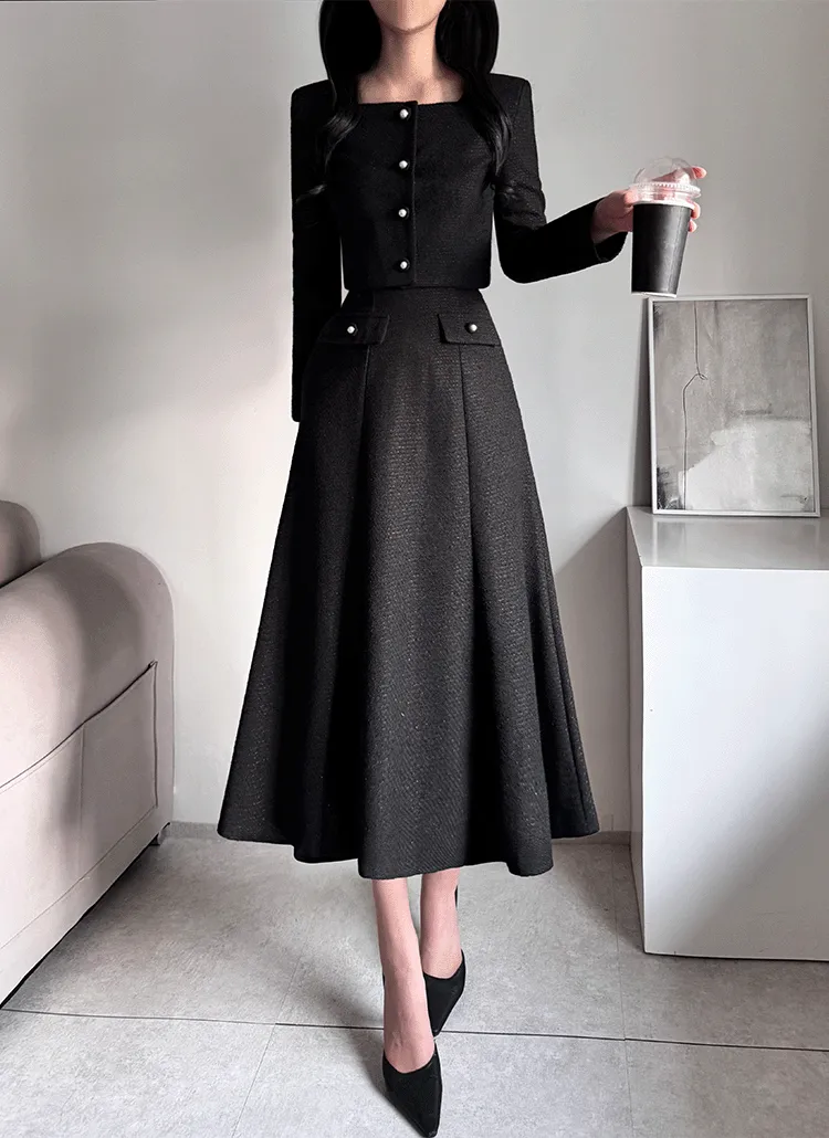 ツイードグリッタースクエアネックパール調ボタン肩パッドクロップドロング長袖タックフレアAラインフェイクポケットヒドゥンジッパーツーピース(トップス、ボトムス)スカートジャケット