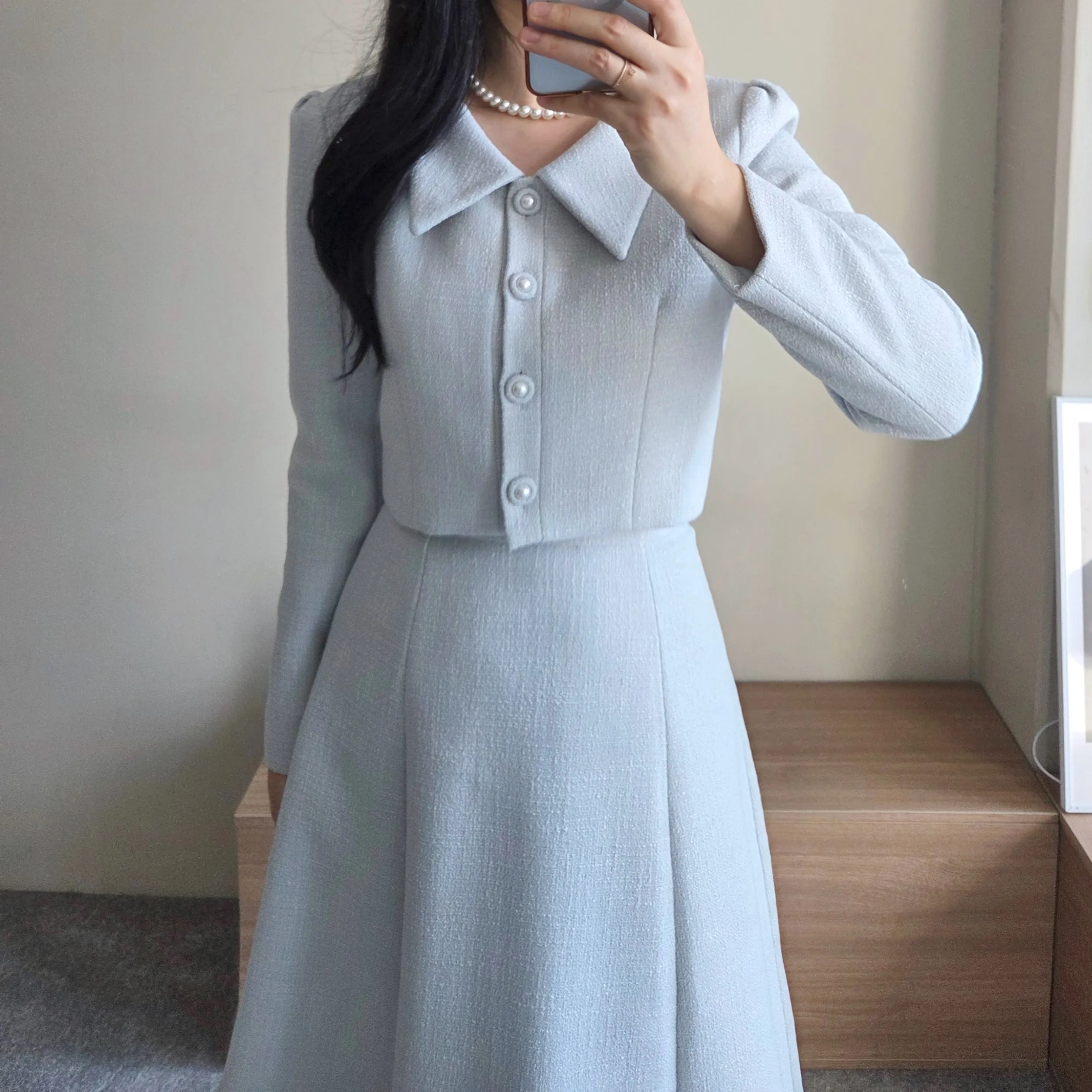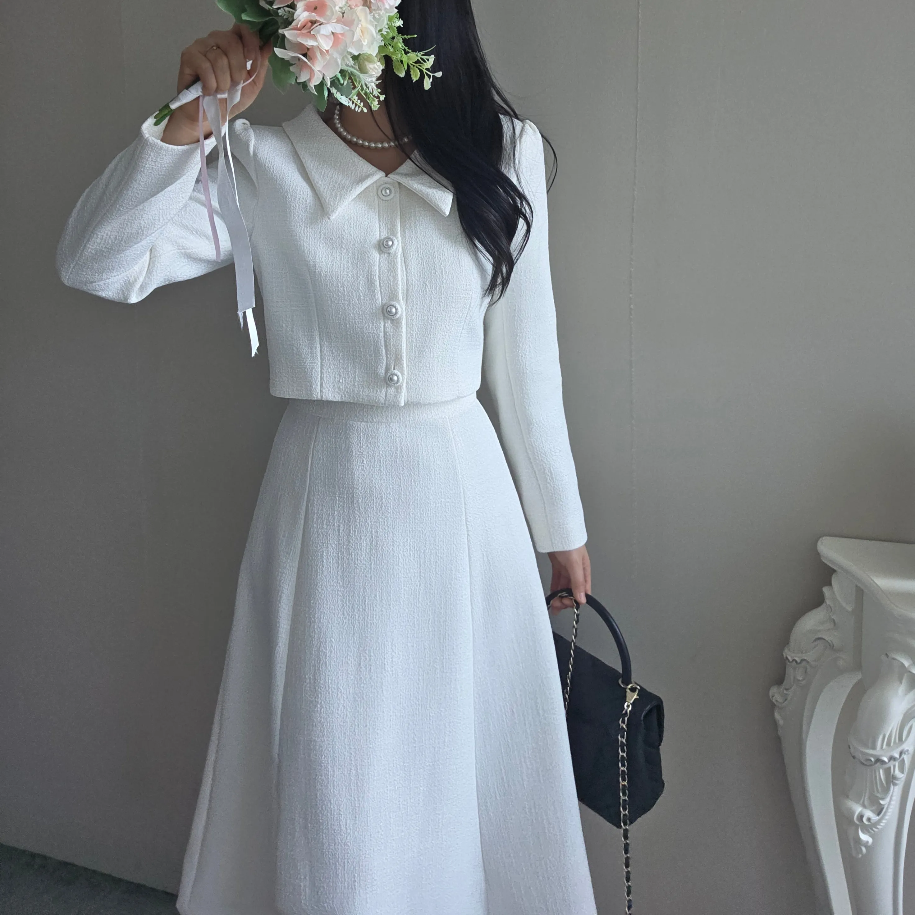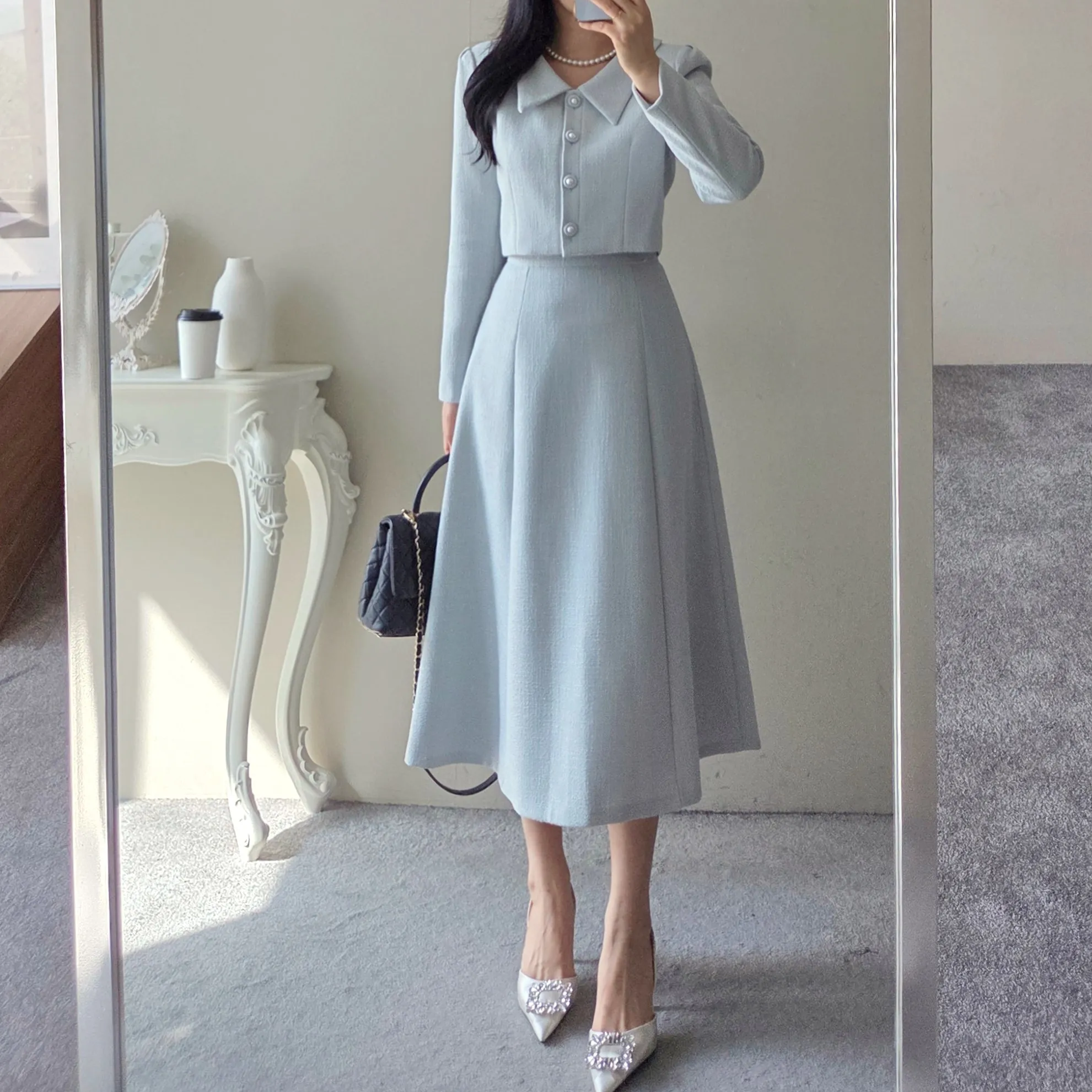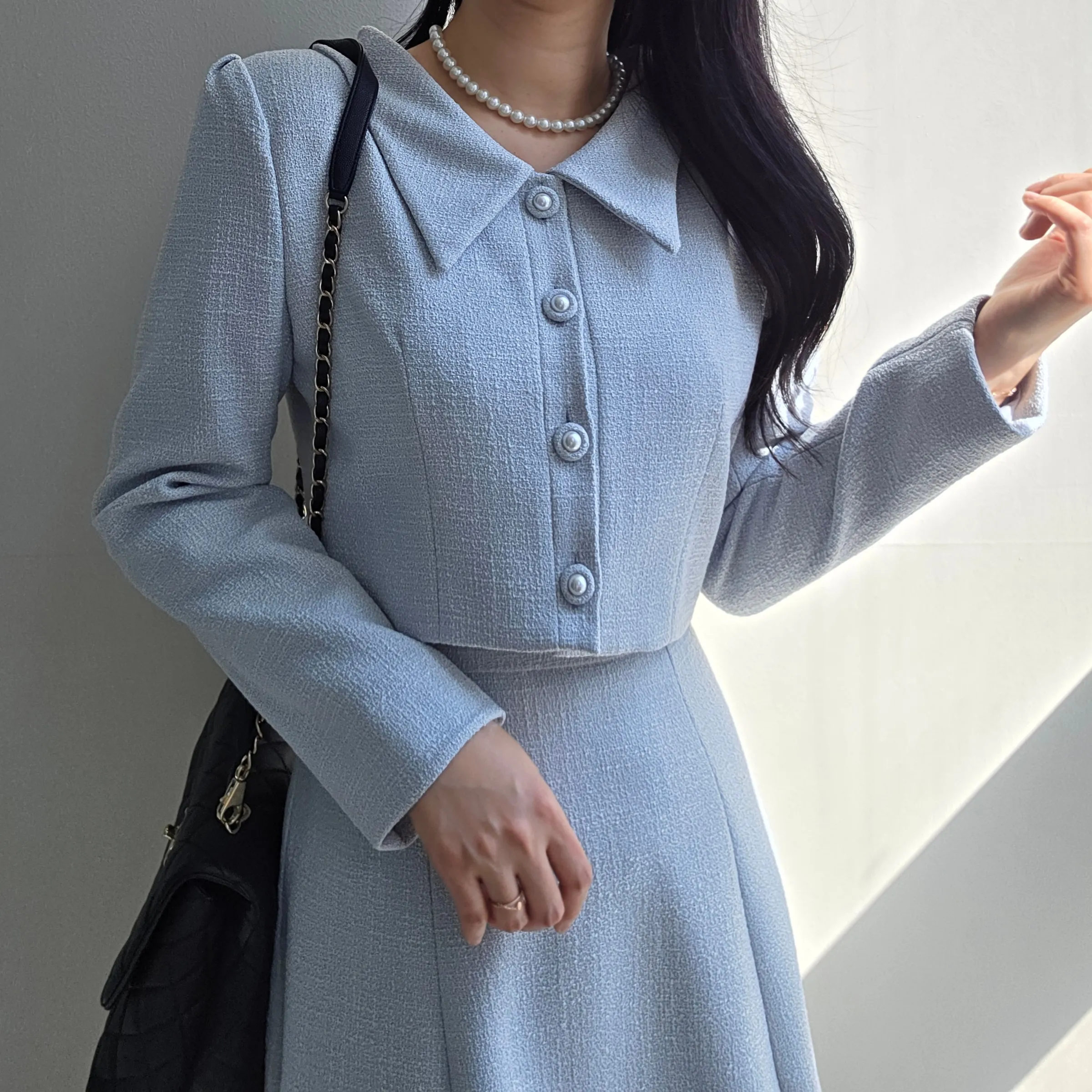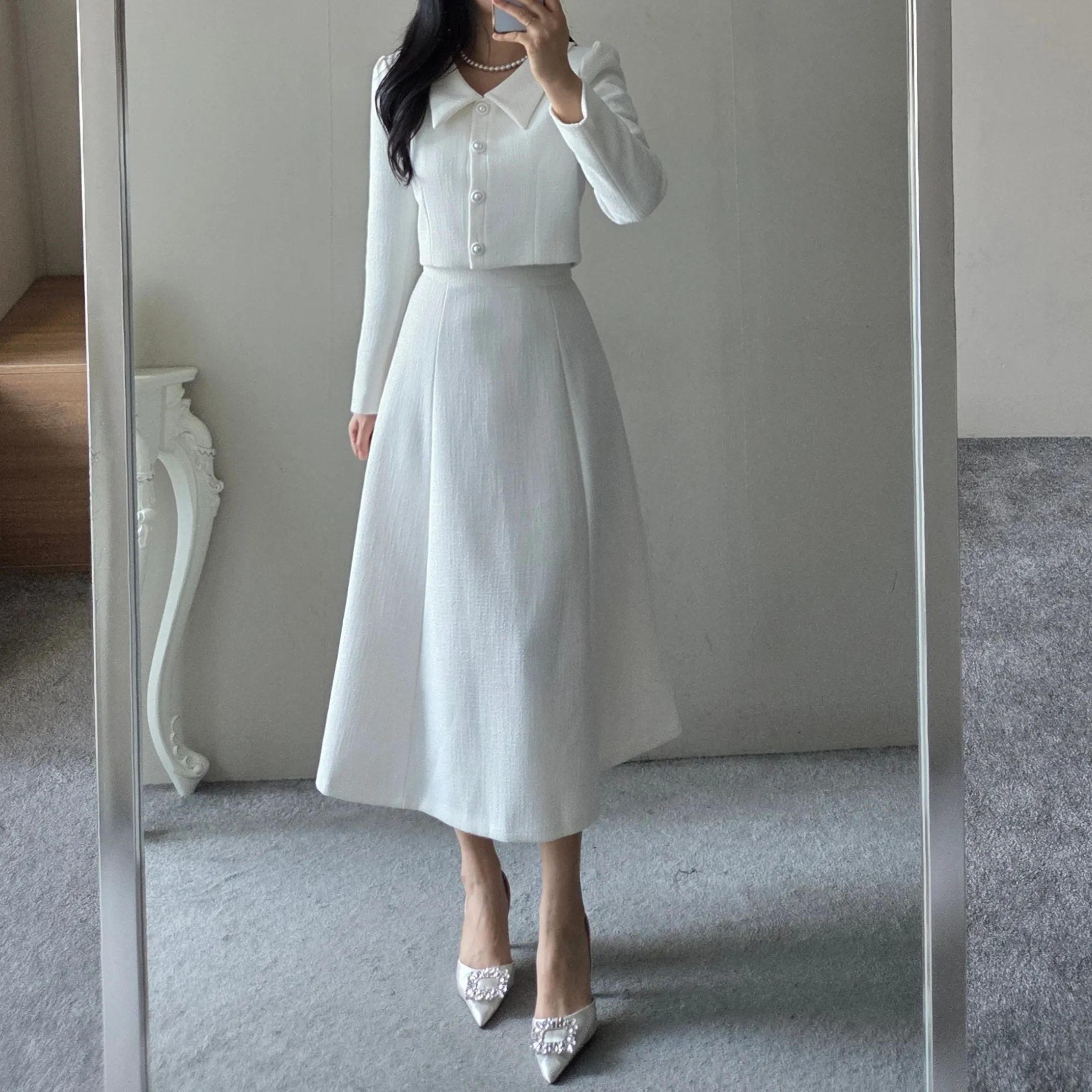 ツイードグリッタースクエアネックパール調ボタン肩パッドクロップドロング長袖タックフレアAラインフェイクポケットヒドゥンジッパーツーピース(トップス、ボトムス)スカートジャケット