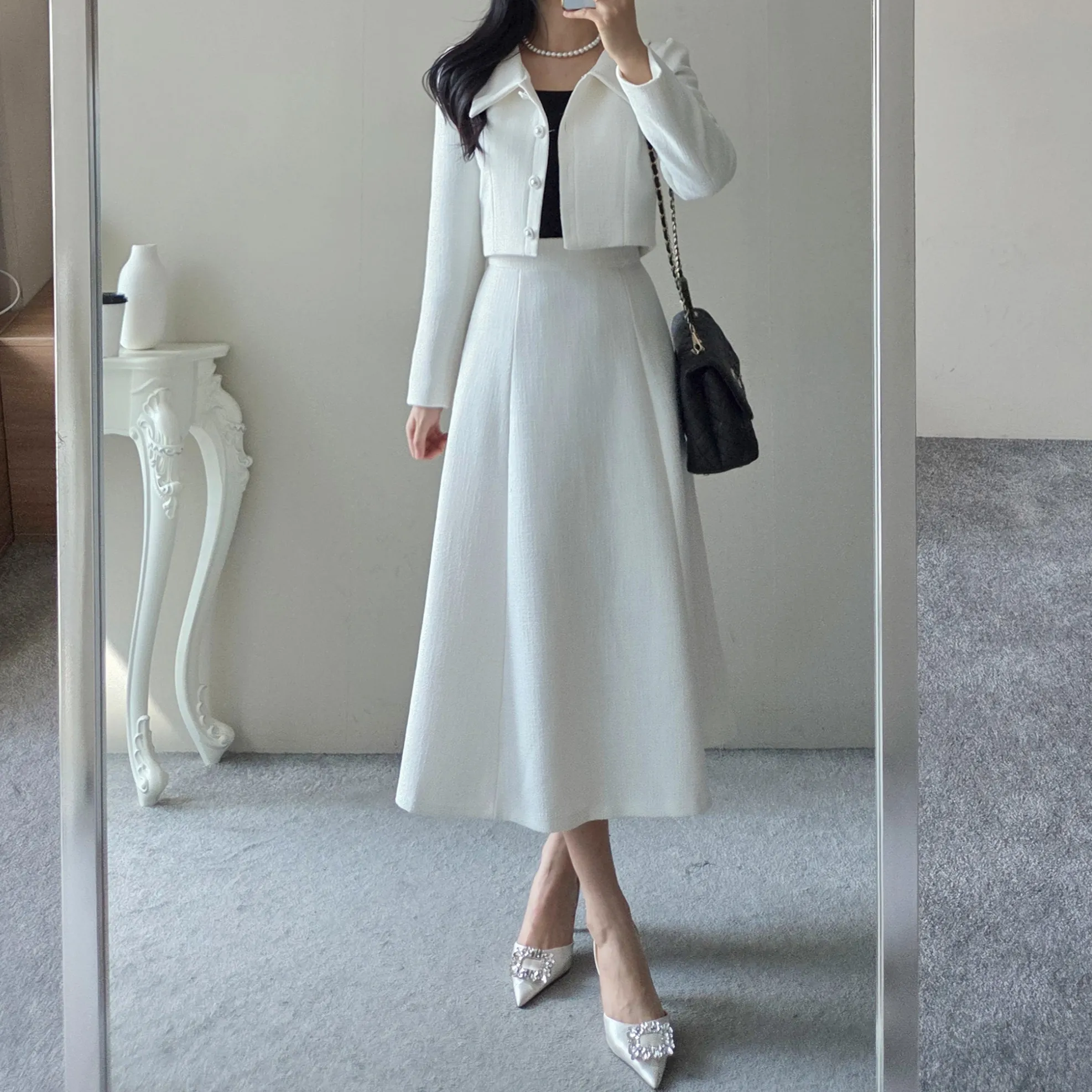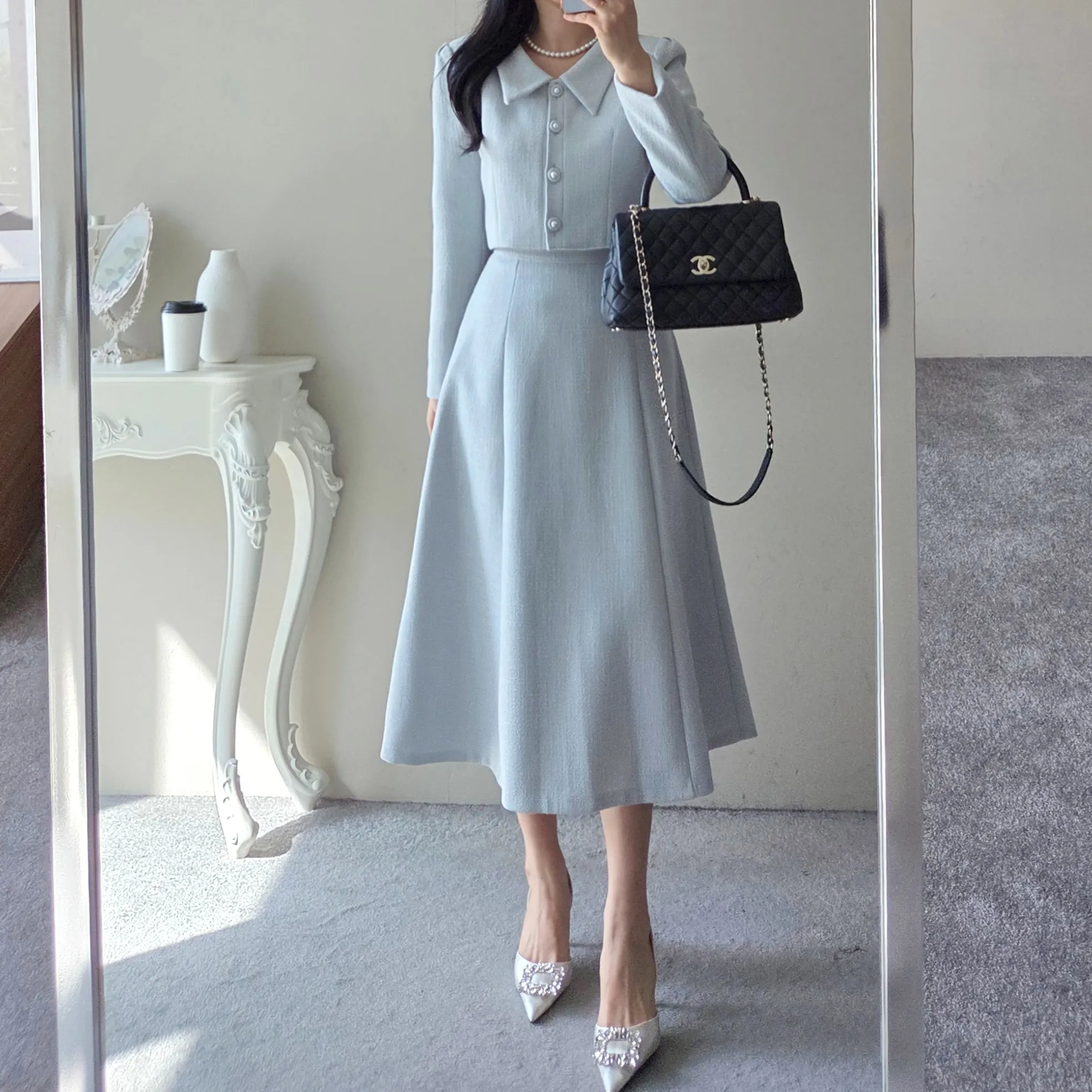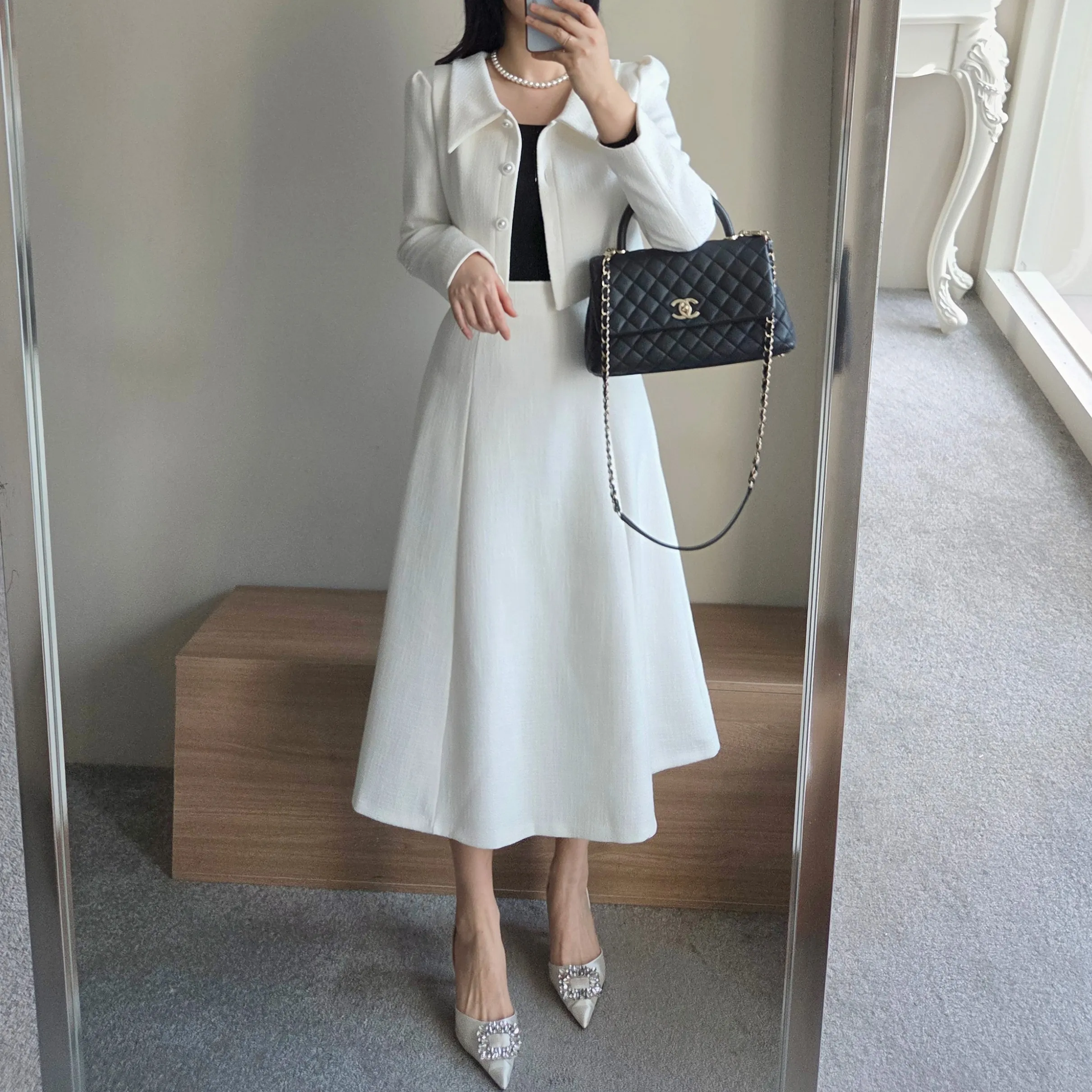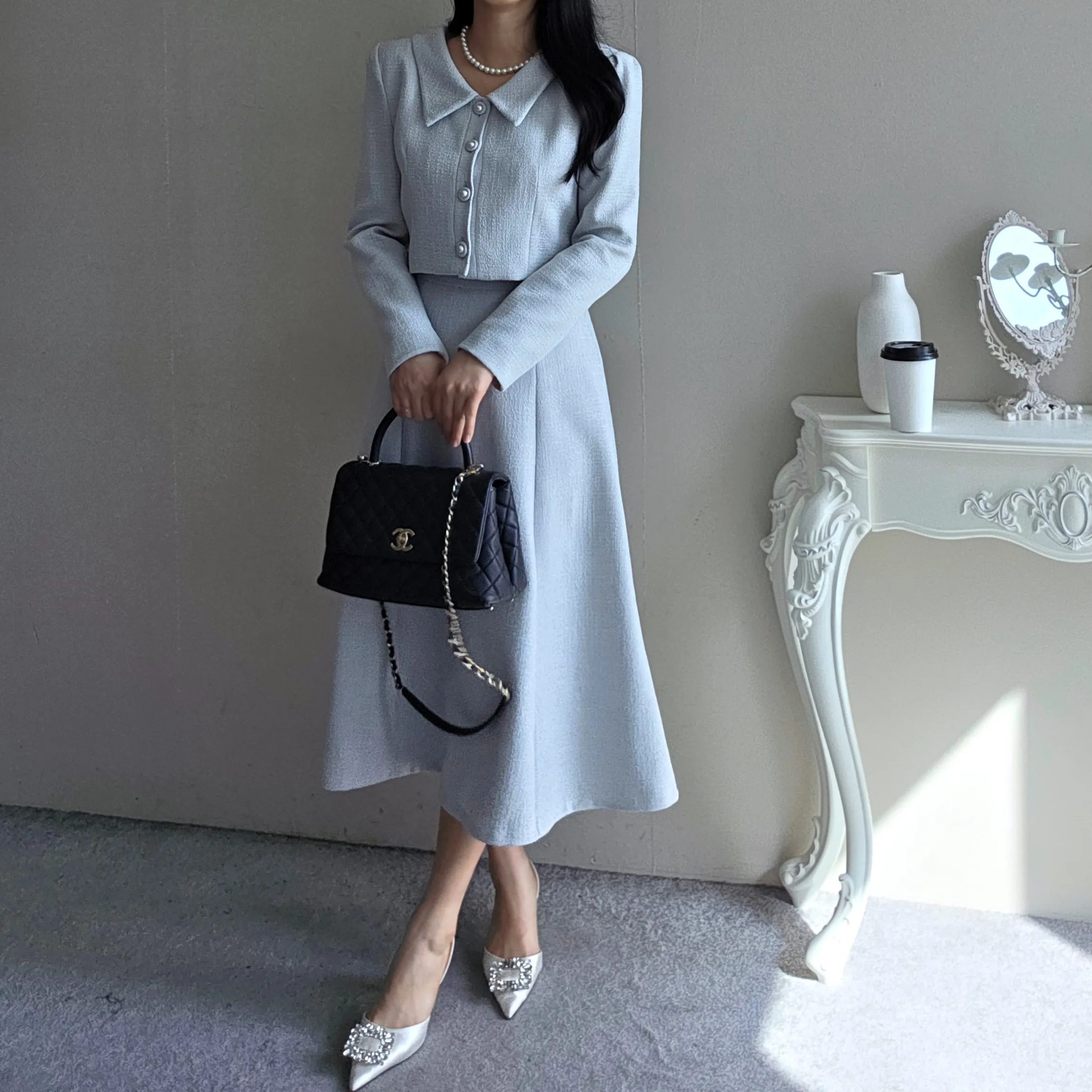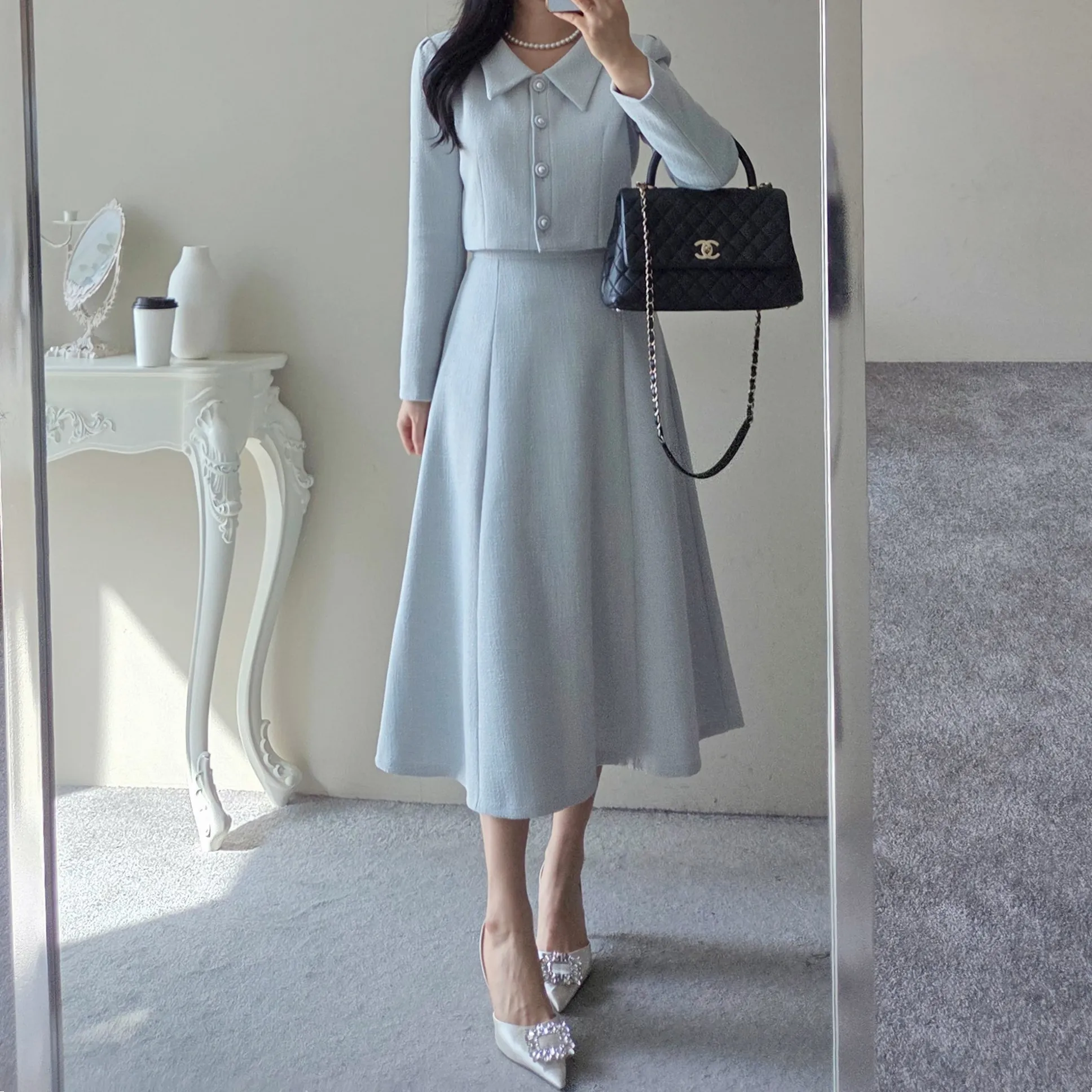 ツイードグリッタースクエアネックパール調ボタン肩パッドクロップドロング長袖タックフレアAラインフェイクポケットヒドゥンジッパーツーピース(トップス、ボトムス)スカートジャケット