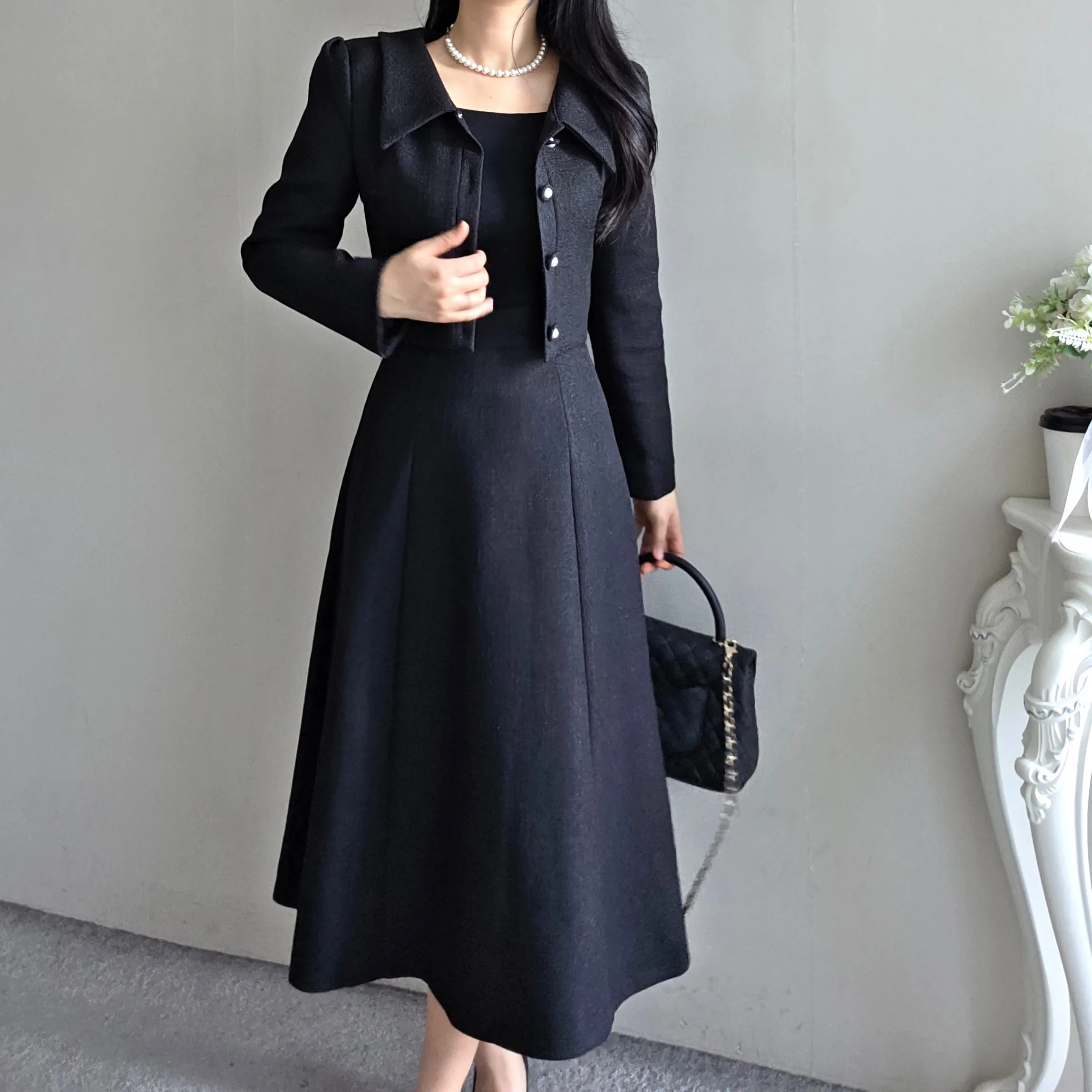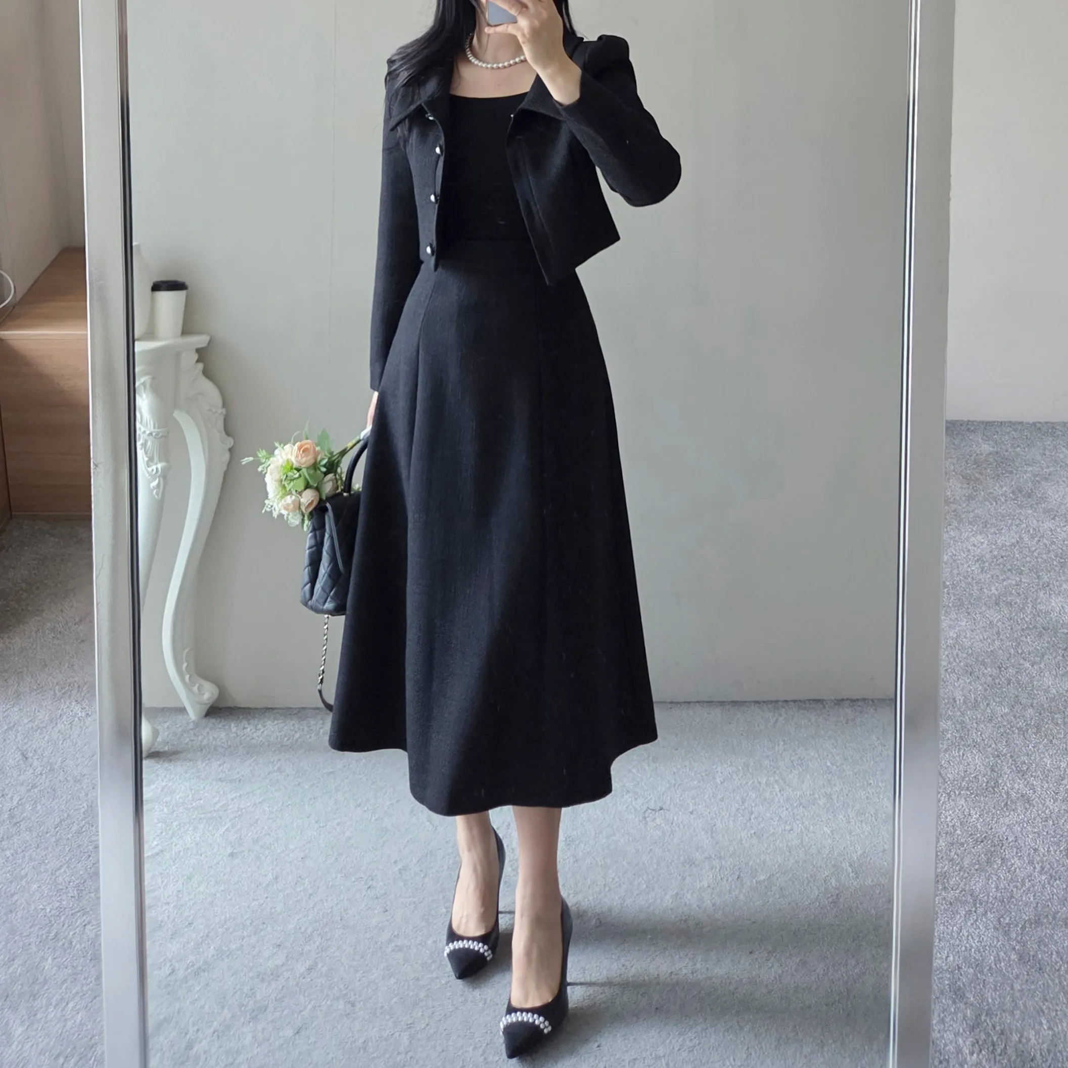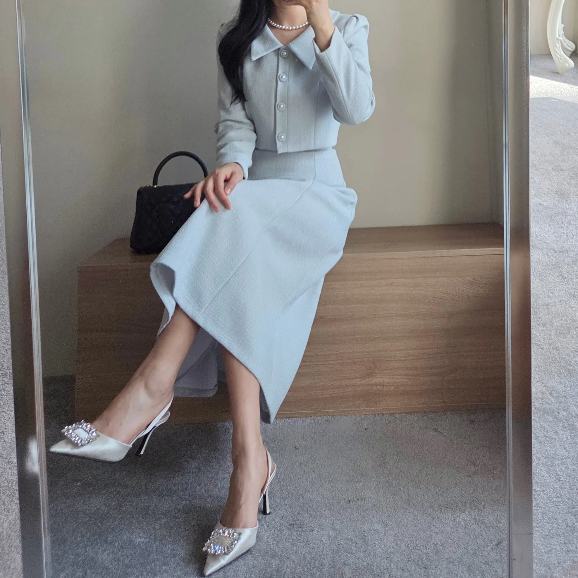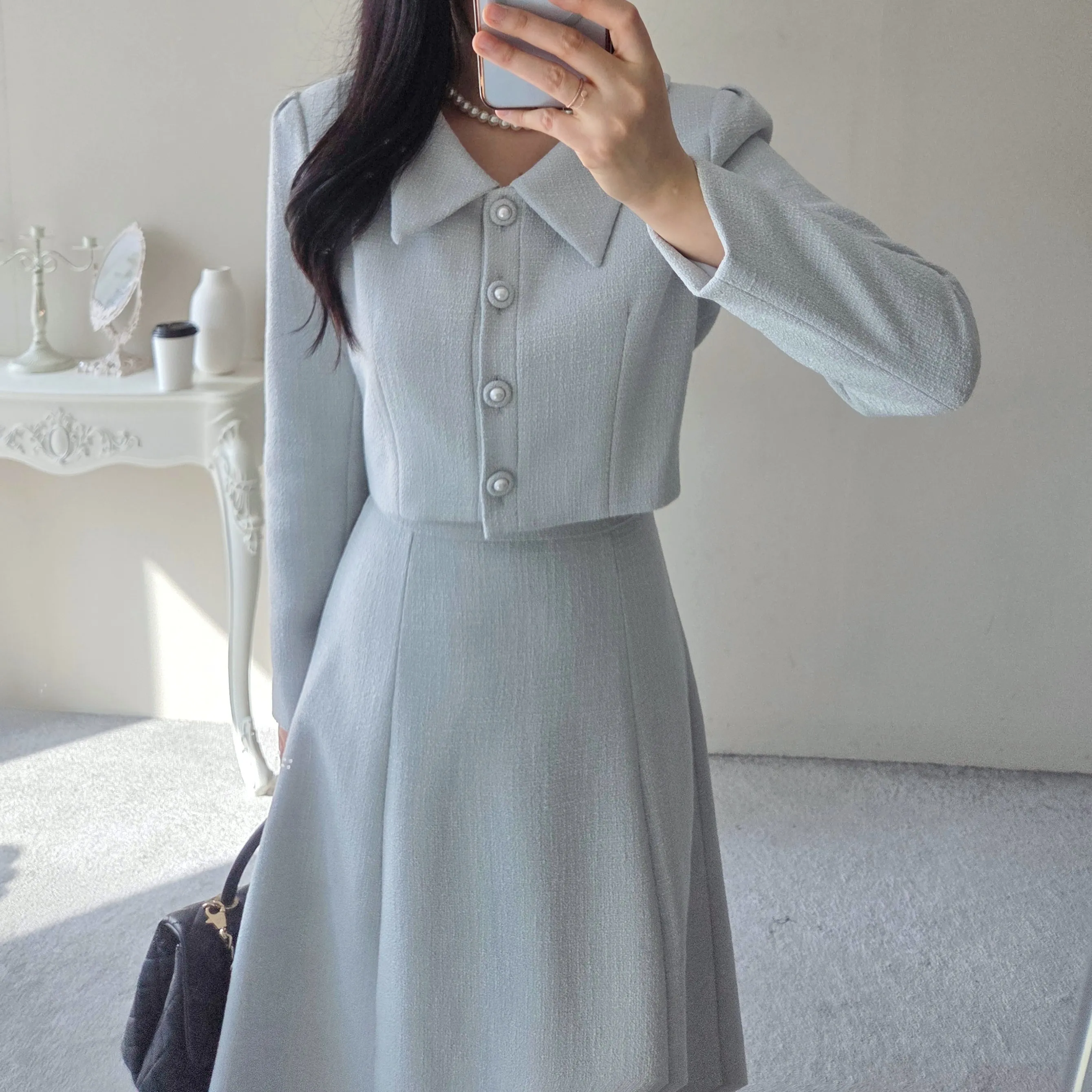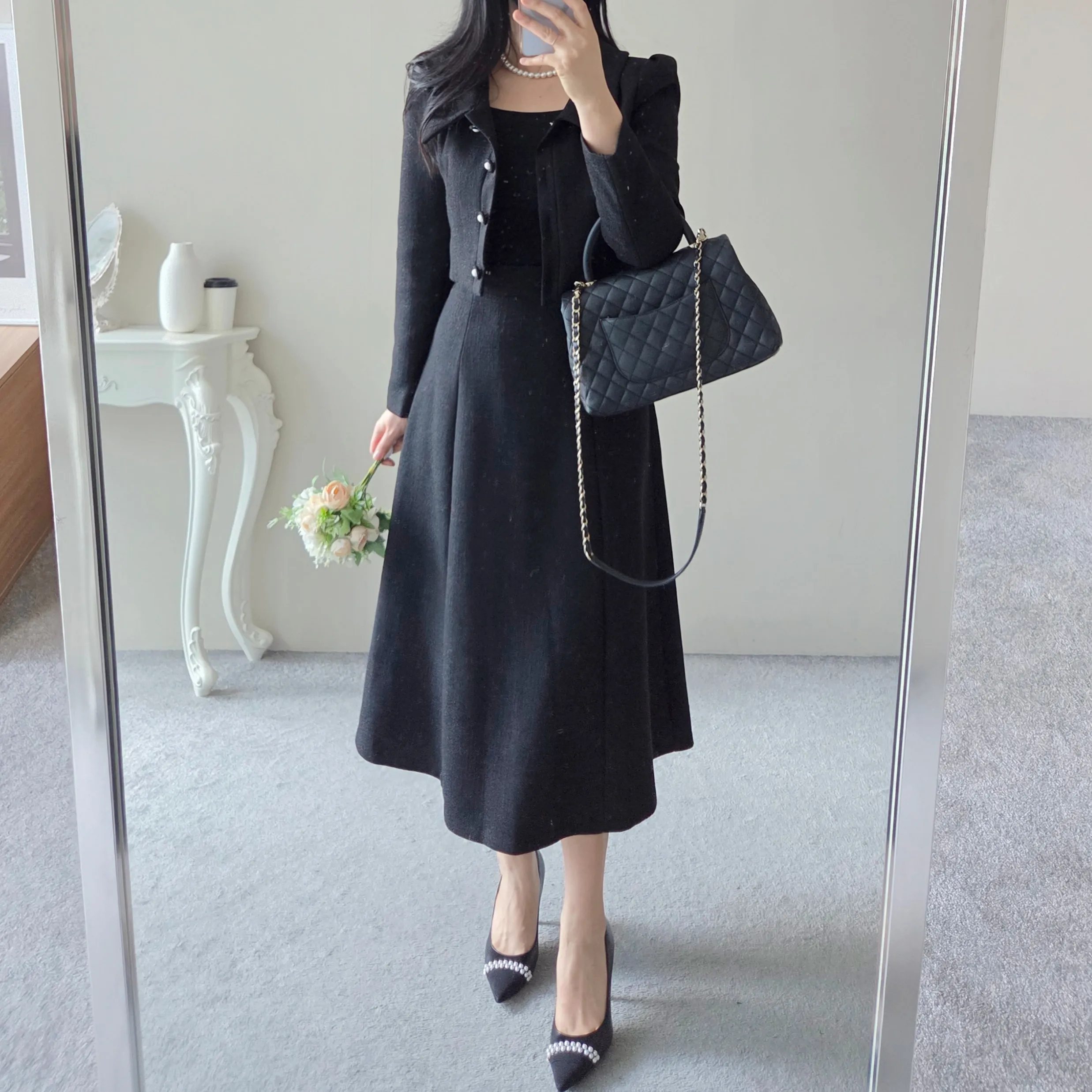 ツイードグリッタースクエアネックパール調ボタン肩パッドクロップドロング長袖タックフレアAラインフェイクポケットヒドゥンジッパーツーピース(トップス、ボトムス)スカートジャケット