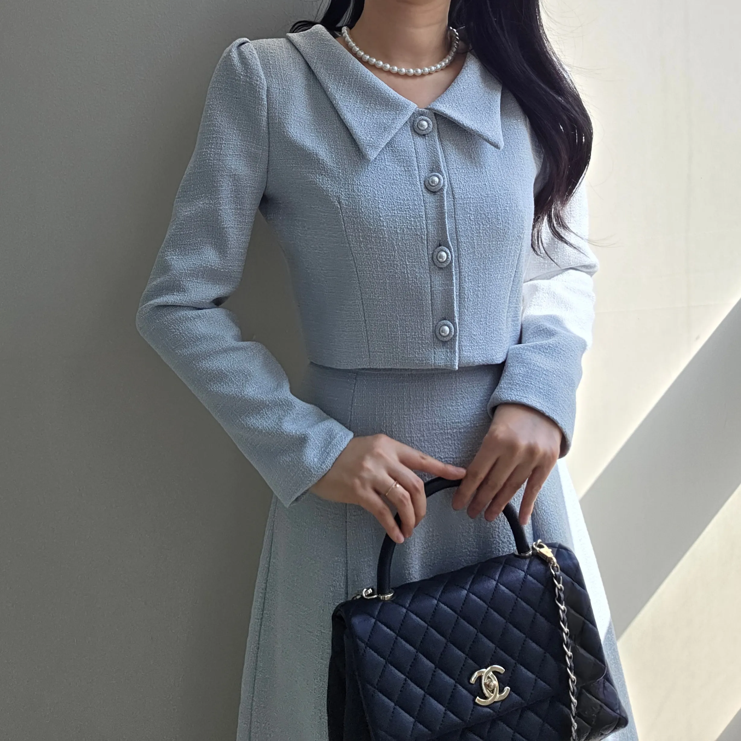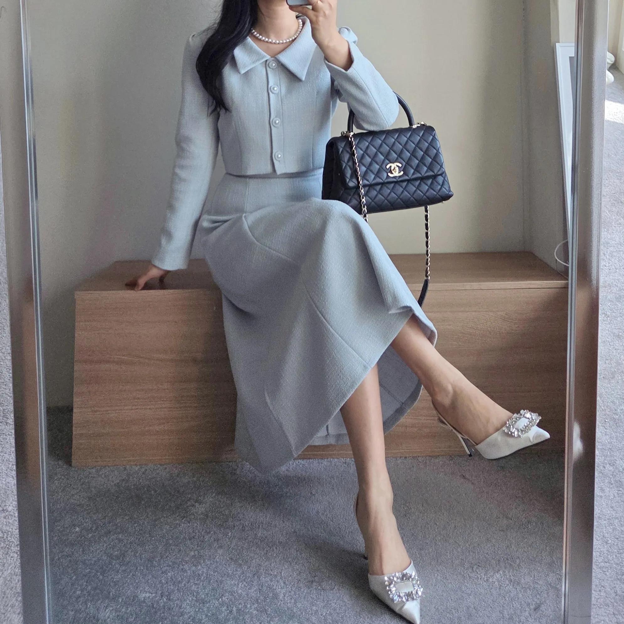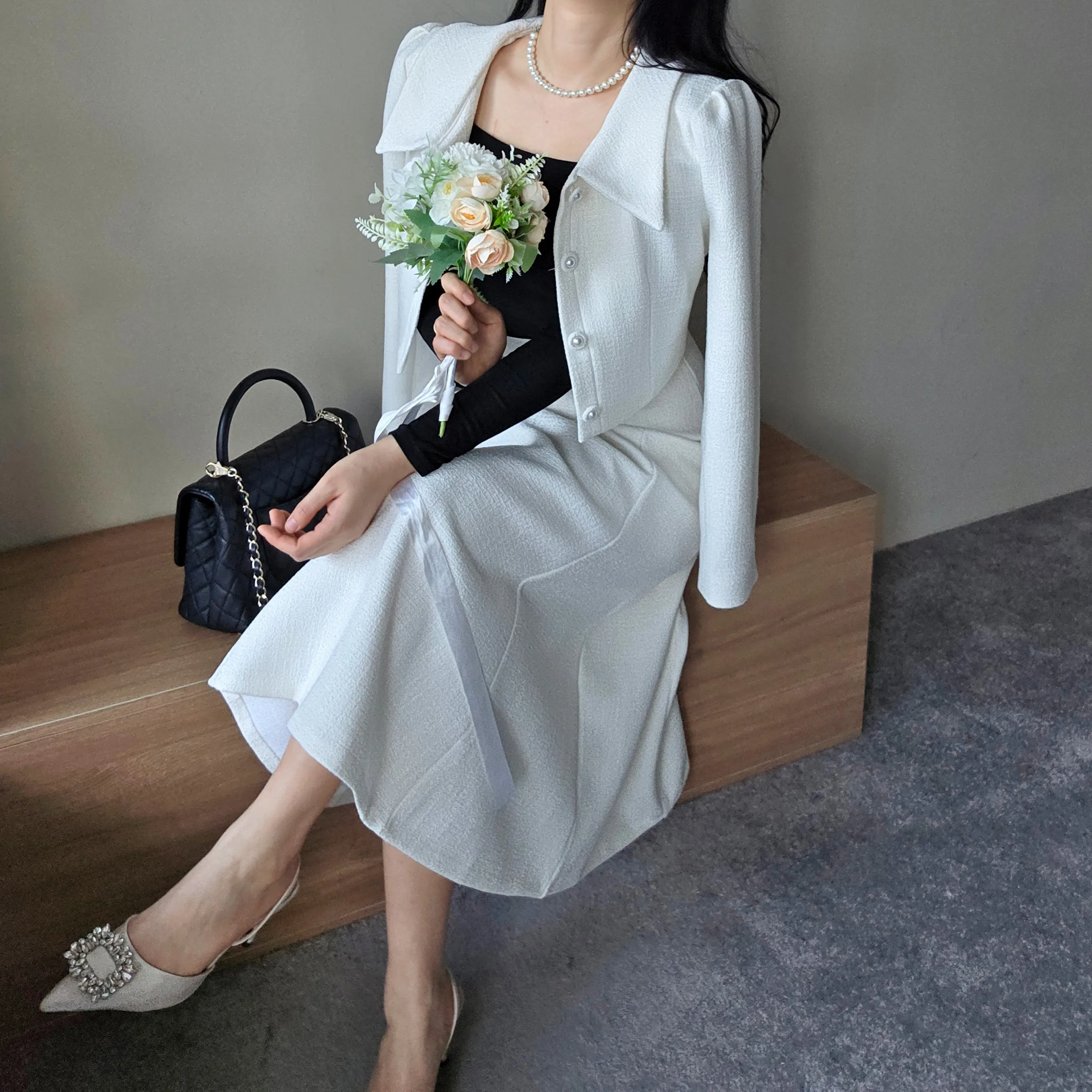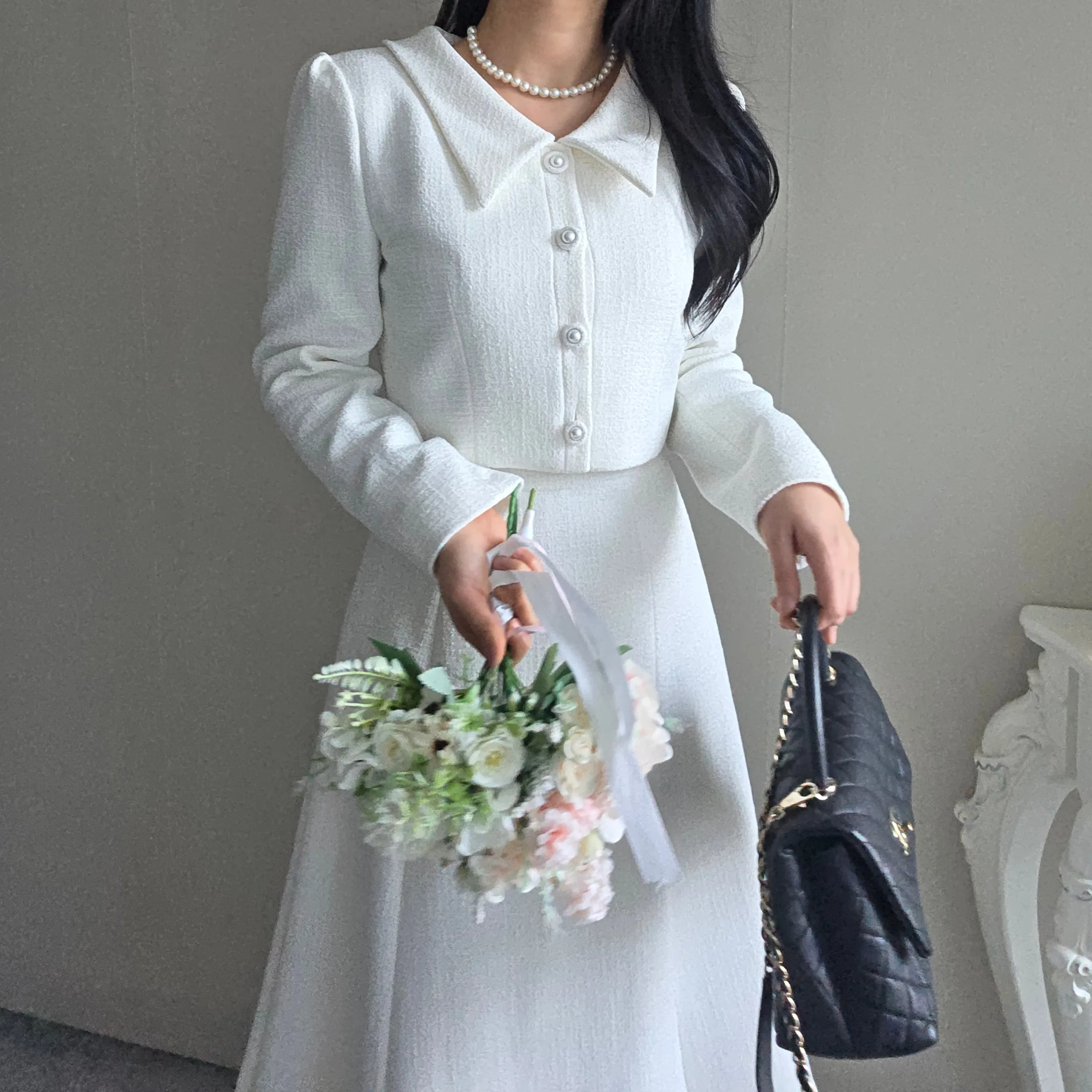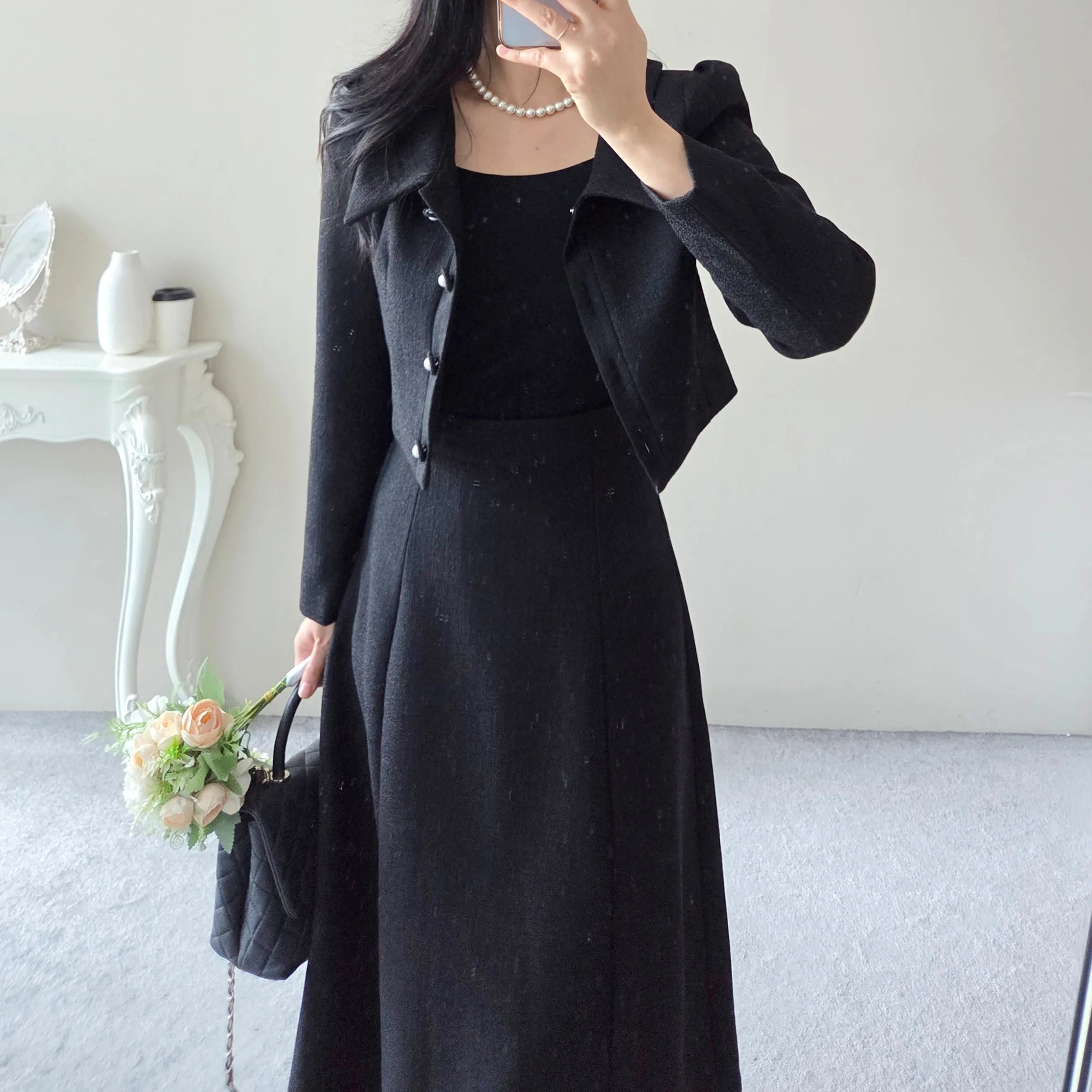 ツイードグリッタースクエアネックパール調ボタン肩パッドクロップドロング長袖タックフレアAラインフェイクポケットヒドゥンジッパーツーピース(トップス、ボトムス)スカートジャケット