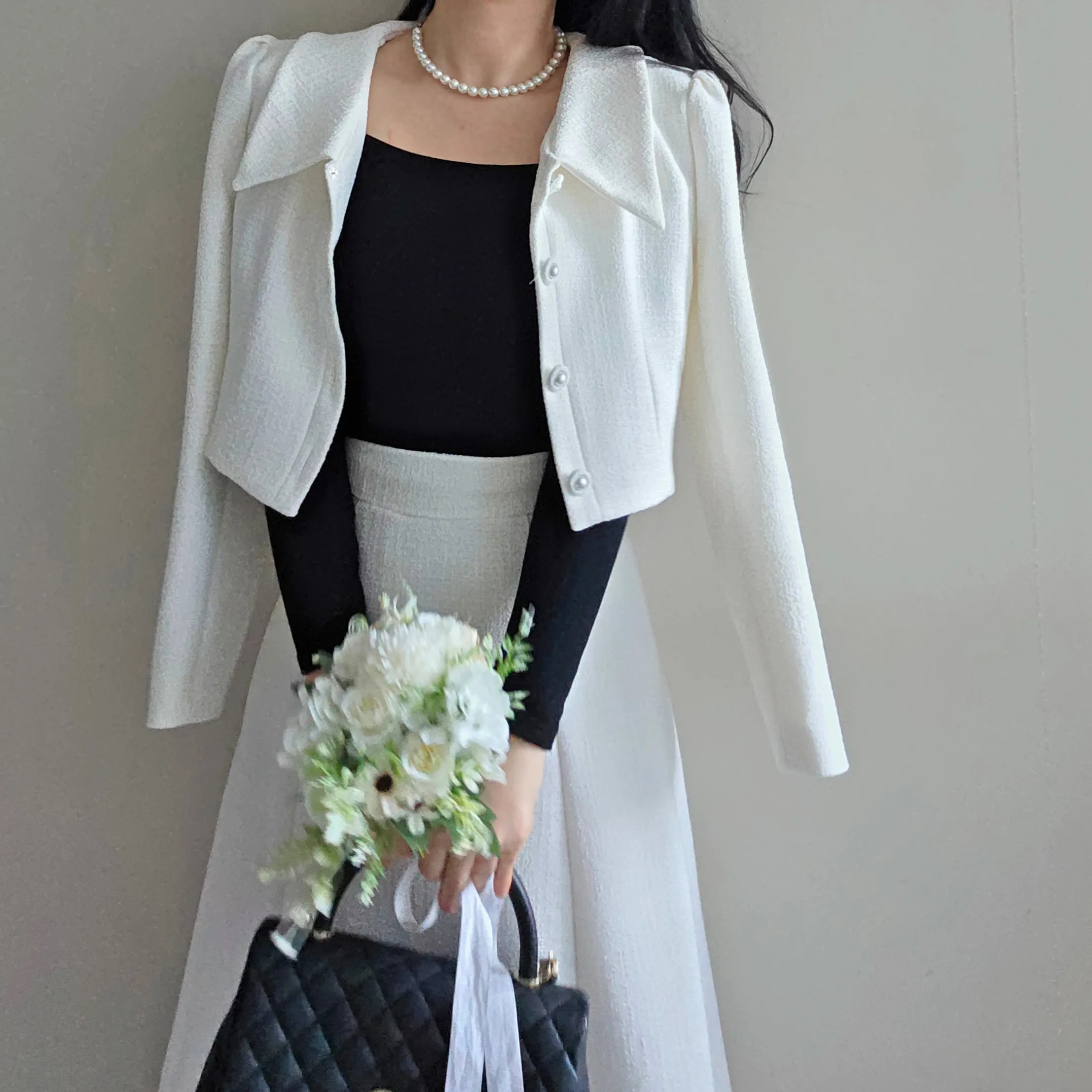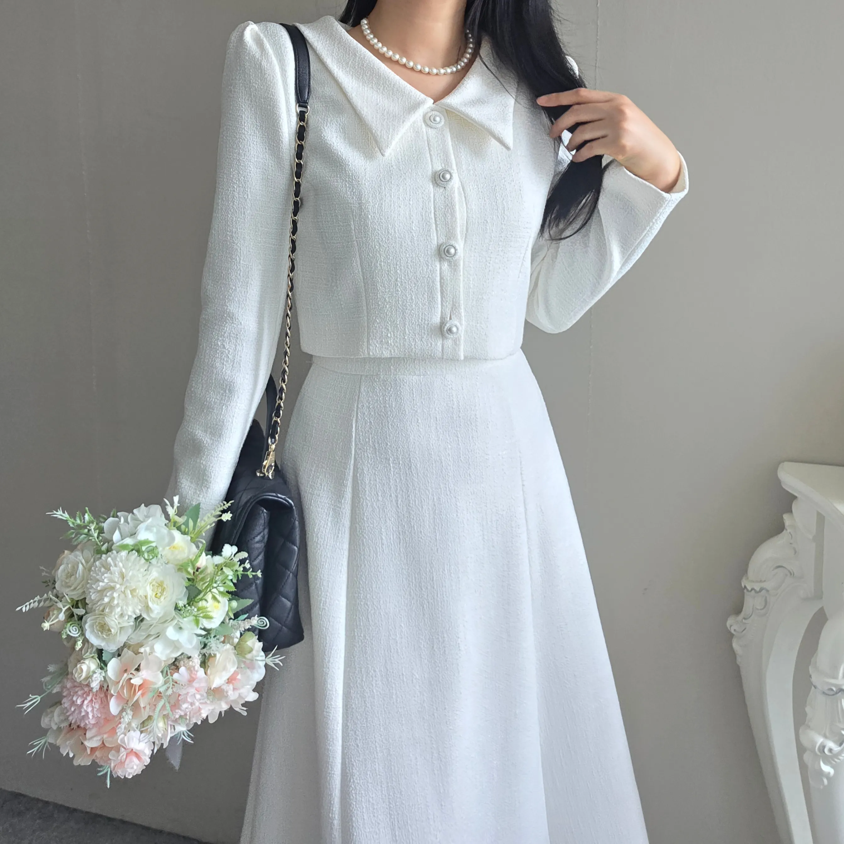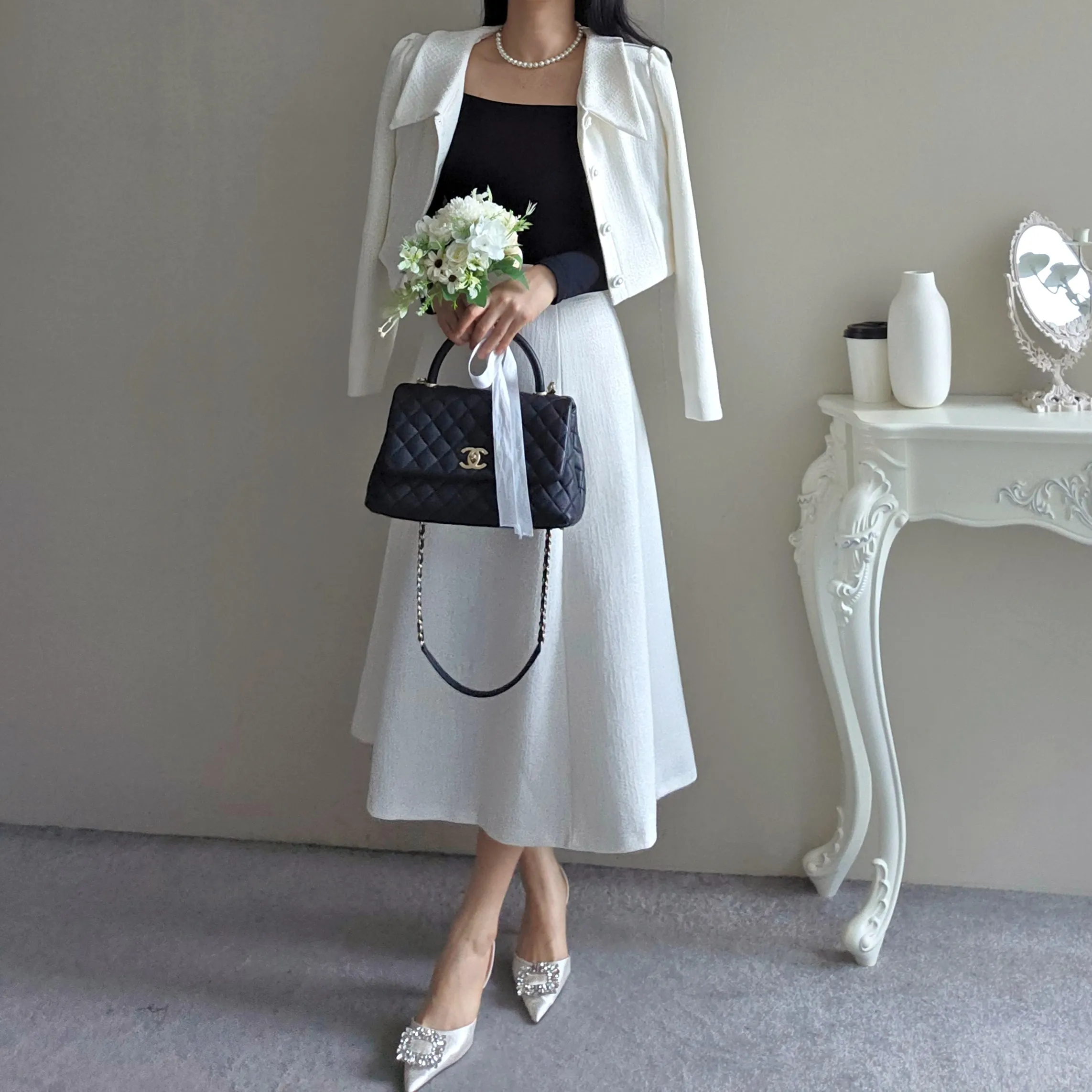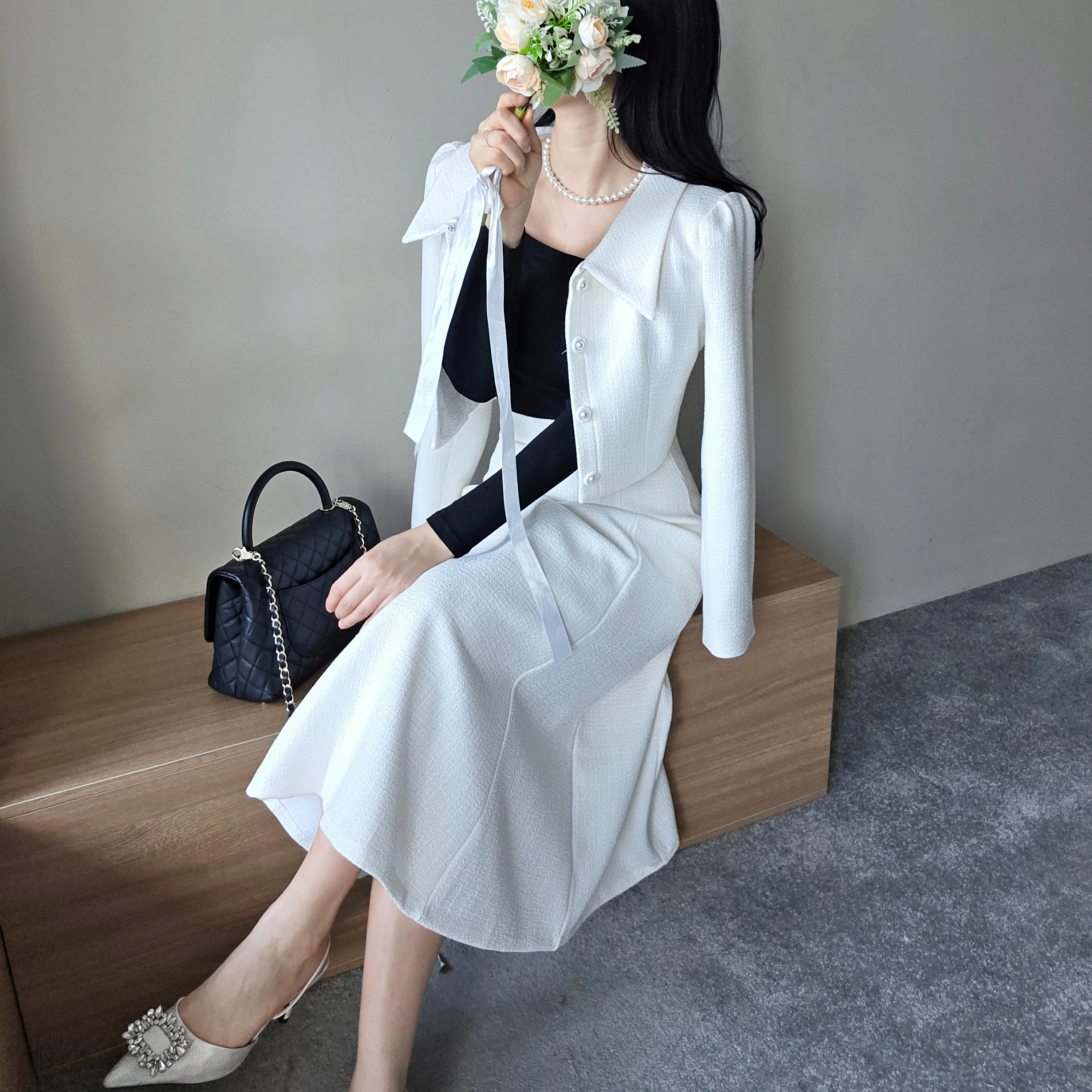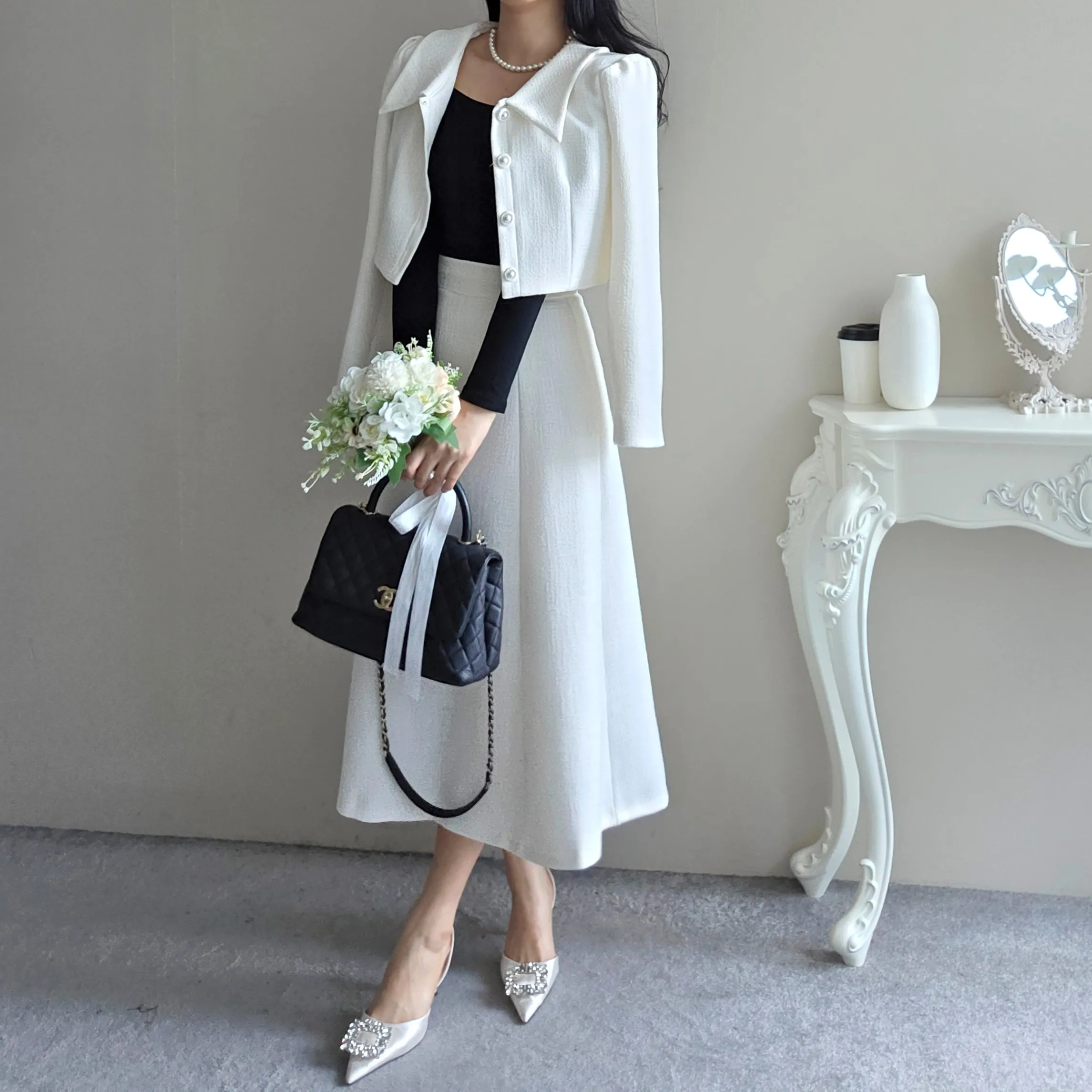 ツイードグリッタースクエアネックパール調ボタン肩パッドクロップドロング長袖タックフレアAラインフェイクポケットヒドゥンジッパーツーピース(トップス、ボトムス)スカートジャケット