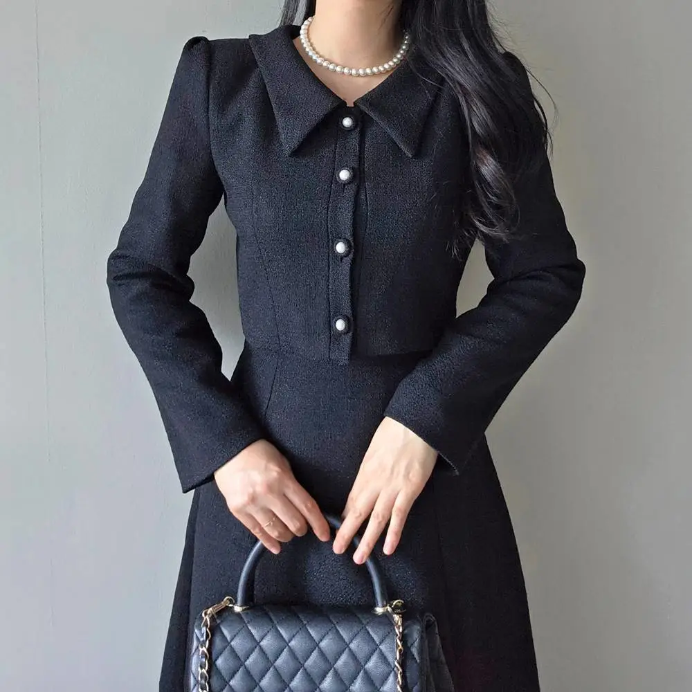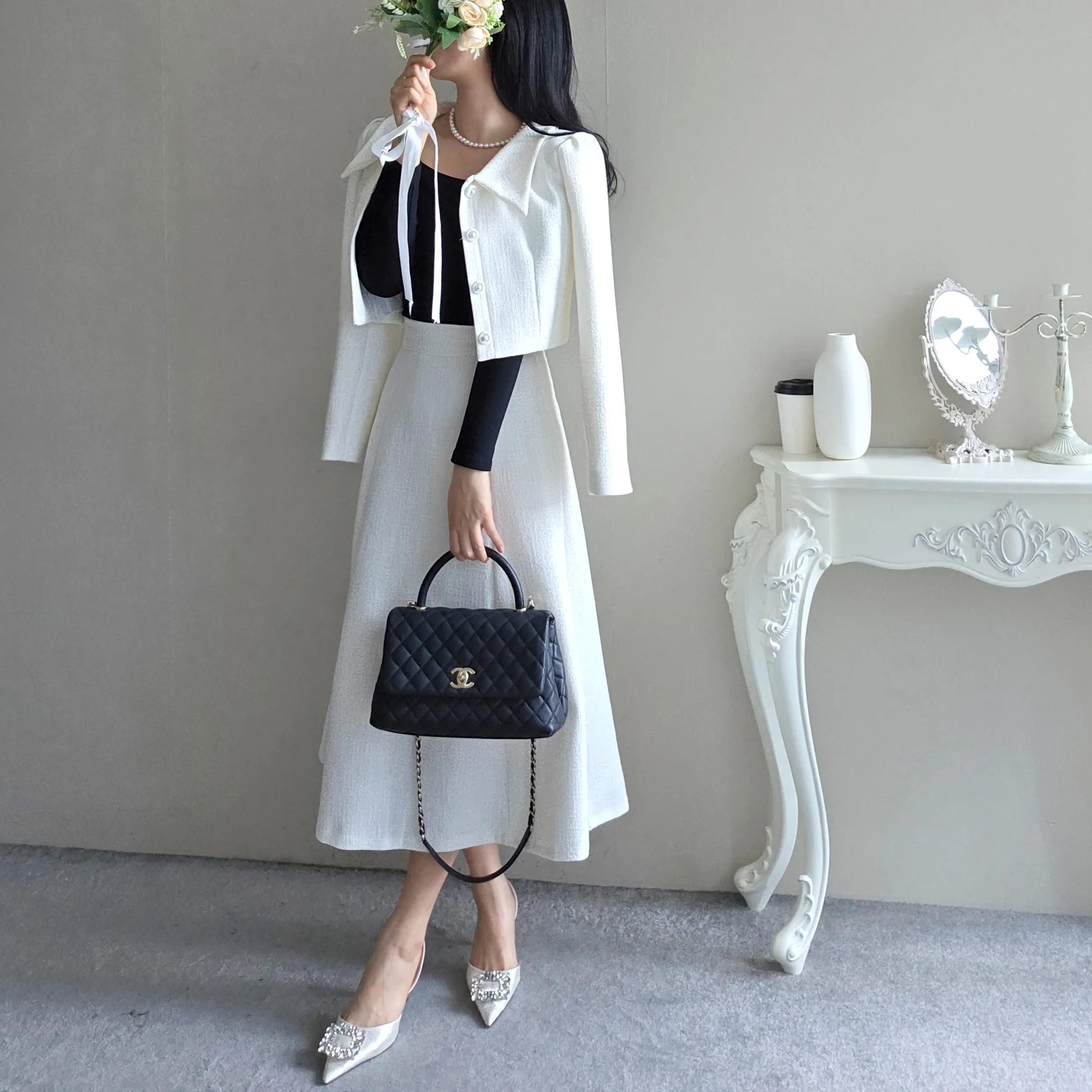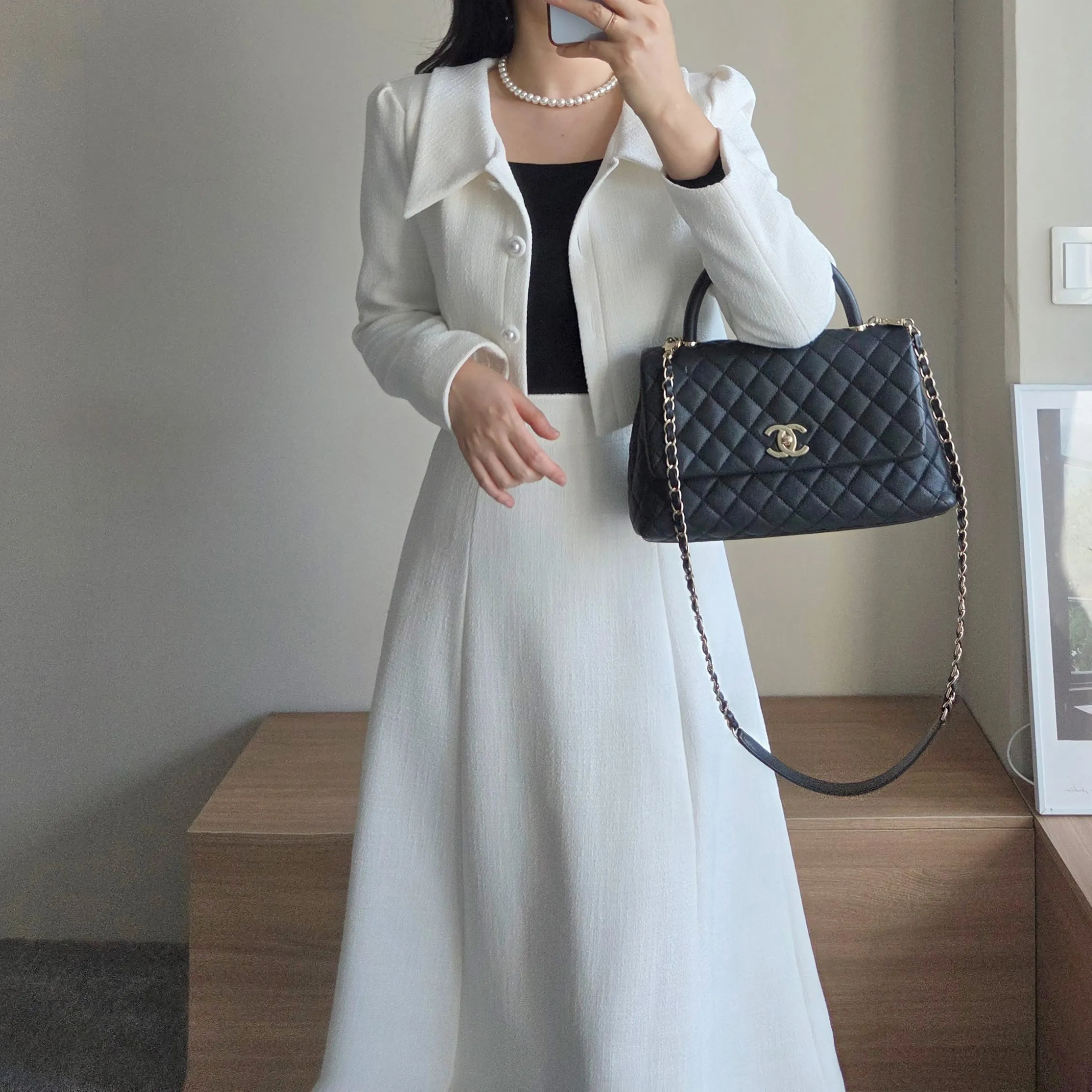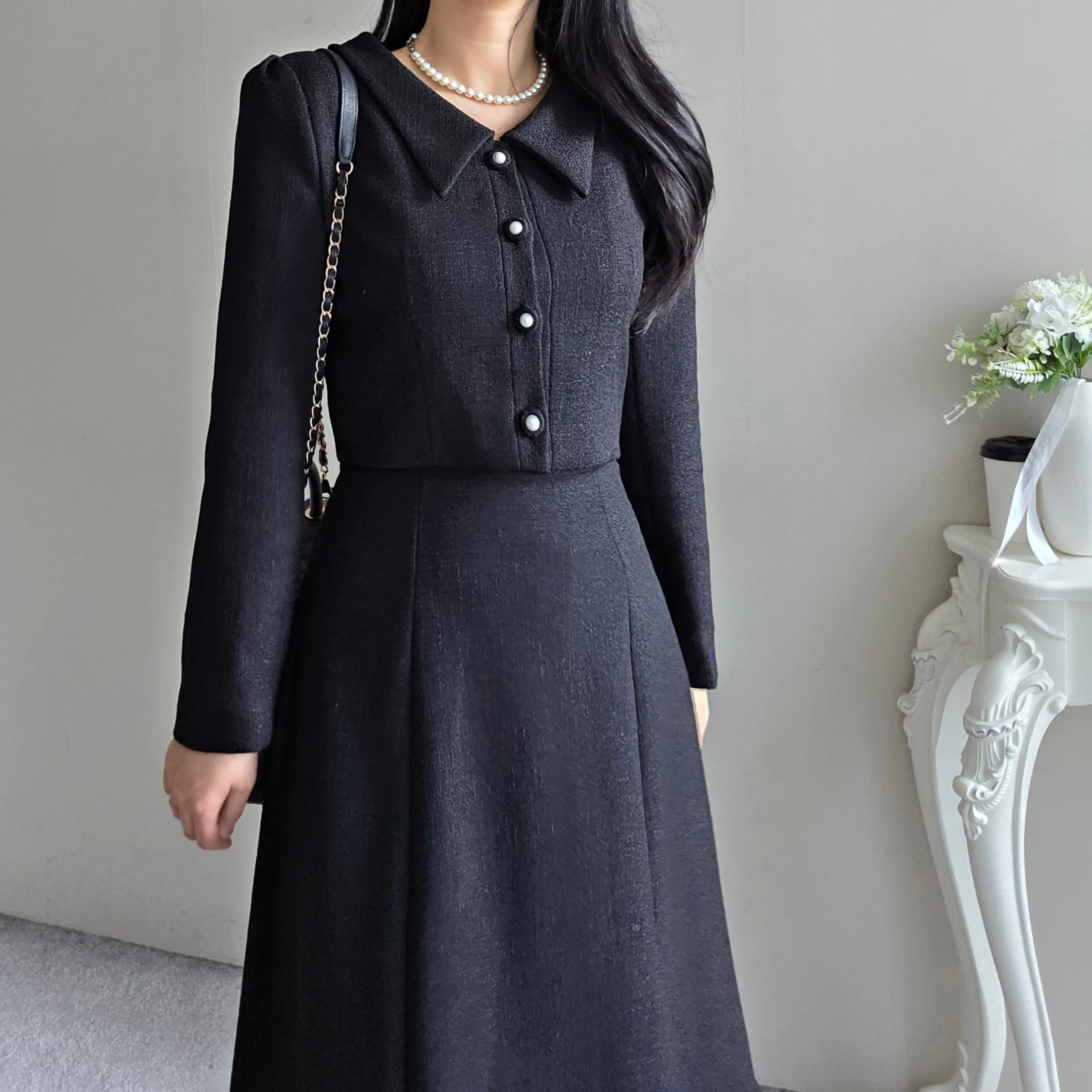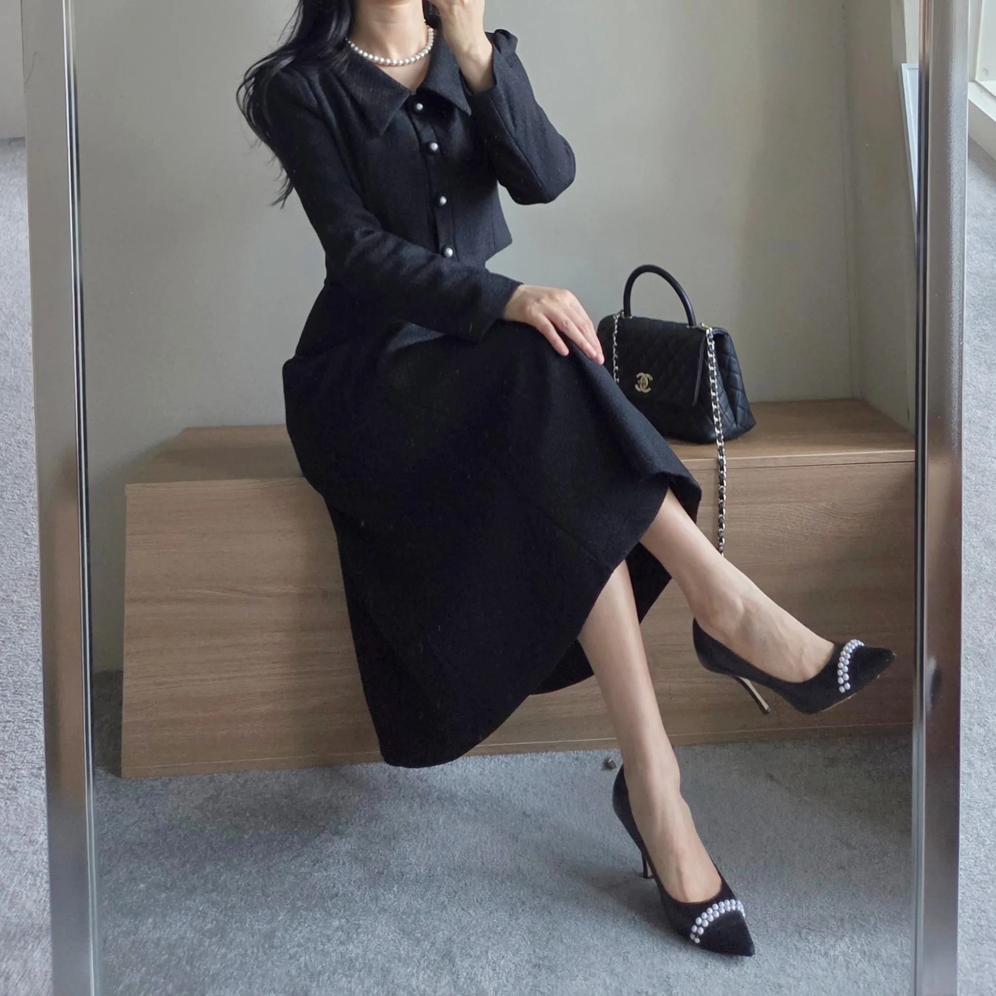 ツイードグリッタースクエアネックパール調ボタン肩パッドクロップドロング長袖タックフレアAラインフェイクポケットヒドゥンジッパーツーピース(トップス、ボトムス)スカートジャケット