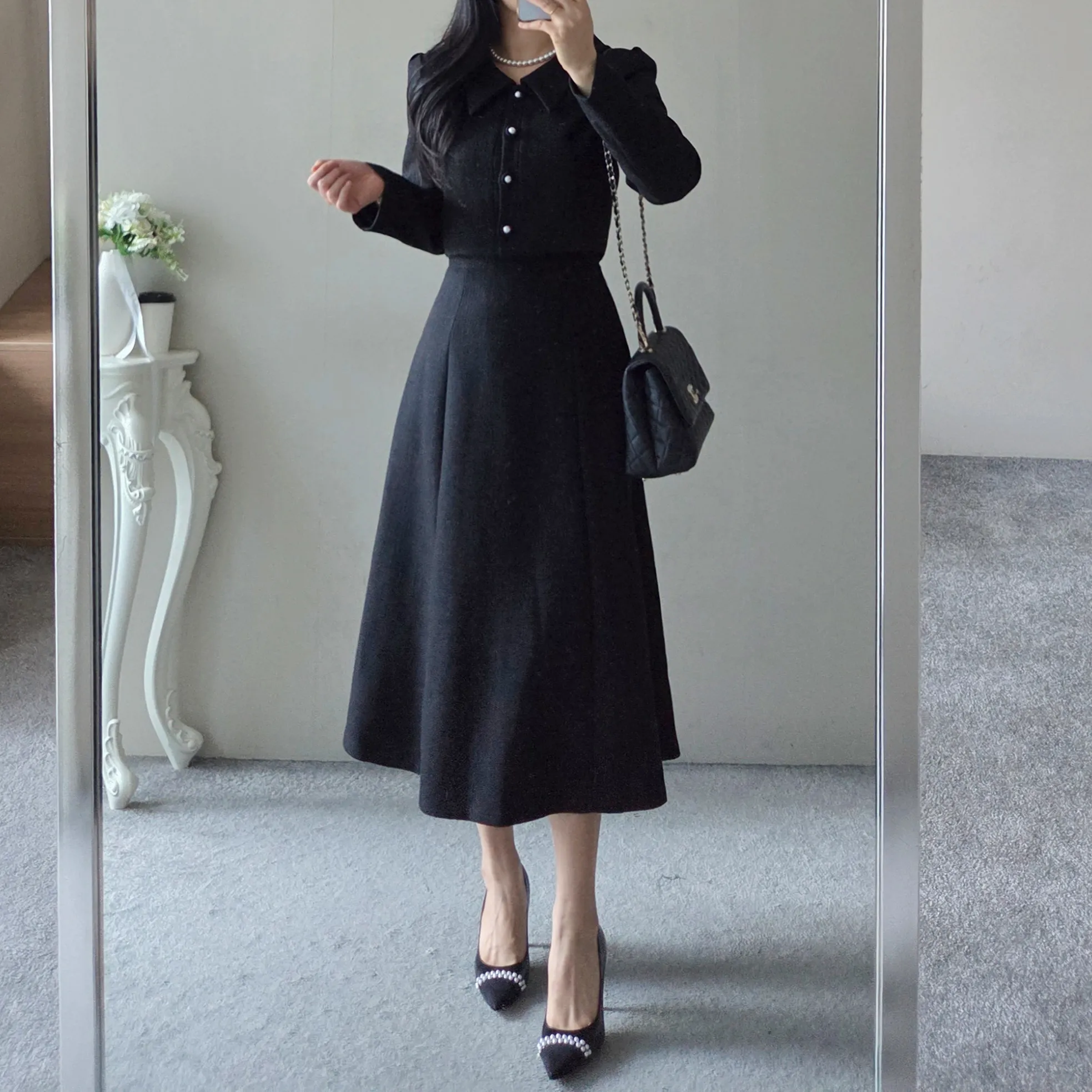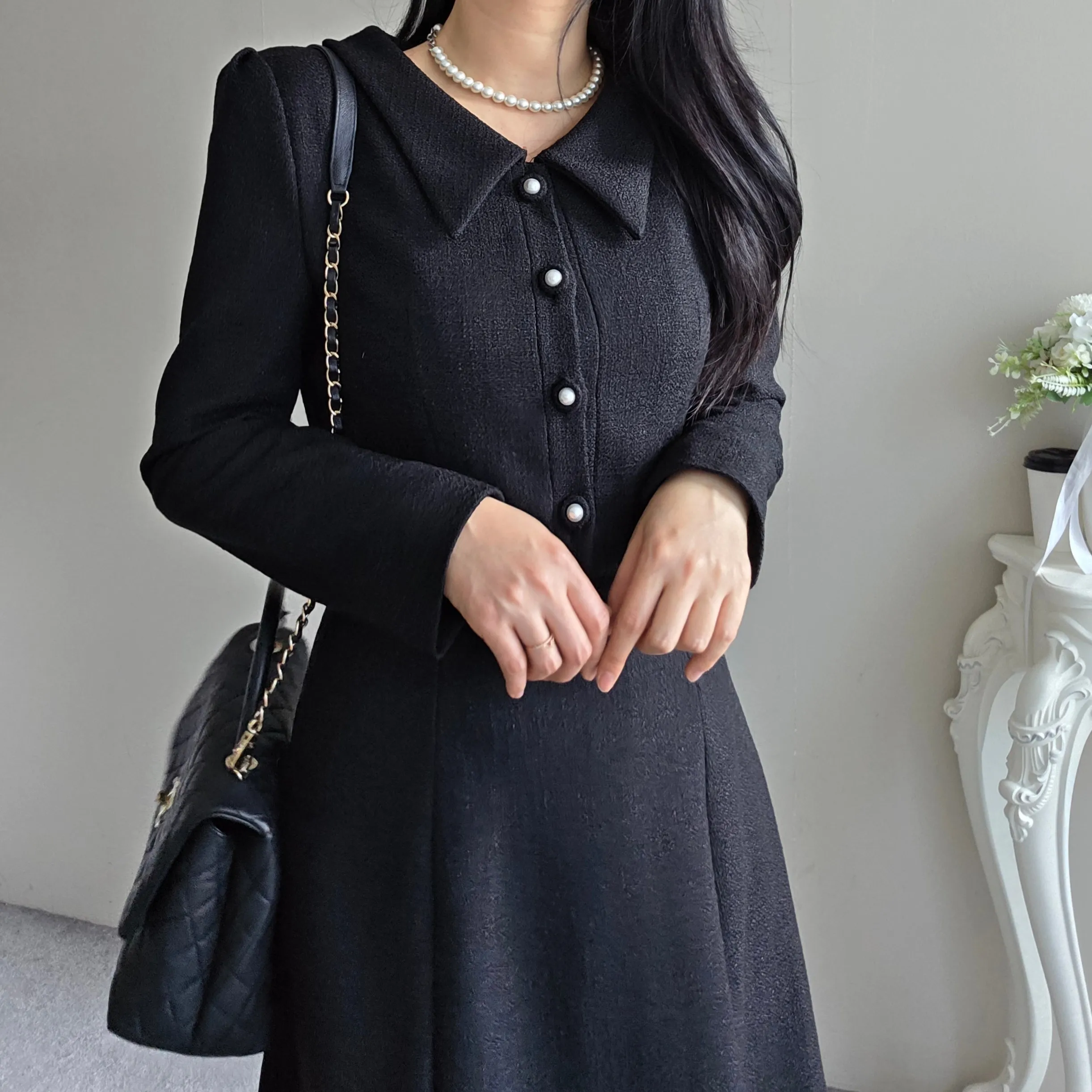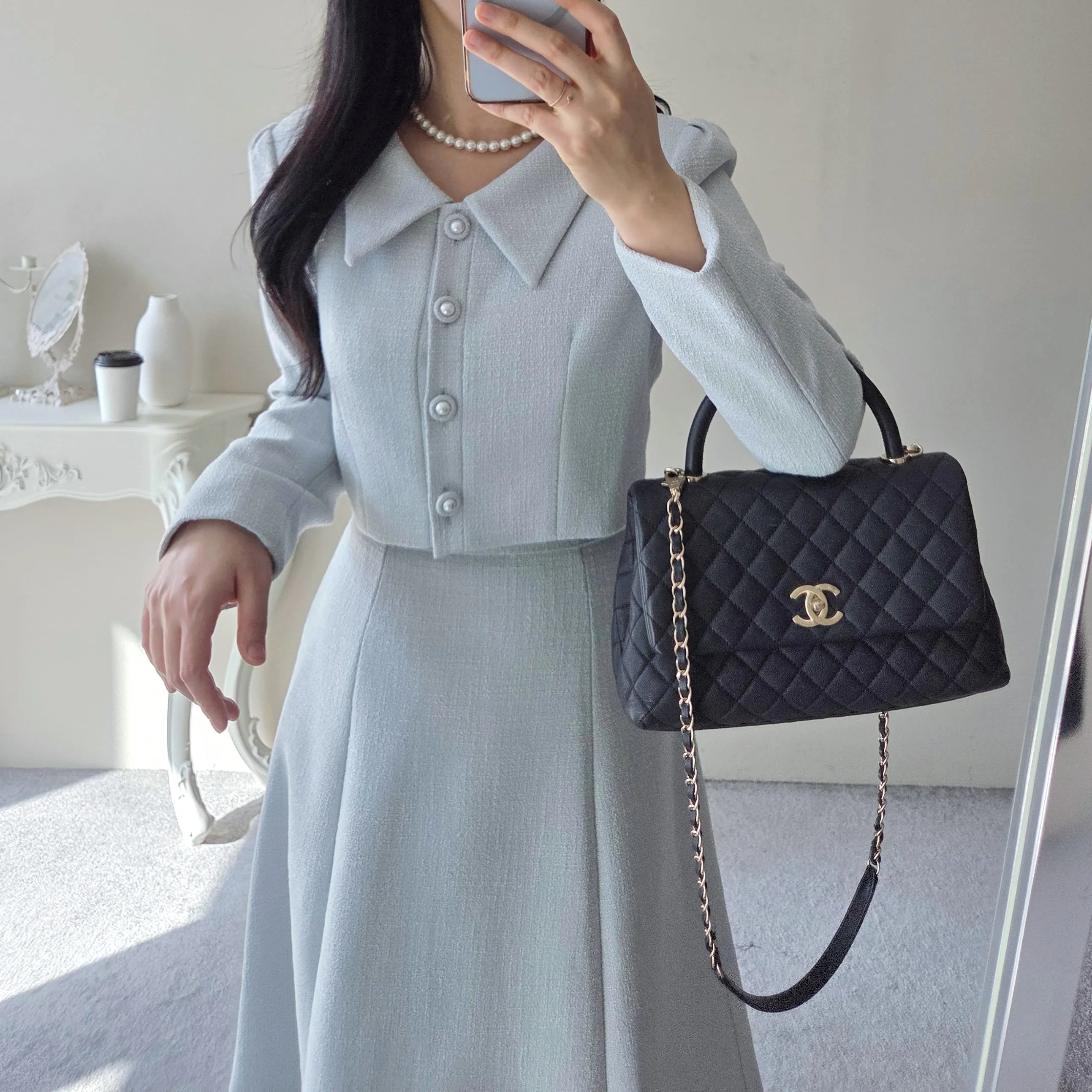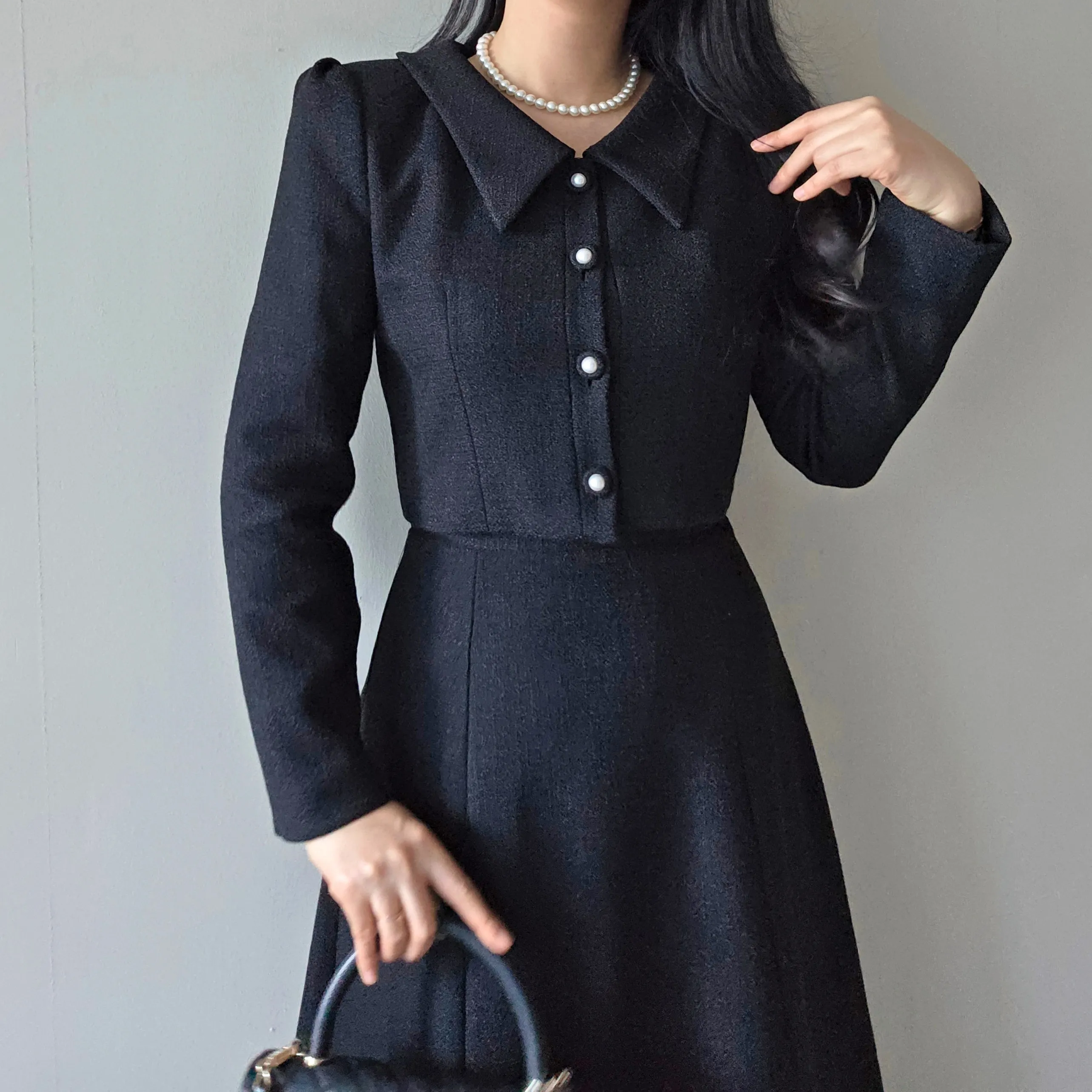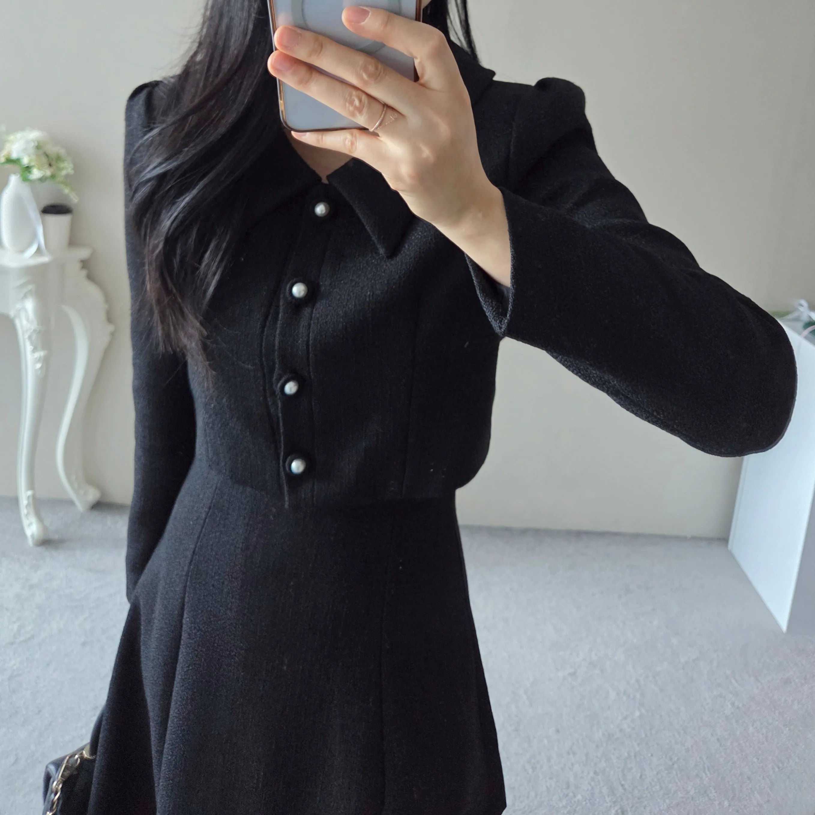 ツイードグリッタースクエアネックパール調ボタン肩パッドクロップドロング長袖タックフレアAラインフェイクポケットヒドゥンジッパーツーピース(トップス、ボトムス)スカートジャケット