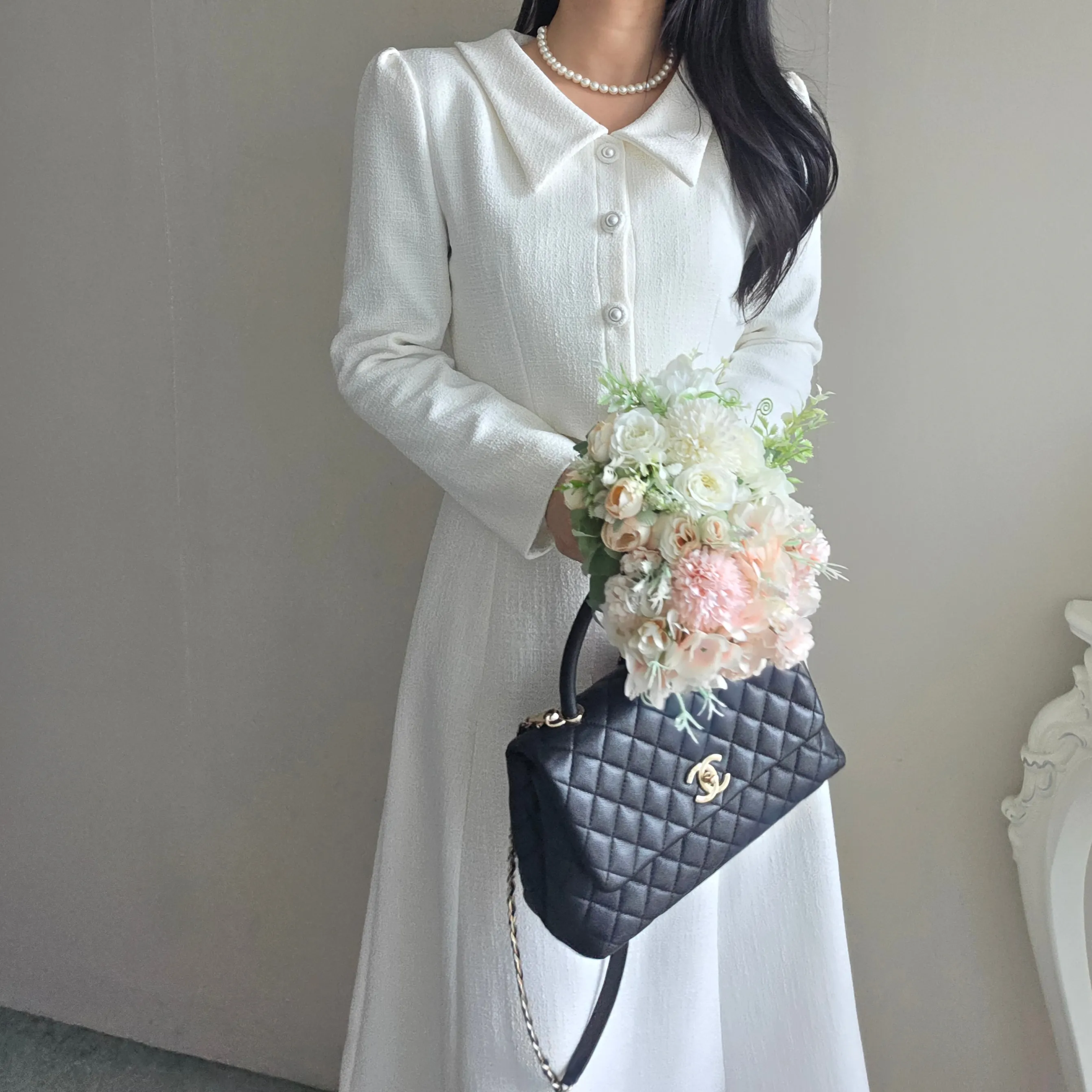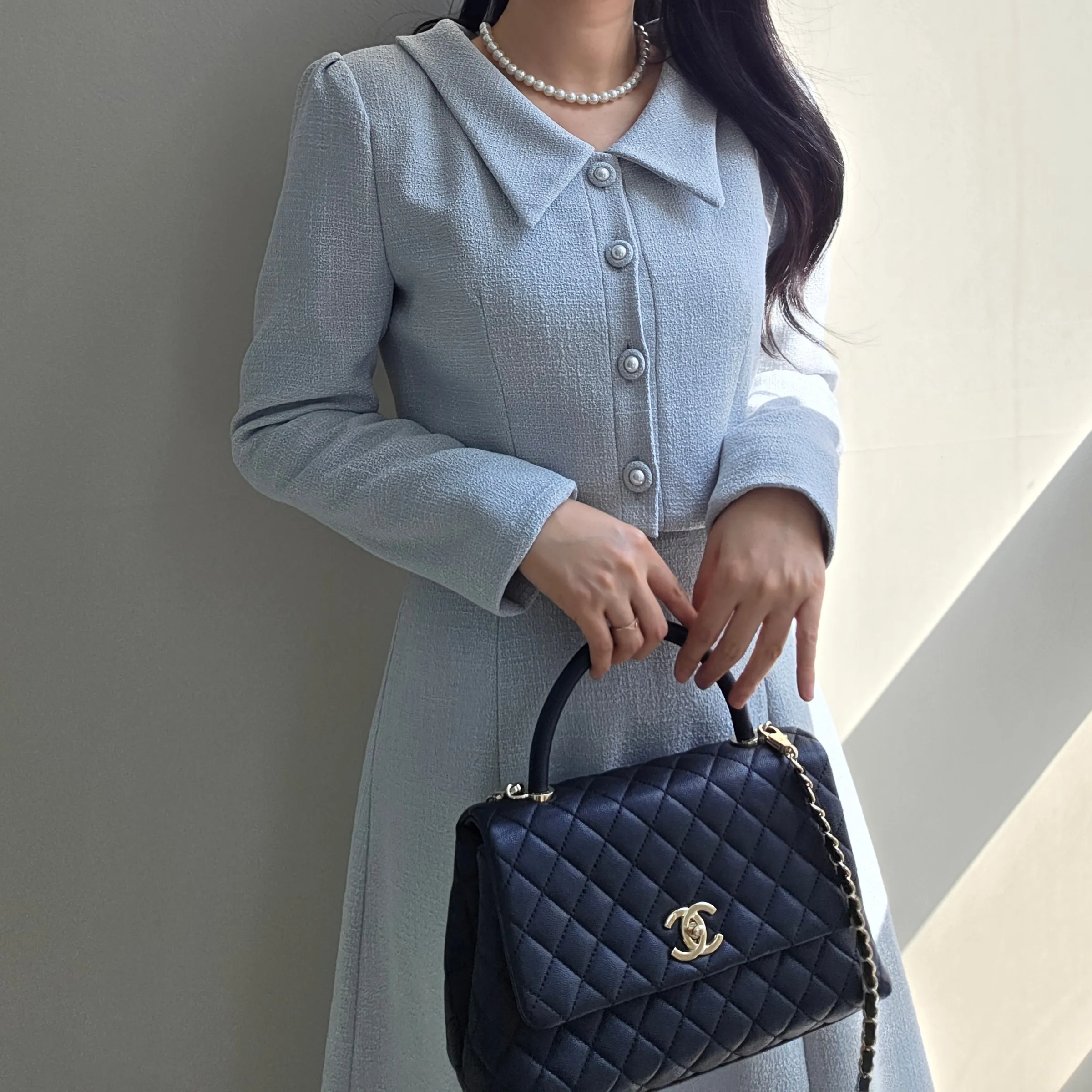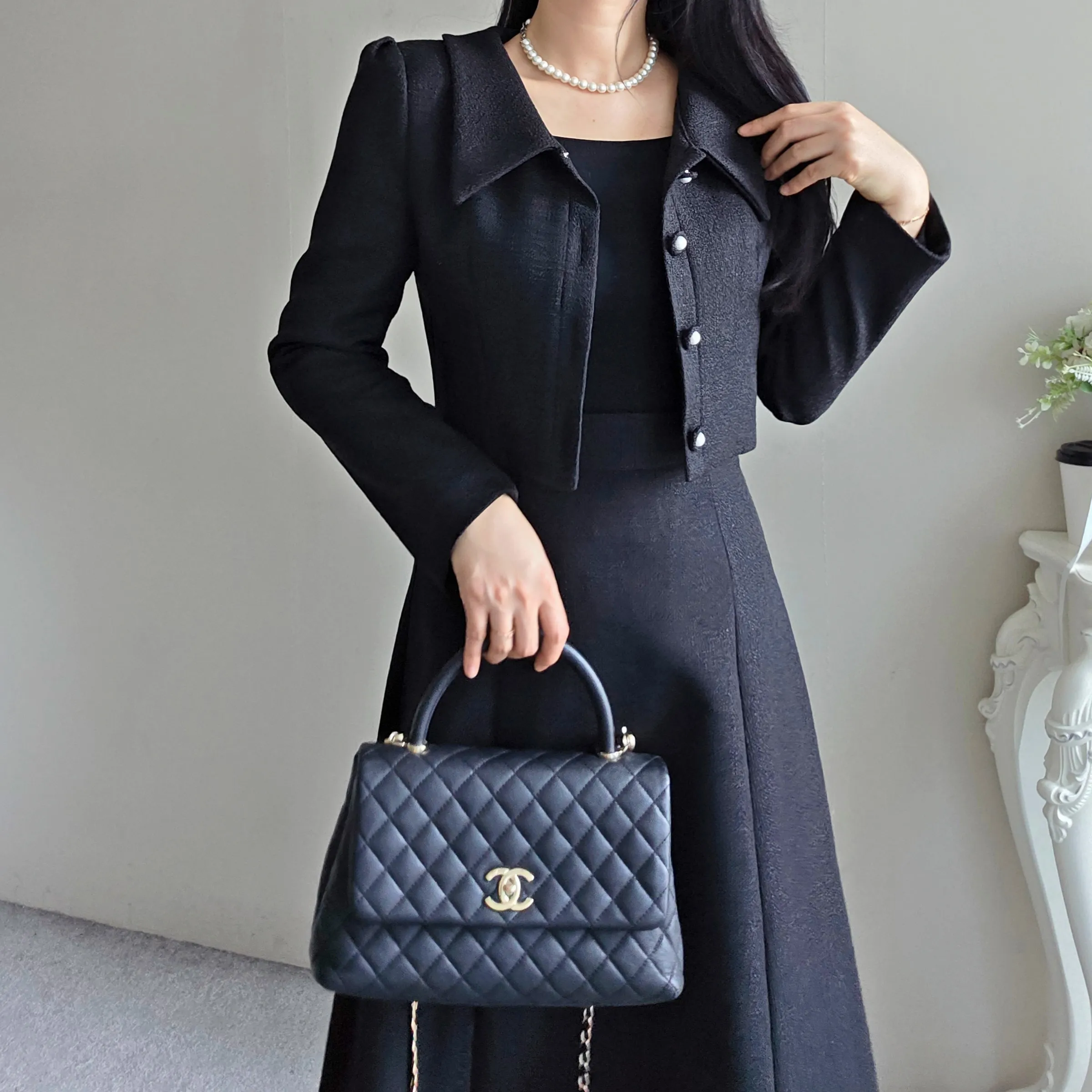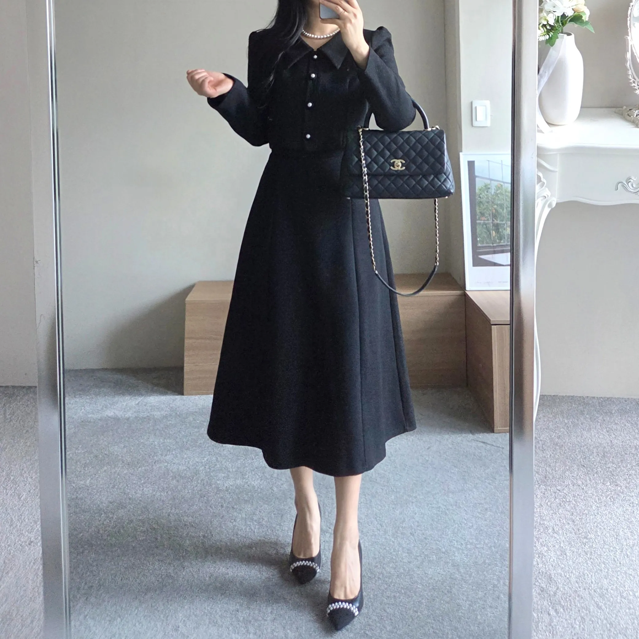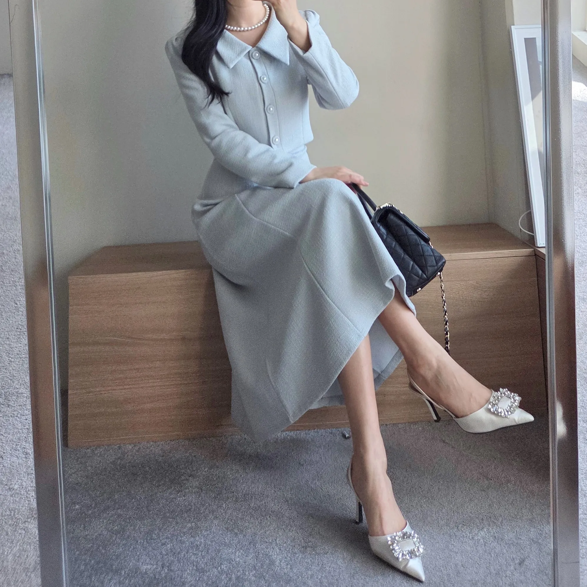 ツイードグリッタースクエアネックパール調ボタン肩パッドクロップドロング長袖タックフレアAラインフェイクポケットヒドゥンジッパーツーピース(トップス、ボトムス)スカートジャケット