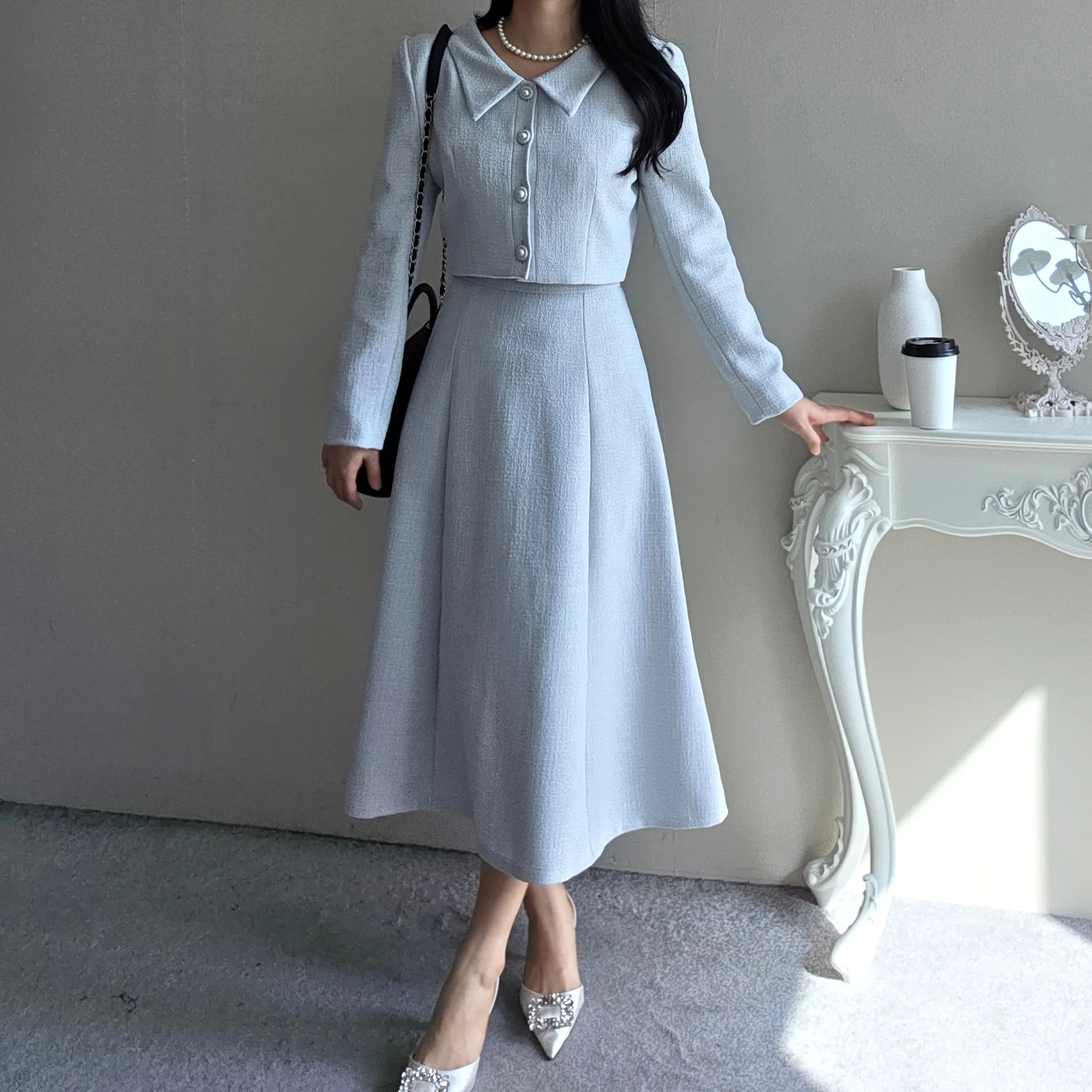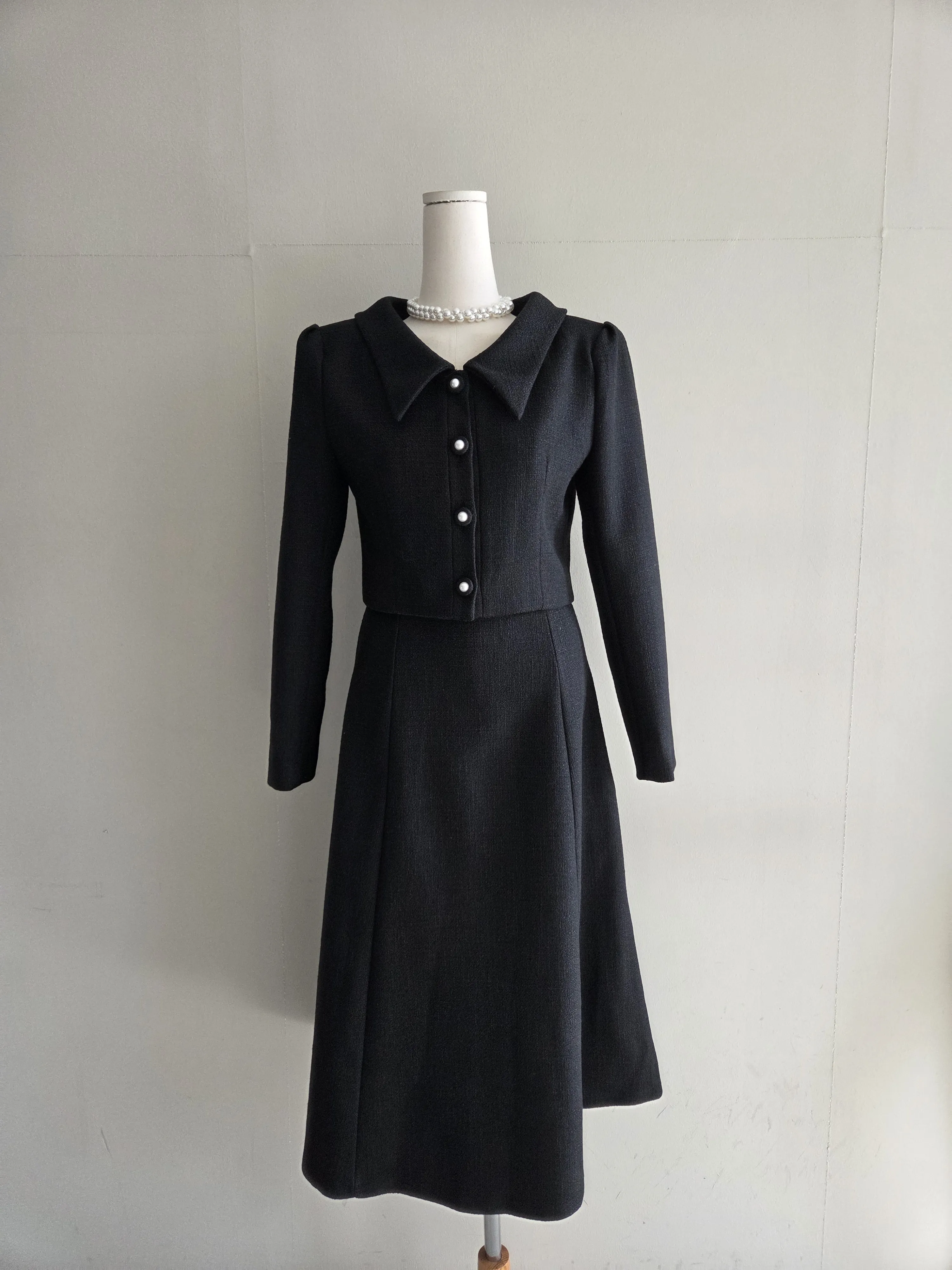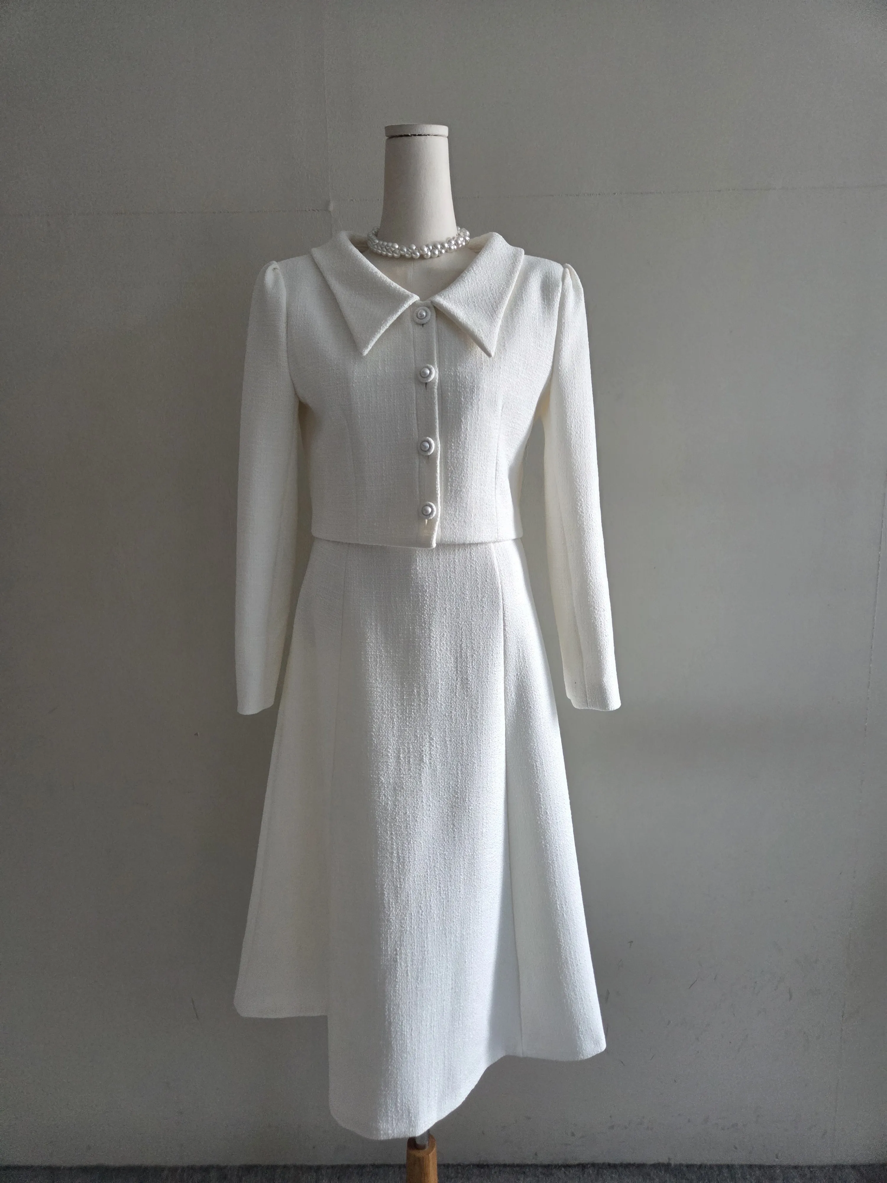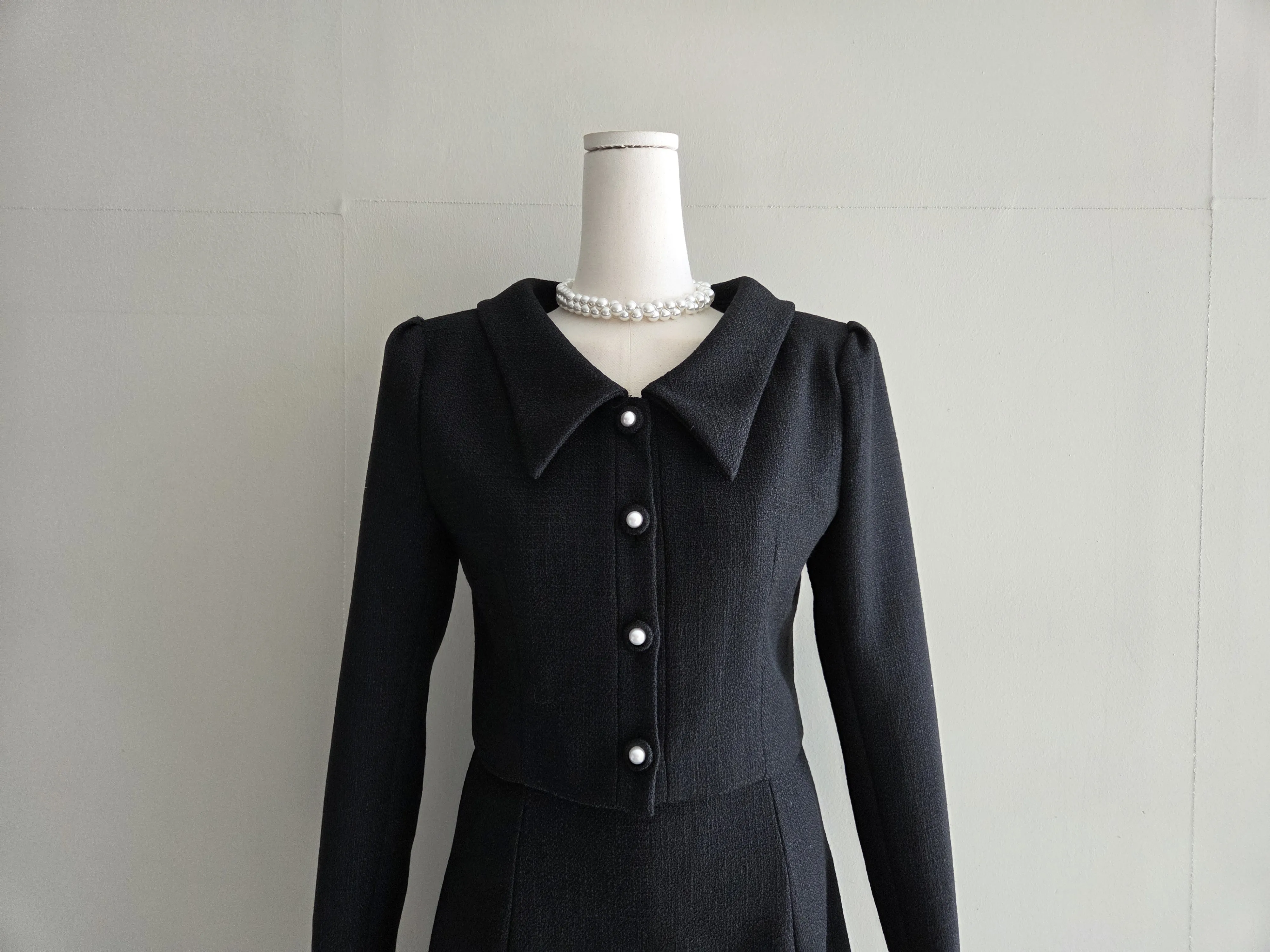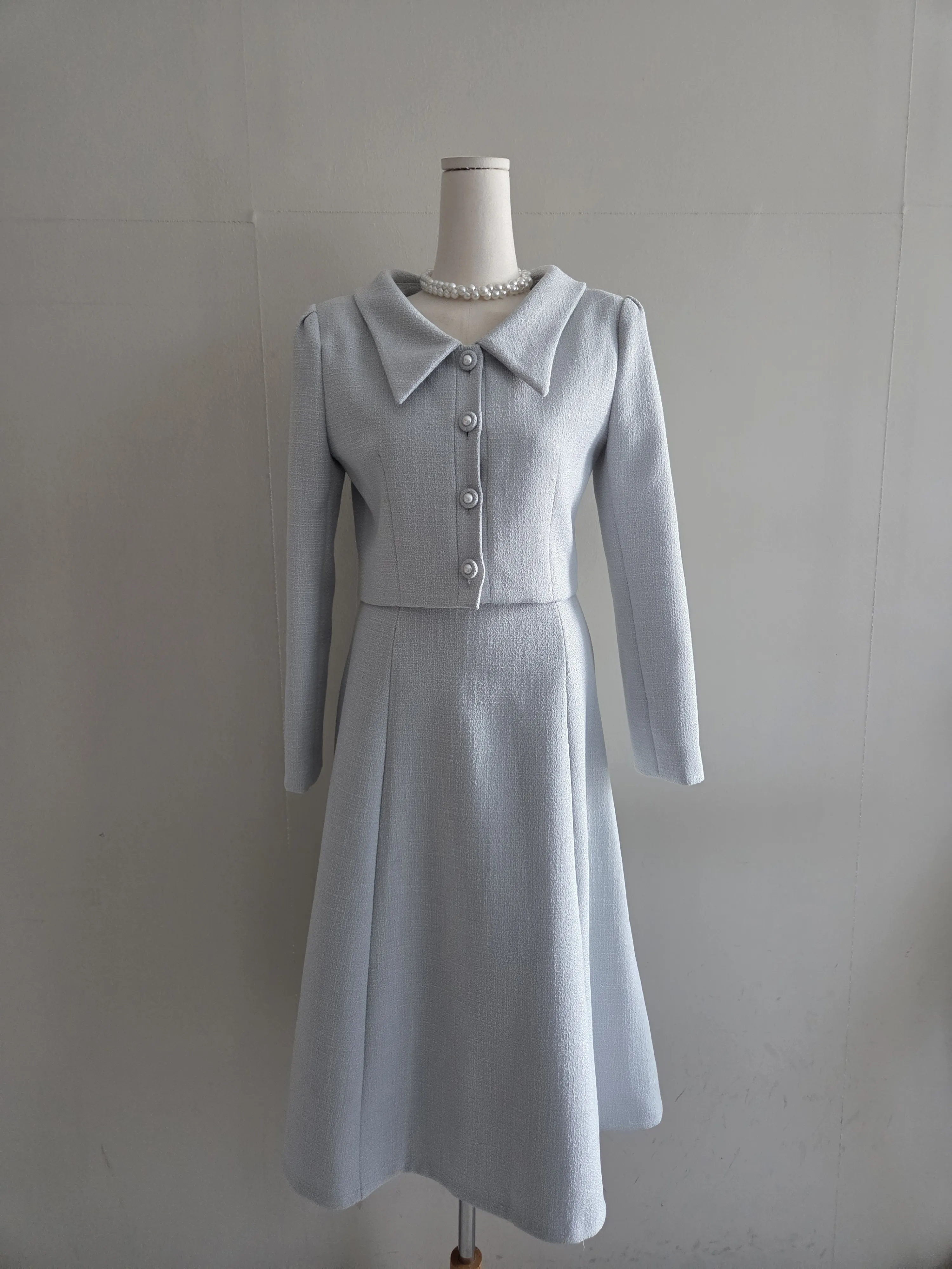 ツイードボタンカラー肩パッドラインクロップドロング長袖フレアAラインヒドゥンジッパー無地ツーピース(トップス、ボトムス)スカートジャケット・S1959042