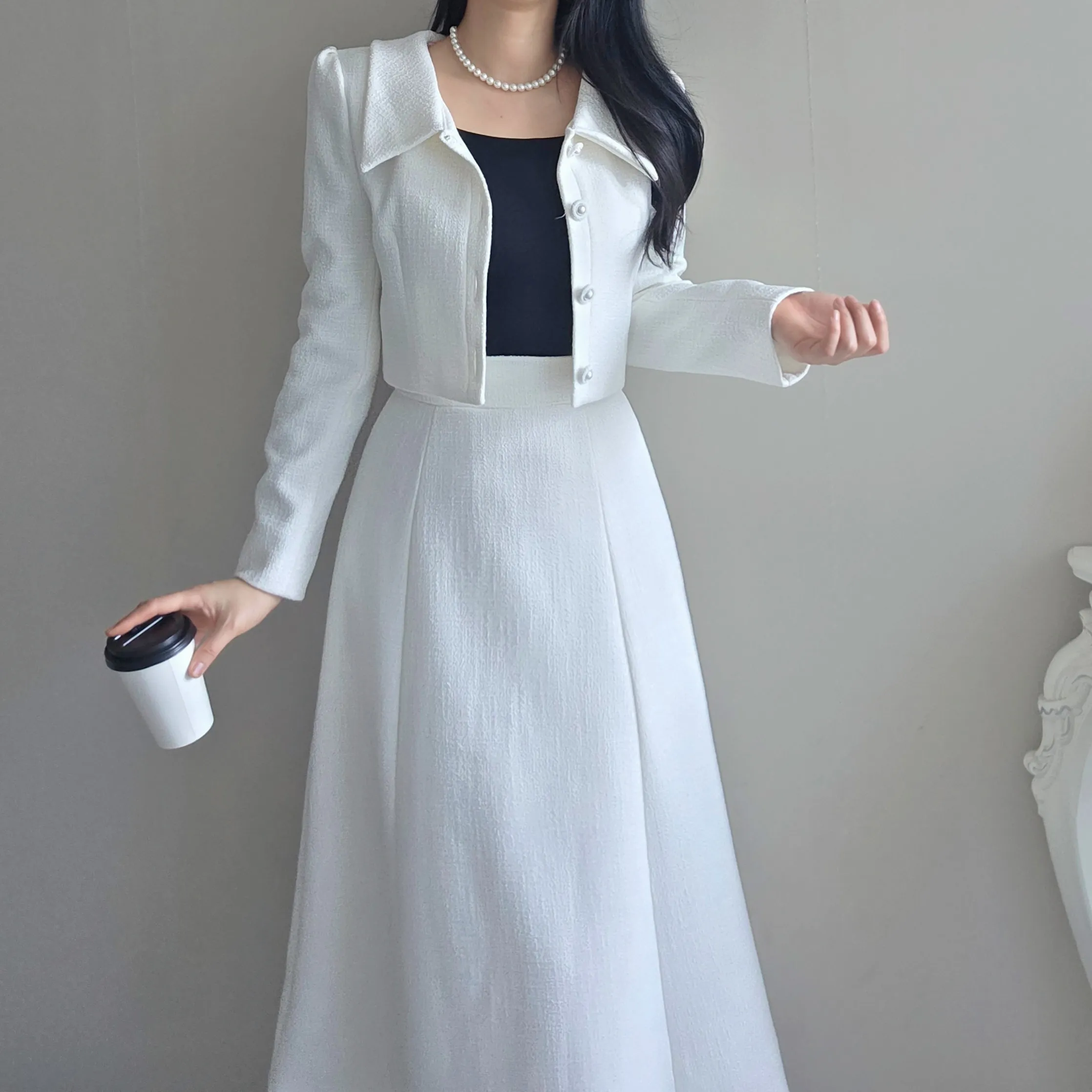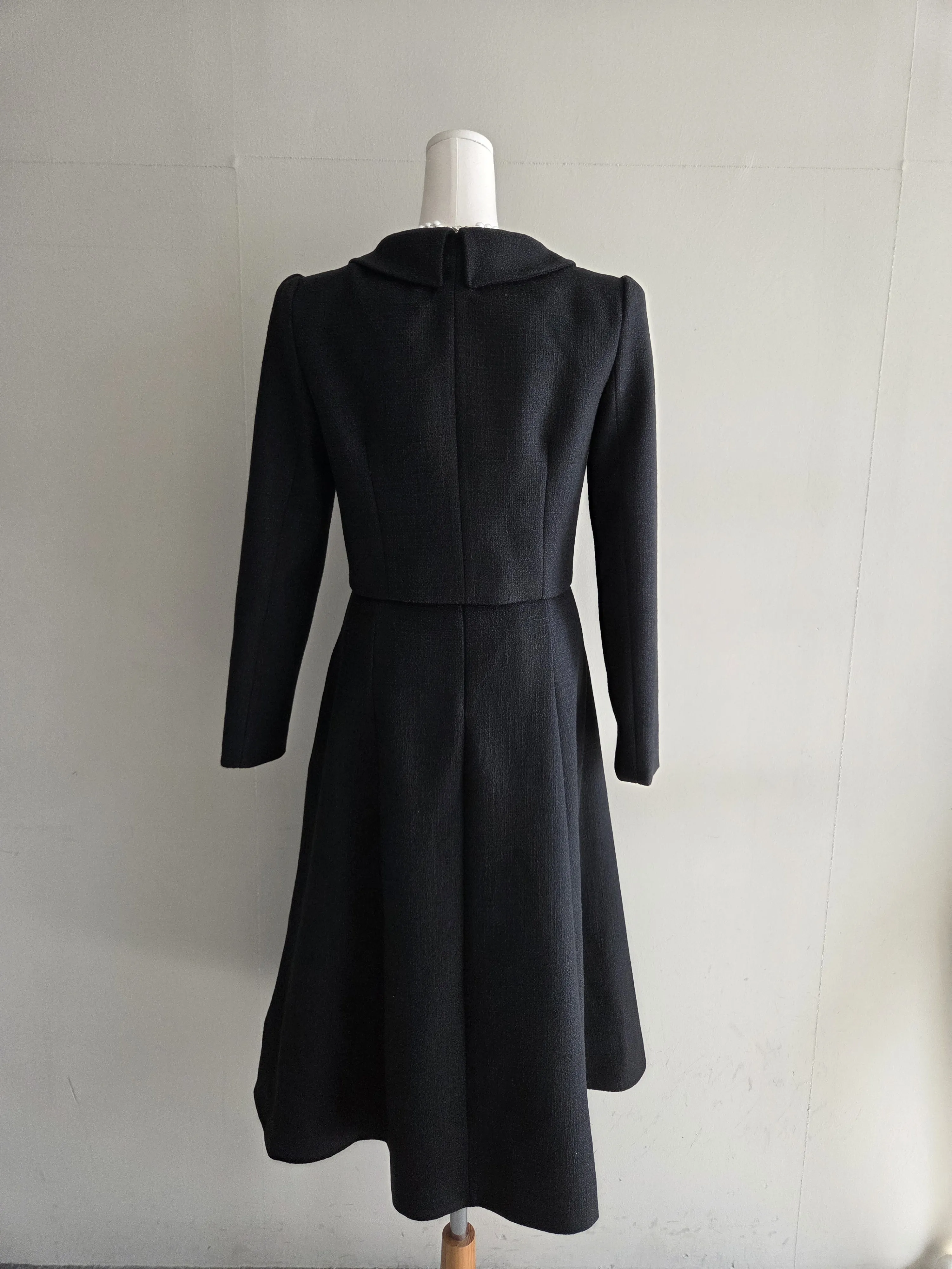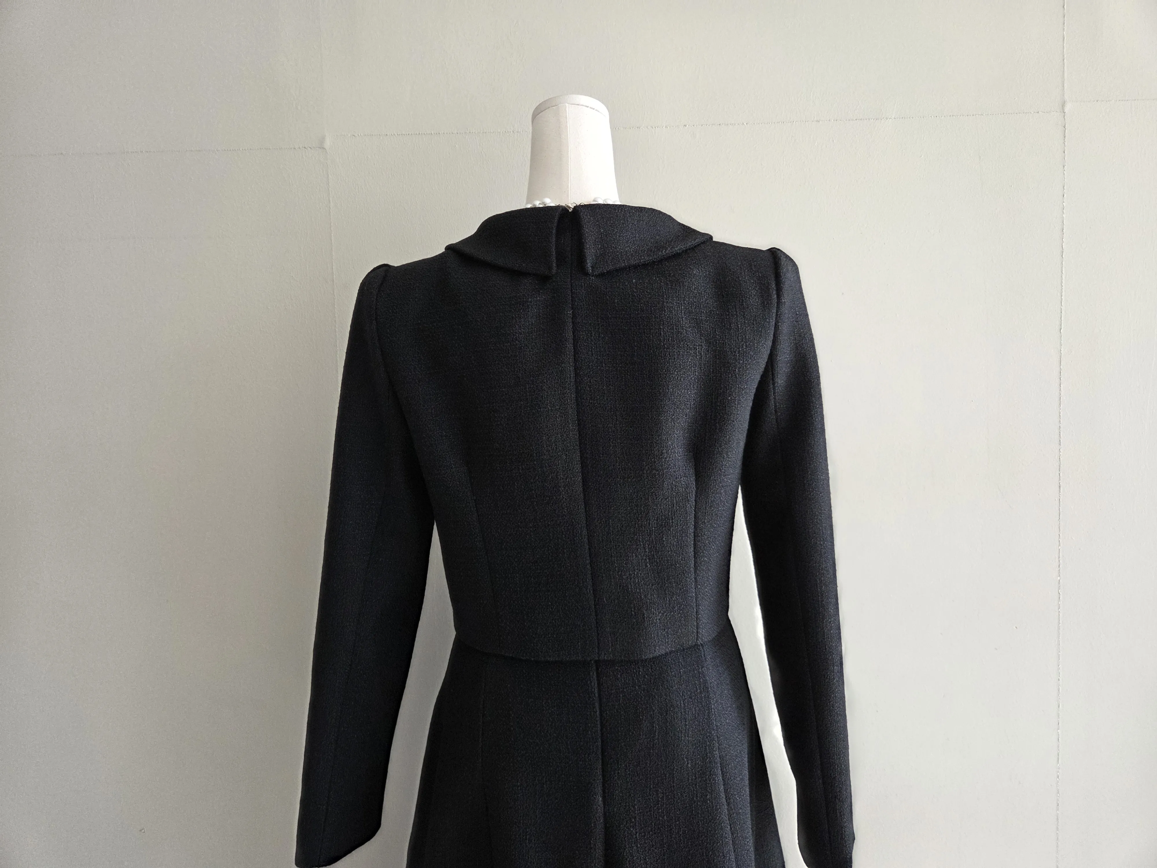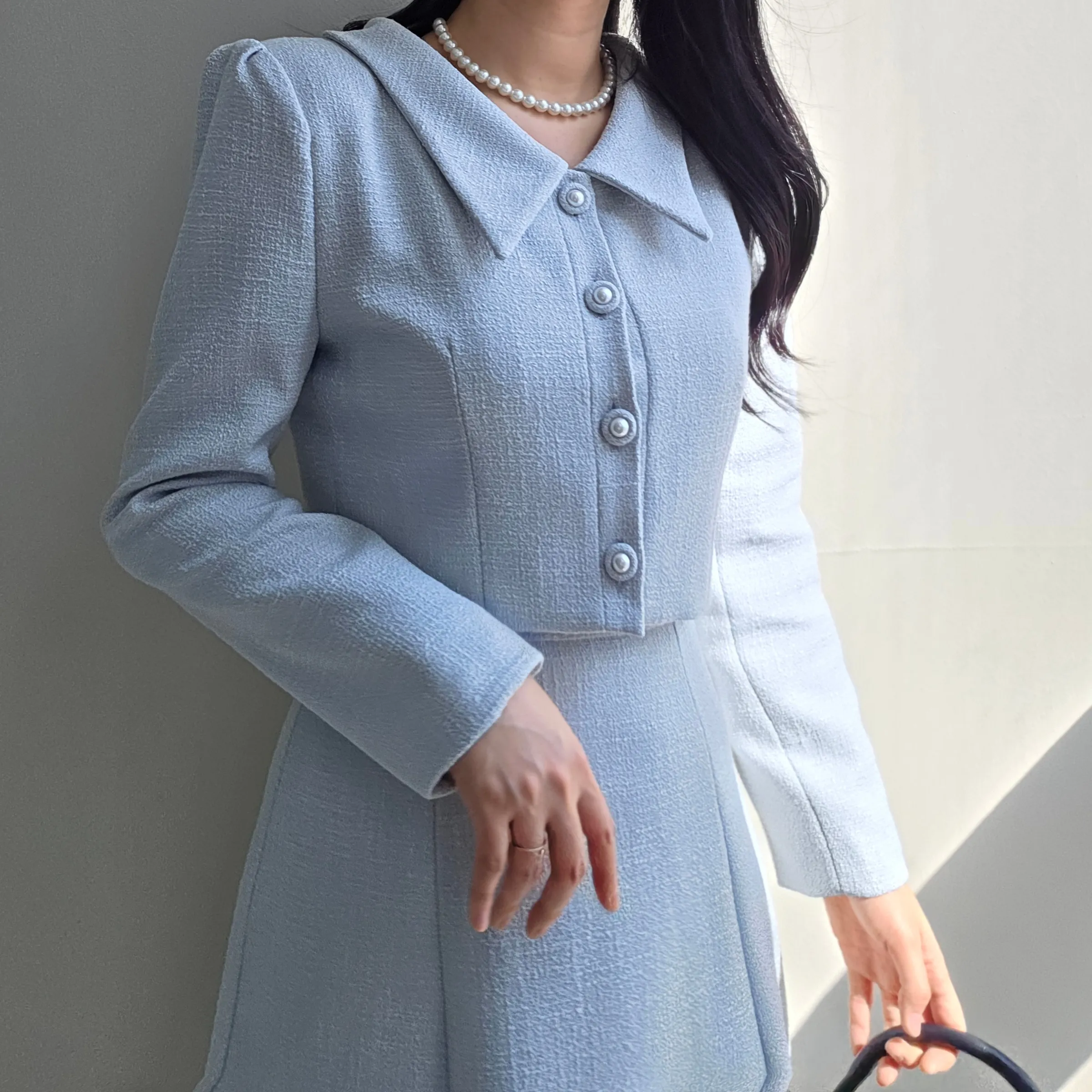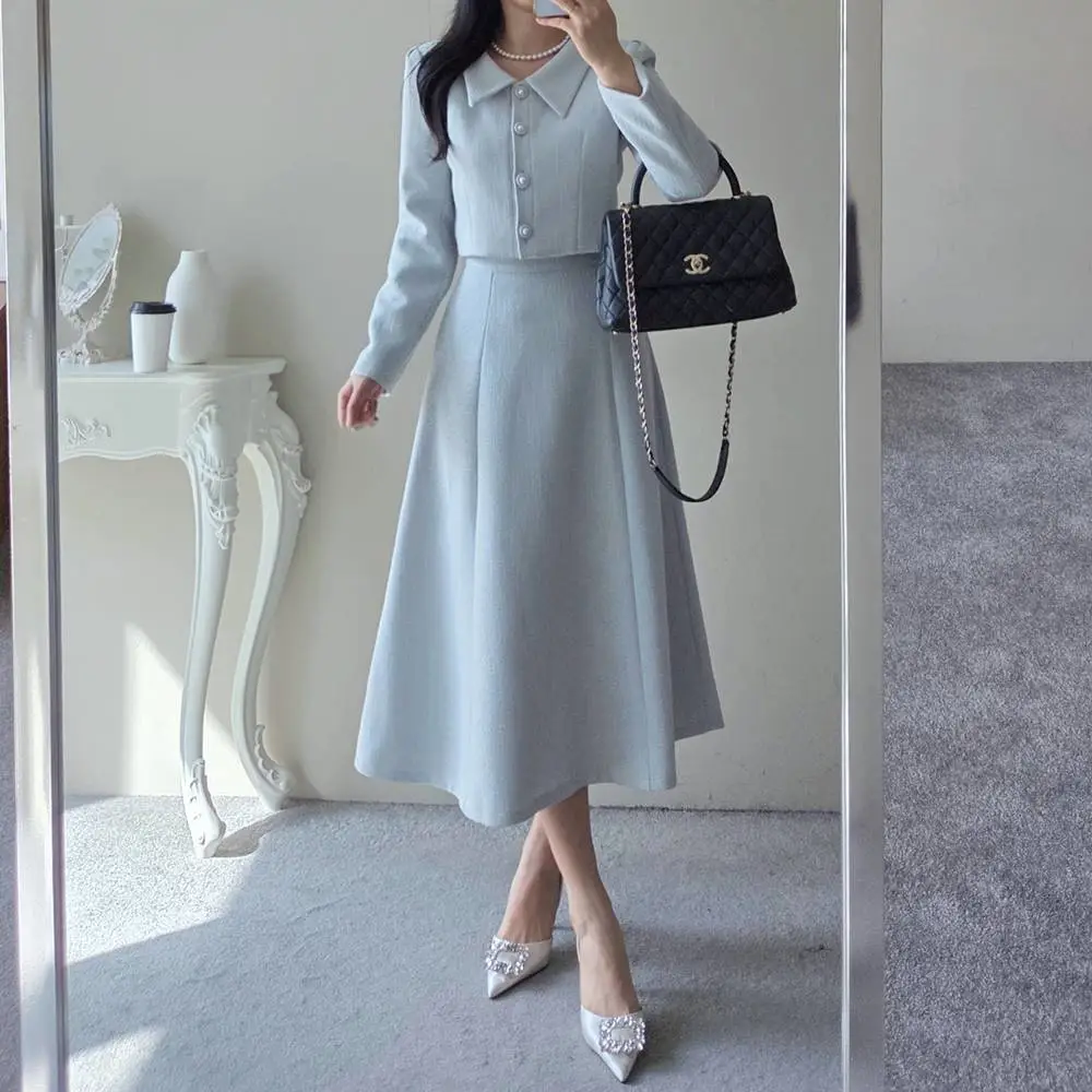 ツイードボタンカラー肩パッドラインクロップドロング長袖フレアAラインヒドゥンジッパー無地ツーピース(トップス、ボトムス)スカートジャケット・S1959042