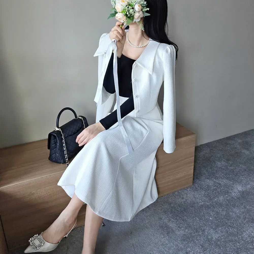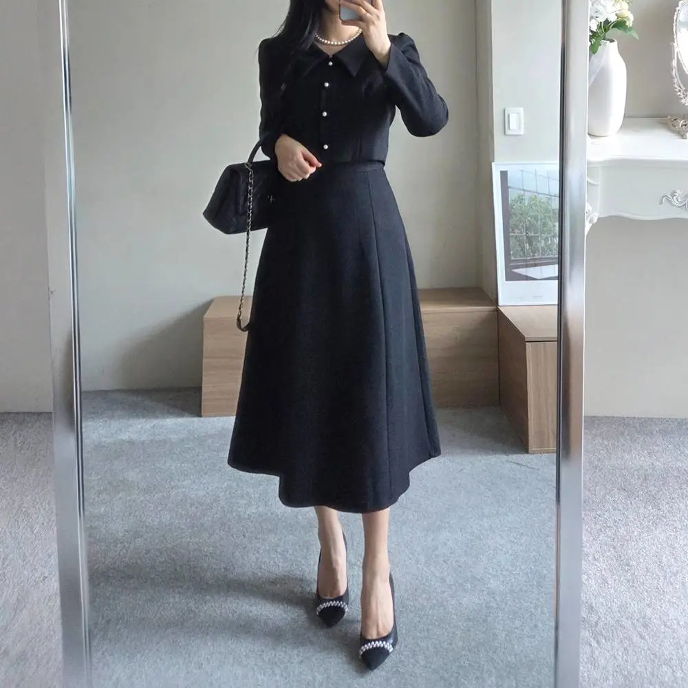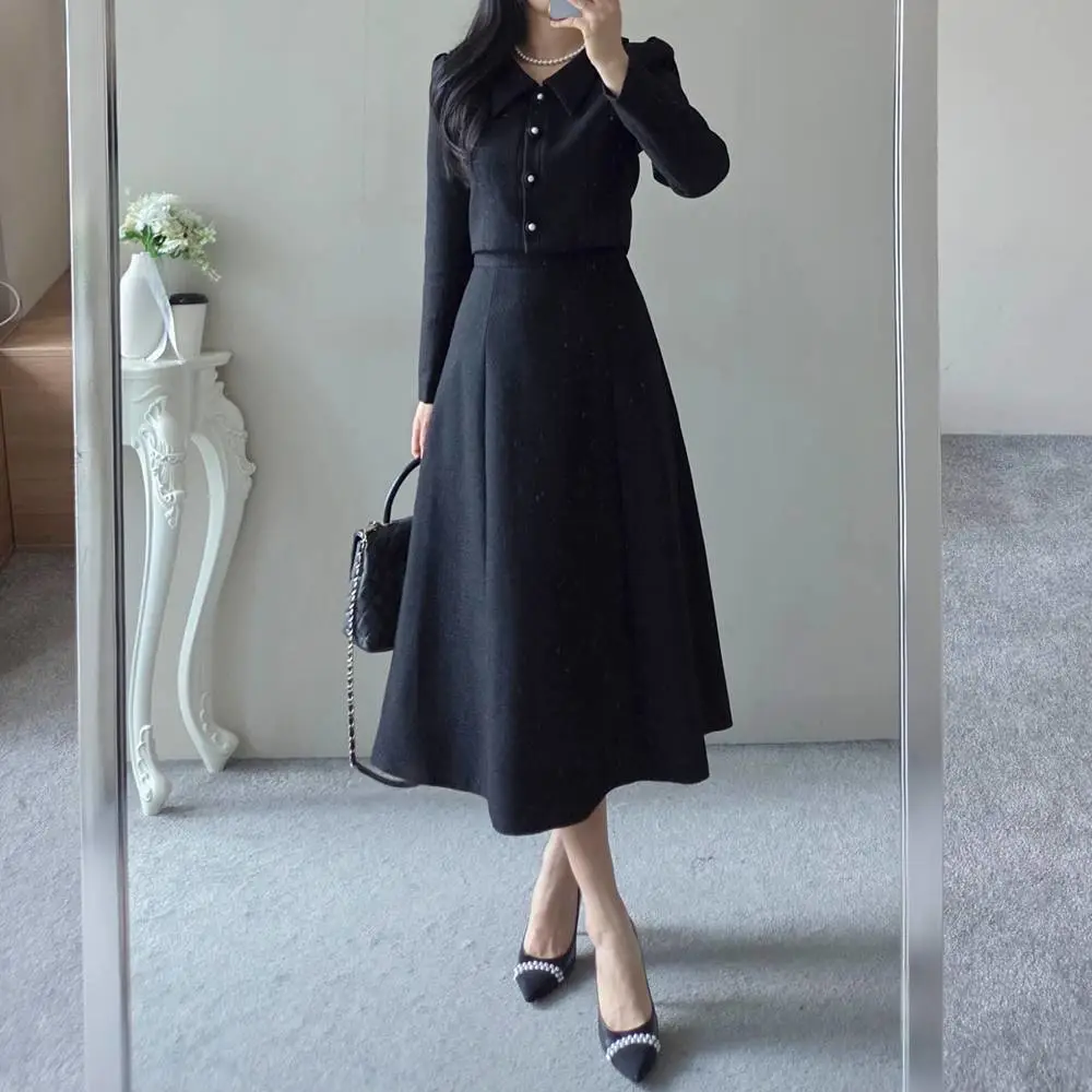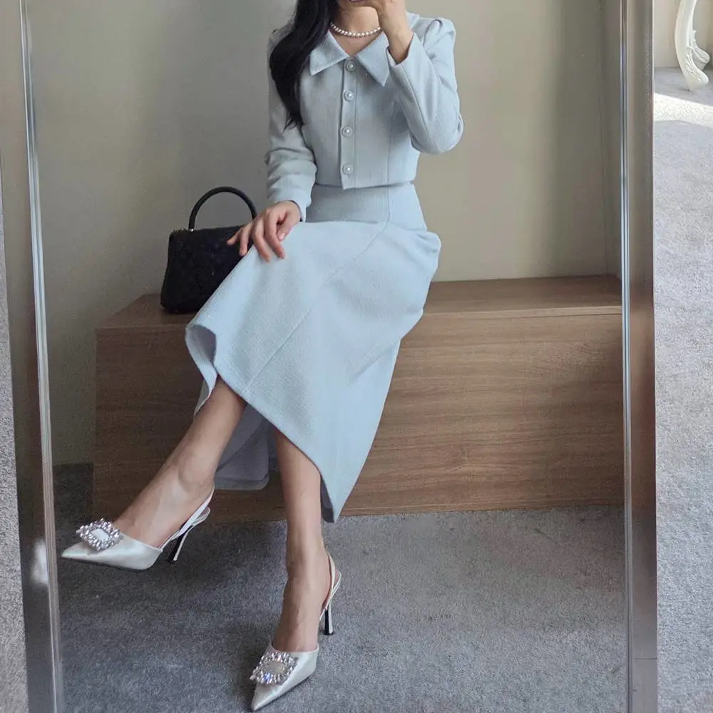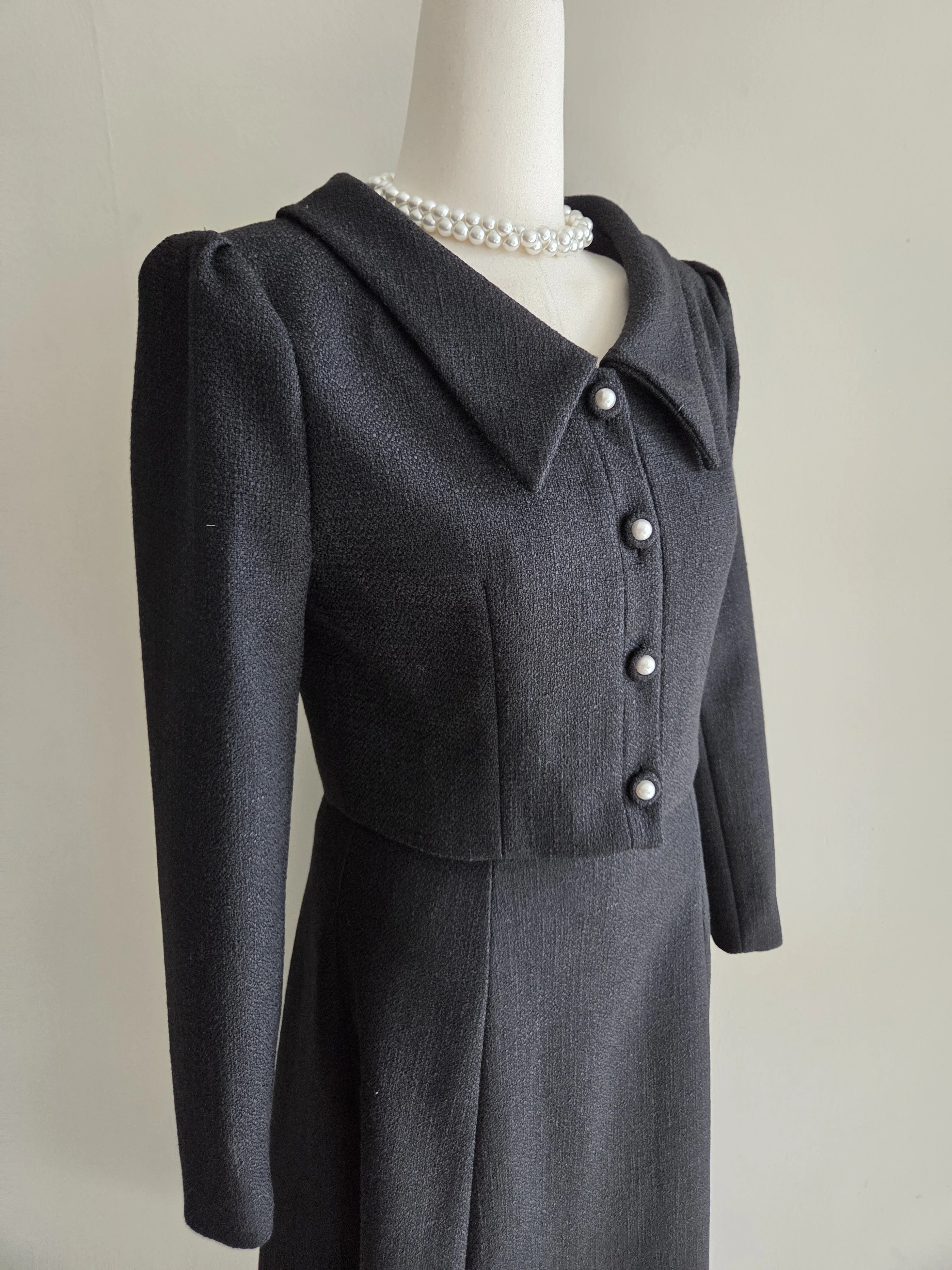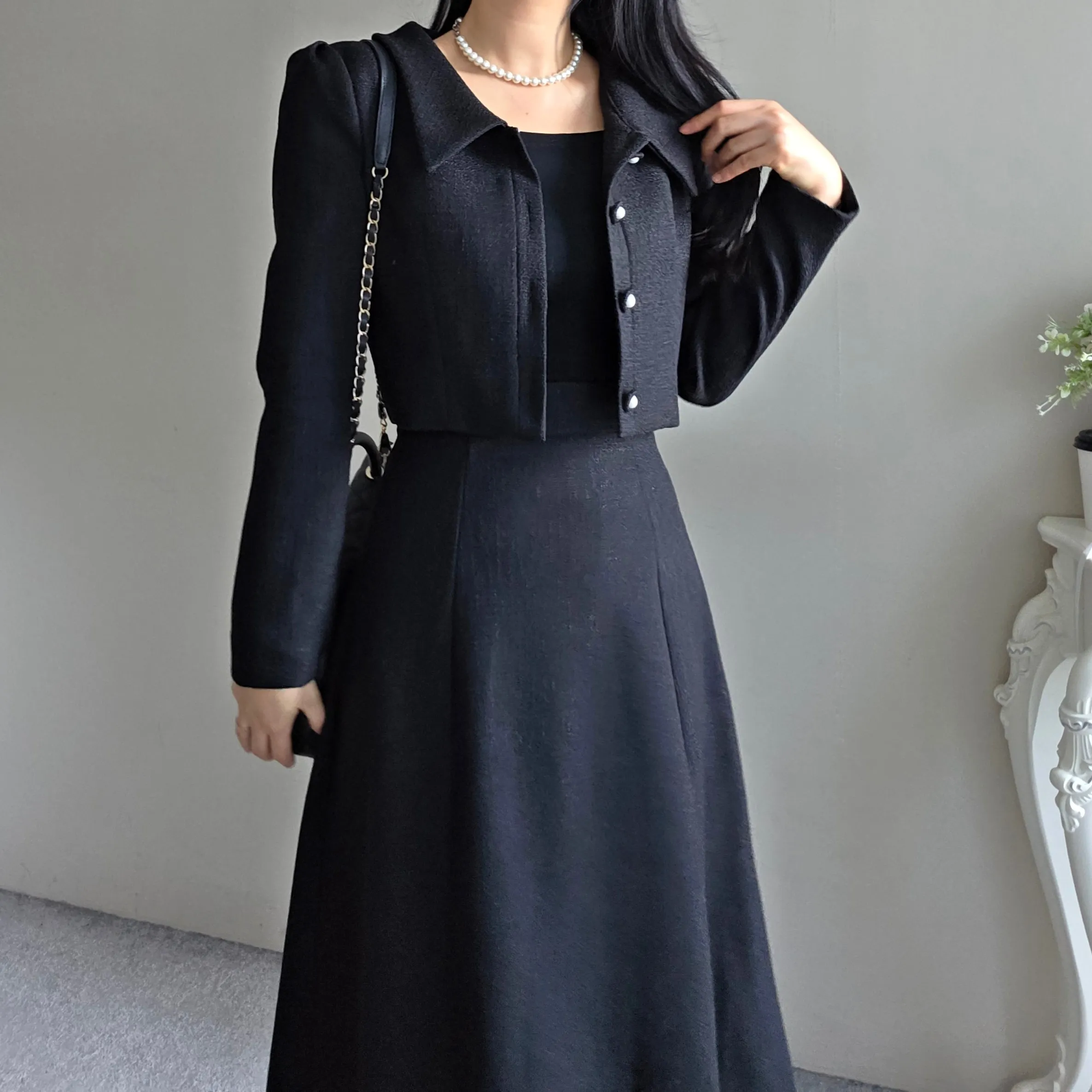 ツイードボタンカラー肩パッドラインクロップドロング長袖フレアAラインヒドゥンジッパー無地ツーピース(トップス、ボトムス)スカートジャケット・S1959042